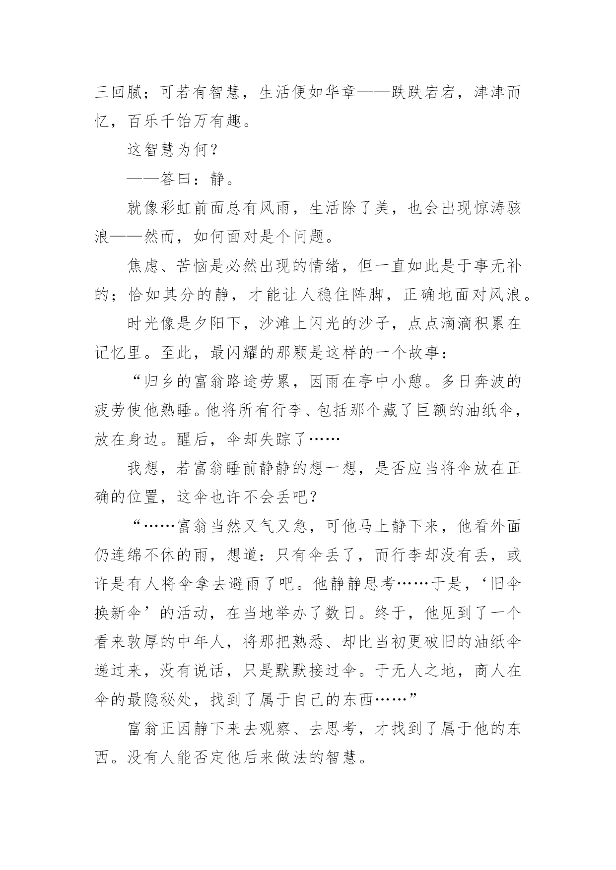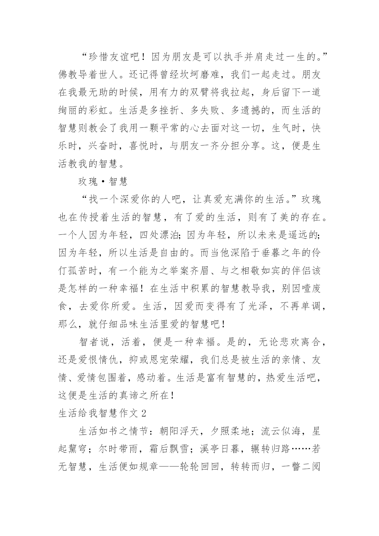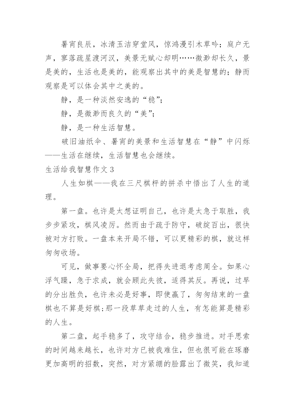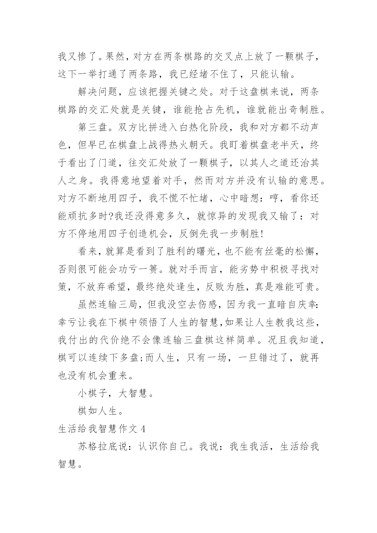 生活给我智慧作文生活给我智慧作文15篇在现实生活或工作学习中,大家都写过作文吧,写作文可以锻炼我们的独处习惯,让自己的心静下来,思考自己未来的方向。那么,怎么去写作文呢?下面是小编收集整理的生活给我智慧作文,欢迎大家借鉴与参考,希望对大家有所帮助。生活给我智慧作文1母亲说,生活,因亲情而变得真实亲切,充满希望。佛说,生活,因友情而变得欢快明朗,充满乐趣。玫瑰说,生活,因爱情而变得美好幸福,充满甜蜜。母亲·智慧“要爱惜自己,衣食住行别委屈了自己。”母亲一边为即将远行的我收拾行囊,一边嘱咐着。借着黄昏的灯光,看着母亲越发苍老的背影,我不会再不耐烦地应付一声“知道了”。生活的智慧告诉我,听着母亲的唠叨是人间最美的享受,受着母亲怜爱的责备是人生最幸福的事情。母亲,请你原谅,原谅我曾经的骄横,年轻气盛的激情已渐渐离我而去,生活的智慧教导我要珍惜现在拥有的一切。生活是美好的,智慧地把握生活、感受亲情是怎样的一种幸福,你明白吗?并肩·智慧“珍惜友谊吧!因为朋友是可以执手并肩走过一生的。”佛教导着世人。还记得曾经坎坷磨难,我们一起走过。朋友在我最无助的时候,用有力的双臂将我拉起,身后留下一道绚丽的彩虹。生活是多挫折、多失败、多遗撼的,而生活的智慧则教会了我用一颗平常的心去面对这一切,生气时,快乐时,兴奋时,喜悦时,与朋友一齐分担分享。这,便是生活教我的智慧。玫瑰·智慧“找一个深爱你的人吧,让真爱充满你的生活。”玫瑰也在传授着生活的智慧,有了爱的生活,则有了美的存在。一个人因为年轻,四处漂泊;因为年轻,所以未来是遥远的;因为年轻,所以生活是自由的。而当他深陷于垂暮之年的伶仃孤苦时,有一个能为之举案齐眉、与之相敬如宾的伴侣该是怎样的一种幸福!在生活中积累的智慧教导我,别因噎废食,去爱你所爱。生活,因爱而变得有了光泽,不再单调,那么,就仔细品味生活里爱的智慧吧!智者说,活着,便是一种幸福。是的,无论悲欢离合,还是爱恨情仇,抑或恩宠荣耀,我们总是被生活的亲情、友情、爱情包围着,感动着。生活是富有智慧的,热爱生活吧,这便是生活的真谛之所在!生活给我智慧作文2生活如书之情节:朝阳浮天,夕照柔地;流云似海,星起黧穹;尔时带雨,霜后飘雪;溪亭日暮,辗转归路……若无智慧,生活便如规章——轮轮回回,转转而归,一瞥二阅三回腻;可若有智慧,生活便如华章——跌跌宕宕,津津而忆,百乐千饴万有趣。这智慧为何?——答曰:静。就像彩虹前面总有风雨,生活除了美,也会出现惊涛骇浪——然而,如何面对是个问题。焦虑、苦恼是必然出现的情绪,但一直如此是于事无补的;恰如其分的静,才能让人稳住阵脚,正确地面对风浪。时光像是夕阳下,沙滩上闪光的沙子,点点滴滴积累在记忆里。至此,最闪耀的那颗是这样的一个故事:“归乡的富翁路途劳累,因雨在亭中小憩。多日奔波的疲劳使他熟睡。他将所有行李、包括那个藏了巨额的油纸伞,放在身边。醒后,伞却失踪了……我想,若富翁睡前静静的想一想,是否应当将伞放在正确的位置,这伞也许不会丢吧?“……富翁当然又气又急,可他马上静下来,他看外面仍连绵不休的雨,想道:只有伞丢了,而行李却没有丢,或许是有人将伞拿去避雨了吧。他静静思考……于是,‘旧伞换新伞’的活动,在当地举办了数日。终于,他见到了一个看来敦厚的中年人,将那把熟悉、却比当初更破旧的油纸伞递过来,没有说话,只是默默接过伞。于无人之地,商人在伞的最隐秘处,找到了属于自己的东西……”富翁正因静下来去观察、去思考,才找到了属于他的东西。没有人能否定他后来做法的智慧。暑宵良辰,冰清玉洁穿堂风,惊鸿漫引木草吟;庭户无声,寥落疏星渡河汉,美景无赋心却明……微渺却长久,景是美的,生活也是美的,能观察出其中的美是智慧的;静而观察是可以体会其中之美的。静,是一种淡然安逸的“稳”;静,是微渺而良久的“美”;静,是一种生活智慧。破旧油纸伞、暑宵的美景和生活智慧在“静”中闪烁——生活在继续,生活智慧也会继续。生活给我智慧作文3人生如棋——我在三尺棋枰的拼杀中悟出了人生的道理。第一盘。也许是太想证明自己,也许是太急于取胜,我步步紧攻,棋风凌厉。然而由于疏于防守,破绽百出,很快被对方打败。一盘本来开局不错,可以更精彩的棋,就这样匆匆收场。可见,做事要心怀全局,把得失进退考虑周全。如果心浮气躁,急于求成,就会顾此失彼,适得其反。再说,过早的分出胜负,也许未必是好事,即使赢了,匆匆结束的一盘棋也不算是好棋;那一段草草走过的人生,有怎能算是精彩的人生。第二盘,起手稳多了,攻守结合,稳步推进。对手思索的时间越来越长,也许对方已被我难住,但也很可能在琢磨更加高明的招数,突然,对方紧绷的脸露出了微笑,我知道我又惨了。果然,对方在两条棋路的交叉点上放了一颗棋子,这下一举打通了两条路,我已经堵不住了,只能认输。解决问题,应该把握关键之处。对于这盘棋来说,两条