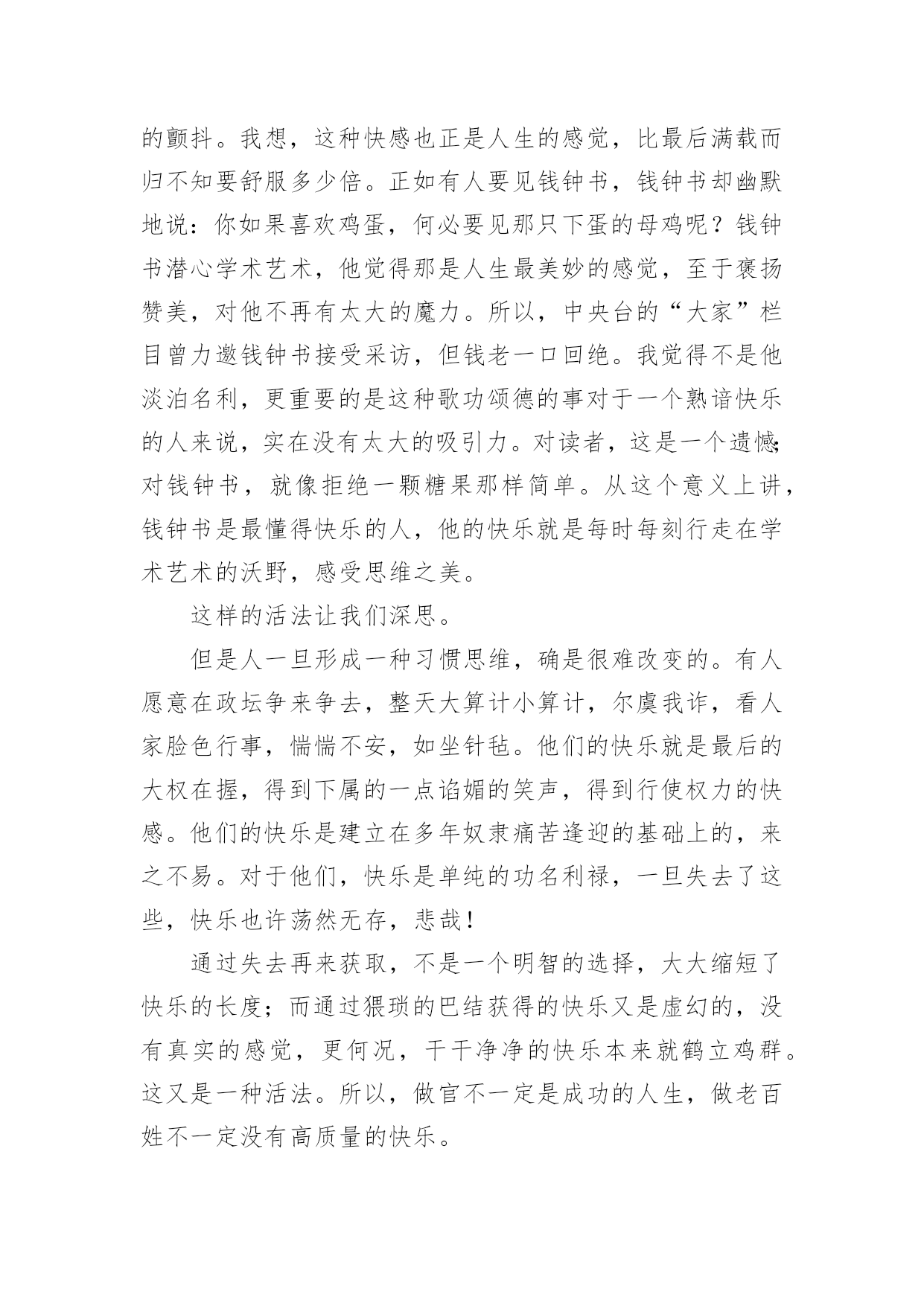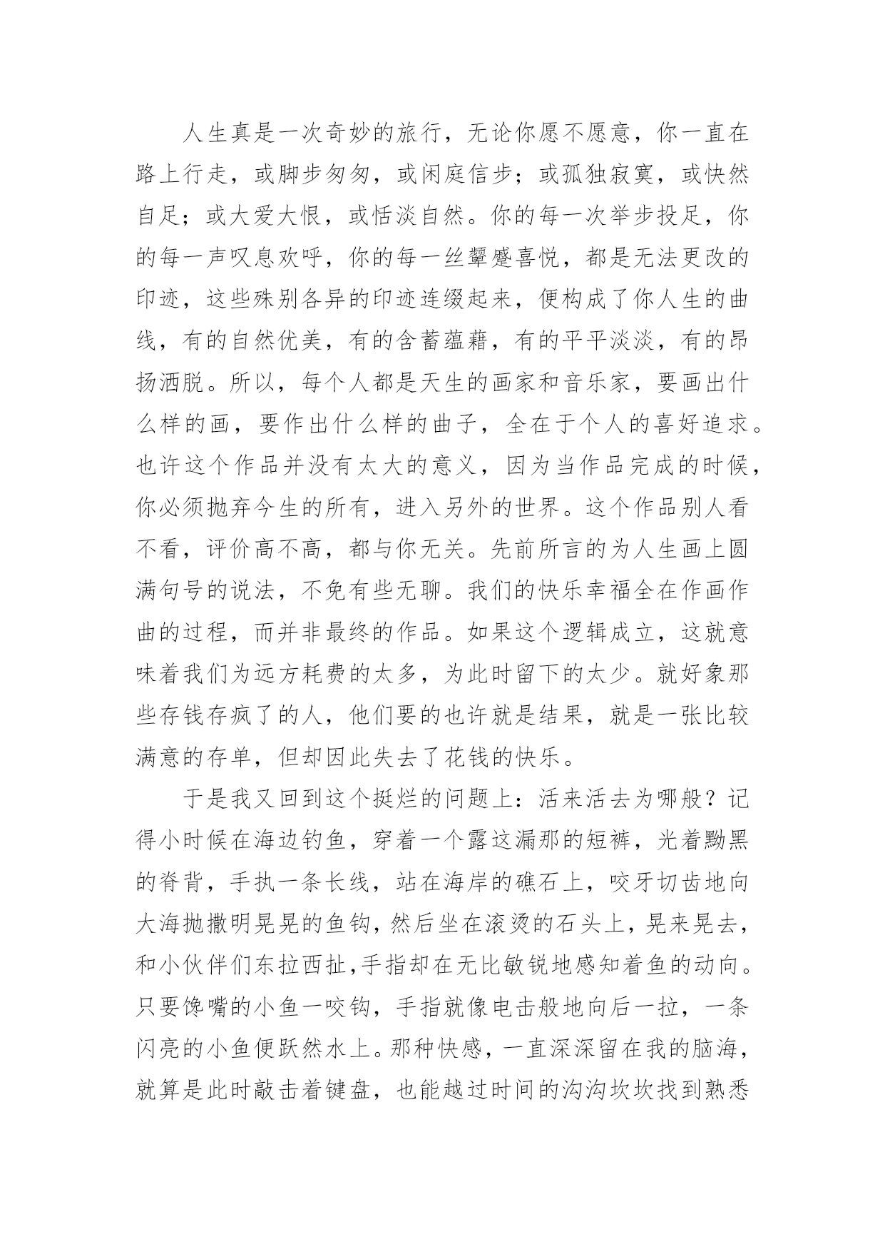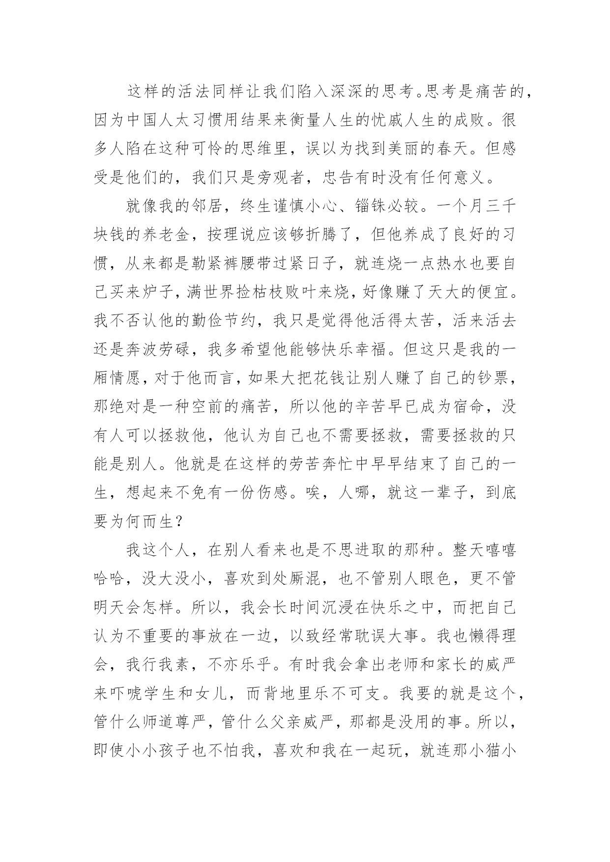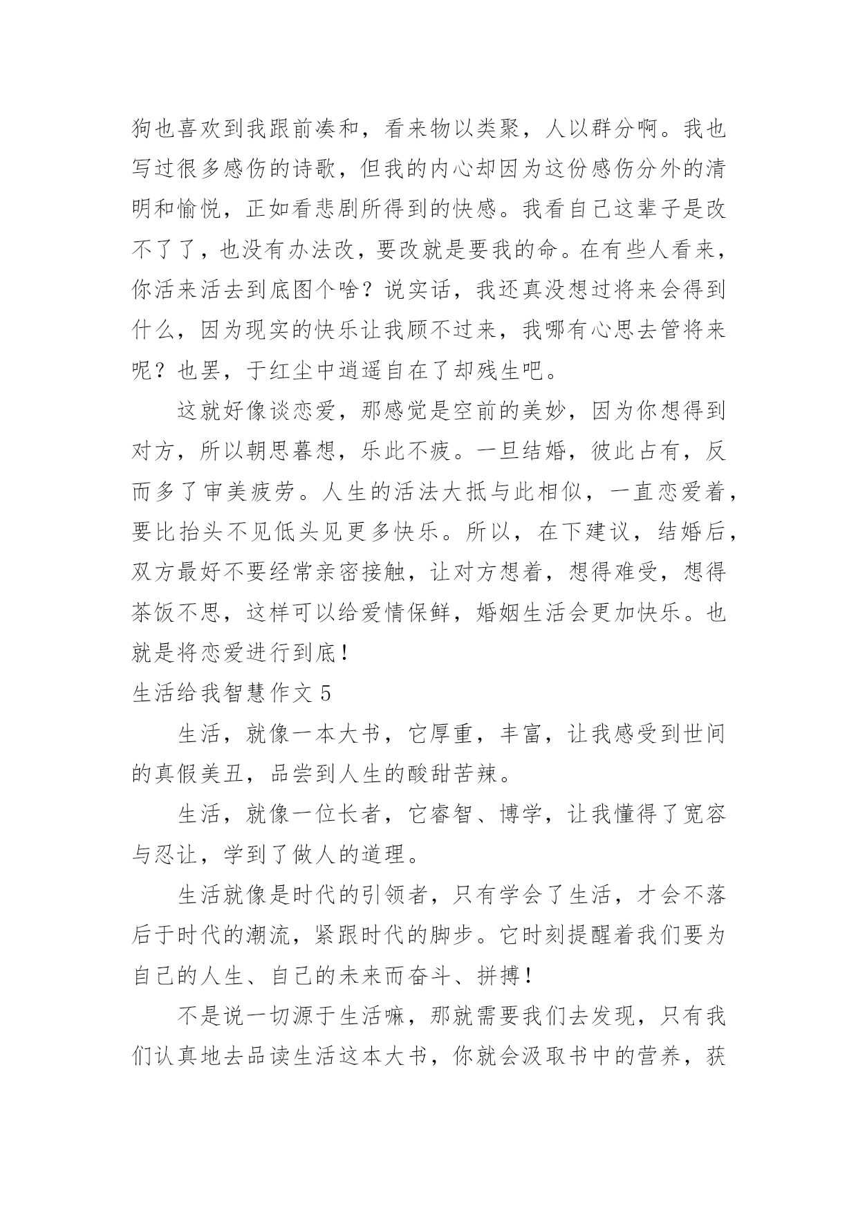 生活给我智慧作文生活给我智慧作文15篇在现实生活或工作学习中,大家都写过作文吧,写作文可以锻炼我们的独处习惯,让自己的心静下来,思考自己未来的方向。那么,怎么去写作文呢?下面是小编收集整理的生活给我智慧作文,欢迎大家借鉴与参考,希望对大家有所帮助。生活给我智慧作文1母亲说,生活,因亲情而变得真实亲切,充满希望。佛说,生活,因友情而变得欢快明朗,充满乐趣。玫瑰说,生活,因爱情而变得美好幸福,充满甜蜜。母亲·智慧“要爱惜自己,衣食住行别委屈了自己。”母亲一边为即将远行的我收拾行囊,一边嘱咐着。借着黄昏的灯光,看着母亲越发苍老的背影,我不会再不耐烦地应付一声“知道了”。生活的智慧告诉我,听着母亲的唠叨是人间最美的享受,受着母亲怜爱的责备是人生最幸福的事情。母亲,请你原谅,原谅我曾经的骄横,年轻气盛的激情已渐渐离我而去,生活的智慧教导我要珍惜现在拥有的一切。生活是美好的,智慧地把握生活、感受亲情是怎样的一种幸福,你明白吗?并肩·智慧“珍惜友谊吧!因为朋友是可以执手并肩走过一生的。”佛教导着世人。还记得曾经坎坷磨难,我们一起走过。朋友在我最无助的时候,用有力的双臂将我拉起,身后留下一道绚丽的彩虹。生活是多挫折、多失败、多遗撼的,而生活的智慧则教会了我用一颗平常的心去面对这一切,生气时,快乐时,兴奋时,喜悦时,与朋友一齐分担分享。这,便是生活教我的智慧。玫瑰·智慧“找一个深爱你的人吧,让真爱充满你的生活。”玫瑰也在传授着生活的智慧,有了爱的生活,则有了美的存在。一个人因为年轻,四处漂泊;因为年轻,所以未来是遥远的;因为年轻,所以生活是自由的。而当他深陷于垂暮之年的伶仃孤苦时,有一个能为之举案齐眉、与之相敬如宾的伴侣该是怎样的一种幸福!在生活中积累的智慧教导我,别因噎废食,去爱你所爱。生活,因爱而变得有了光泽,不再单调,那么,就仔细品味生活里爱的智慧吧!智者说,活着,便是一种幸福。是的,无论悲欢离合,还是爱恨情仇,抑或恩宠荣耀,我们总是被生活的亲情、友情、爱情包围着,感动着。生活是富有智慧的,热爱生活吧,这便是生活的真谛之所在!生活给我智慧作文2生活如书之情节:朝阳浮天,夕照柔地;流云似海,星起黧穹;尔时带雨,霜后飘雪;溪亭日暮,辗转归路……若无智慧,生活便如规章——轮轮回回,转转而归,一瞥二阅三回腻;可若有智慧,生活便如华章——跌跌宕宕,津津而忆,百乐千饴万有趣。这智慧为何?——答曰:静。就像彩虹前面总有风雨,生活除了美,也会出现惊涛骇浪——然而,如何面对是个问题。焦虑、苦恼是必然出现的情绪,但一直如此是于事无补的;恰如其分的静,才能让人稳住阵脚,正确地面对风浪。时光像是夕阳下,沙滩上闪光的沙子,点点滴滴积累在记忆里。至此,最闪耀的那颗是这样的一个故事:“归乡的富翁路途劳累,因雨在亭中小憩。多日奔波的疲劳使他熟睡。他将所有行李、包括那个藏了巨额的油纸伞,放在身边。醒后,伞却失踪了……我想,若富翁睡前静静的想一想,是否应当将伞放在正确的位置,这伞也许不会丢吧?“……富翁当然又气又急,可他马上静下来,他看外面仍连绵不休的雨,想道:只有伞丢了,而行李却没有丢,或许是有人将伞拿去避雨了吧。他静静思考……于是,‘旧伞换新伞’的活动,在当地举办了数日。终于,他见到了一个看来敦厚的中年人,将那把熟悉、却比当初更破旧的油纸伞递过来,没有说话,只是默默接过伞。于无人之地,商人在伞的最隐秘处,找到了属于自己的东西……”富翁正因静下来去观察、去思考,才找到了属于他的东西。没有人能否定他后来做法的智慧。暑宵良辰,冰清玉洁穿堂风,惊鸿漫引木草吟;庭户无声,寥落疏星渡河汉,美景无赋心却明……微渺却长久,景是美的,生活也是美的,能观察出其中的美是智慧的;静而观察是可以体会其中之美的。静,是一种淡然安逸的“稳”;静,是微渺而良久的“美”;静,是一种生活智慧。破旧油纸伞、暑宵的美景和生活智慧在“静”中闪烁——生活在继续,生活智慧也会继续。生活给我智慧作文3人生如棋——我在三尺棋枰的拼杀中悟出了人生的道理。第一盘。也许是太想证明自己,也许是太急于取胜,我步步紧攻,棋风凌厉。然而由于疏于防守,破绽百出,很快被对方打败。一盘本来开局不错,可以更精彩的棋,就这样匆匆收场。可见,做事要心怀全局,把得失进退考虑周全。如果心浮气躁,急于求成,就会顾此失彼,适得其反。再说,过早的分出胜负,也许未必是好事,即使赢了,匆匆结束的一盘棋也不算是好棋;那一段草草走过的人生,有怎能算是精彩的人生。第二盘,起手稳多了,攻守结合,稳步推进。对手思索的时间越来越长,也许对方已被我难住,但也很可能在琢磨更加高明的招数,突然,对方紧绷的脸露出了微笑,我知道我又惨了。果然,对方在两条棋路的交叉点上放了一颗棋子,这下一举打通了两条路,我已经堵不住了,只能认输。解决问题,应该把握关键之处。对于这盘棋来说,两条