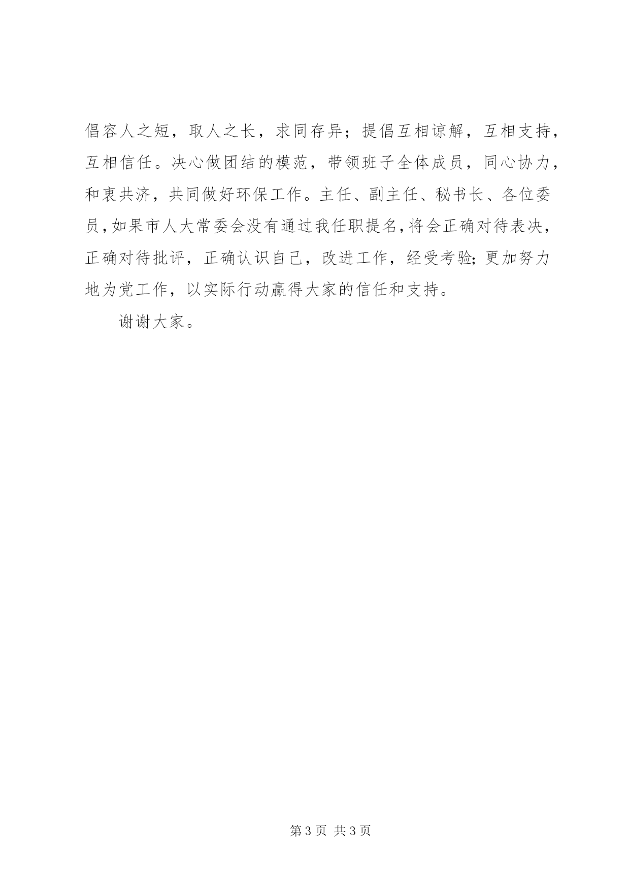 第PAGE\*Arabic\*MERGEFORMAT3页共NUMPAGES\*MERGEFORMAT3页环保局长任职演说材料主任、副主任、秘书长、各位委员:提请本次常委会议审议,市政府市长提名我担任XX市环保局局长。这是党和人民对我信任,也是对我鞭策,深感担子重,责任大。如果这次市人大常委会议能够通过我任职决定,一定将党的信任和人民的期望作为工作的动力,不负重托,不辱使命,恪尽职守,廉洁奉公,今后的工作中努力做到一、倾听代表意见。热点难点问题也很突出因此,衷心希望人大代表多为环保工作提意见,提建议,提批评,促进我搞好工作。一定自觉、主动地与人大代表加强联系,认真负责地向人大报告工作,接受市人大及其常委会组成人员的监督,实事求是地答复和办理人大批转的环保方面的监督意见和人大代表的建议,虚心接受人大评议。对人大代表提出的问题,一定认真对待,积极整改。同时,一定身体力行,影响和带动班子全体成员自觉置身于市人大常委会及人大代表的监督之下。坚持依法行政,认真按人大有关规定和程序做好工作。凡应该报请市人大决定的事情,严格按法律程序提请市人大审议。凡市人大及其常委会通过的决定、决议,市环保局都将坚决认真地贯彻执行。努力提高我依法行政的自觉性,搞好环保工作。二、改善环境质量。环保工作更加重要,任务更加繁重,人民群众对生存环境质量的要求也比以往任何时候都更为迫切。要从根本上改善我市环境质量,为经济发展创造优良环境,决心突出抓好以下几点:1强化监督管理,巩固工业企业达标成果。要加大环保执法力度,严防土小企业死灰复燃;加强对达标企业的监督管理,保证企业长期稳定达标;加快工业污染治理步伐,提升企业达标水平;把好新建项目审批关,严格控制新污染产生。2突出工作重点,搞好环境综合整治。要在巩固工业企业达标成果的基础上,积极推行清洁生产,发展循环经济,建设绿色企业、环保模范企业,促进全市企业走上新型工业化道路;汾河、涑水河流域加强生态环境建设,实施绿色工程规划,全面改善汾河、涑水河水质;城市环境综合整治上要有新的突破,协同相关部门在城市污水处理、垃圾无害化处理、集中供气供热、机动车尾气控制等工作中有更大进展。3查处典型案件,维护人民群众环境利益。要不断规范环保执法行为,加大典型环境违法案件查处力度,切实推行政务公开,认真解决人民群众关心的热点难点环境问题,维护人民群众的环境利益,让人民群众喝上干净水,呼吸上清洁的空气,吃上放心的食物。三、加强自身建设。要不断加强政治理论学习,坚定正确的政治方向和立场;自觉实践“三个代表”重要思想;坚决服从市委、市政府的领导;坚持党的群众纪律;廉洁奉公,严于律己,以身作则,忠实地履行好自己的职责。其次,要发扬民主集中制,搞好班子建设。班子内部,要提倡大事讲原则,小事讲风格;提倡容人之短,取人之长,求同存异;提倡互相谅解,互相支持,互相信任。决心做团结的模范,带领班子全体成员,同心协力,和衷共济,共同做好环保工作。主任、副主任、秘书长、各位委员,如果市人大常委会没有通过我任职提名,将会正确对待表决,正确对待批评,正确认识自己,改进工作,经受考验;更加努力地为党工作,以实际行动赢得大家的信任和支持。谢谢大家。