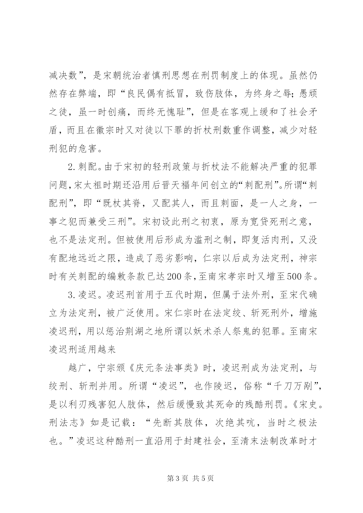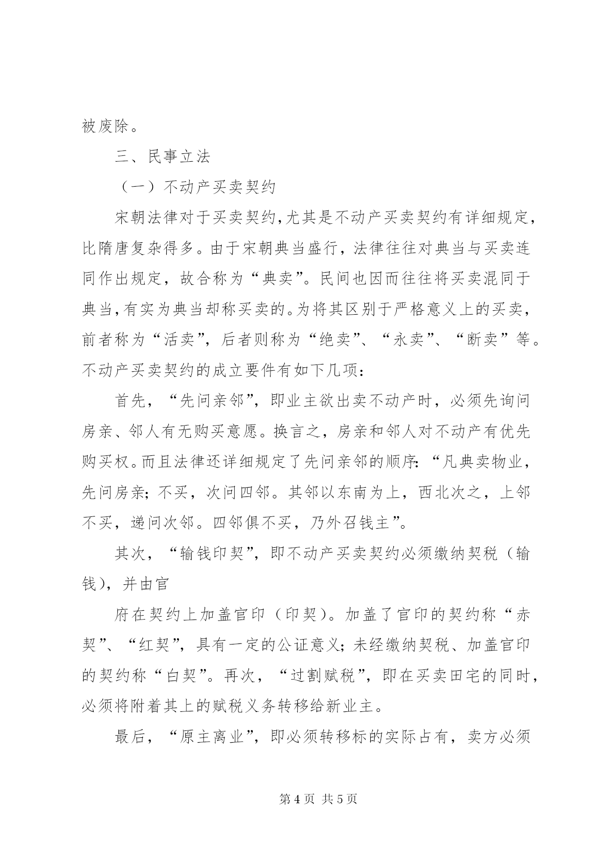 第PAGE\*Arabic\*MERGEFORMAT5页共NUMPAGES\*MERGEFORMAT5页隋朝宋朝法律制度一、《开皇律》的主要成就(一)体例《开皇律》总结以往的立法成果,以《北齐律》为基础,调整了篇目内容,确定了名例、卫禁、职制、户婚、厩库、擅兴、贼盗、斗讼、诈伪、杂律、捕亡、断狱等12篇体例,共500条。中国古代刑法典的篇目体例经过从简到繁、从繁到简的发展过程,《开皇律》的12篇标志着这一过程的完成,显示了中国古代立法技术的进步与成熟。“刑网简要,疏而不失”的12篇体例为后来的唐律所沿用。(二)内容1.《开皇律》删除了前代的残酷刑罚,把刑罚定型为笞、杖、徒、流、死五刑。其中笞刑从笞十至笞五十,杖刑从杖六十至杖一百,各分五等;徒刑从一年至三年五等,各以半年相差;流刑从一千里至二千里三等,各以五百里相差;死刑为绞、斩两种。封建五刑制度自此正式确立,并一直沿用至清末。2.《开皇律》在北齐“重罪十条”基础上正式确立“十恶”罪名。“十恶”是指谋反、谋大逆、谋叛、恶逆、不道、大不敬、不孝、不睦、不义、内乱十种最严重的犯罪行为。3.《开皇律》还进一步完善“八议”和“官当”制度。“八议”是对亲、故、贤、能、功、贵、勤、宾八种人犯罪,须按特别程序认定,并依法减免处罚。“官当”是指官员犯罪至徒刑、流刑者,可以官品抵折刑罚,并因所犯私罪、公罪有所区别。“八议”和“官当”制度的完善,使得封建特权法得到进一步发展,走向系统化和固定化。一、立法概况《宋刑统》宋太祖建隆初年由窦仪等人,主持修律。至建隆四年(公元963年),《宋刑统》修成,经太祖批准,“模印颁行”天下,成为中国历史上第一部刊版印行的封建法典。首先,《宋刑统》在结构内容上沿袭《唐律疏议》,但在12篇律下分213门,所谓“门”,就是将调整大体同一类社会关系的律文汇编为一个单元。其次,律后附有唐中期以后至宋初的敕文。《宋刑统》在体例上取法于唐末五代的《大中刑统》和《大周刑统》,成为一部综合性的封建成文法典。宋代后期,法律形式和内容虽有变化,但它作为国家基本性法典,“终宋之世,用之不改”。二、刑事立法刑罚制度1.折杖法。宋太祖建隆四年(公元963年)创立折杖法,作为重刑的代用刑。即把笞刑、杖刑折为臀杖;徒刑折为脊杖,杖后释放;流刑折为脊杖,并于本地配役一年;加役流,脊杖后,就地配役三年。从而使“流罪得免远徙,徒罪得免役年,笞杖得减决数”,是宋朝统治者慎刑思想在刑罚制度上的体现。虽然仍然存在弊端,即“良民偶有抵冒,致伤肢体,为终身之辱;愚顽之徒,虽一时创痛,而终无愧耻”,但是在客观上缓和了社会矛盾,而且在徽宗时又对徒以下罪的折杖刑数重作调整,减少对轻刑犯的危害。2.刺配。由于宋初的轻刑政策与折杖法不能解决严重的犯罪问题,宋太祖时期还沿用后晋天福年间创立的“刺配刑”。所谓“刺配刑”,即“既杖其脊,又配其人,而且刺面,是一人之身,一事之犯而兼受三刑”。宋初设此刑之初衷,原为宽贷死刑之意,也不是法定刑。但被使用后形成为滥刑之制,即复活肉刑,又没有配地远近之限,造成了恶劣影响,仁宗以后成为法定刑,神宗时有关刺配的编敕条款已达200条,至南宋孝宗时又增至500条。3.凌迟。凌迟刑首用于五代时期,但属于法外刑,至宋代确立为法定刑,被广泛使用。宋仁宗时在法定绞、斩死刑外,增施凌迟刑,用以惩治荆湖之地所谓以妖术杀人祭鬼的犯罪。至南宋凌迟刑适用越来越广,宁宗颁《庆元条法事类》时,凌迟刑成为法定刑,与绞刑、斩刑并用。所谓“凌迟”,也作陵迟,俗称“千刀万剐”,是以利刃残害犯人肢体,然后缓慢致其死命的残酷刑罚。《宋史。刑法志》如是记载:“先断其肢体,次绝其吭,当时之极法也。”凌迟这种酷刑一直沿用于封建社会,至清末法制改革时才被废除。三、民事立法(一)不动产买卖契约宋朝法律对于买卖契约,尤其是不动产买卖契约有详细规定,比隋唐复杂得多。由于宋朝典当盛行,法律往往对典当与买卖连同作出规定,故合称为“典卖”。民间也因而往往将买卖混同于典当,有实为典当却称买卖的。为将其区别于严格意义上的买卖,前者称为“活卖”,后者则称为“绝卖”、“永卖”、“断卖”等。不动产买卖契约的成立要件有如下几项:首先,“先问亲邻”,即业主欲出卖不动产时,必须先询问房亲、邻人有无购买意愿。换言之,房亲和邻人对不动产有优先购买权。而且法律还详细规定了先问亲邻的顺序:“凡典卖物业,先问房亲;不买,次问四邻。其邻以东南为上,西北次之,上邻不买,递问次邻。四邻俱不买,乃外召钱主”。其次,“输钱印契”,即不动产买卖契约必须缴纳契税(输钱),并由官府在契约上加盖官印(印契)。加盖了官印的契约称“赤契”、“红契”,具有一定的公证意义;未经缴纳契税、加盖官印的契约称“白契”。再次,“过割赋税”,即在买卖田宅的同时,必须将附着其上的赋税义