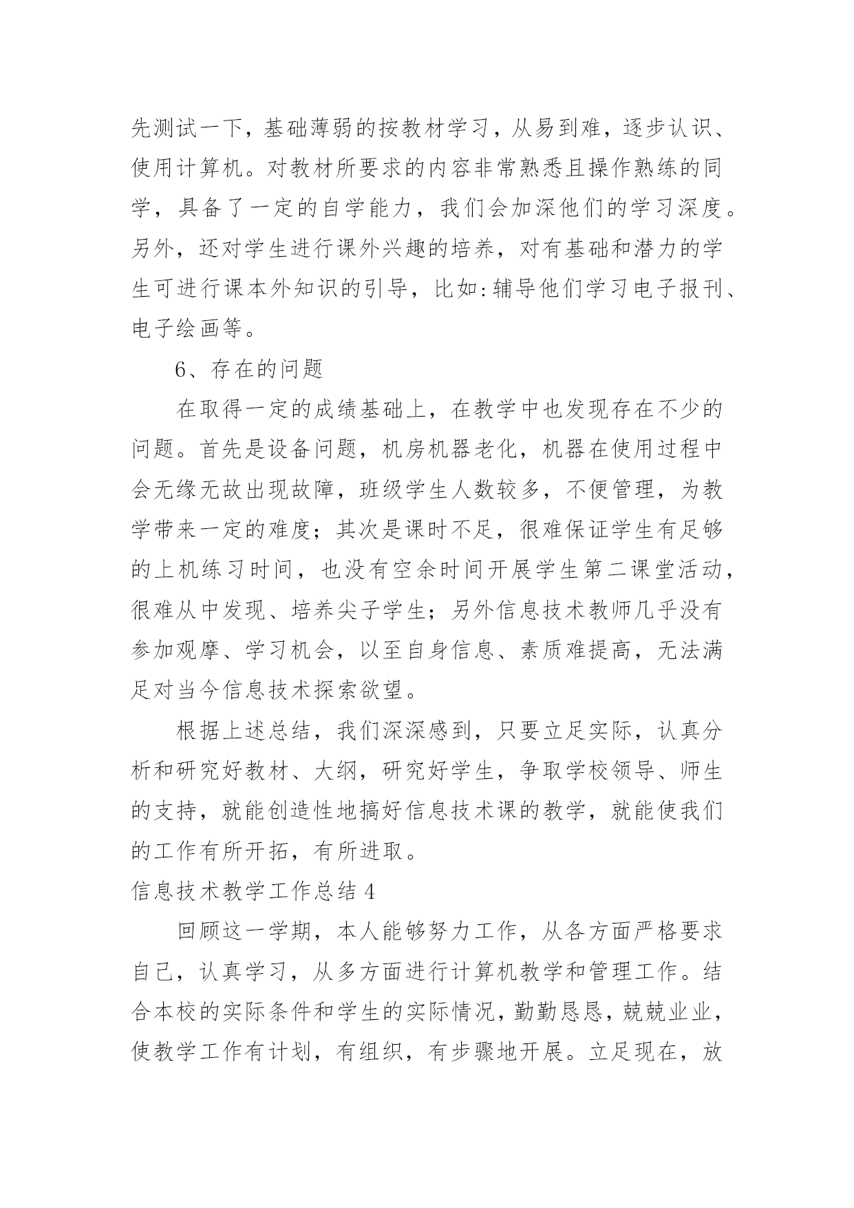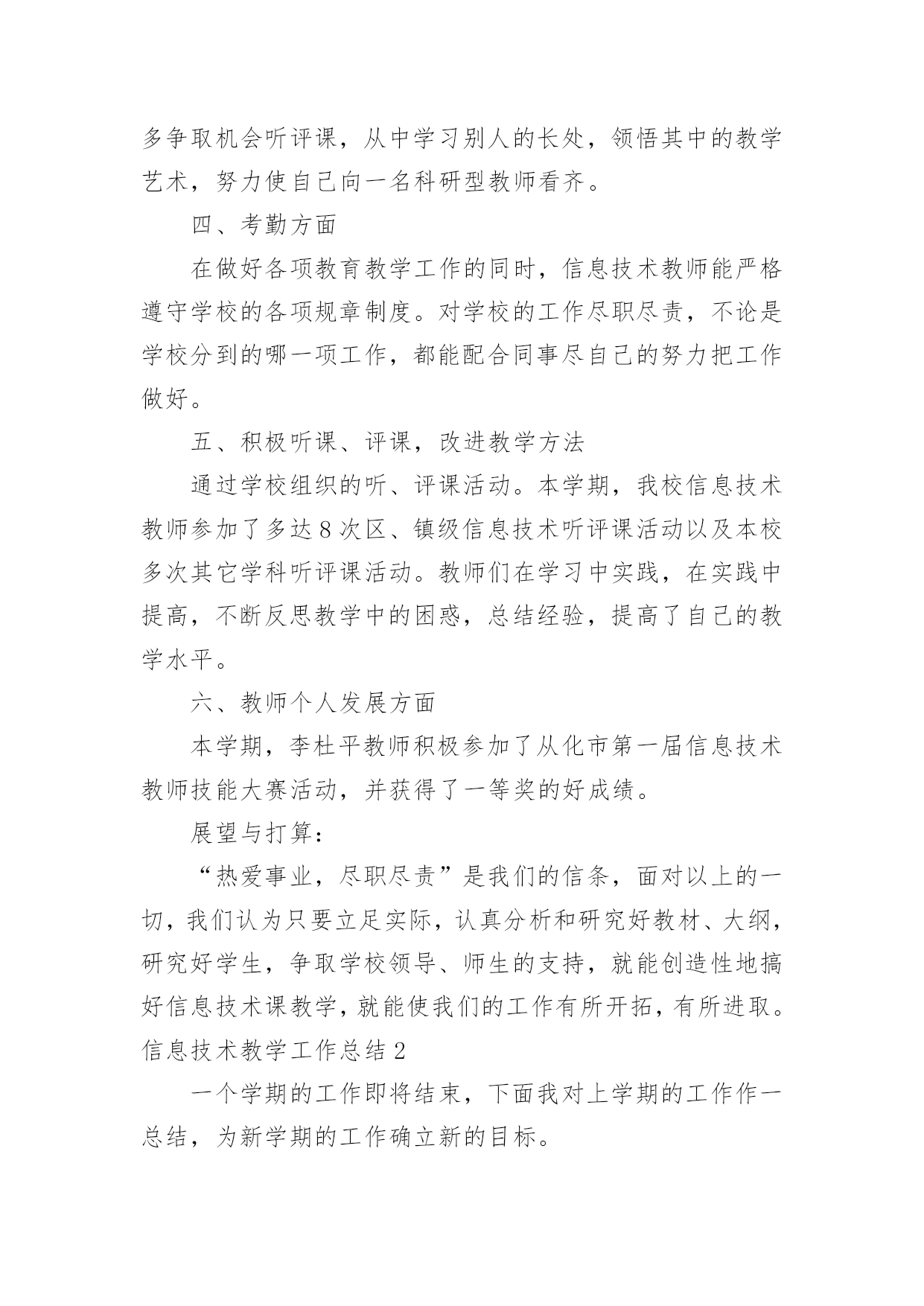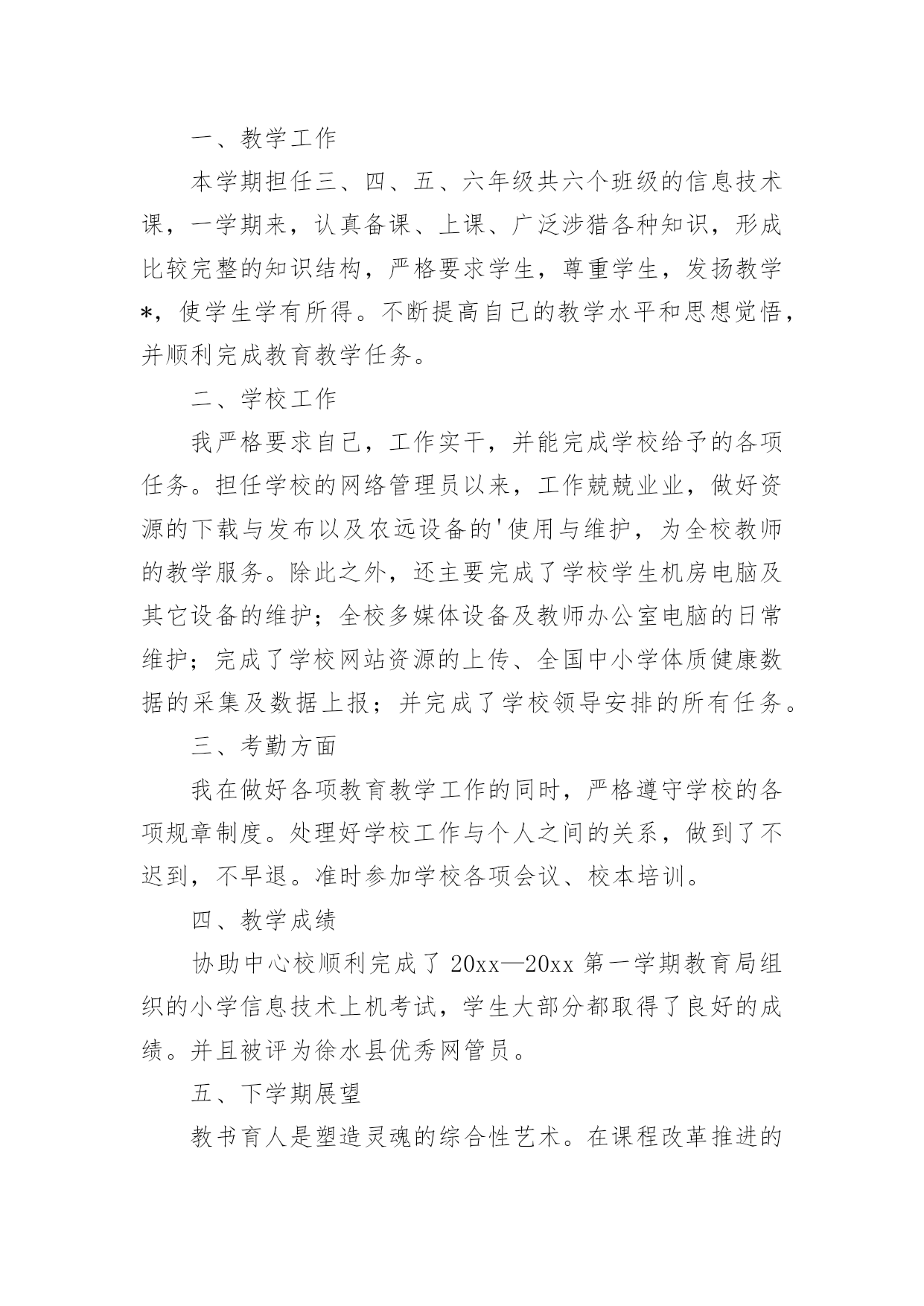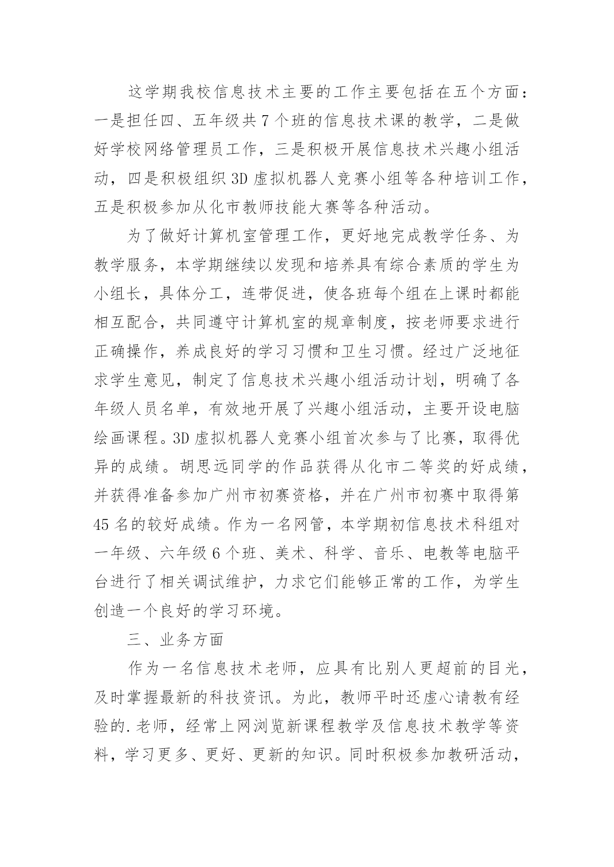 信息技术教学工作总结信息技术教学工作总结18篇总结是指对某一阶段的工作、学习或思想中的经验或情况进行分析研究,做出带有规律性结论的书面材料,它可以帮助我们有寻找学习和工作中的规律,让我们一起认真地写一份总结吧。如何把总结做到重点突出呢?以下是小编整理的信息技术教学工作总结,希望对大家有所帮助。信息技术教学工作总结1岁月如飞,一个学期就要结束了,回顾这个学期的工作,基本上是比较顺利的。“取其所长,补其所短”今天有益的收获,将会在下个学期的工作继续发扬,碰到的问题会认真思考,想办法解决。在这个学期中,我校信息技术教师能在保持原有良好工作态度的基础上,不断进步,不断进取,不断学习,虚心向有经验的老师学习。为了保持优良的工作姿态,现将这学期的工作情况进行全面的总结,总结如下:一、思想方面在这学期里,教师从思想上,利用师德师风教育活动端正自己;从行动上学电脑技术,学教学技能等;在生活上注意形象,为人师表。积极参加学习,努力提高自身的思想觉悟,服从学校的工作安排,默默无闻地配合领导和老师们做好校内外的各项工作,得到了领导和同事的肯定。二、工作方面这学期我校信息技术主要的工作主要包括在五个方面:一是担任四、五年级共7个班的信息技术课的教学,二是做好学校网络管理员工作,三是积极开展信息技术兴趣小组活动,四是积极组织3D虚拟机器人竞赛小组等各种培训工作,五是积极参加从化市教师技能大赛等各种活动。为了做好计算机室管理工作,更好地完成教学任务、为教学服务,本学期继续以发现和培养具有综合素质的学生为小组长,具体分工,连带促进,使各班每个组在上课时都能相互配合,共同遵守计算机室的规章制度,按老师要求进行正确操作,养成良好的学习习惯和卫生习惯。经过广泛地征求学生意见,制定了信息技术兴趣小组活动计划,明确了各年级人员名单,有效地开展了兴趣小组活动,主要开设电脑绘画课程。3D虚拟机器人竞赛小组首次参与了比赛,取得优异的成绩。胡思远同学的作品获得从化市二等奖的好成绩,并获得准备参加广州市初赛资格,并在广州市初赛中取得第45名的较好成绩。作为一名网管,本学期初信息技术科组对一年级、六年级6个班、美术、科学、音乐、电教等电脑平台进行了相关调试维护,力求它们能够正常的工作,为学生创造一个良好的学习环境。三、业务方面作为一名信息技术老师,应具有比别人更超前的目光,及时掌握最新的科技资讯。为此,教师平时还虚心请教有经验的.老师,经常上网浏览新课程教学及信息技术教学等资料,学习更多、更好、更新的知识。同时积极参加教研活动,多争取机会听评课,从中学习别人的长处,领悟其中的教学艺术,努力使自己向一名科研型教师看齐。四、考勤方面在做好各项教育教学工作的同时,信息技术教师能严格遵守学校的各项规章制度。对学校的工作尽职尽责,不论是学校分到的哪一项工作,都能配合同事尽自己的努力把工作做好。五、积极听课、评课,改进教学方法通过学校组织的听、评课活动。本学期,我校信息技术教师参加了多达8次区、镇级信息技术听评课活动以及本校多次其它学科听评课活动。教师们在学习中实践,在实践中提高,不断反思教学中的困惑,总结经验,提高了自己的教学水平。六、教师个人发展方面本学期,李杜平教师积极参加了从化市第一届信息技术教师技能大赛活动,并获得了一等奖的好成绩。展望与打算:“热爱事业,尽职尽责”是我们的信条,面对以上的一切,我们认为只要立足实际,认真分析和研究好教材、大纲,研究好学生,争取学校领导、师生的支持,就能创造性地搞好信息技术课教学,就能使我们的工作有所开拓,有所进取。信息技术教学工作总结2一个学期的工作即将结束,下面我对上学期的工作作一总结,为新学期的工作确立新的目标。一、教学工作本学期担任三、四、五、六年级共六个班级的信息技术课,一学期来,认真备课、上课、广泛涉猎各种知识,形成比较完整的知识结构,严格要求学生,尊重学生,发扬教学*,使学生学有所得。不断提高自己的教学水平和思想觉悟,并顺利完成教育教学任务。二、学校工作我严格要求自己,工作实干,并能完成学校给予的各项任务。担任学校的网络管理员以来,工作兢兢业业,做好资源的下载与发布以及农远设备的'使用与维护,为全校教师的教学服务。除此之外,还主要完成了学校学生机房电脑及其它设备的维护;全校多媒体设备及教师办公室电脑的日常维护;完成了学校网站资源的上传、全国中小学体质健康数据的采集及数据上报;并完成了学校领导安排的所有任务。三、考勤方面我在做好各项教育教学工作的同时,严格遵守学校的各项规章制度。处理好学校工作与个人之间的关系,做到了不迟到,不早退。准时参加学校各项会议、校本培训。四、教学成绩协助中心校顺利完成了20xx—20xx第一学期教育局组织的小学信息技术上机考试,学生大部分都取得了良好的成绩。并且被评为徐水县优秀网管员。五、下学期展望教书育人