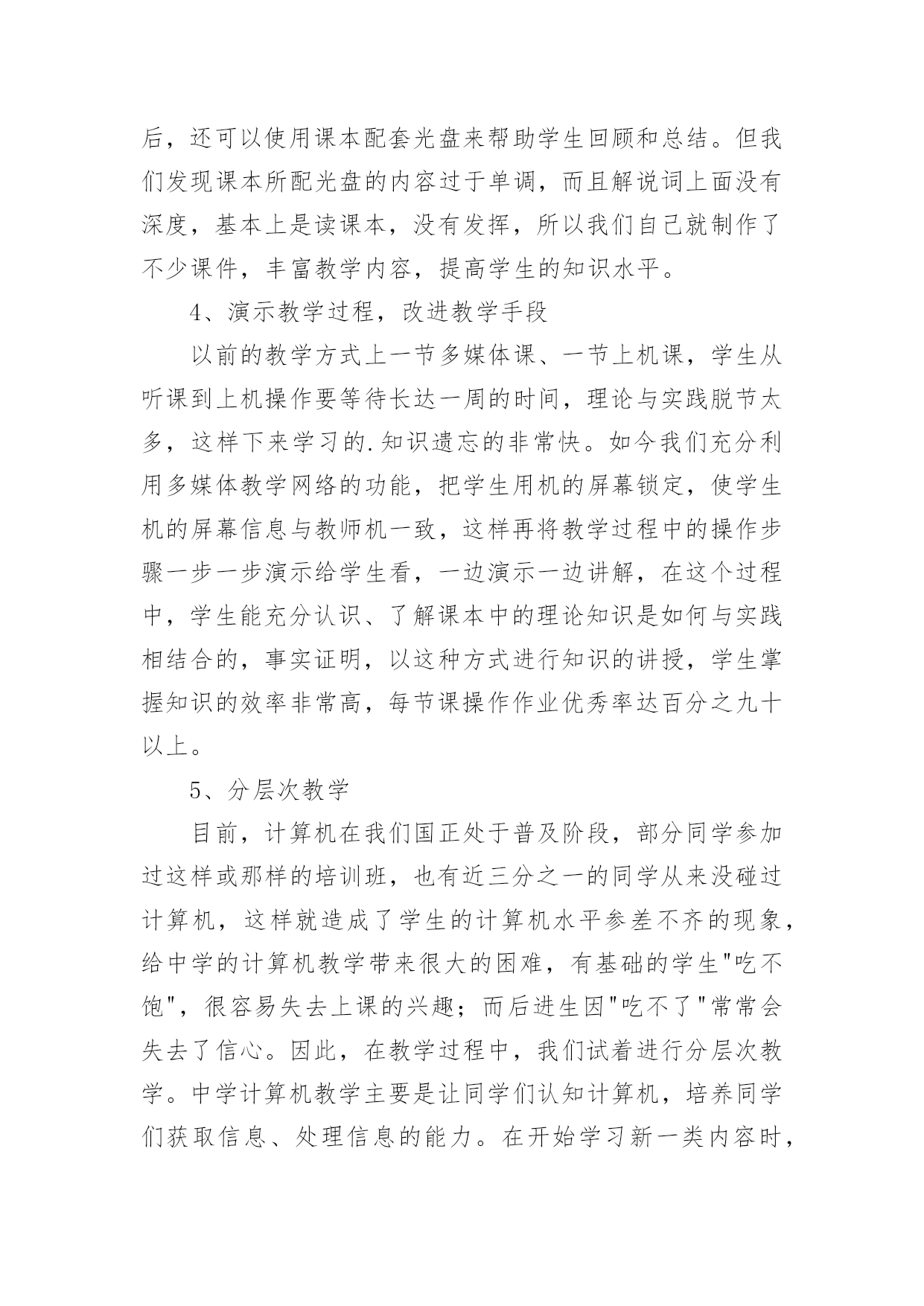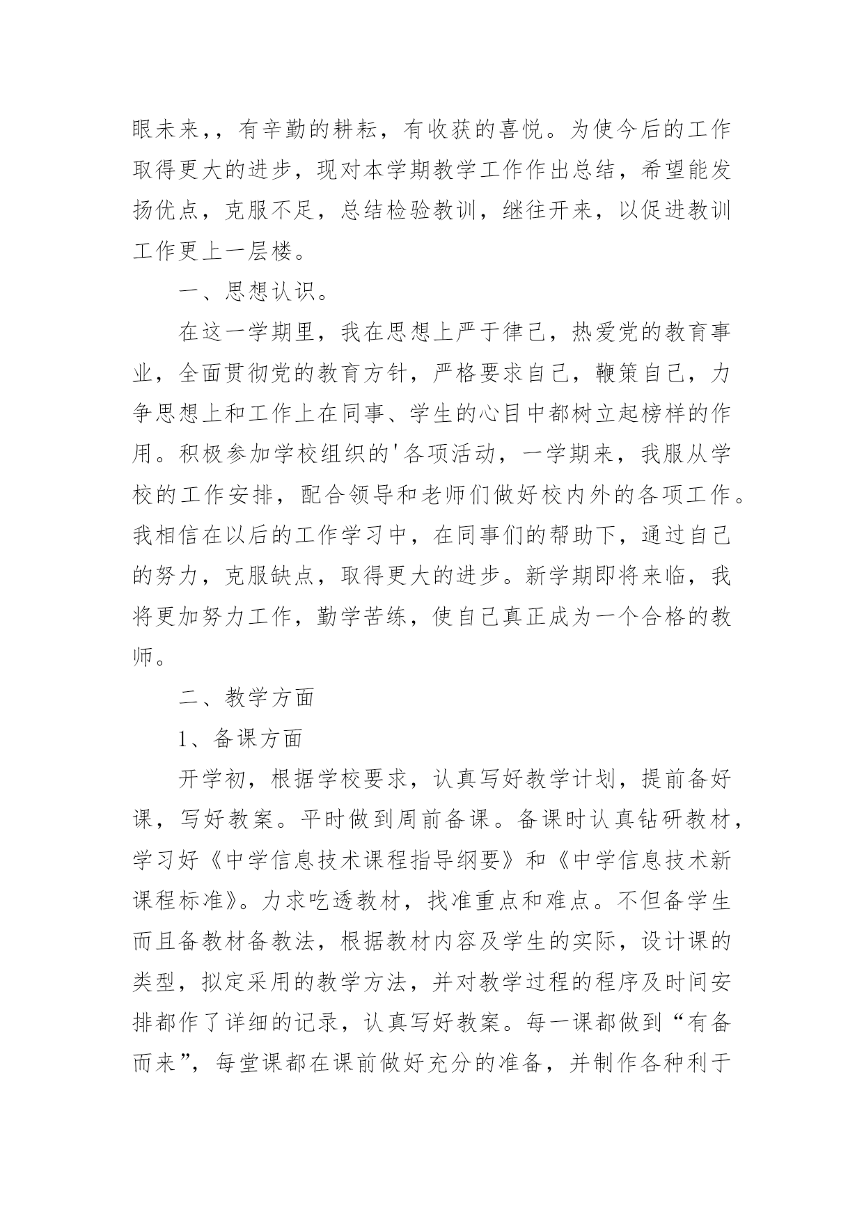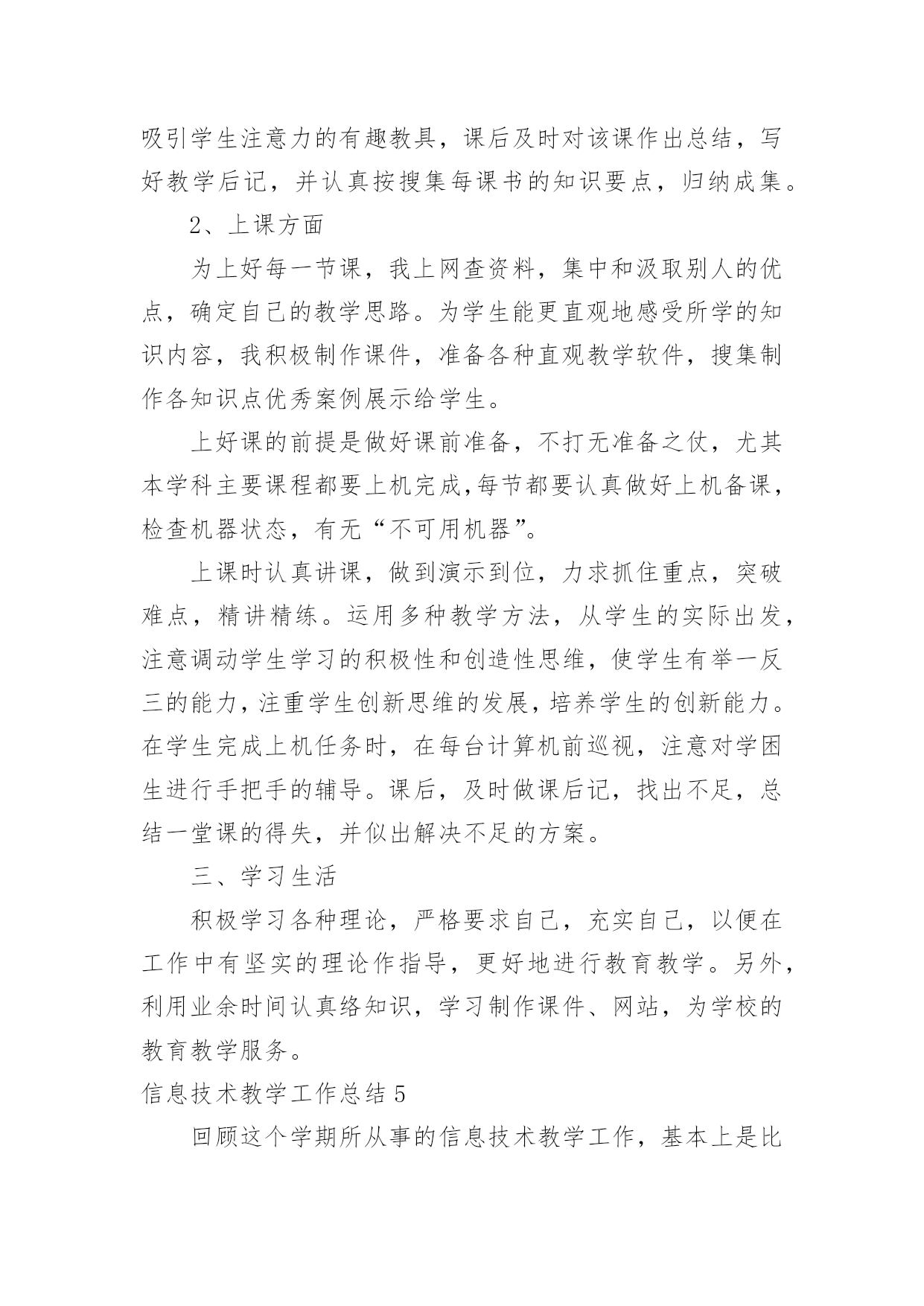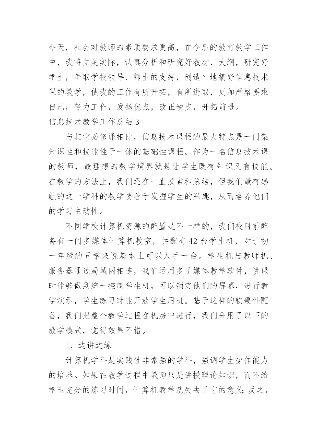 信息技术教学工作总结信息技术教学工作总结18篇总结是指对某一阶段的工作、学习或思想中的经验或情况进行分析研究,做出带有规律性结论的书面材料,它可以帮助我们有寻找学习和工作中的规律,让我们一起认真地写一份总结吧。如何把总结做到重点突出呢?以下是小编整理的信息技术教学工作总结,希望对大家有所帮助。信息技术教学工作总结1岁月如飞,一个学期就要结束了,回顾这个学期的工作,基本上是比较顺利的。“取其所长,补其所短”今天有益的收获,将会在下个学期的工作继续发扬,碰到的问题会认真思考,想办法解决。在这个学期中,我校信息技术教师能在保持原有良好工作态度的基础上,不断进步,不断进取,不断学习,虚心向有经验的老师学习。为了保持优良的工作姿态,现将这学期的工作情况进行全面的总结,总结如下:一、思想方面在这学期里,教师从思想上,利用师德师风教育活动端正自己;从行动上学电脑技术,学教学技能等;在生活上注意形象,为人师表。积极参加学习,努力提高自身的思想觉悟,服从学校的工作安排,默默无闻地配合领导和老师们做好校内外的各项工作,得到了领导和同事的肯定。二、工作方面这学期我校信息技术主要的工作主要包括在五个方面:一是担任四、五年级共7个班的信息技术课的教学,二是做好学校网络管理员工作,三是积极开展信息技术兴趣小组活动,四是积极组织3D虚拟机器人竞赛小组等各种培训工作,五是积极参加从化市教师技能大赛等各种活动。为了做好计算机室管理工作,更好地完成教学任务、为教学服务,本学期继续以发现和培养具有综合素质的学生为小组长,具体分工,连带促进,使各班每个组在上课时都能相互配合,共同遵守计算机室的规章制度,按老师要求进行正确操作,养成良好的学习习惯和卫生习惯。经过广泛地征求学生意见,制定了信息技术兴趣小组活动计划,明确了各年级人员名单,有效地开展了兴趣小组活动,主要开设电脑绘画课程。3D虚拟机器人竞赛小组首次参与了比赛,取得优异的成绩。胡思远同学的作品获得从化市二等奖的好成绩,并获得准备参加广州市初赛资格,并在广州市初赛中取得第45名的较好成绩。作为一名网管,本学期初信息技术科组对一年级、六年级6个班、美术、科学、音乐、电教等电脑平台进行了相关调试维护,力求它们能够正常的工作,为学生创造一个良好的学习环境。三、业务方面作为一名信息技术老师,应具有比别人更超前的目光,及时掌握最新的科技资讯。为此,教师平时还虚心请教有经验的.老师,经常上网浏览新课程教学及信息技术教学等资料,学习更多、更好、更新的知识。同时积极参加教研活动,多争取机会听评课,从中学习别人的长处,领悟其中的教学艺术,努力使自己向一名科研型教师看齐。四、考勤方面在做好各项教育教学工作的同时,信息技术教师能严格遵守学校的各项规章制度。对学校的工作尽职尽责,不论是学校分到的哪一项工作,都能配合同事尽自己的努力把工作做好。五、积极听课、评课,改进教学方法通过学校组织的听、评课活动。本学期,我校信息技术教师参加了多达8次区、镇级信息技术听评课活动以及本校多次其它学科听评课活动。教师们在学习中实践,在实践中提高,不断反思教学中的困惑,总结经验,提高了自己的教学水平。六、教师个人发展方面本学期,李杜平教师积极参加了从化市第一届信息技术教师技能大赛活动,并获得了一等奖的好成绩。展望与打算:“热爱事业,尽职尽责”是我们的信条,面对以上的一切,我们认为只要立足实际,认真分析和研究好教材、大纲,研究好学生,争取学校领导、师生的支持,就能创造性地搞好信息技术课教学,就能使我们的工作有所开拓,有所进取。信息技术教学工作总结2一个学期的工作即将结束,下面我对上学期的工作作一总结,为新学期的工作确立新的目标。一、教学工作本学期担任三、四、五、六年级共六个班级的信息技术课,一学期来,认真备课、上课、广泛涉猎各种知识,形成比较完整的知识结构,严格要求学生,尊重学生,发扬教学*,使学生学有所得。不断提高自己的教学水平和思想觉悟,并顺利完成教育教学任务。二、学校工作我严格要求自己,工作实干,并能完成学校给予的各项任务。担任学校的网络管理员以来,工作兢兢业业,做好资源的下载与发布以及农远设备的'使用与维护,为全校教师的教学服务。除此之外,还主要完成了学校学生机房电脑及其它设备的维护;全校多媒体设备及教师办公室电脑的日常维护;完成了学校网站资源的上传、全国中小学体质健康数据的采集及数据上报;并完成了学校领导安排的所有任务。三、考勤方面我在做好各项教育教学工作的同时,严格遵守学校的各项规章制度。处理好学校工作与个人之间的关系,做到了不迟到,不早退。准时参加学校各项会议、校本培训。四、教学成绩协助中心校顺利完成了20xx—20xx第一学期教育局组织的小学信息技术上机考试,学生大部分都取得了良好的成绩。并且被评为徐水县优秀网管员。五、下学期展望教书育人
