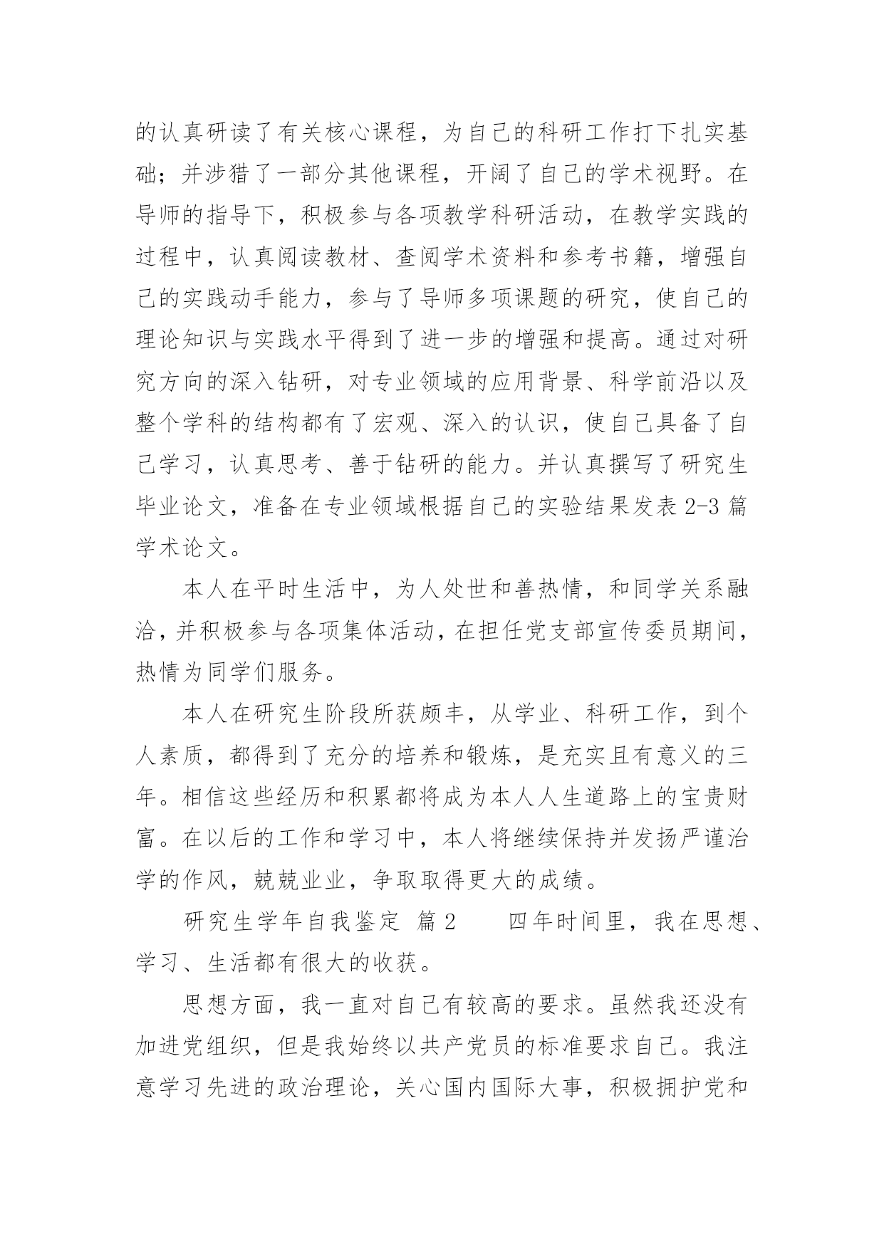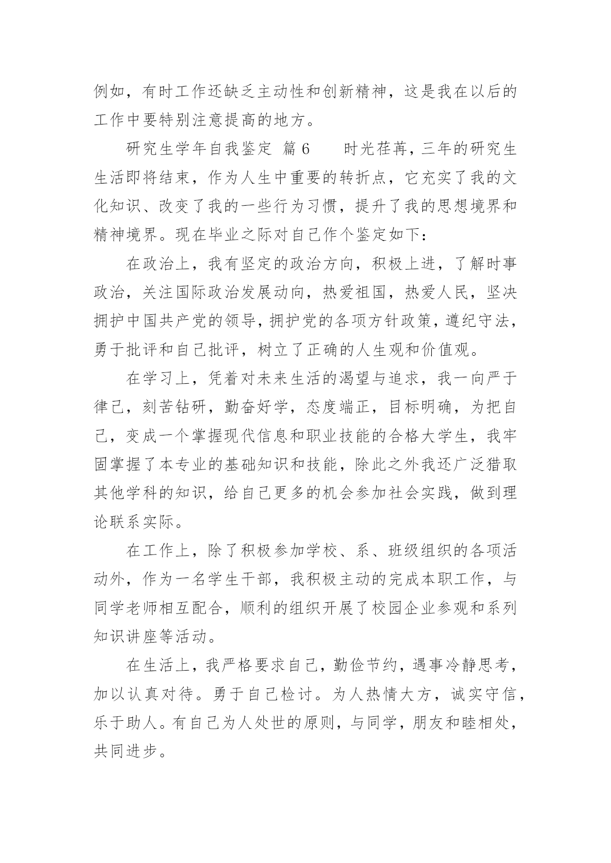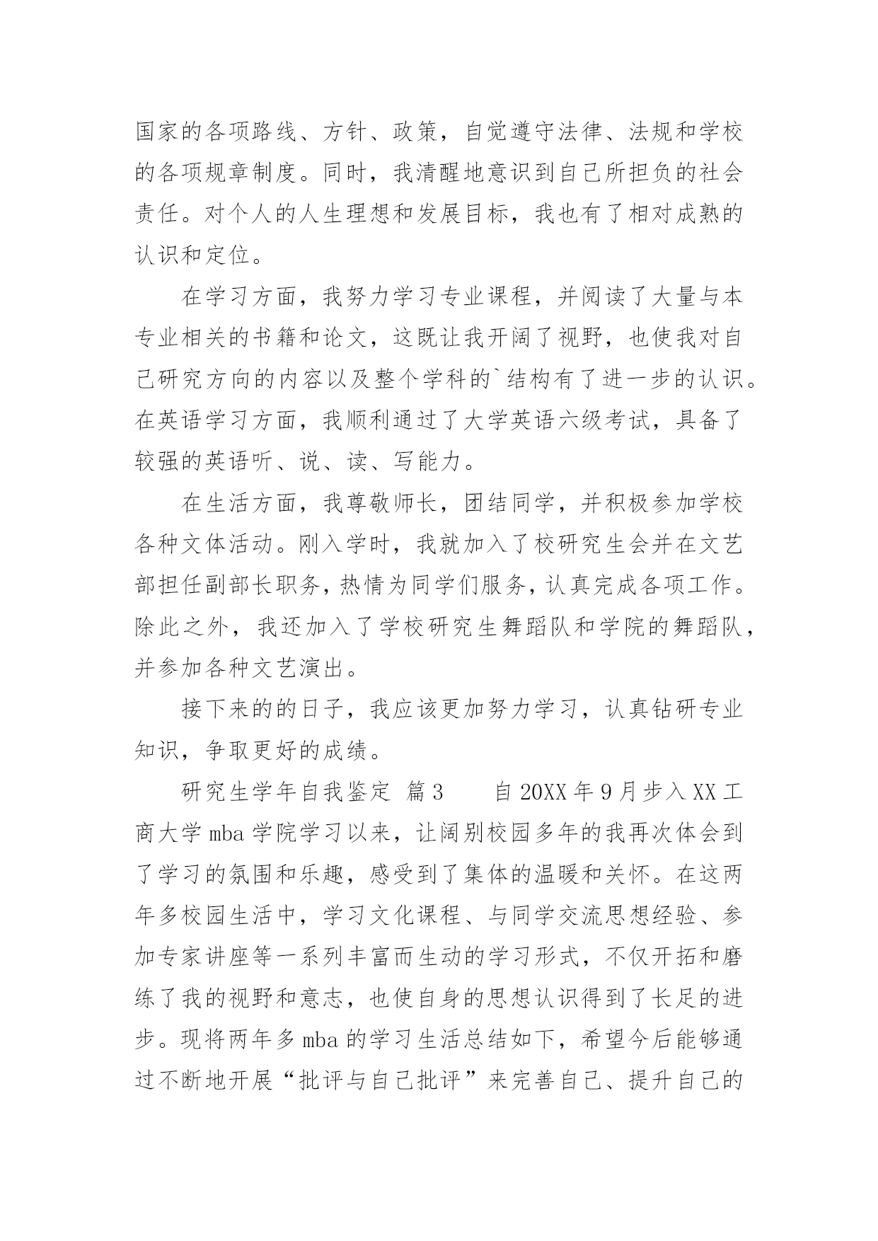 研究生学年自我鉴定研究生学年自我鉴定范文(精选14篇)正常来讲,自我鉴定即为自己总结,它能够头脑更加清醒,目标更加明确,因此,让我们写一份自我鉴定吧。那么自我鉴定应该包括什么内容呢?下面是小编帮大家整理的研究生学年自我鉴定范文,欢迎阅读与收藏。研究生学年自我鉴定篇1时光荏苒,光阴流逛一转眼我已经是一名快毕业的研究生了。回首过去的一年,我觉得还是比较充实而有意义的,有很多收获,当然也有失落。总的来说自己成熟了很多。在这里对自己过去一年的学习、生活、科研及社会工作等做一个小结,目的是总结经验,发现不足之处,以利于今后继续发扬优点,弥补不足,为将来适应社会做好准备,把自己的人生道路走得更稳、更好,更快成材以服务于祖国和人民。先从政治思想和道德品质方面谈谈我这一年来的认识和收获。虽然自己早已是一名正式的共产党员,但我始终不忘党的宗旨,时刻以共产党员的标准严格要求自己,在学习、工作、思想上起带头作用,特别上在政治上起先锋模范作用,努力在群众中树立了一个共产党员的良好形象。用科学发展观来认识世界认识社会,能清醒的意识到自己所担负的.社会责任,对个人的人生理想和发展目标,有了相对成熟的认识和定位。本人在学习方面,根据自身研究方向的要求,有针对性的认真研读了有关核心课程,为自己的科研工作打下扎实基础;并涉猎了一部分其他课程,开阔了自己的学术视野。在导师的指导下,积极参与各项教学科研活动,在教学实践的过程中,认真阅读教材、查阅学术资料和参考书籍,增强自己的实践动手能力,参与了导师多项课题的研究,使自己的理论知识与实践水平得到了进一步的增强和提高。通过对研究方向的深入钻研,对专业领域的应用背景、科学前沿以及整个学科的结构都有了宏观、深入的认识,使自己具备了自己学习,认真思考、善于钻研的能力。并认真撰写了研究生毕业论文,准备在专业领域根据自己的实验结果发表2-3篇学术论文。本人在平时生活中,为人处世和善热情,和同学关系融洽,并积极参与各项集体活动,在担任党支部宣传委员期间,热情为同学们服务。本人在研究生阶段所获颇丰,从学业、科研工作,到个人素质,都得到了充分的培养和锻炼,是充实且有意义的三年。相信这些经历和积累都将成为本人人生道路上的宝贵财富。在以后的工作和学习中,本人将继续保持并发扬严谨治学的作风,兢兢业业,争取取得更大的成绩。研究生学年自我鉴定篇2四年时间里,我在思想、学习、生活都有很大的收获。思想方面,我一直对自己有较高的要求。虽然我还没有加进党组织,但是我始终以共产党员的标准要求自己。我注意学习先进的政治理论,关心国内国际大事,积极拥护党和国家的各项路线、方针、政策,自觉遵守法律、法规和学校的各项规章制度。同时,我清醒地意识到自己所担负的社会责任。对个人的人生理想和发展目标,我也有了相对成熟的认识和定位。在学习方面,我努力学习专业课程,并阅读了大量与本专业相关的书籍和论文,这既让我开阔了视野,也使我对自己研究方向的内容以及整个学科的`结构有了进一步的认识。在英语学习方面,我顺利通过了大学英语六级考试,具备了较强的英语听、说、读、写能力。在生活方面,我尊敬师长,团结同学,并积极参加学校各种文体活动。刚入学时,我就加入了校研究生会并在文艺部担任副部长职务,热情为同学们服务,认真完成各项工作。除此之外,我还加入了学校研究生舞蹈队和学院的舞蹈队,并参加各种文艺演出。接下来的的日子,我应该更加努力学习,认真钻研专业知识,争取更好的成绩。研究生学年自我鉴定篇3自20XX年9月步入XX工商大学mba学院学习以来,让阔别校园多年的我再次体会到了学习的氛围和乐趣,感受到了集体的温暖和关怀。在这两年多校园生活中,学习文化课程、与同学交流思想经验、参加专家讲座等一系列丰富而生动的学习形式,不仅开拓和磨练了我的视野和意志,也使自身的思想认识得到了长足的进步。现将两年多mba的学习生活总结如下,希望今后能够通过不断地开展“批评与自己批评”来完善自己、提升自己的价值:一、加强理论学习竖立正确价值观。理论知识的学习永远都是武装自己最强有力的力量,在mba学院学习过程中我印象最深的两门课分别是管理经济学和企业运营模拟。在管理经济学中通过观看《公司的力量》这部纪录片,使我感受到公司改变世界力量的强大,而企业运营模拟通过小组间的模拟运营竞争,使我乐此不彼,完全沉浸其间……可以说,mba的各门课程就像一扇扇在我面前打开的门,当你迈入不同的门里,你会发现里面的世界是如此丰富多彩。经过多年工作的历练和社会现实的考验,我深知理论知识学习的重要,它是获取经验和汲取营养最便捷的途径。然而,价值观念的正确竖立也是理论知识学习过程中不可小觑的重要一环,从大学毕业时大谈兴邦富国,到现在专注自身能力的.提升和锻炼,mba两年多的学习经历,更加坚定了我的想法:你不可能改变整个世界,但只有改变了
