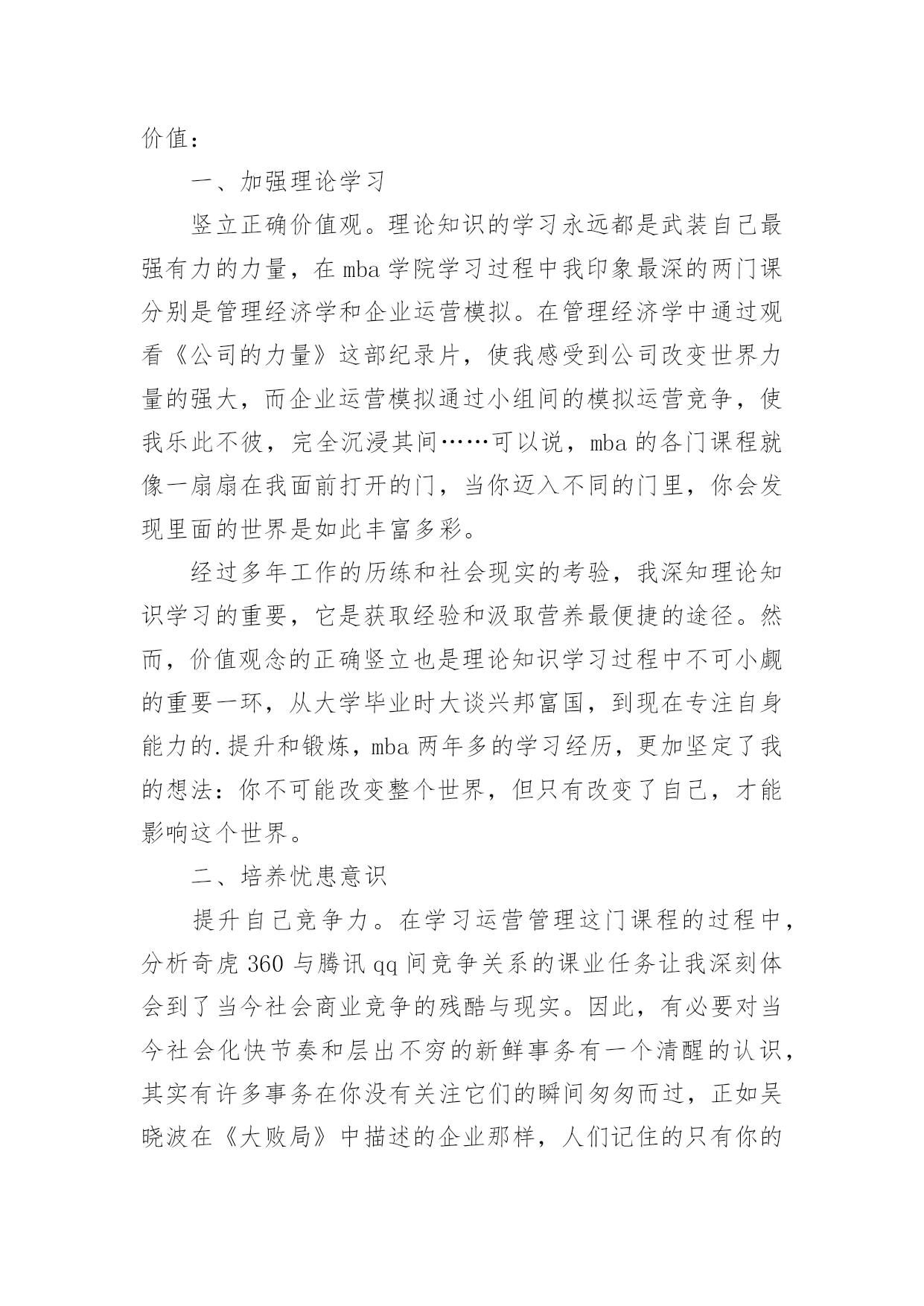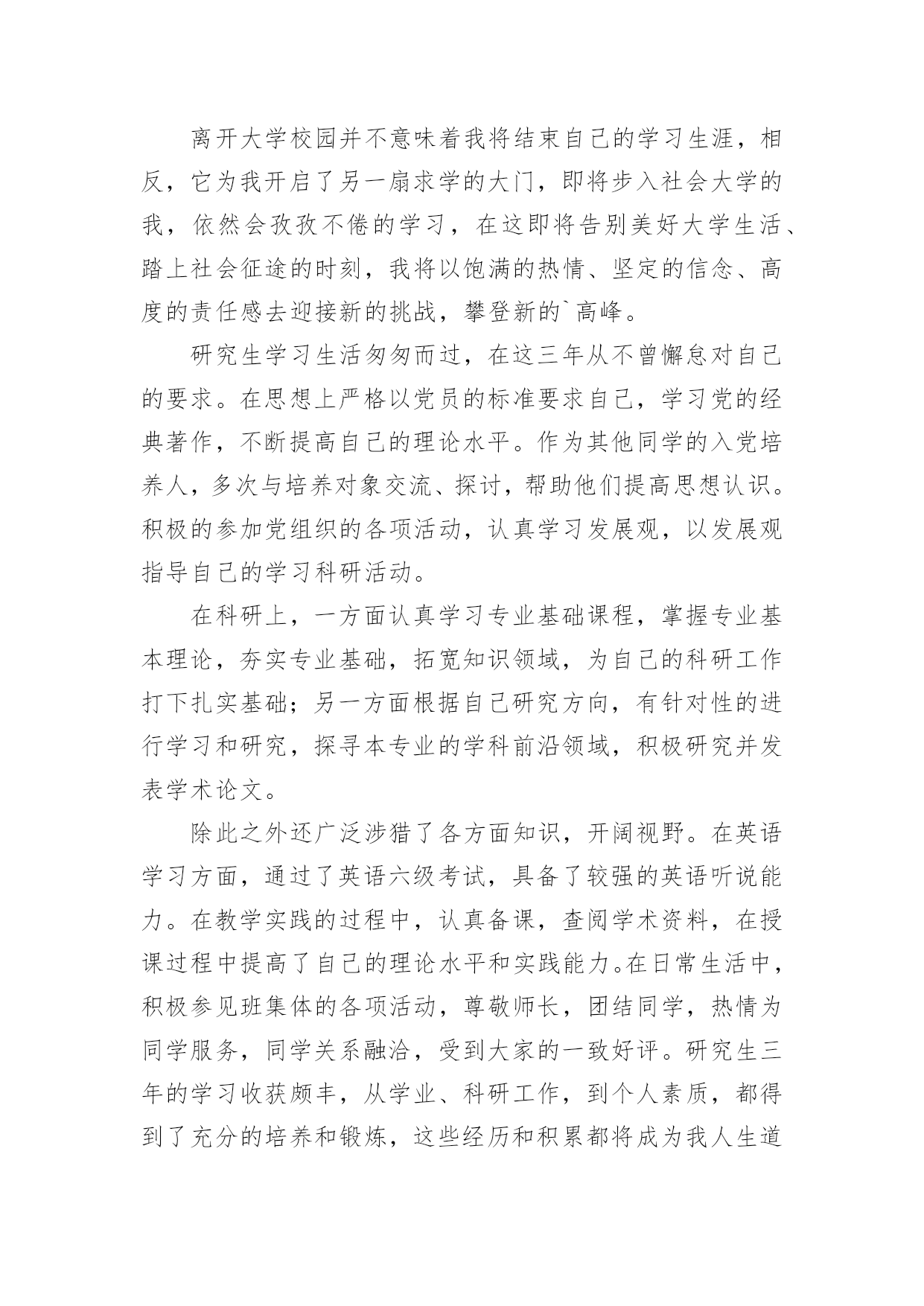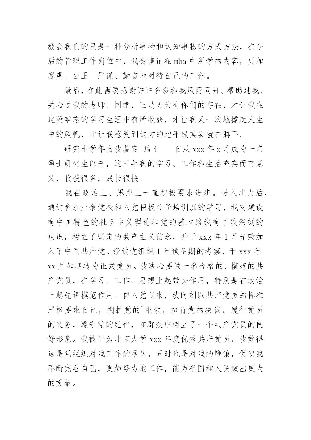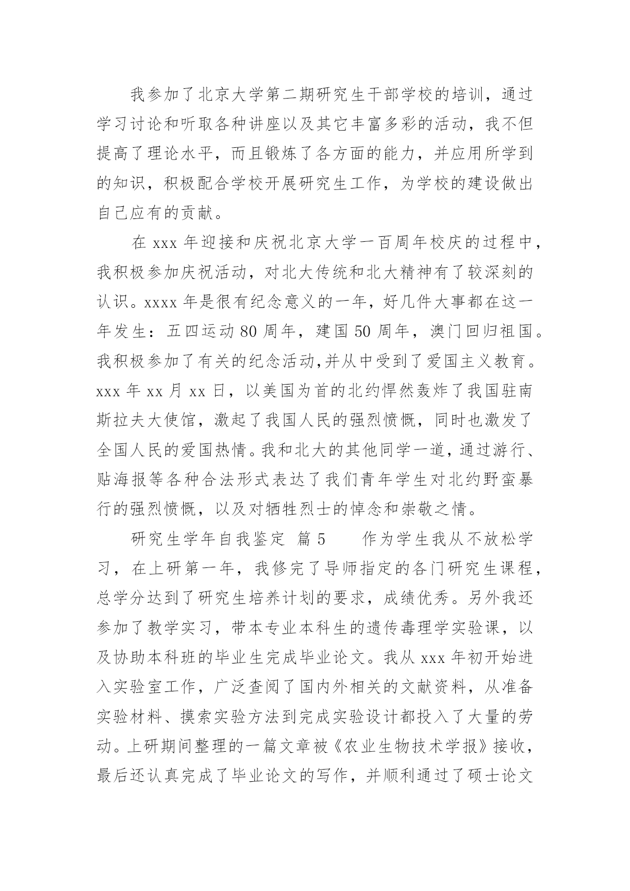 研究生学年自我鉴定研究生学年自我鉴定范文(精选14篇)正常来讲,自我鉴定即为自己总结,它能够头脑更加清醒,目标更加明确,因此,让我们写一份自我鉴定吧。那么自我鉴定应该包括什么内容呢?下面是小编帮大家整理的研究生学年自我鉴定范文,欢迎阅读与收藏。研究生学年自我鉴定篇1时光荏苒,光阴流逛一转眼我已经是一名快毕业的研究生了。回首过去的一年,我觉得还是比较充实而有意义的,有很多收获,当然也有失落。总的来说自己成熟了很多。在这里对自己过去一年的学习、生活、科研及社会工作等做一个小结,目的是总结经验,发现不足之处,以利于今后继续发扬优点,弥补不足,为将来适应社会做好准备,把自己的人生道路走得更稳、更好,更快成材以服务于祖国和人民。先从政治思想和道德品质方面谈谈我这一年来的认识和收获。虽然自己早已是一名正式的共产党员,但我始终不忘党的宗旨,时刻以共产党员的标准严格要求自己,在学习、工作、思想上起带头作用,特别上在政治上起先锋模范作用,努力在群众中树立了一个共产党员的良好形象。用科学发展观来认识世界认识社会,能清醒的意识到自己所担负的.社会责任,对个人的人生理想和发展目标,有了相对成熟的认识和定位。本人在学习方面,根据自身研究方向的要求,有针对性的认真研读了有关核心课程,为自己的科研工作打下扎实基础;并涉猎了一部分其他课程,开阔了自己的学术视野。在导师的指导下,积极参与各项教学科研活动,在教学实践的过程中,认真阅读教材、查阅学术资料和参考书籍,增强自己的实践动手能力,参与了导师多项课题的研究,使自己的理论知识与实践水平得到了进一步的增强和提高。通过对研究方向的深入钻研,对专业领域的应用背景、科学前沿以及整个学科的结构都有了宏观、深入的认识,使自己具备了自己学习,认真思考、善于钻研的能力。并认真撰写了研究生毕业论文,准备在专业领域根据自己的实验结果发表2-3篇学术论文。本人在平时生活中,为人处世和善热情,和同学关系融洽,并积极参与各项集体活动,在担任党支部宣传委员期间,热情为同学们服务。本人在研究生阶段所获颇丰,从学业、科研工作,到个人素质,都得到了充分的培养和锻炼,是充实且有意义的三年。相信这些经历和积累都将成为本人人生道路上的宝贵财富。在以后的工作和学习中,本人将继续保持并发扬严谨治学的作风,兢兢业业,争取取得更大的成绩。研究生学年自我鉴定篇2四年时间里,我在思想、学习、生活都有很大的收获。思想方面,我一直对自己有较高的要求。虽然我还没有加进党组织,但是我始终以共产党员的标准要求自己。我注意学习先进的政治理论,关心国内国际大事,积极拥护党和国家的各项路线、方针、政策,自觉遵守法律、法规和学校的各项规章制度。同时,我清醒地意识到自己所担负的社会责任。对个人的人生理想和发展目标,我也有了相对成熟的认识和定位。在学习方面,我努力学习专业课程,并阅读了大量与本专业相关的书籍和论文,这既让我开阔了视野,也使我对自己研究方向的内容以及整个学科的`结构有了进一步的认识。在英语学习方面,我顺利通过了大学英语六级考试,具备了较强的英语听、说、读、写能力。在生活方面,我尊敬师长,团结同学,并积极参加学校各种文体活动。刚入学时,我就加入了校研究生会并在文艺部担任副部长职务,热情为同学们服务,认真完成各项工作。除此之外,我还加入了学校研究生舞蹈队和学院的舞蹈队,并参加各种文艺演出。接下来的的日子,我应该更加努力学习,认真钻研专业知识,争取更好的成绩。研究生学年自我鉴定篇3自20XX年9月步入XX工商大学mba学院学习以来,让阔别校园多年的我再次体会到了学习的氛围和乐趣,感受到了集体的温暖和关怀。在这两年多校园生活中,学习文化课程、与同学交流思想经验、参加专家讲座等一系列丰富而生动的学习形式,不仅开拓和磨练了我的视野和意志,也使自身的思想认识得到了长足的进步。现将两年多mba的学习生活总结如下,希望今后能够通过不断地开展“批评与自己批评”来完善自己、提升自己的价值:一、加强理论学习竖立正确价值观。理论知识的学习永远都是武装自己最强有力的力量,在mba学院学习过程中我印象最深的两门课分别是管理经济学和企业运营模拟。在管理经济学中通过观看《公司的力量》这部纪录片,使我感受到公司改变世界力量的强大,而企业运营模拟通过小组间的模拟运营竞争,使我乐此不彼,完全沉浸其间……可以说,mba的各门课程就像一扇扇在我面前打开的门,当你迈入不同的门里,你会发现里面的世界是如此丰富多彩。经过多年工作的历练和社会现实的考验,我深知理论知识学习的重要,它是获取经验和汲取营养最便捷的途径。然而,价值观念的正确竖立也是理论知识学习过程中不可小觑的重要一环,从大学毕业时大谈兴邦富国,到现在专注自身能力的.提升和锻炼,mba两年多的学习经历,更加坚定了我的想法:你不可能改变整个世界,但只有改变了