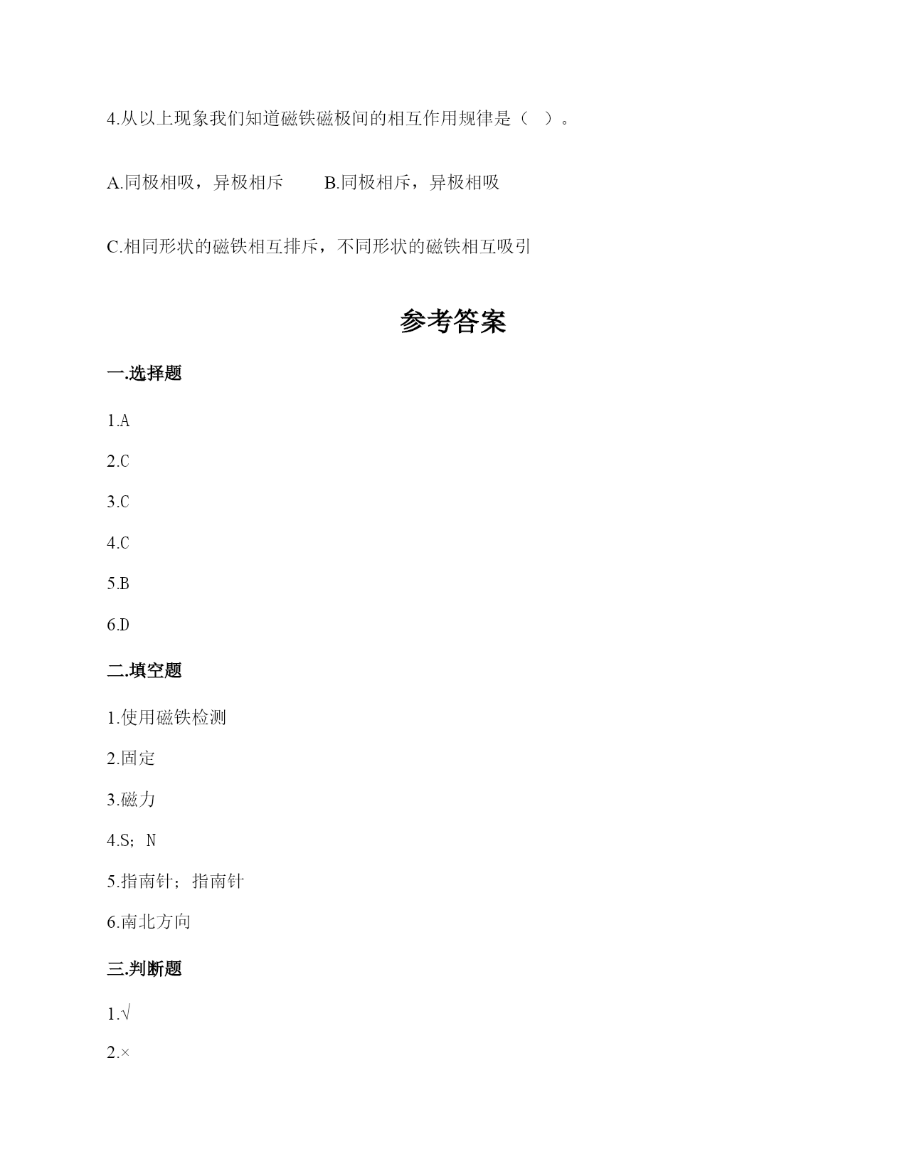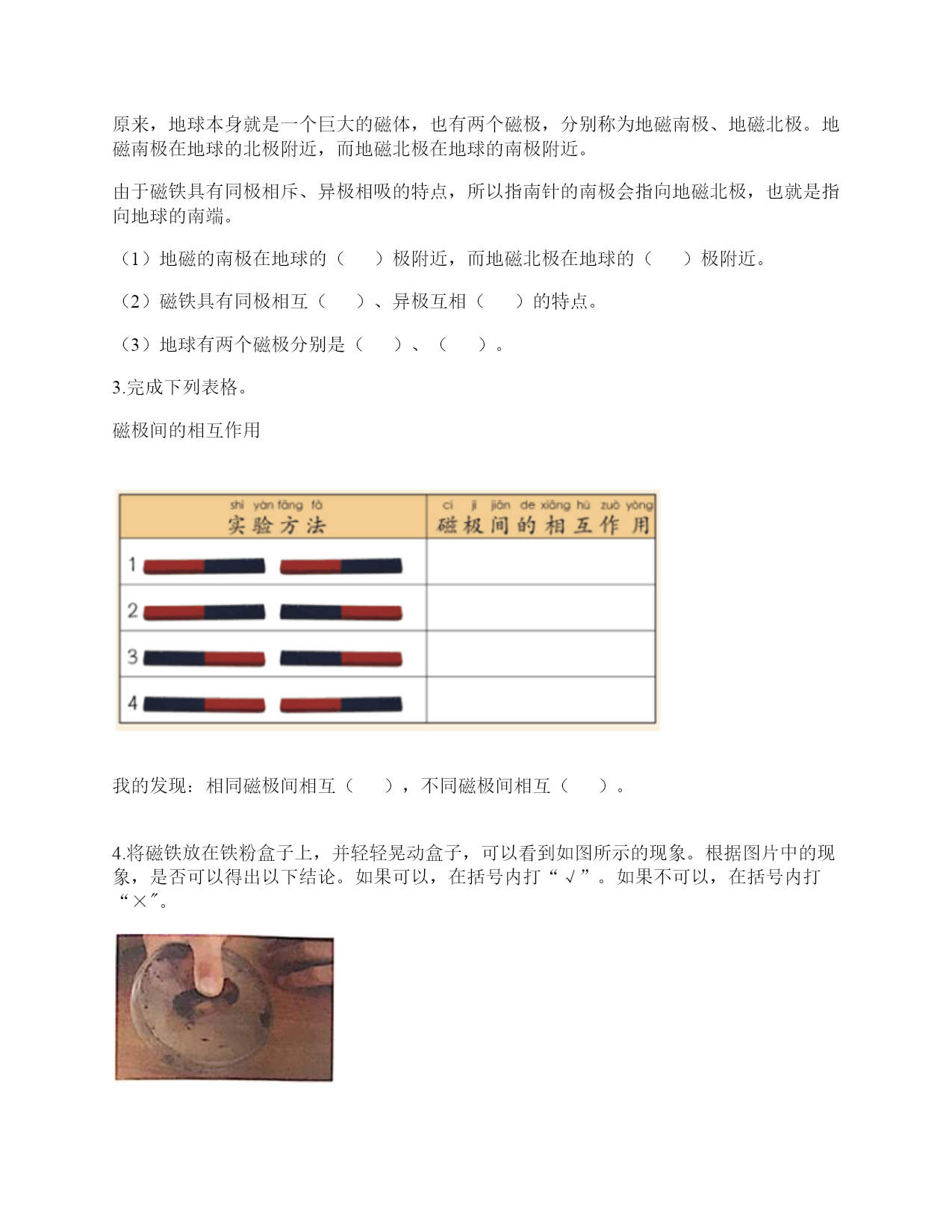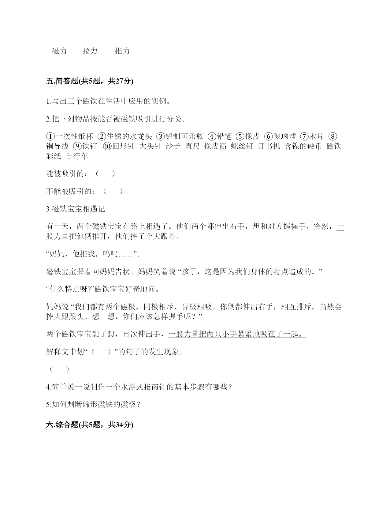 小学科学《磁铁》练习题一.选择题(共6题,共12分)1.蹄形磁铁磁力最强的部位是()。A.两端B.中间C.各个部位都一样2.很早以前,人们在寻找铁矿时,发现了一种能吸铁的矿石,他们把这种矿石叫做()A.磁铁B.吸铁石C.磁石D.铁矿石3.磁力黑板擦(如图)的发明,利用了()。A.磁铁能指示方向的特点B.磁极相互排斥的原理C.磁铁可以吸引铁的性质4.将下列物体与指南针放在一起,不会影响指南针正确指示方向的是()。A.铁钉B.蹄形磁铁C.塑料尺5.条形磁铁的S极靠近另一块条形磁铁的()极会相互吸引。A.SB.NC.S和N都可以D.S和N都不行6.如图的条形磁铁磁力最强的部分是()。A.A和BB.B和CC.C和DD.A和D二.填空题(共6题,共16分)1.辨认铁制品,()比用眼看更可靠。2.一般情况下,磁铁的磁力大小是()的。3.磁铁用()使物体移动。这种力的产生是因为磁铁周围存在磁场。4.人们用字母()表示磁铁的南极,用字母()表示磁铁的北极。5.()是我国古代四大发明之一。九百多年前,我国海船已使用()导航。6.指南针是我国四大发明之一,利用了磁铁能够指示()的特点制成的。三.判断题(共6题,共12分)1.磁悬浮列车利用了磁极间的相互作用。()2.磁铁只能够吸引铁质的东西,其他的都不能吸引。()3.两个或多个磁铁吸在一起,磁力大小会发生改变。()4.磁带中并没有磁铁。()5.从古至今,指南针在形状及准确性方面都有了很大的改进。()6.钢针经过磁铁沿同一方向摩擦后可以变成磁针。()四.连线题(共1题,共3分)1.下列圈起来的物体分别受到了什么力?连一连。磁力拉力推力五.简答题(共5题,共27分)1.写出三个磁铁在生活中应用的实例。2.把下列物品按能否被磁铁吸引进行分类。①一次性纸杯②生锈的水龙头③铝制可乐瓶④铅笔⑤橡皮⑥玻璃球⑦木片⑧铜导线⑨铁钉⑩回形针大头针沙子直尺橡皮筋螺丝钉订书机含镍的硬币磁铁彩纸自行车能被吸引的:()不能被吸引的:()3.磁铁宝宝相遇记有一天,两个磁铁宝宝在路上相遇了。他们两个都伸出右手,想和对方握握手。突然,一股力量把他俩推开,他们摔了个大跟斗。“妈妈,他推我,呜呜……”。磁铁宝宝哭着向妈妈告状。妈妈笑着说:“孩子,这是因为我们身体的特点造成的。”“什么特点呀?”磁铁宝宝好奇地问。妈妈说:“我们都有两个磁极,同极相斥、异极相吸。你俩都伸出右手,相互排斥,当然会摔大跟跟头。想一想,你们应该怎样握手呢?”两个磁铁宝宝想了想,再次伸出手,一股力量把两只小手紧紧地吸在了一起。解释文中划“()”的句子的发生现象。()4.简单说一说制作一个水浮式指南针的基本步骤有哪些?5.如何判断蹄形磁铁的磁极?六.综合题(共5题,共34分)1.深秋季节,你看到过大雁南飞的景象吗?原来,大雁南飞也与“磁”有关。在大雁的身体里,有一套天然的“地磁导航系统”。利用磁铁,我们可以模拟大雁南飞。实验材料:条形磁铁3块,棉线3根,纸、笔、剪刀、双面胶等。实验过程:①剪。在纸上画3只大雁,并用剪刀剪下。②贴。把系着棉线的条形磁铁粘在大雁的反面。S极朝着大雁的头部。③挂。把制作好的大雁挂起来,观察大雁的头是不是朝向南方。④排。把制作好的3只大雁排成一列。静止后,大雁们是不是都朝着南方“飞行”了?再试着转动大雁的方向,一会儿后,大雁还能排成一列,继续往南“飞”吗?想一想:这个小实验利用了磁铁的什么特点?2.阅读并完成填空。磁铁为什么能指示南北方向我们知道,水平悬挂的条形磁铁静止后总是能够指示南北方向。指南针就是利用磁铁的这个特点制成的。那么,磁铁为什么能够指示方向呢?原来,地球本身就是一个巨大的磁体,也有两个磁极,分别称为地磁南极、地磁北极。地磁南极在地球的北极附近,而地磁北极在地球的南极附近。由于磁铁具有同极相斥、异极相吸的特点,所以指南针的南极会指向地磁北极,也就是指向地球的南端。(1)地磁的南极在地球的()极附近,而地磁北极在地球的()极附近。(2)磁铁具有同极相互()、异极互相()的特点。(3)地球有两个磁极分别是()、()。3.完成下列表格。磁极间的相互作用我的发现:相同磁极间相互(),不同磁极间相互()。4.将磁铁放在铁粉盒子上,并轻轻晃动盒子,可以看到如图所示的现象。根据图片中的现象,是否可以得出以下结论。如果可以,在括号内打“√”。如果不可以,在括号内打“×"。(1)条形磁铁能吸引铁粉。()(2)条形磁铁有两极。()(3)条形磁铁的磁极间有相互作用。()(4)条形磁铁不同部位的磁力大小不同。()(5)条形磁铁两端磁力大,中间磁力小。()5.两位同学正在做磁铁实验,观察下