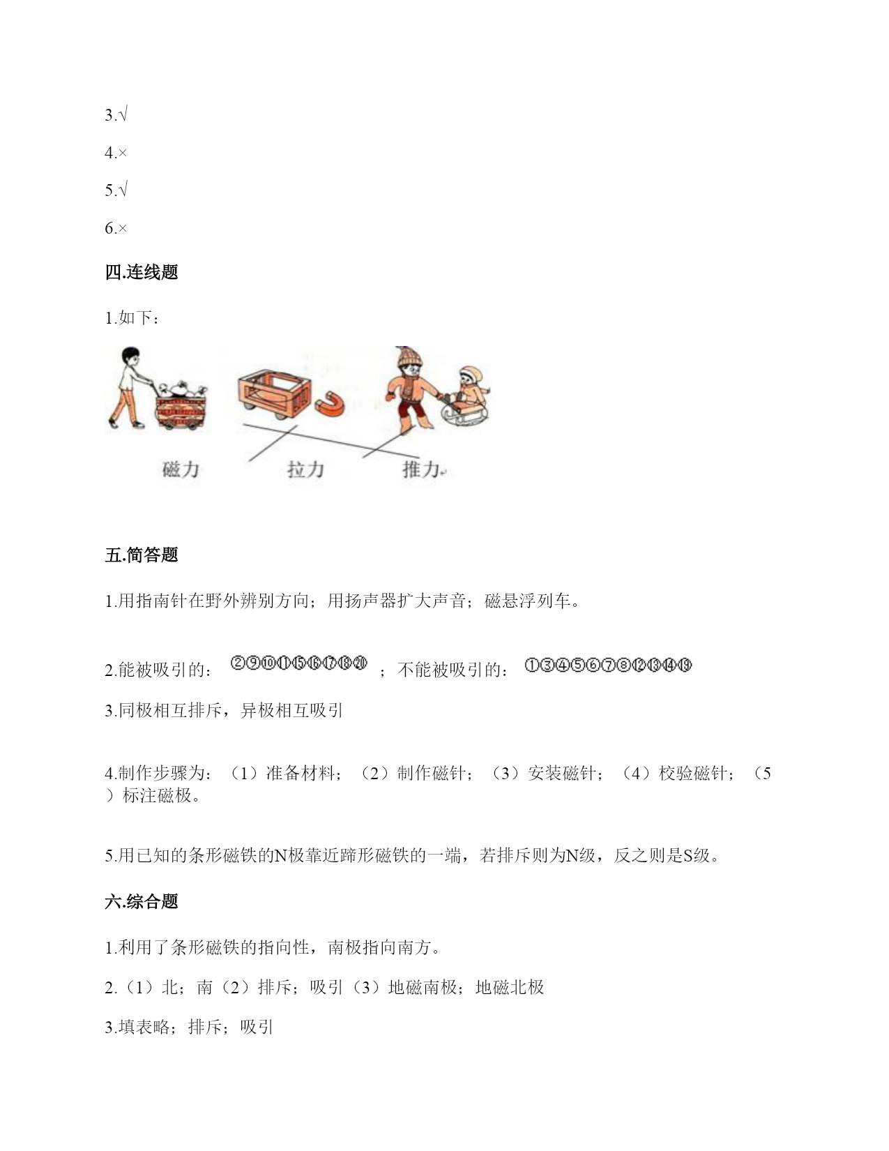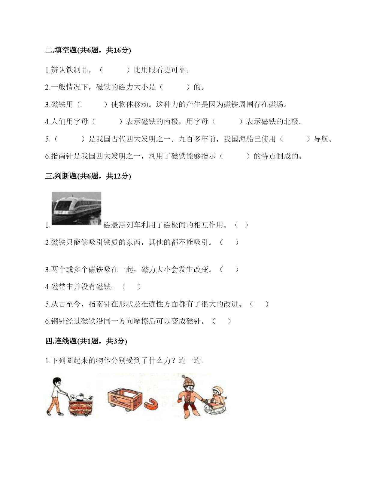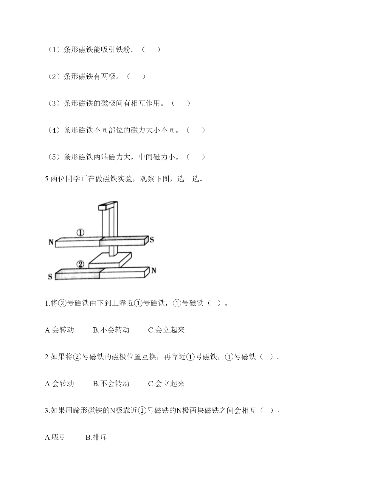 小学科学《磁铁》练习题一.选择题(共6题,共12分)1.蹄形磁铁磁力最强的部位是()。A.两端B.中间C.各个部位都一样2.很早以前,人们在寻找铁矿时,发现了一种能吸铁的矿石,他们把这种矿石叫做()A.磁铁B.吸铁石C.磁石D.铁矿石3.磁力黑板擦(如图)的发明,利用了()。A.磁铁能指示方向的特点B.磁极相互排斥的原理C.磁铁可以吸引铁的性质4.将下列物体与指南针放在一起,不会影响指南针正确指示方向的是()。A.铁钉B.蹄形磁铁C.塑料尺5.条形磁铁的S极靠近另一块条形磁铁的()极会相互吸引。A.SB.NC.S和N都可以D.S和N都不行6.如图的条形磁铁磁力最强的部分是()。A.A和BB.B和CC.C和DD.A和D二.填空题(共6题,共16分)1.辨认铁制品,()比用眼看更可靠。2.一般情况下,磁铁的磁力大小是()的。3.磁铁用()使物体移动。这种力的产生是因为磁铁周围存在磁场。4.人们用字母()表示磁铁的南极,用字母()表示磁铁的北极。5.()是我国古代四大发明之一。九百多年前,我国海船已使用()导航。6.指南针是我国四大发明之一,利用了磁铁能够指示()的特点制成的。三.判断题(共6题,共12分)1.磁悬浮列车利用了磁极间的相互作用。()2.磁铁只能够吸引铁质的东西,其他的都不能吸引。()3.两个或多个磁铁吸在一起,磁力大小会发生改变。()4.磁带中并没有磁铁。()5.从古至今,指南针在形状及准确性方面都有了很大的改进。()6.钢针经过磁铁沿同一方向摩擦后可以变成磁针。()四.连线题(共1题,共3分)1.下列圈起来的物体分别受到了什么力?连一连。磁力拉力推力五.简答题(共5题,共27分)1.写出三个磁铁在生活中应用的实例。2.把下列物品按能否被磁铁吸引进行分类。①一次性纸杯②生锈的水龙头③铝制可乐瓶④铅笔⑤橡皮⑥玻璃球⑦木片⑧铜导线⑨铁钉⑩回形针大头针沙子直尺橡皮筋螺丝钉订书机含镍的硬币磁铁彩纸自行车能被吸引的:()不能被吸引的:()3.磁铁宝宝相遇记有一天,两个磁铁宝宝在路上相遇了。他们两个都伸出右手,想和对方握握手。突然,一股力量把他俩推开,他们摔了个大跟斗。“妈妈,他推我,呜呜……”。磁铁宝宝哭着向妈妈告状。妈妈笑着说:“孩子,这是因为我们身体的特点造成的。”“什么特点呀?”磁铁宝宝好奇地问。妈妈说:“我们都有两个磁极,同极相斥、异极相吸。你俩都伸出右手,相互排斥,当然会摔大跟跟头。想一想,你们应该怎样握手呢?”两个磁铁宝宝想了想,再次伸出手,一股力量把两只小手紧紧地吸在了一起。解释文中划“()”的句子的发生现象。()4.简单说一说制作一个水浮式指南针的基本步骤有哪些?5.如何判断蹄形磁铁的磁极?六.综合题(共5题,共34分)1.深秋季节,你看到过大雁南飞的景象吗?原来,大雁南飞也与“磁”有关。在大雁的身体里,有一套天然的“地磁导航系统”。利用磁铁,我们可以模拟大雁南飞。实验材料:条形磁铁3块,棉线3根,纸、笔、剪刀、双面胶等。实验过程:①剪。在纸上画3只大雁,并用剪刀剪下。②贴。把系着棉线的条形磁铁粘在大雁的反面。S极朝着大雁的头部。③挂。把制作好的大雁挂起来,观察大雁的头是不是朝向南方。④排。把制作好的3只大雁排成一列。静止后,大雁们是不是都朝着南方“飞行”了?再试着转动大雁的方向,一会儿后,大雁还能排成一列,继续往南“飞”吗?想一想:这个小实验利用了磁铁的什么特点?2.阅读并完成填空。磁铁为什么能指示南北方向我们知道,水平悬挂的条形磁铁静止后总是能够指示南北方向。指南针就是利用磁铁的这个特点制成的。那么,磁铁为什么能够指示方向呢?原来,地球本身就是一个巨大的磁体,也有两个磁极,分别称为地磁南极、地磁北极。地磁南极在地球的北极附近,而地磁北极在地球的南极附近。由于磁铁具有同极相斥、异极相吸的特点,所以指南针的南极会指向地磁北极,也就是指向地球的南端。(1)地磁的南极在地球的()极附近,而地磁北极在地球的()极附近。(2)磁铁具有同极相互()、异极互相()的特点。(3)地球有两个磁极分别是()、()。3.完成下列表格。磁极间的相互作用我的发现:相同磁极间相互(),不同磁极间相互()。4.将磁铁放在铁粉盒子上,并轻轻晃动盒子,可以看到如图所示的现象。根据图片中的现象,是否可以得出以下结论。如果可以,在括号内打“√”。如果不可以,在括号内打“×"。(1)条形磁铁能吸引铁粉。()(2)条形磁铁有两极。()(3)条形磁铁的磁极间有相互作用。()(4)条形磁铁不同部位的磁力大小不同。()(5)条形磁铁两端磁力大,中间磁力小。()5.两位同学正在做磁铁实验,观察下