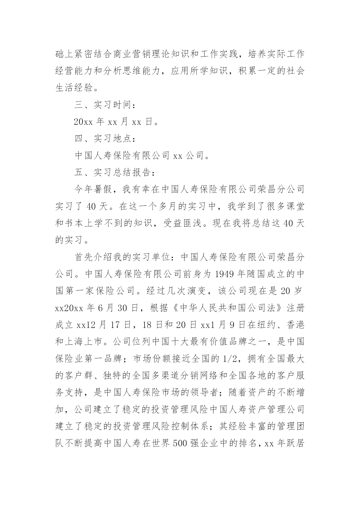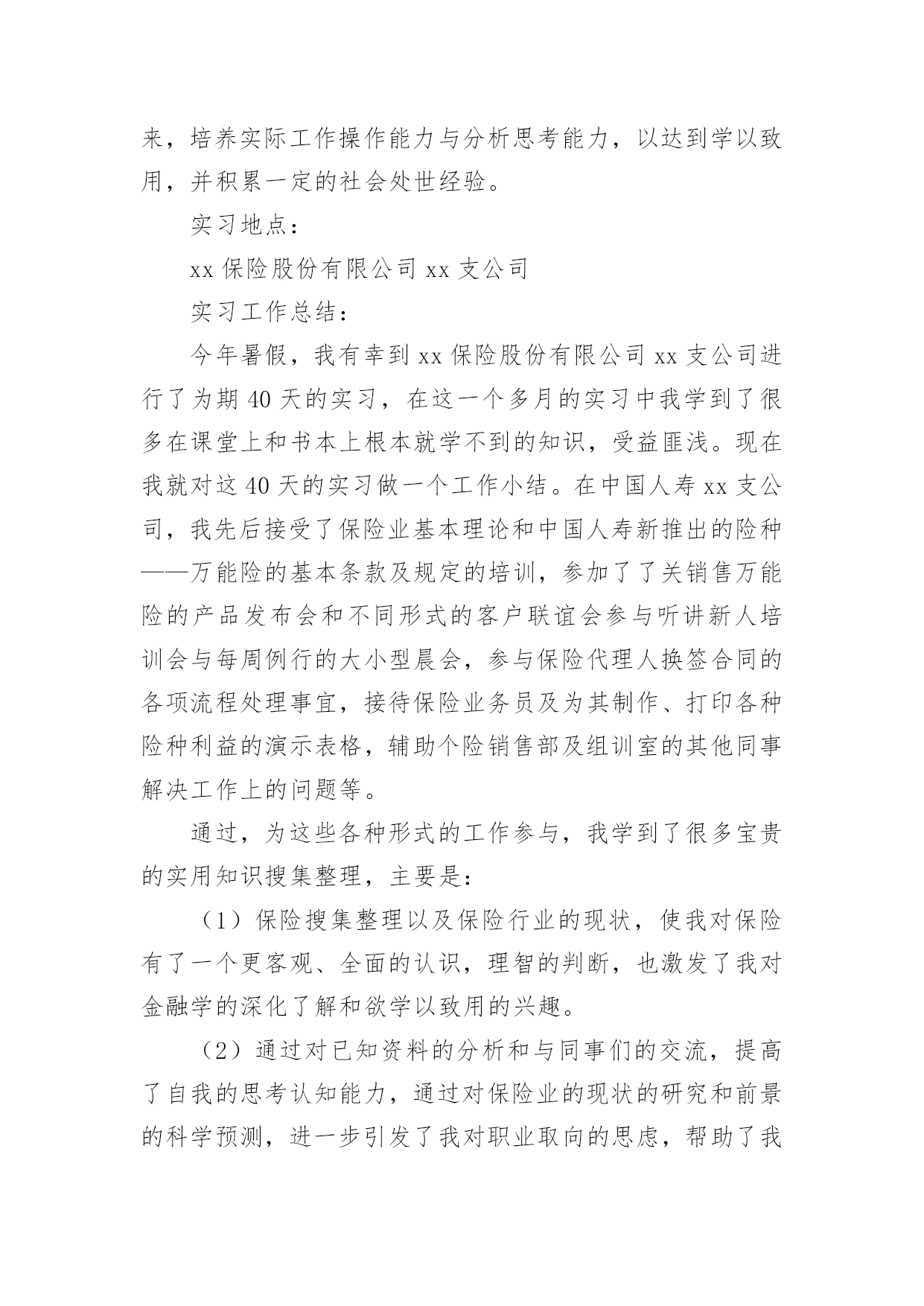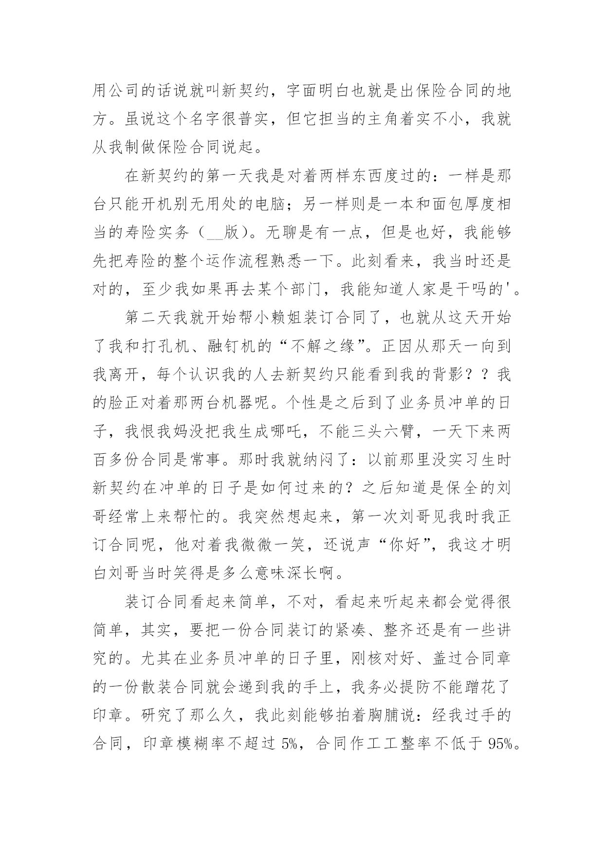 保险实习报告保险实习报告13篇随着个人素质的提升,需要使用报告的情况越来越多,报告具有双向沟通性的特点。相信许多人会觉得报告很难写吧,下面是小编为大家收集的保险实习报告,仅供参考,希望能够帮助到大家。保险实习报告篇1最近工作压力好大啊,一次次的被打击,一次次的被拒绝。我都快坚持不住了,幸好有主管。朋友的安慰和帮助才让我走到今天。让我在这个行业存活下来。来到这里很不容易。尤其是做了我这行就更容易了。在这个陌生的城市里没有一个认识人一切都要靠自己的努力,我从没认真的这么做过一件事,走过了坎坷,经过了风雨到目前为止,我还没有想过放弃。既然选择了就不要轻易放弃,也不能放弃。我要坚强地走下去,用我的真诚。用我的执着来感动我的每一位客户。我坚信我的行业是爱心和责任的体现。也许现在有很多人感觉不到这个行业的.伟大。虽然现在有很多人在排斥,和反感但在经历过风险和不幸后,如果没有保险。保障我们还能将爱和责任继续下去吗?我真心的希望每个人都能在风险过后,不要在让自己为了生活没有了活下去的勇气,趁现在我们要做好准备,将爱和责任传递下去,时刻拥有一份保障。是我们每一个人的责任。保险对富人来说是锦上添花,则对穷人来说是雪中送炭。保险实习报告篇2我们怎样才能适应当今飞速发展的社会,怎样才能确定自己的人生坐标,实现自己的人生价值呢?社会上都说当今的大学生是“眼高手低”,以前在学校时听到这样的评论还不服气,甚至很生气,真的到了工作中,才真正体会到这句话说得其实没错。初到公司,对于保险行业知之甚少,对于工作资料一无所知,对于组训工作更是不知所谓,自己就是一张白纸摆在那里等待描画。我充满期盼的实习就这样开始了。我于20xx年4月6日走进了中国大地保险股份有限公司珠海分公司进行我的实践活动。在那里,我理解了更为有用的保险知识,而每一天展业和演练活动,又增强了我的实战潜质,使我迈出了成功的一步。该公司是__年12月中国再保险公司按照国务院批示进行整体改制,成立的国有专业财产再保险公司。公司的前身中国再保险公司长期以来一向履行国家再保险职能,与国内各家保险公司均有全面的再保险合作,并与国际再保险市场建立了广泛的业务关联。工作学习篇我的实习工作首先是从“保单行政部”开始的,一听名字很能震住人的,就像我的专业“国际法”一样。实际上,用公司的话说就叫新契约,字面明白也就是出保险合同的地方。虽说这个名字很普实,但它担当的主角着实不小,我就从我制做保险合同说起。在新契约的第一天我是对着两样东西度过的:一样是那台只能开机别无用处的电脑;另一样则是一本和面包厚度相当的寿险实务(__版)。无聊是有一点,但是也好,我能够先把寿险的整个运作流程熟悉一下。此刻看来,我当时还是对的,至少我如果再去某个部门,我能知道人家是干吗的'。第二天我就开始帮小赖姐装订合同了,也就从这天开始了我和打孔机、融钉机的“不解之缘”。正因从那天一向到我离开,每个认识我的人去新契约只能看到我的背影??我的脸正对着那两台机器呢。个性是之后到了业务员冲单的日子,我恨我妈没把我生成哪吒,不能三头六臂,一天下来两百多份合同是常事。那时我就纳闷了:以前那里没实习生时新契约在冲单的日子是如何过来的?之后知道是保全的刘哥经常上来帮忙的。我突然想起来,第一次刘哥见我时我正订合同呢,他对着我微微一笑,还说声“你好”,我这才明白刘哥当时笑得是多么意味深长啊。装订合同看起来简单,不对,看起来听起来都会觉得很简单,其实,要把一份合同装订的紧凑、整齐还是有一些讲究的。尤其在业务员冲单的日子里,刚核对好、盖过合同章的一份散装合同就会递到我的手上,我务必提防不能蹭花了印章。研究了那么久,我此刻能够拍着胸脯说:经我过手的合同,印章模糊率不超过5%,合同作工工整率不低于95%。毕竟合同的工整与否也会关联到客户对公司印象的好坏。之后,小赖姐又教我装订团险合同,我也都基本掌握了,这些在业务员冲单的日子里可发挥了一些作用,至少我能够替小赖姐分担一点点的工作量。冲单的日子过去后,我开始学着帮小静姐打发票,这个是比较简单的,除了一开始打的格式有点问题重新来过之外,其后的工作就轻车熟路了。我学到了很多宝贵的实用知识搜集整理,主要是:(1)保险搜集整理以及保险行业的现状,使我对保险有了一个更客观、全面的认识,理智的决定。(2)透过对已知资料的分析和与同事们的交流,提高了自我的思考认知潜质,透过对保险业的现状的研究和前景的科学预测,进一步引发了我对职业取向的思虑,帮忙了我在大学期间进行的职业规划和职业生涯设计。(3)对职场有了初步、真实、贴切的认识,明确了发奋和改善,透过与同事们和众多的业务员的交往、接触,学到了珍重的人际交往技巧和处世经验,交到了几位能够虚心请教的长辈朋友,感谢他们对我的指导、教育和思想启迪。(4)电脑办公的实用知识与软件应用技巧,以及处理问