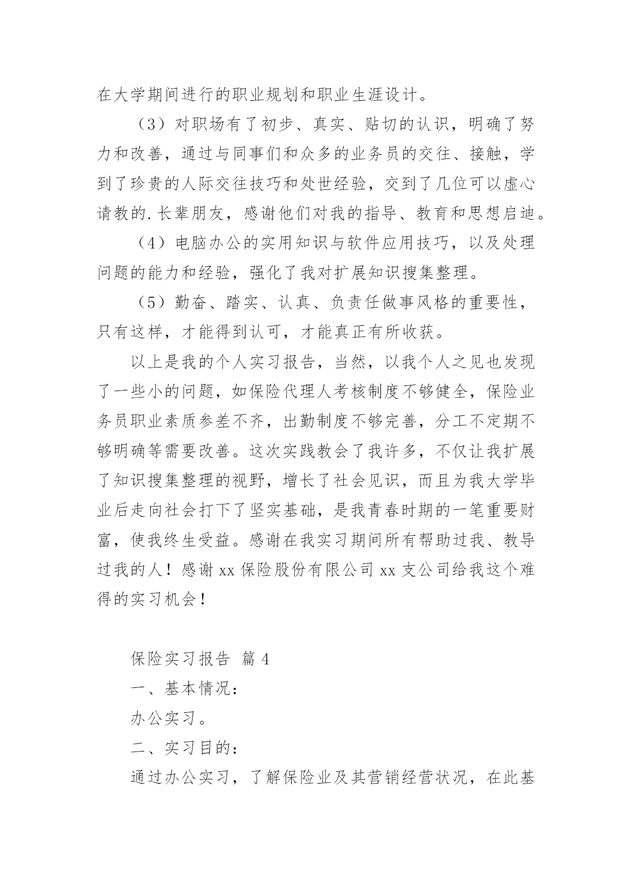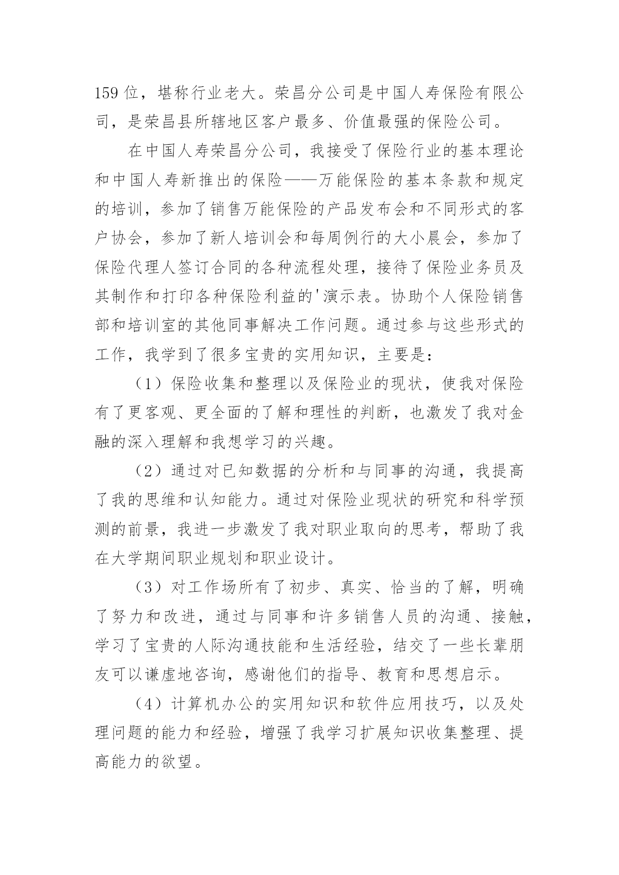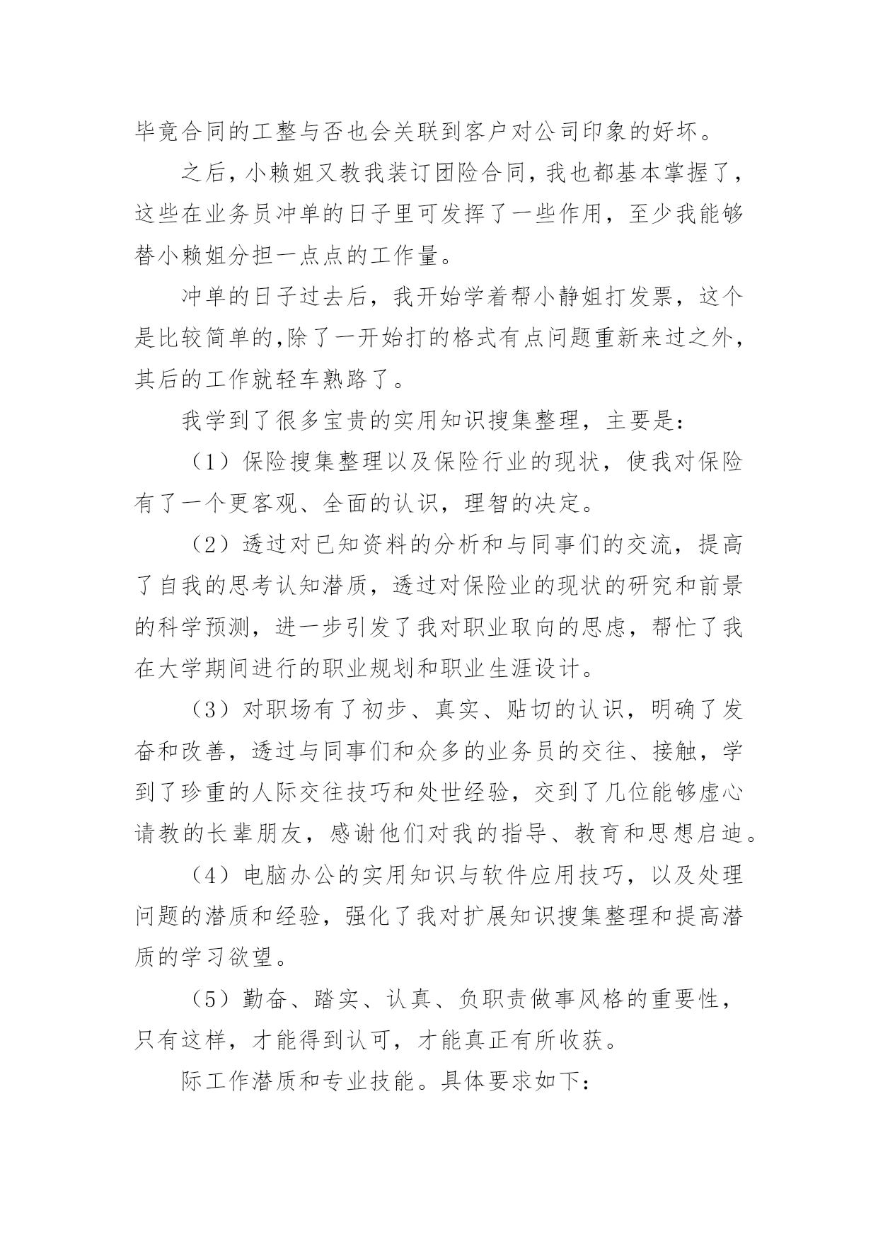 保险实习报告保险实习报告13篇随着个人素质的提升,需要使用报告的情况越来越多,报告具有双向沟通性的特点。相信许多人会觉得报告很难写吧,下面是小编为大家收集的保险实习报告,仅供参考,希望能够帮助到大家。保险实习报告篇1最近工作压力好大啊,一次次的被打击,一次次的被拒绝。我都快坚持不住了,幸好有主管。朋友的安慰和帮助才让我走到今天。让我在这个行业存活下来。来到这里很不容易。尤其是做了我这行就更容易了。在这个陌生的城市里没有一个认识人一切都要靠自己的努力,我从没认真的这么做过一件事,走过了坎坷,经过了风雨到目前为止,我还没有想过放弃。既然选择了就不要轻易放弃,也不能放弃。我要坚强地走下去,用我的真诚。用我的执着来感动我的每一位客户。我坚信我的行业是爱心和责任的体现。也许现在有很多人感觉不到这个行业的.伟大。虽然现在有很多人在排斥,和反感但在经历过风险和不幸后,如果没有保险。保障我们还能将爱和责任继续下去吗?我真心的希望每个人都能在风险过后,不要在让自己为了生活没有了活下去的勇气,趁现在我们要做好准备,将爱和责任传递下去,时刻拥有一份保障。是我们每一个人的责任。保险对富人来说是锦上添花,则对穷人来说是雪中送炭。保险实习报告篇2我们怎样才能适应当今飞速发展的社会,怎样才能确定自己的人生坐标,实现自己的人生价值呢?社会上都说当今的大学生是“眼高手低”,以前在学校时听到这样的评论还不服气,甚至很生气,真的到了工作中,才真正体会到这句话说得其实没错。初到公司,对于保险行业知之甚少,对于工作资料一无所知,对于组训工作更是不知所谓,自己就是一张白纸摆在那里等待描画。我充满期盼的实习就这样开始了。我于20xx年4月6日走进了中国大地保险股份有限公司珠海分公司进行我的实践活动。在那里,我理解了更为有用的保险知识,而每一天展业和演练活动,又增强了我的实战潜质,使我迈出了成功的一步。该公司是__年12月中国再保险公司按照国务院批示进行整体改制,成立的国有专业财产再保险公司。公司的前身中国再保险公司长期以来一向履行国家再保险职能,与国内各家保险公司均有全面的再保险合作,并与国际再保险市场建立了广泛的业务关联。工作学习篇我的实习工作首先是从“保单行政部”开始的,一听名字很能震住人的,就像我的专业“国际法”一样。实际上,用公司的话说就叫新契约,字面明白也就是出保险合同的地方。虽说这个名字很普实,但它担当的主角着实不小,我就从我制做保险合同说起。在新契约的第一天我是对着两样东西度过的:一样是那台只能开机别无用处的电脑;另一样则是一本和面包厚度相当的寿险实务(__版)。无聊是有一点,但是也好,我能够先把寿险的整个运作流程熟悉一下。此刻看来,我当时还是对的,至少我如果再去某个部门,我能知道人家是干吗的'。第二天我就开始帮小赖姐装订合同了,也就从这天开始了我和打孔机、融钉机的“不解之缘”。正因从那天一向到我离开,每个认识我的人去新契约只能看到我的背影??我的脸正对着那两台机器呢。个性是之后到了业务员冲单的日子,我恨我妈没把我生成哪吒,不能三头六臂,一天下来两百多份合同是常事。那时我就纳闷了:以前那里没实习生时新契约在冲单的日子是如何过来的?之后知道是保全的刘哥经常上来帮忙的。我突然想起来,第一次刘哥见我时我正订合同呢,他对着我微微一笑,还说声“你好”,我这才明白刘哥当时笑得是多么意味深长啊。装订合同看起来简单,不对,看起来听起来都会觉得很简单,其实,要把一份合同装订的紧凑、整齐还是有一些讲究的。尤其在业务员冲单的日子里,刚核对好、盖过合同章的一份散装合同就会递到我的手上,我务必提防不能蹭花了印章。研究了那么久,我此刻能够拍着胸脯说:经我过手的合同,印章模糊率不超过5%,合同作工工整率不低于95%。毕竟合同的工整与否也会关联到客户对公司印象的好坏。之后,小赖姐又教我装订团险合同,我也都基本掌握了,这些在业务员冲单的日子里可发挥了一些作用,至少我能够替小赖姐分担一点点的工作量。冲单的日子过去后,我开始学着帮小静姐打发票,这个是比较简单的,除了一开始打的格式有点问题重新来过之外,其后的工作就轻车熟路了。我学到了很多宝贵的实用知识搜集整理,主要是:(1)保险搜集整理以及保险行业的现状,使我对保险有了一个更客观、全面的认识,理智的决定。(2)透过对已知资料的分析和与同事们的交流,提高了自我的思考认知潜质,透过对保险业的现状的研究和前景的科学预测,进一步引发了我对职业取向的思虑,帮忙了我在大学期间进行的职业规划和职业生涯设计。(3)对职场有了初步、真实、贴切的认识,明确了发奋和改善,透过与同事们和众多的业务员的交往、接触,学到了珍重的人际交往技巧和处世经验,交到了几位能够虚心请教的长辈朋友,感谢他们对我的指导、教育和思想启迪。(4)电脑办公的实用知识与软件应用技巧,以及处理问