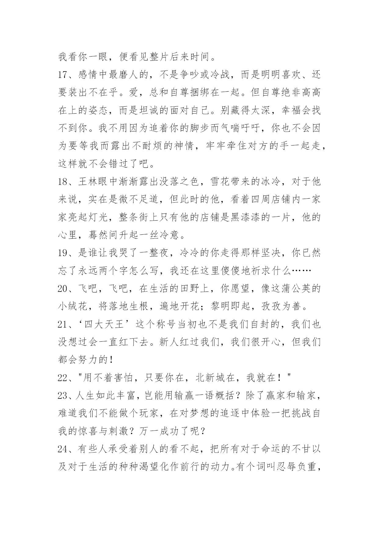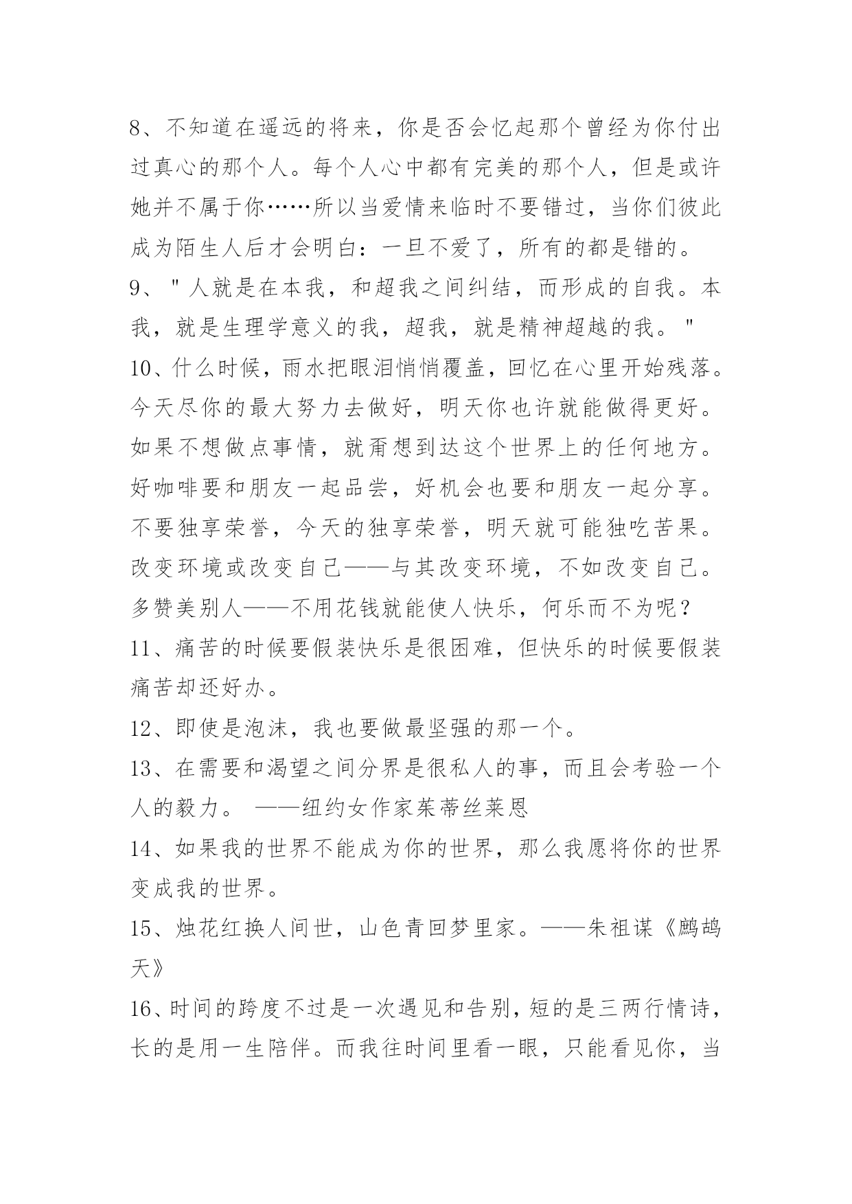 励志的语录69条【精华】经典励志的语录汇总69条不要和我说对不起,我很抱歉,对于你心灵的平静,而不是我的救济。以下是小编给各位读者分享的经典励志的语录69条,希望大家喜欢。1、踮起脚尖,用真实的热情柔软,疼痛。舍取骨子里的安静,静看花落,且待秋来。爱情,一边走,一边回忆。2、人生只有经历才会懂得,只有懂得才知道珍惜。一生中,总会有一个人让你笑得最甜,也总会有一个人让你痛得最深,忘记,是善待自己。人人都有痛苦,伤疤,经常去揭,会添新疮。学会忘却,才有阳光,才有欢乐。年华,不是埋葬在光阴里,而是淹没在无尽的牵挂里。3、你单纯太过,多余了那些温柔。4、高考、中考实际上是对你学习、心理素质、抗压能力、协调能力等综合能力的考察,不光考察学习,我想这也是高考中考存在的合理性之一吧。5、不要到处诉说世界有负于你,世界不欠你什么,因为它先、你而存在。6、该笑的时辰没有快乐,该抽泣的时辰没有眼泪,该信托的时辰没有信誉。7、忙碌时有条不紊,清闲时悠闲自然,得到坦然,失去怡然。他人恭维淡然,他人贬低泰然。8、不知道在遥远的将来,你是否会忆起那个曾经为你付出过真心的那个人。每个人心中都有完美的那个人,但是或许她并不属于你……所以当爱情来临时不要错过,当你们彼此成为陌生人后才会明白:一旦不爱了,所有的都是错的。9、"人就是在本我,和超我之间纠结,而形成的自我。本我,就是生理学意义的我,超我,就是精神超越的我。"10、什么时候,雨水把眼泪悄悄覆盖,回忆在心里开始残落。今天尽你的最大努力去做好,明天你也许就能做得更好。如果不想做点事情,就甭想到达这个世界上的任何地方。好咖啡要和朋友一起品尝,好机会也要和朋友一起分享。不要独享荣誉,今天的独享荣誉,明天就可能独吃苦果。改变环境或改变自己——与其改变环境,不如改变自己。多赞美别人——不用花钱就能使人快乐,何乐而不为呢?11、痛苦的时候要假装快乐是很困难,但快乐的时候要假装痛苦却还好办。12、即使是泡沫,我也要做最坚强的那一个。13、在需要和渴望之间分界是很私人的事,而且会考验一个人的毅力。——纽约女作家茱蒂丝莱恩14、如果我的世界不能成为你的世界,那么我愿将你的世界变成我的世界。15、烛花红换人间世,山色青回梦里家。——朱祖谋《鹧鸪天》16、时间的跨度不过是一次遇见和告别,短的是三两行情诗,长的是用一生陪伴。而我往时间里看一眼,只能看见你,当我看你一眼,便看见整片后来时间。17、感情中最磨人的,不是争吵或冷战,而是明明喜欢、还要装出不在乎。爱,总和自尊捆绑在一起。但自尊绝非高高在上的姿态,而是坦诚的面对自己。别藏得太深,幸福会找不到你。我不用因为追着你的脚步而气喘吁吁,你也不会因为要等我而露出不耐烦的神情,牢牢牵住对方的手一起走,这样就不会错过了吧。18、王林眼中渐渐露出没落之色,雪花带来的冰冷,对于他来说,实在是微不足道,但此时的他,看着四周店铺内一家家亮起灯光,整条街上只有他的店铺是黑漆漆的一片,他的心里,蓦然间升起一丝冷意。19、是谁让我哭了一整夜,冷冷的你走得那样坚决,你已然忘了永远两个字怎么写,我还在这里傻傻地祈求什么……20、飞吧,飞吧,在生活的田野上,你愿望,像这蒲公英的小绒花,将落地生根,遍地开花;黎明即起,孜孜为善。21、‘四大天王’这个称号当初也不是我们自封的,我们也没想过会一直红下去。新人红过我们,我们很开心,但我们都会努力的!22、"用不着害怕,只要你在,北新城在,我就在!"23、人生如此丰富,岂能用输赢一语概括?除了赢家和输家,难道我们不能做个玩家,在对梦想的追逐中体验一把挑战自我的惊喜与刺激?万一成功了呢?24、有些人承受着别人的看不起,把所有对于命运的不甘以及对于生活的种种渴望化作前行的动力。有个词叫忍辱负重,它意味着,你要拿出勇气去承受生活中的委屈和别人指指点点的语气。25、幸福的家庭都是相似的,不幸的家庭各有不同。26、哪怕这个世界上只剩下你一个男的,我也不会跟你在一起的。《青年医生》27、语言是兜兜转转的迷宫,爱是直指心底的禅。——《纳兰容若词传》28、如果你知道去哪,全世界都会为你让路。29、除非你买房子是为了升值,要么就是你结婚了。房子是都市生活的寓言,这个寓言不应该过早的和我们相关。30、当一个男人炫耀他才华的时候,他已经变得愚蠢;当一个女人炫耀她漂亮的时候,她已经变得丑陋。31、通宵复习是因为平时就没有听过课,拼命减肥是因为吃零食从来不会控制,分手了才开始后悔是因为之前没有给足够的关心。于是别人开始钦佩你的勤劳同情你的遭遇,可是只有你知道,你所有的痛苦都是罪有应得。32、不是因为有了希望才坚持,而是因为坚持才有了希望。33、听说看起来真的是特别的棒,哈哈。又可以开始没心没肺的笑了。34、此刻本就美好,体重只是虚晃之物。35、你哭过的泪,终有一天会变成阳光照亮脚下的