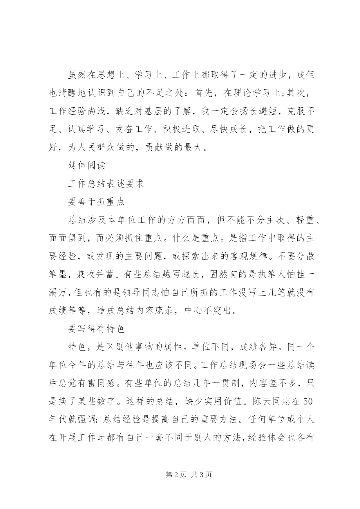 第PAGE\*Arabic\*MERGEFORMAT3页共NUMPAGES\*MERGEFORMAT3页XX年公务员思想工作总结xx年,我有幸成为一名光荣的公务员,自参加工作以来,在局领导的关心和同事们的帮助下,综合素质有了很大提高。一、加强政治理论学习,不断提高政治思想觉悟坚持以马克思、列宁主义,毛泽东思想,邓小平理论和三个代表重要思想为指导,自觉加强理论学习。认真贯彻党的基本理论、基本纲领和基本路线,身体力行三个代表重要思想。热爱祖国、热爱党、热爱社会主义,坚定共产主义信念,与党组织保持高度一致。在不断的学习中,逐步提高政治理论水平。二、强化业务学习,不断提高自身综合素质。作为一名刚录用的公务员,我清醒的认识到公务员工作和之前的企业工作有很大的不同,只有尽快学习业务知识才能更好的开展工作。因此,我认真学习业务知识,自觉学习了质量管理方面的法律法规政策,了解旅行社和酒店的各项行业标准,不断积累业务知识,努力熟悉工作,积极参加业务培训。业余时间也不断加强学习,不断提高业务能力,适应工作的新形势和要求。三、努力工作,认真完成工作任务。热爱自己的本职工作,能够正确认真的对待每一项工作,工作投入,热心为大家服务,认真遵守劳动纪律,保证按时出勤,有效利用工作时间,认真完成领导交办的各项工作,保质保量完成工作任务。虽然在思想上、学习上、工作上都取得了一定的进步,成但也清醒地认识到自己的不足之处:首先,在理论学习上;其次,工作经验尚浅,缺乏对基层的了解,我一定会扬长避短,克服不足、认真学习、发奋工作、积极进取、尽快成长,把工作做的更好,为人民群众做的,贡献做的最大。延伸阅读工作总结表述要求要善于抓重点总结涉及本单位工作的方方面面,但不能不分主次、轻重、面面俱到,而必须抓住重点。什么是重点。是指工作中取得的主要经验,或发现的主要问题,或探索出来的客观规律。不要分散笔墨,兼收并蓄。有些总结越写越长,固然有的是执笔人怕挂一漏万,但也有的是领导同志怕自己所抓的工作没写上几笔就没有成绩等等,造成总结内容庞杂,中心不突出。要写得有特色特色,是区别他事物的属性。单位不同,成绩各异。同一个单位今年的总结与往年也应该不同。工作总结现场会一些总结读后总觉有雷同感。有些单位的总结几年一贯制,内容差不多,只是换了某些数字。这样的总结,缺少实用价值。陈云同志在50年代就强调:总结经验是提高自己的重要方法。任何单位或个人在开展工作时都有自己一套不同于别人的方法,经验体会也各有不同。写总结时,在充分占有材料基础上,要认真分析、比较,找了重点,不要停留在一般化上。观点与材料统一总结中的经验体会是从实际工作中,也就是从大量事实材料中提炼出来的。经验体会一旦形成,又要选择必要的材料予以说明,经验体会才能立起来,具有实用价值。这就是观点与材料的统一。但常见一些经验总结往往不注意这一点,如同毛泽东同志批评的那样,把材料和观点割断,讲材料的时候没有观点,讲观点的时候没有材料,材料和观点互不联系,这就不好。语言要准确、简明总结的文字要做到判断明确,就必须用词准确,用例确凿,评断不含糊。简明则是要求在阐述观点时,做到概括与具体相结合,要言不烦,切忌笼统、累赘,做到文字朴实,简洁明了。坚持实事求是原则实事求是、一切从实际出发,这是总结写作的基本原则,但在总结写作实践中,违反这一原则的情况却屡见不鲜。有人认为三分工作七分吹,在总结中夸大成绩,隐瞒缺点,报喜不报忧。这种弄虚作假、浮夸邀功的坏作风,对单位、对国家、对事业、对个人都没有任何益处,必须坚决防止。