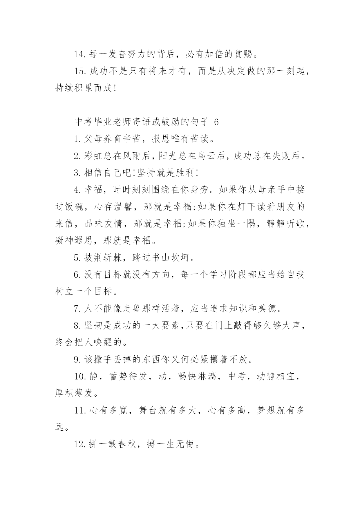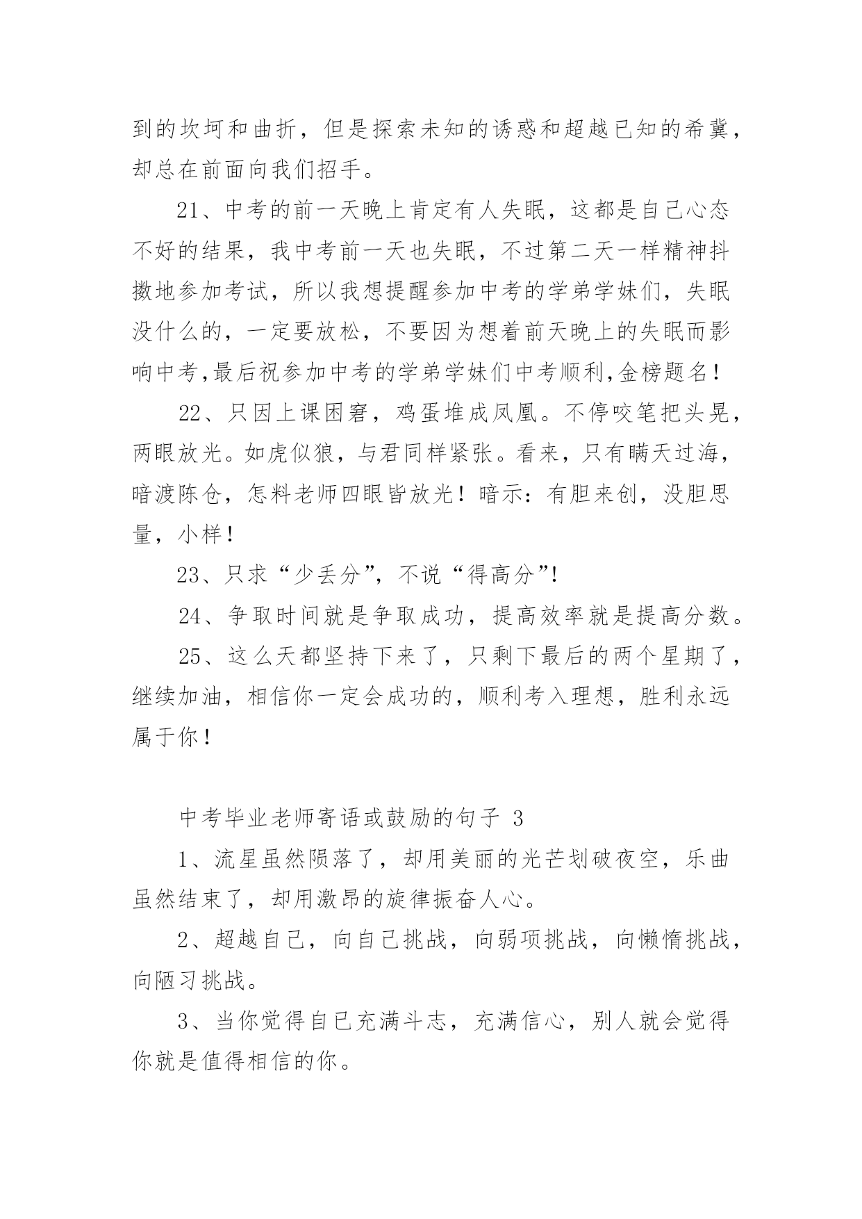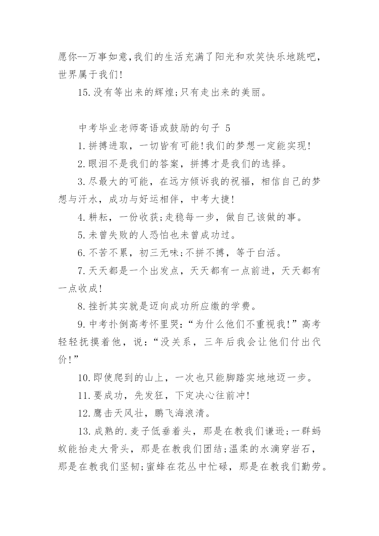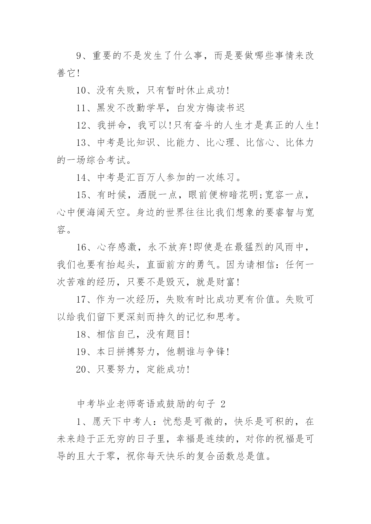中考毕业老师寄语或鼓励的句子中考毕业老师寄语或鼓励的句子大全在学习、工作或生活中,大家总少不了要接触或使用寄语吧,寄语的种类很多,可分为名人寄语、圣诞寄语、新年寄语、班主任寄语、爱情寄语等。那么问题来了,到底什么样的寄语才经典呢?下面是小编为大家收集的中考毕业老师寄语或鼓励的话,供大家参考借鉴,希望可以帮助到有需要的朋友。中考毕业老师寄语或鼓励的句子11、信心来自于实力,实力来自于勤奋。2、自信,是无尽智慧的凝聚。平淡,是成功路上的驿站。3、不问收获,但问耕耘!天道酬勤。4、悲观些看成功,乐观些看失败。轻松些看自己,宽容些看别人。理智些看问题,纯真些看人生。5、善待你的爱好,别让它们为学习让路,要让它们替学习服务。6、做好准备,考场上总有最艰难的时刻。沉着才见英雄本色。7、对待试题:冷静、乐观,对待考试:认真、自信。8、最难的题,对你而言,并不一定在于最后一道。最新祝福中考考生的话9、重要的不是发生了什么事,而是要做哪些事情来改善它!10、没有失败,只有暂时休止成功!11、黑发不改勤学早,白发方悔读书迟12、我拼命,我可以!只有奋斗的人生才是真正的人生!13、中考是比知识、比能力、比心理、比信心、比体力的一场综合考试。14、中考是汇百万人参加的一次练习。15、有时候,洒脱一点,眼前便柳暗花明;宽容一点,心中便海阔天空。身边的世界往往比我们想象的要睿智与宽容。16、心存感激,永不放弃!即使是在最猛烈的风雨中,我们也要有抬起头,直面前方的勇气。因为请相信:任何一次苦难的经历,只要不是毁灭,就是财富!17、作为一次经历,失败有时比成功更有价值。失败可以给我们留下更深刻而持久的记忆和思考。18、相信自己,没有题目!19、本日拼搏努力,他朝谁与争锋!20、只要努力,定能成功!中考毕业老师寄语或鼓励的句子21、愿天下中考人:忧愁是可微的,快乐是可积的,在未来趋于正无穷的日子里,幸福是连续的,对你的祝福是可导的且大于零,祝你每天快乐的复合函数总是值。2、有时候,洒脱一点,眼前便柳暗花明;宽容一点,心中便海阔天空。身边的世界往往比我们想象的要睿智与宽容。3、有高水平的集体,才有高水平的个人。4、永远不要以粗心为借口原谅自己。5、一分耕耘,一分收获,未必;九分耕耘,会有收获,一定!6、心存感激,永不放弃!即使是在最猛烈的风雨中,我们也要有抬起头,直面前方的勇气。因为请相信:任何一次苦难的经历,只要不是毁灭,就是财富!7、相信自己:通过三年的学习,已经掌握了不少的知识,获得了不少的技能,中考没有什么可怕的。我是最棒的,我能成功,我一定能成功!8、我知道,中考的日子里,虽然清苦,却很充实。只希望你在记住课本的同时不要忘了我,我会在你背后默默的为你祝福,默默的等待你的佳音!9、我一直相信,你是最棒的!展开你隐形的翅膀高飞吧!10、同学们,让我们用热烈的掌声为这真实的,美丽的,难忘的三年喝采吧!希望我自信,我成功的旋律在每个同学的心中奏响!11、同学们!让我们扬起理想的风帆,许下庄严的承诺——锁定目标,勇攀高峰!拼搏今朝,收获六月!12、胜利的信心在人脑中的作用就如闹钟,会在你需求时将你唤醒。13、圣人与常人之间往往只相差一小步,而这一小步却往往需要非凡的毅力才能赶上。14、善待你的爱好,别让它们为学习让路,要让它们替学习服务。15、如果你有幸进入一个好的学校,请珍惜!因为它是你奋斗的结果,这个结果中包含了你辛勤的汗水,不要轻易挥霍;如果你不幸进入一个不理想的学校,也请你不要沮丧,因为你!16、将在这里磨练你的意志,成长的你将会更坚强!17、书写,不仅仅是一个印象。好的书写,往往可让卷面分增加个三五分,甚至会更多。但不要为了工整而工整,不要为了书写而耽搁时间。规范书写,保持整洁,重要的是一种意识。18、时间,要保证。特别是作文,一定要在规定的时间内完成。大体来说,一般都是一分钟做一分题。基础,要尽量在70分钟内完成,应当在45分钟之内结束。留有三五分钟,用来查缺补漏。合理分配,有备无患。19、我们从来都不孤单。我们的好友也在考场,深深地爱着我们的亲人在默默祝福,与我们的朝夕相处的老师在殷切期望。我们的心,都在一起,都在朝着一个共同的目标迈进。20、人生就是为了实现更高更强的目标,学习典范也是为了追求超越和创新的理想。尽管在这个过程中会有意想不到的坎坷和曲折,但是探索未知的诱惑和超越已知的希冀,却总在前面向我们招手。21、中考的前一天晚上肯定有人失眠,这都是自己心态不好的结果,我中考前一天也失眠,不过第二天一样精神抖擞地参加考试,所以我想提醒参加中考的学弟学妹们,失眠没什么的,一定要放松,不要因为想着前天晚上的失眠而影响中考,最后祝参加中考的学弟学妹们中考顺利,金榜题名!22、只因上课困窘,鸡蛋堆成凤凰。不停咬笔把头晃,两眼放光。如虎似狼,与君同样紧