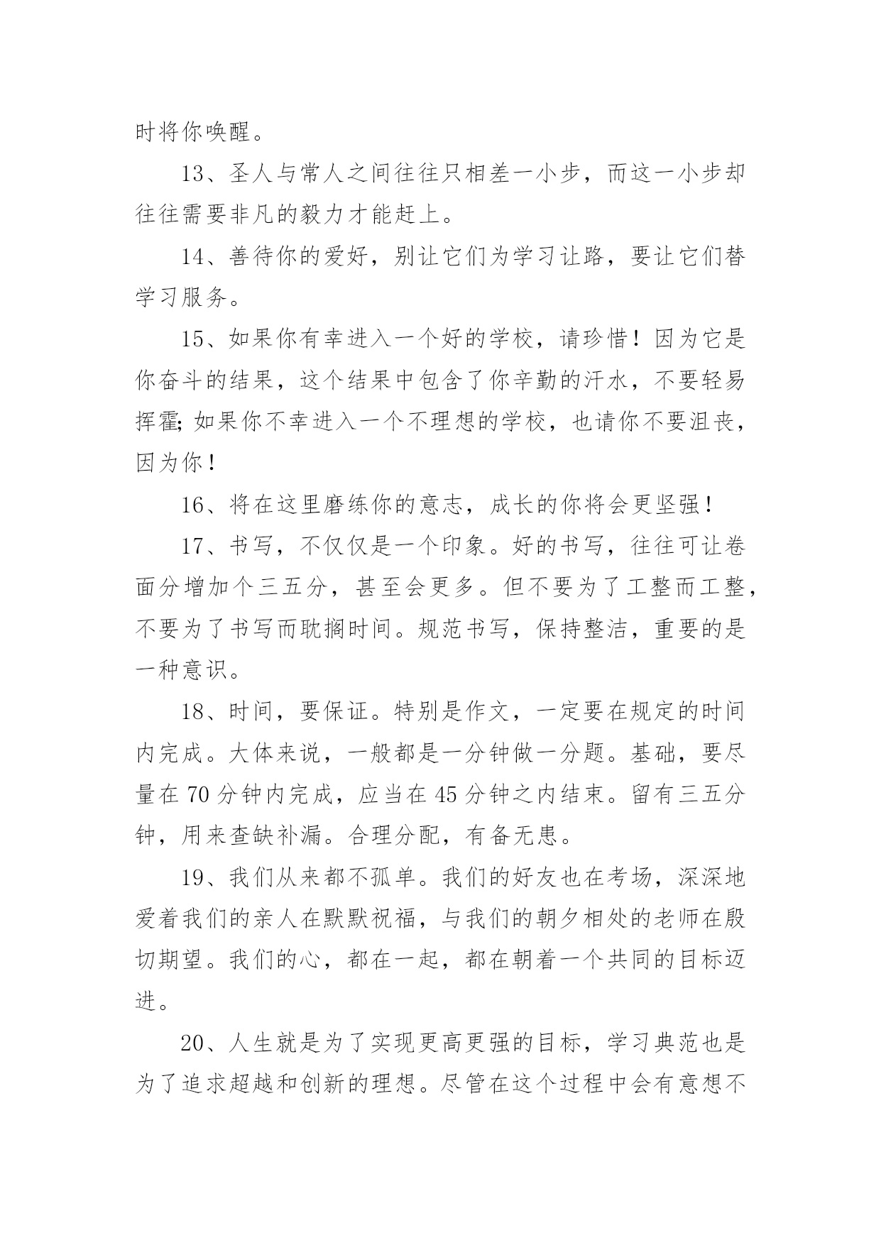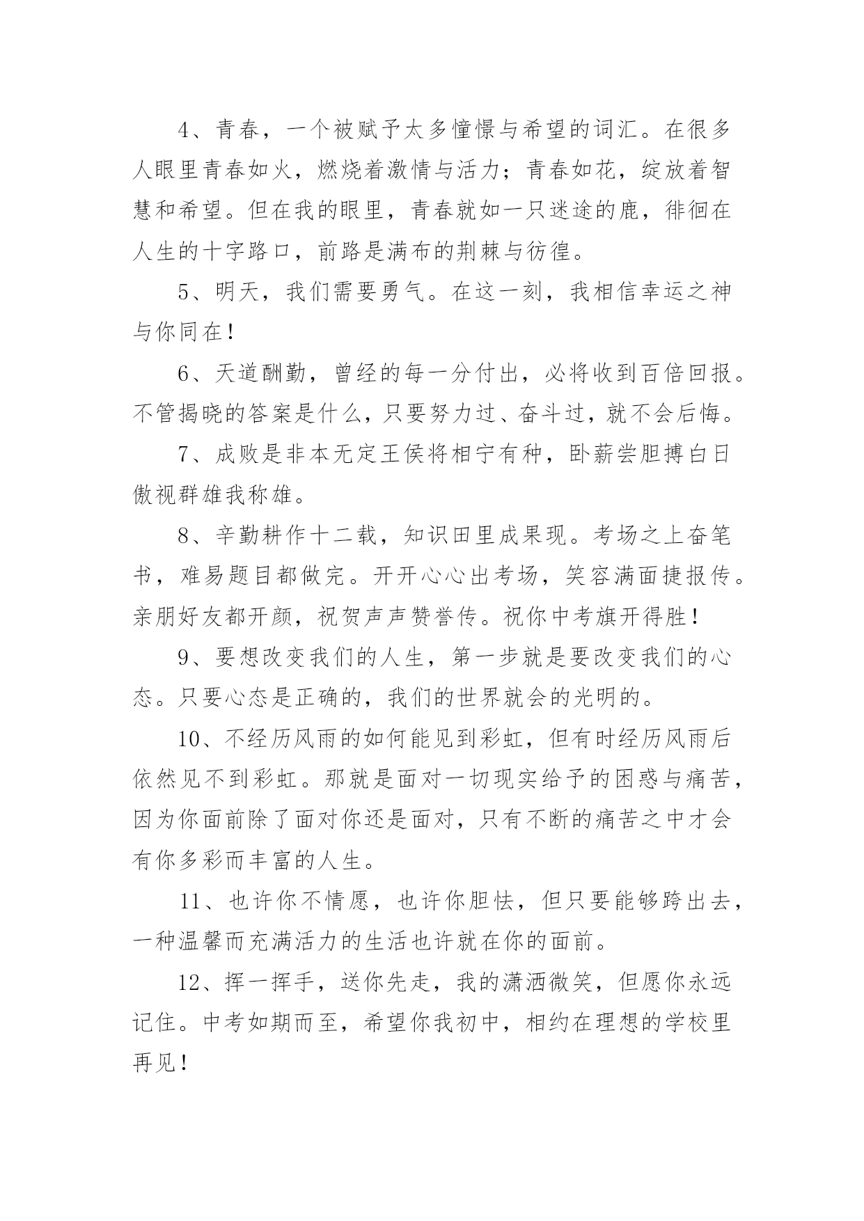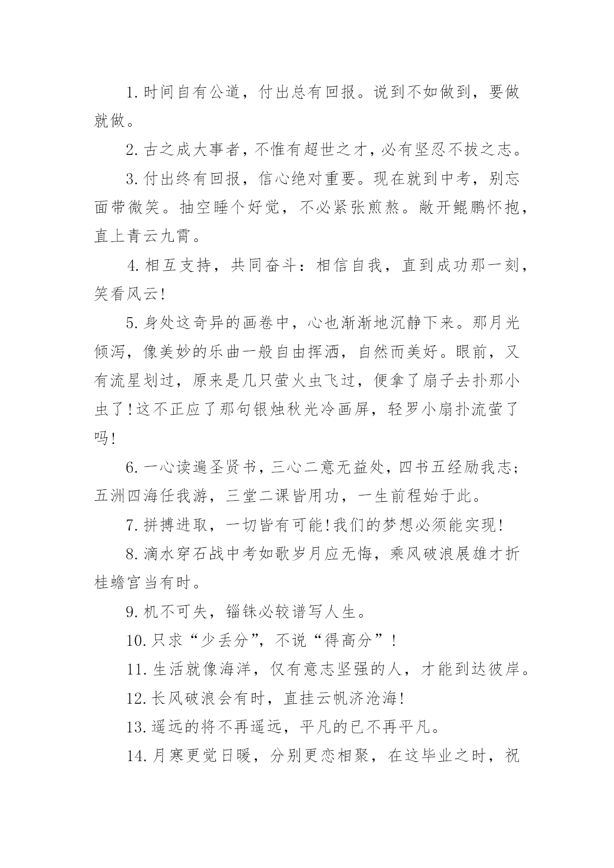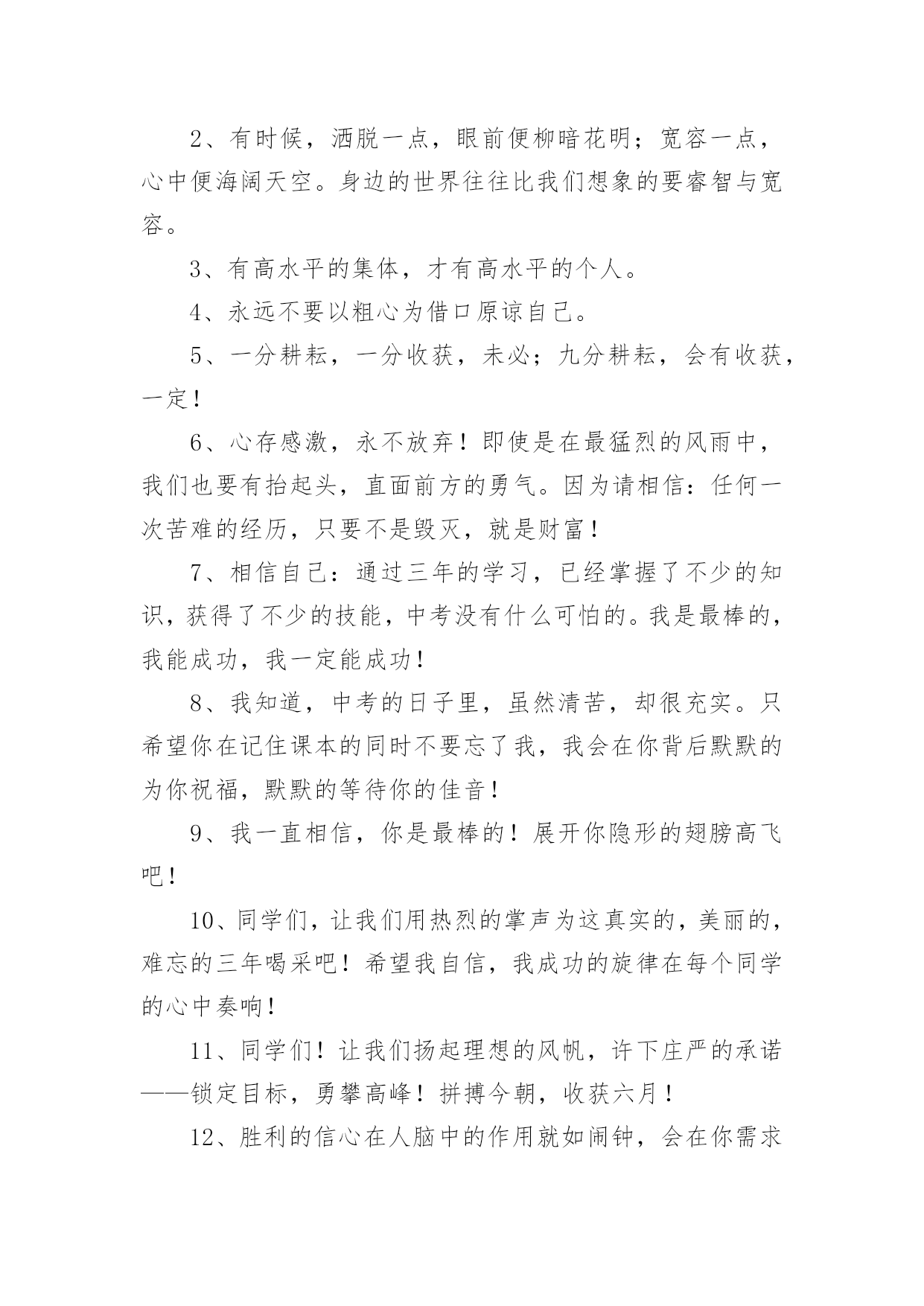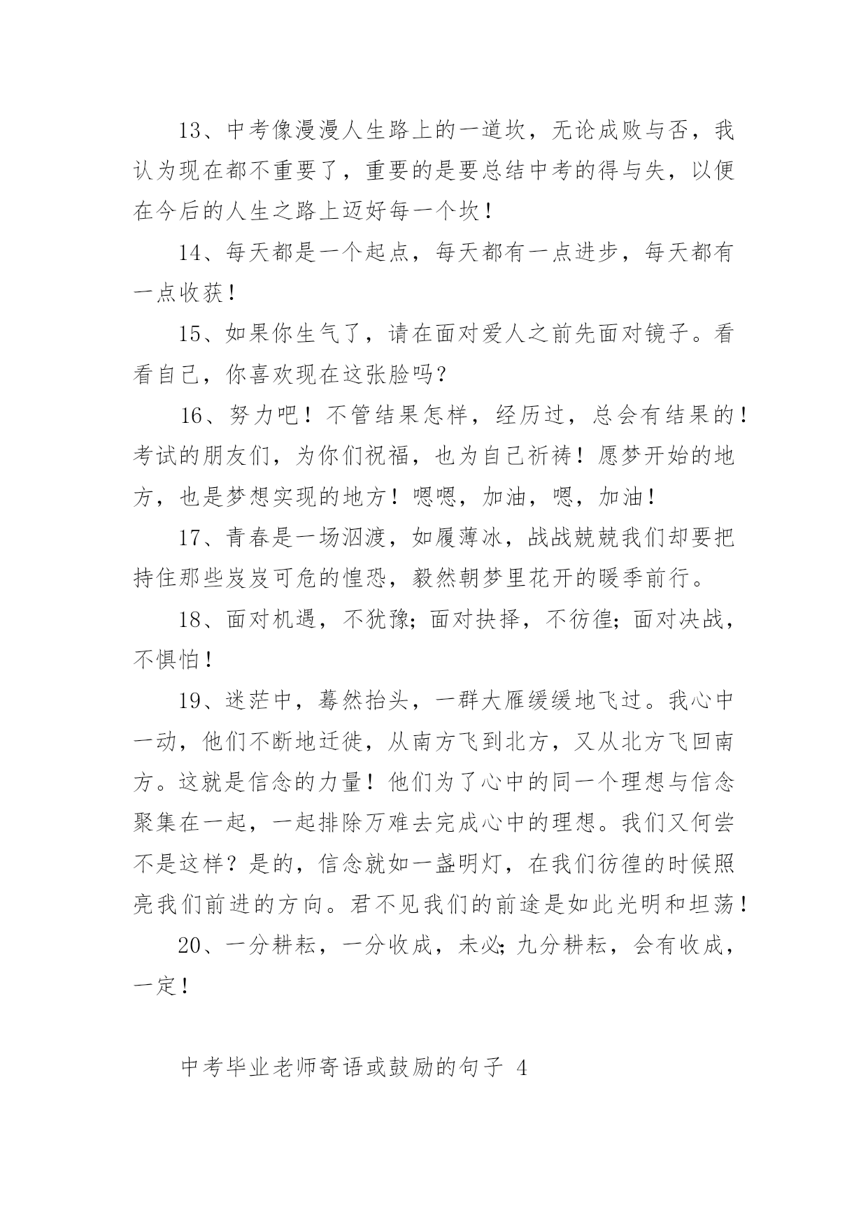 中考毕业老师寄语或鼓励的句子中考毕业老师寄语或鼓励的句子大全在学习、工作或生活中,大家总少不了要接触或使用寄语吧,寄语的种类很多,可分为名人寄语、圣诞寄语、新年寄语、班主任寄语、爱情寄语等。那么问题来了,到底什么样的寄语才经典呢?下面是小编为大家收集的中考毕业老师寄语或鼓励的话,供大家参考借鉴,希望可以帮助到有需要的朋友。中考毕业老师寄语或鼓励的句子11、信心来自于实力,实力来自于勤奋。2、自信,是无尽智慧的凝聚。平淡,是成功路上的驿站。3、不问收获,但问耕耘!天道酬勤。4、悲观些看成功,乐观些看失败。轻松些看自己,宽容些看别人。理智些看问题,纯真些看人生。5、善待你的爱好,别让它们为学习让路,要让它们替学习服务。6、做好准备,考场上总有最艰难的时刻。沉着才见英雄本色。7、对待试题:冷静、乐观,对待考试:认真、自信。8、最难的题,对你而言,并不一定在于最后一道。最新祝福中考考生的话9、重要的不是发生了什么事,而是要做哪些事情来改善它!10、没有失败,只有暂时休止成功!11、黑发不改勤学早,白发方悔读书迟12、我拼命,我可以!只有奋斗的人生才是真正的人生!13、中考是比知识、比能力、比心理、比信心、比体力的一场综合考试。14、中考是汇百万人参加的一次练习。15、有时候,洒脱一点,眼前便柳暗花明;宽容一点,心中便海阔天空。身边的世界往往比我们想象的要睿智与宽容。16、心存感激,永不放弃!即使是在最猛烈的风雨中,我们也要有抬起头,直面前方的勇气。因为请相信:任何一次苦难的经历,只要不是毁灭,就是财富!17、作为一次经历,失败有时比成功更有价值。失败可以给我们留下更深刻而持久的记忆和思考。18、相信自己,没有题目!19、本日拼搏努力,他朝谁与争锋!20、只要努力,定能成功!中考毕业老师寄语或鼓励的句子21、愿天下中考人:忧愁是可微的,快乐是可积的,在未来趋于正无穷的日子里,幸福是连续的,对你的祝福是可导的且大于零,祝你每天快乐的复合函数总是值。2、有时候,洒脱一点,眼前便柳暗花明;宽容一点,心中便海阔天空。身边的世界往往比我们想象的要睿智与宽容。3、有高水平的集体,才有高水平的个人。4、永远不要以粗心为借口原谅自己。5、一分耕耘,一分收获,未必;九分耕耘,会有收获,一定!6、心存感激,永不放弃!即使是在最猛烈的风雨中,我们也要有抬起头,直面前方的勇气。因为请相信:任何一次苦难的经历,只要不是毁灭,就是财富!7、相信自己:通过三年的学习,已经掌握了不少的知识,获得了不少的技能,中考没有什么可怕的。我是最棒的,我能成功,我一定能成功!8、我知道,中考的日子里,虽然清苦,却很充实。只希望你在记住课本的同时不要忘了我,我会在你背后默默的为你祝福,默默的等待你的佳音!9、我一直相信,你是最棒的!展开你隐形的翅膀高飞吧!10、同学们,让我们用热烈的掌声为这真实的,美丽的,难忘的三年喝采吧!希望我自信,我成功的旋律在每个同学的心中奏响!11、同学们!让我们扬起理想的风帆,许下庄严的承诺——锁定目标,勇攀高峰!拼搏今朝,收获六月!12、胜利的信心在人脑中的作用就如闹钟,会在你需求时将你唤醒。13、圣人与常人之间往往只相差一小步,而这一小步却往往需要非凡的毅力才能赶上。14、善待你的爱好,别让它们为学习让路,要让它们替学习服务。15、如果你有幸进入一个好的学校,请珍惜!因为它是你奋斗的结果,这个结果中包含了你辛勤的汗水,不要轻易挥霍;如果你不幸进入一个不理想的学校,也请你不要沮丧,因为你!16、将在这里磨练你的意志,成长的你将会更坚强!17、书写,不仅仅是一个印象。好的书写,往往可让卷面分增加个三五分,甚至会更多。但不要为了工整而工整,不要为了书写而耽搁时间。规范书写,保持整洁,重要的是一种意识。18、时间,要保证。特别是作文,一定要在规定的时间内完成。大体来说,一般都是一分钟做一分题。基础,要尽量在70分钟内完成,应当在45分钟之内结束。留有三五分钟,用来查缺补漏。合理分配,有备无患。19、我们从来都不孤单。我们的好友也在考场,深深地爱着我们的亲人在默默祝福,与我们的朝夕相处的老师在殷切期望。我们的心,都在一起,都在朝着一个共同的目标迈进。20、人生就是为了实现更高更强的目标,学习典范也是为了追求超越和创新的理想。尽管在这个过程中会有意想不到的坎坷和曲折,但是探索未知的诱惑和超越已知的希冀,却总在前面向我们招手。21、中考的前一天晚上肯定有人失眠,这都是自己心态不好的结果,我中考前一天也失眠,不过第二天一样精神抖擞地参加考试,所以我想提醒参加中考的学弟学妹们,失眠没什么的,一定要放松,不要因为想着前天晚上的失眠而影响中考,最后祝参加中考的学弟学妹们中考顺利,金榜题名!22、只因上课困窘,鸡蛋堆成凤凰。不停咬笔把头晃,两眼放光。如虎似狼,与君同样紧