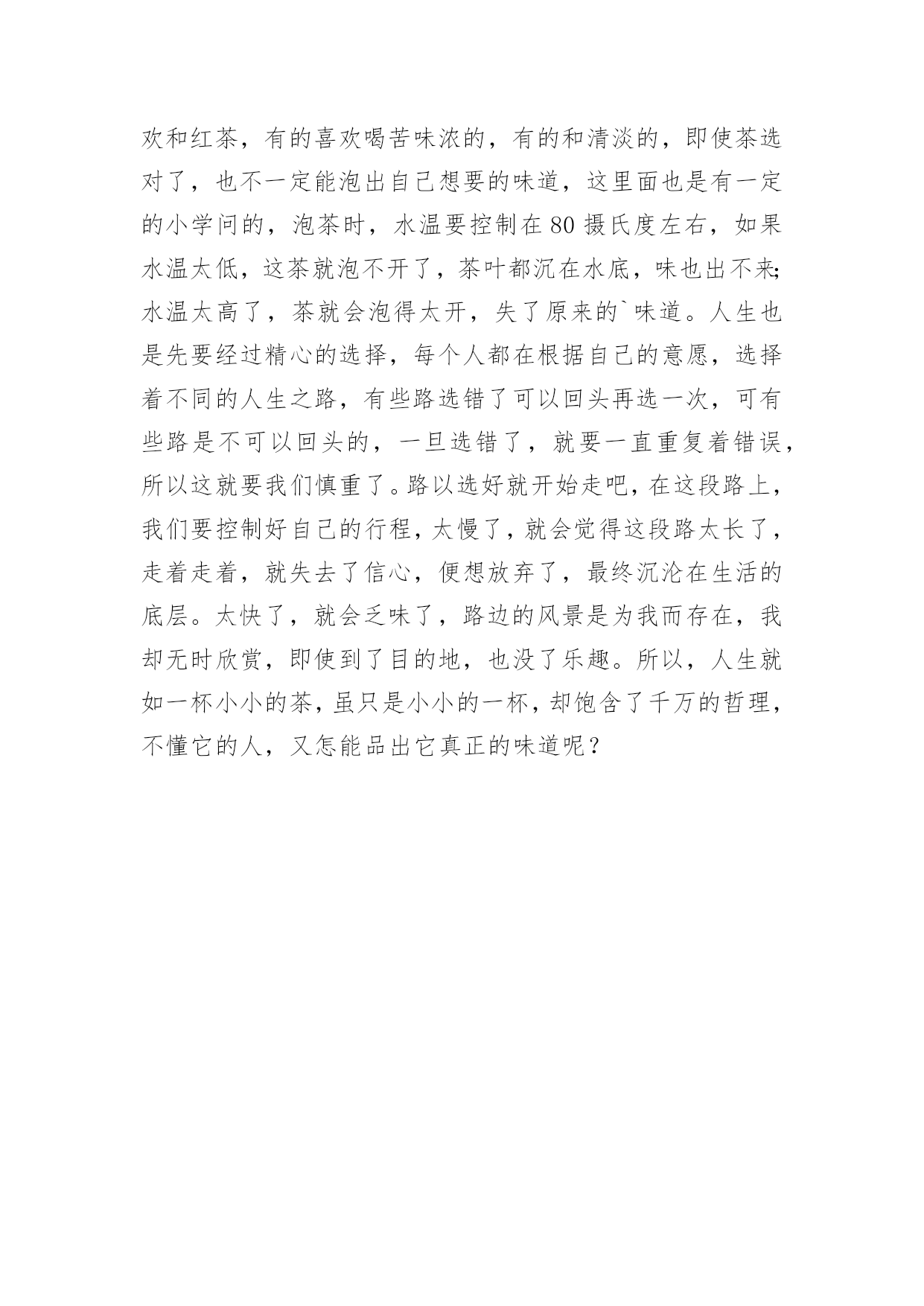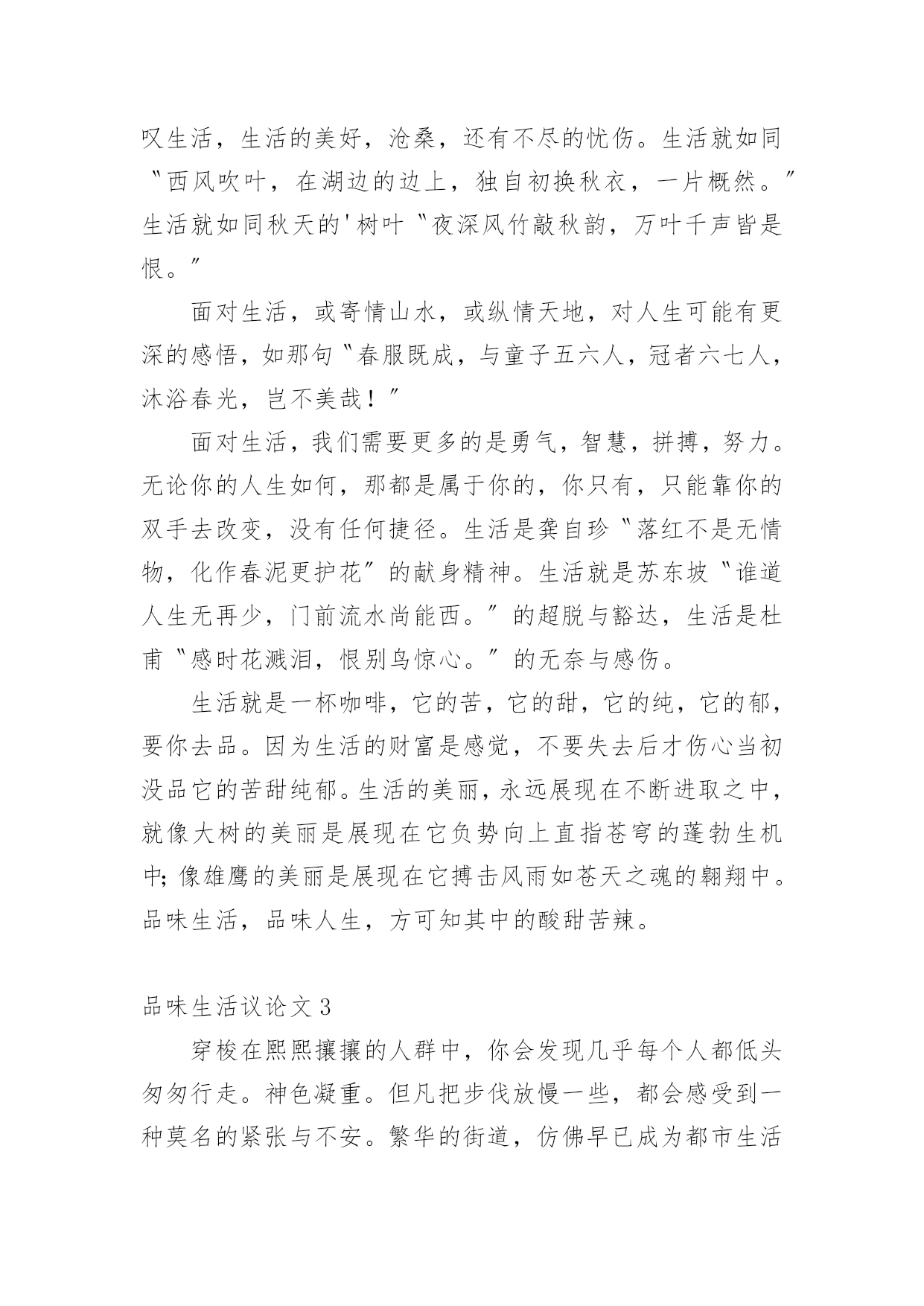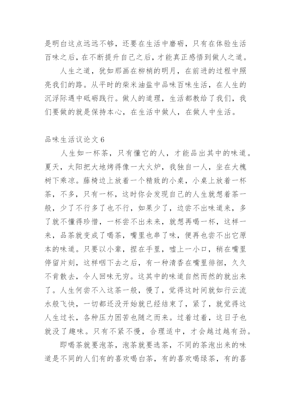 品味生活议论文在日复一日的学习、工作生活中,大家肯定对论文都不陌生吧,通过论文写作可以培养我们的科学研究能力。那么问题来了,到底应如何写一篇优秀的论文呢?以下是小编整理的品味生活议论文,仅供参考,希望能够帮助到大家。品味生活议论文1品味生活的人才能悟出其中的味道,生活就像一坛美酒,只有懂得品尝的人,才能体会它的香醇。许多时候,我们会抱怨生活的不公,为什么老是苦难重重?为什么总会有人活得不自在,不开心呢?呵,这些都是因为还是没有真正读懂生活,没有真正了解生活。去喝一杯甜的水,甘甜的滋味会让你回味无穷。你的开心快乐,幸福都像糖一样,一点点被融入水中,从没有味达到令人回味无穷,充满甘甜的气息,让人微笑,让人快乐……反之,再去喝一杯咸的水,咸咸的滋味像是眼泪的苦涩。是什么让它哭了?是什么让生活加入了苦涩的味道?是生活的艰辛还是为生活中遇到的种。种困难而苦恼?生活这条路,没有尽头,只有读懂生活的人才真正体会到它的.韵味。不管什么样的苦难,或者说,我们不知道前面等着我们的会是什么样的境遇,也许痛苦之间,让人感觉命运在捉弄我们,其实,命运是掌握在自己手中,有时候,我们不能改变事情的结果,但是我们可以刻意地完善过程,让生活的方向更明确,生活得更加有诗意。只有品味生活,我们才能更好地生活,更好地掌握生活的方向……品味生活议论文2因为冬天的寒冷,才有对春天的向往;因为沙漠的荒凉,才有对绿洲的热爱;人类在对比中学会了辨别,在辨别中学会审美,再审美中学会品味。美的生活就象金苹果,只能长在开拓的园林,当丑陋的乌鸦飞逃远盾,蜜蜂和蝴蝶才会追随我们。生活需要我们去改变,创造用自己的双手开拓出一片属于你的园林。生活中,悲观的人,先被自己打败,然后才被生活打败;乐观的人,先战胜自己,然后才战胜生活。面对生活,我们应该一撅而振,永不言弃。永远作自己的主人,由你主宰一切。生活赐予我们的就是沉重,我们所应该做的,也就是勇敢地挑起这一份份责任。假如生活是歌,挫折则为其乐章,拼搏则是其音符,只要有了这样好的乐谱,就能演奏出美妙的音乐。生活不是上帝用于捕捉你的陷阱,你不会因为一个错误就成为一个不合格的人,生活是一场球赛,最好的球队也有丢分的记录,而最差的球队也有辉煌的一天。我们的目标是尽可能让自己得到的多于失去的唯有创造才是快乐,唯有创造的生灵才是生灵。生活就犹如〝多少绿荷相倚眼,一时回首被西风〞我感叹生活,生活的美好,沧桑,还有不尽的忧伤。生活就如同〝西风吹叶,在湖边的边上,独自初换秋衣,一片概然。〞生活就如同秋天的'树叶〝夜深风竹敲秋韵,万叶千声皆是恨。〞面对生活,或寄情山水,或纵情天地,对人生可能有更深的感悟,如那句〝春服既成,与童子五六人,冠者六七人,沐浴春光,岂不美哉!〞面对生活,我们需要更多的是勇气,智慧,拼搏,努力。无论你的人生如何,那都是属于你的,你只有,只能靠你的双手去改变,没有任何捷径。生活是龚自珍〝落红不是无情物,化作春泥更护花〞的献身精神。生活就是苏东坡〝谁道人生无再少,门前流水尚能西。〞的超脱与豁达,生活是杜甫〝感时花溅泪,恨别鸟惊心。〞的无奈与感伤。生活就是一杯咖啡,它的苦,它的甜,它的纯,它的郁,要你去品。因为生活的财富是感觉,不要失去后才伤心当初没品它的苦甜纯郁。生活的美丽,永远展现在不断进取之中,就像大树的美丽是展现在它负势向上直指苍穹的蓬勃生机中;像雄鹰的美丽是展现在它搏击风雨如苍天之魂的翱翔中。品味生活,品味人生,方可知其中的酸甜苦辣。品味生活议论文3穿梭在熙熙攘攘的人群中,你会发现几乎每个人都低头匆匆行走。神色凝重。但凡把步伐放慢一些,都会感受到一种莫名的紧张与不安。繁华的街道,仿佛早已成为都市生活中〝快〞节奏的化身,在每个人的心目中,显得那般重要,不可替代。而我最敬佩的作家之一——麦家先生,却对这种〝快〞不以为然。在杭州。南京总能看到这位畅销书作家慢慢地骑着单车,悠然地穿行于街头巷尾。有些人认为这纯粹是浪费时间,而麦家先生却对这种慢悠悠的出行方式乐此不疲。在十余年的时间中,他几乎走遍了小城内所有的街道,饱览了各种人情世故。〝慢慢〞,在麦家先生的眼中,是一种欣赏与积淀。〝慢慢〞并不只浮于作家的感受,更体现在点滴举止中。我的'班主任老师,也用自己的行动,彰显〝慢慢〞的内涵。班主任老师最初接手我们班时,同学们的表现都不算突出,但她却丝毫未表现出着急,只是潜心引导,无微不至地关怀每一位同学。〝别着急,慢慢来〞,也成了她的一句口头禅。在老师的悉心引领下,同学们逐渐调整着自己的学习状态,渐渐跟上,各项竞赛开始屡获殊荣,学习走上正轨……此时的〝慢慢〞,在老师的眼中,是一种成长与守望。我从小喜欢软笔书法,并不是为了将来成为书法大家,只为寻找一丝〝慢慢〞的雅致。练字如同制瓷,一顿一提。一起一收,皆需有度。每当纸墨铺就,考验的不是技艺,而是耐心。