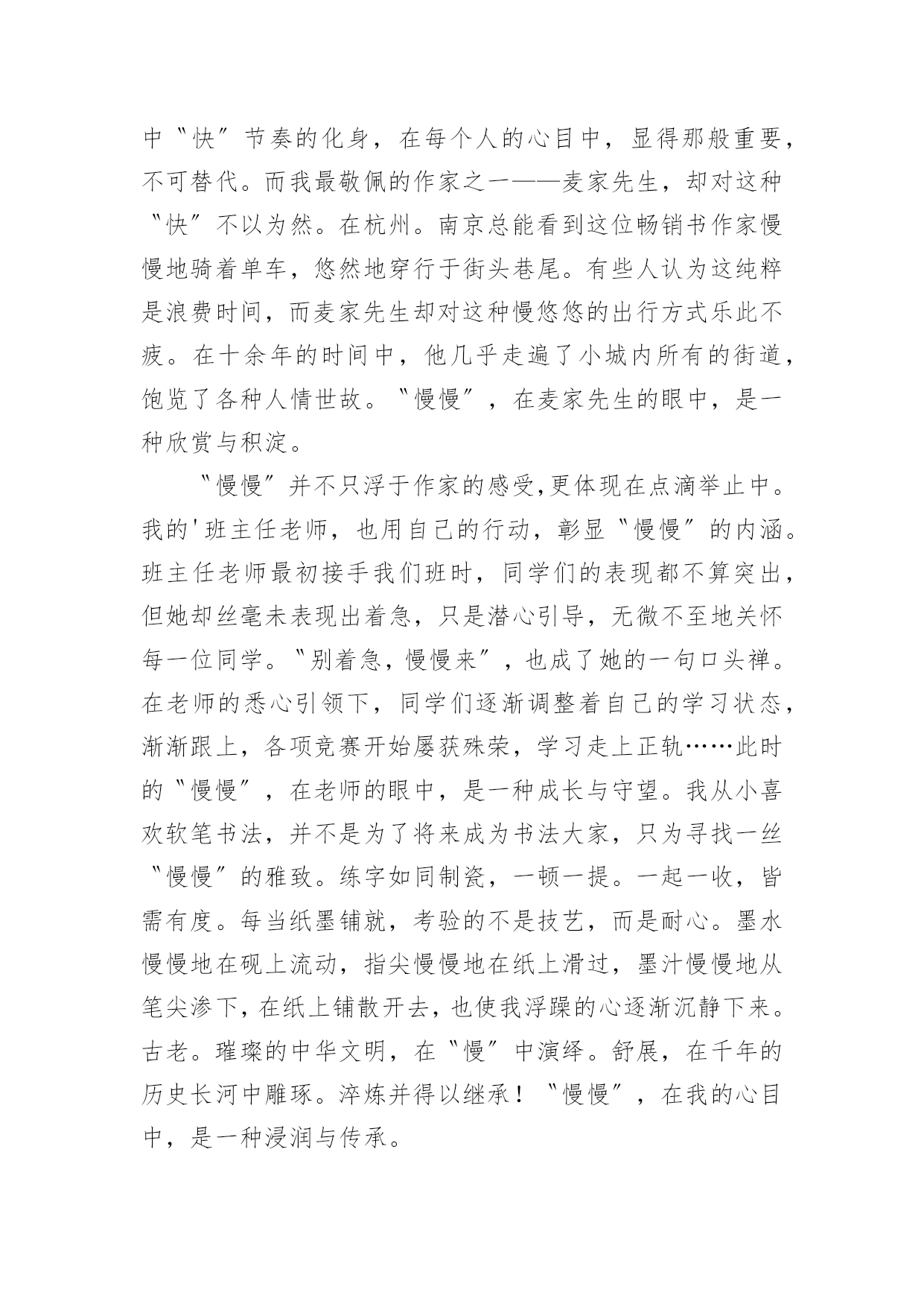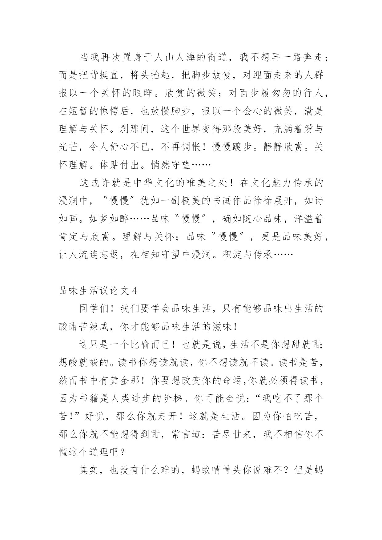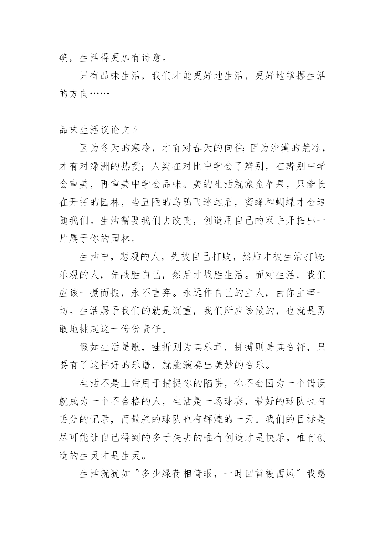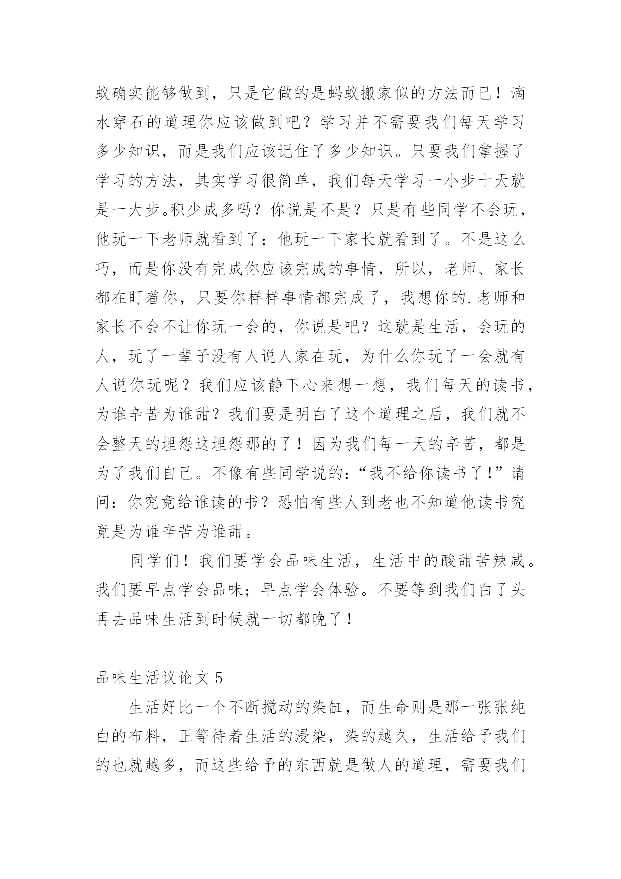 品味生活议论文在日复一日的学习、工作生活中,大家肯定对论文都不陌生吧,通过论文写作可以培养我们的科学研究能力。那么问题来了,到底应如何写一篇优秀的论文呢?以下是小编整理的品味生活议论文,仅供参考,希望能够帮助到大家。品味生活议论文1品味生活的人才能悟出其中的味道,生活就像一坛美酒,只有懂得品尝的人,才能体会它的香醇。许多时候,我们会抱怨生活的不公,为什么老是苦难重重?为什么总会有人活得不自在,不开心呢?呵,这些都是因为还是没有真正读懂生活,没有真正了解生活。去喝一杯甜的水,甘甜的滋味会让你回味无穷。你的开心快乐,幸福都像糖一样,一点点被融入水中,从没有味达到令人回味无穷,充满甘甜的气息,让人微笑,让人快乐……反之,再去喝一杯咸的水,咸咸的滋味像是眼泪的苦涩。是什么让它哭了?是什么让生活加入了苦涩的味道?是生活的艰辛还是为生活中遇到的种。种困难而苦恼?生活这条路,没有尽头,只有读懂生活的人才真正体会到它的.韵味。不管什么样的苦难,或者说,我们不知道前面等着我们的会是什么样的境遇,也许痛苦之间,让人感觉命运在捉弄我们,其实,命运是掌握在自己手中,有时候,我们不能改变事情的结果,但是我们可以刻意地完善过程,让生活的方向更明确,生活得更加有诗意。只有品味生活,我们才能更好地生活,更好地掌握生活的方向……品味生活议论文2因为冬天的寒冷,才有对春天的向往;因为沙漠的荒凉,才有对绿洲的热爱;人类在对比中学会了辨别,在辨别中学会审美,再审美中学会品味。美的生活就象金苹果,只能长在开拓的园林,当丑陋的乌鸦飞逃远盾,蜜蜂和蝴蝶才会追随我们。生活需要我们去改变,创造用自己的双手开拓出一片属于你的园林。生活中,悲观的人,先被自己打败,然后才被生活打败;乐观的人,先战胜自己,然后才战胜生活。面对生活,我们应该一撅而振,永不言弃。永远作自己的主人,由你主宰一切。生活赐予我们的就是沉重,我们所应该做的,也就是勇敢地挑起这一份份责任。假如生活是歌,挫折则为其乐章,拼搏则是其音符,只要有了这样好的乐谱,就能演奏出美妙的音乐。生活不是上帝用于捕捉你的陷阱,你不会因为一个错误就成为一个不合格的人,生活是一场球赛,最好的球队也有丢分的记录,而最差的球队也有辉煌的一天。我们的目标是尽可能让自己得到的多于失去的唯有创造才是快乐,唯有创造的生灵才是生灵。生活就犹如〝多少绿荷相倚眼,一时回首被西风〞我感叹生活,生活的美好,沧桑,还有不尽的忧伤。生活就如同〝西风吹叶,在湖边的边上,独自初换秋衣,一片概然。〞生活就如同秋天的'树叶〝夜深风竹敲秋韵,万叶千声皆是恨。〞面对生活,或寄情山水,或纵情天地,对人生可能有更深的感悟,如那句〝春服既成,与童子五六人,冠者六七人,沐浴春光,岂不美哉!〞面对生活,我们需要更多的是勇气,智慧,拼搏,努力。无论你的人生如何,那都是属于你的,你只有,只能靠你的双手去改变,没有任何捷径。生活是龚自珍〝落红不是无情物,化作春泥更护花〞的献身精神。生活就是苏东坡〝谁道人生无再少,门前流水尚能西。〞的超脱与豁达,生活是杜甫〝感时花溅泪,恨别鸟惊心。〞的无奈与感伤。生活就是一杯咖啡,它的苦,它的甜,它的纯,它的郁,要你去品。因为生活的财富是感觉,不要失去后才伤心当初没品它的苦甜纯郁。生活的美丽,永远展现在不断进取之中,就像大树的美丽是展现在它负势向上直指苍穹的蓬勃生机中;像雄鹰的美丽是展现在它搏击风雨如苍天之魂的翱翔中。品味生活,品味人生,方可知其中的酸甜苦辣。品味生活议论文3穿梭在熙熙攘攘的人群中,你会发现几乎每个人都低头匆匆行走。神色凝重。但凡把步伐放慢一些,都会感受到一种莫名的紧张与不安。繁华的街道,仿佛早已成为都市生活中〝快〞节奏的化身,在每个人的心目中,显得那般重要,不可替代。而我最敬佩的作家之一——麦家先生,却对这种〝快〞不以为然。在杭州。南京总能看到这位畅销书作家慢慢地骑着单车,悠然地穿行于街头巷尾。有些人认为这纯粹是浪费时间,而麦家先生却对这种慢悠悠的出行方式乐此不疲。在十余年的时间中,他几乎走遍了小城内所有的街道,饱览了各种人情世故。〝慢慢〞,在麦家先生的眼中,是一种欣赏与积淀。〝慢慢〞并不只浮于作家的感受,更体现在点滴举止中。我的'班主任老师,也用自己的行动,彰显〝慢慢〞的内涵。班主任老师最初接手我们班时,同学们的表现都不算突出,但她却丝毫未表现出着急,只是潜心引导,无微不至地关怀每一位同学。〝别着急,慢慢来〞,也成了她的一句口头禅。在老师的悉心引领下,同学们逐渐调整着自己的学习状态,渐渐跟上,各项竞赛开始屡获殊荣,学习走上正轨……此时的〝慢慢〞,在老师的眼中,是一种成长与守望。我从小喜欢软笔书法,并不是为了将来成为书法大家,只为寻找一丝〝慢慢〞的雅致。练字如同制瓷,一顿一提。一起一收,皆需有度。每当纸墨铺就,考验的不是技艺,而是耐心。