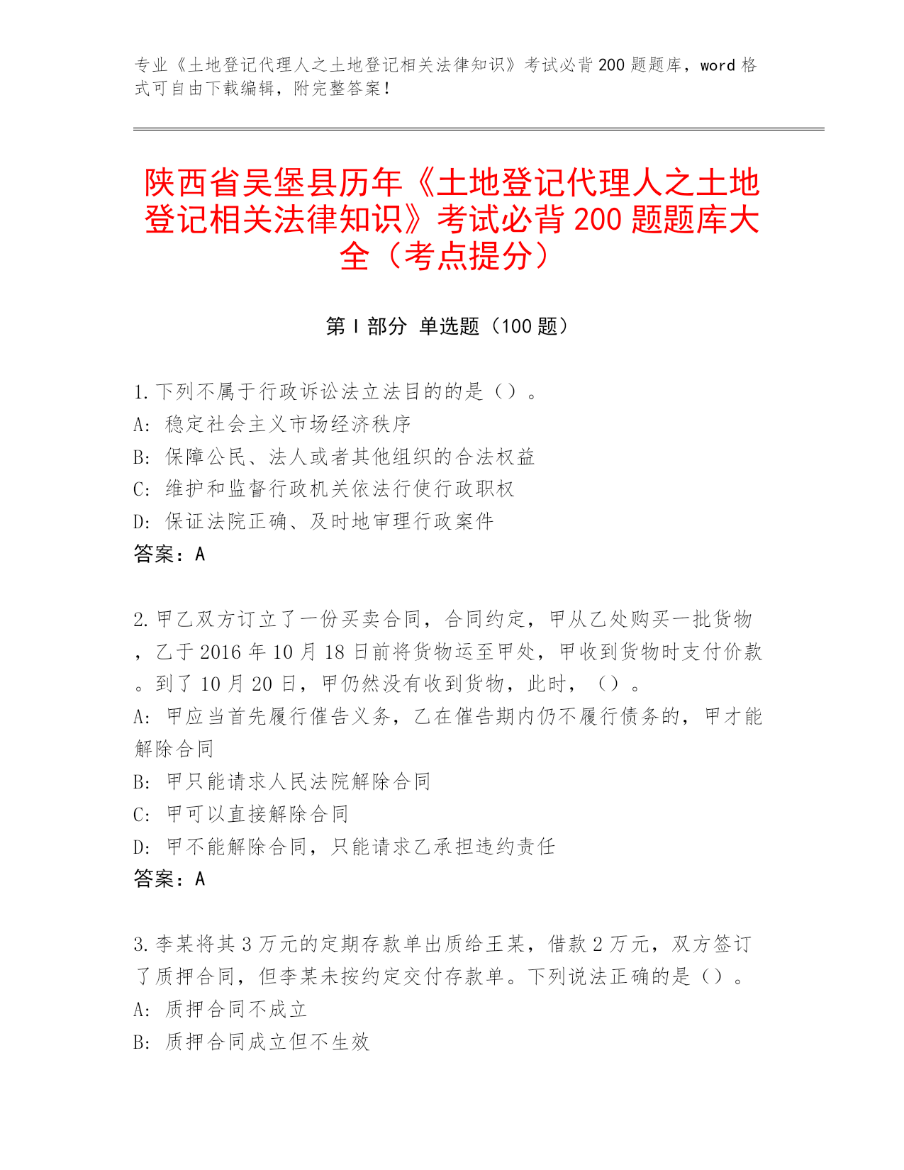 陕西省吴堡县历年《土地登记代理人之土地登记相关法律知识》考试必背200题题库大全(考点提分).docx