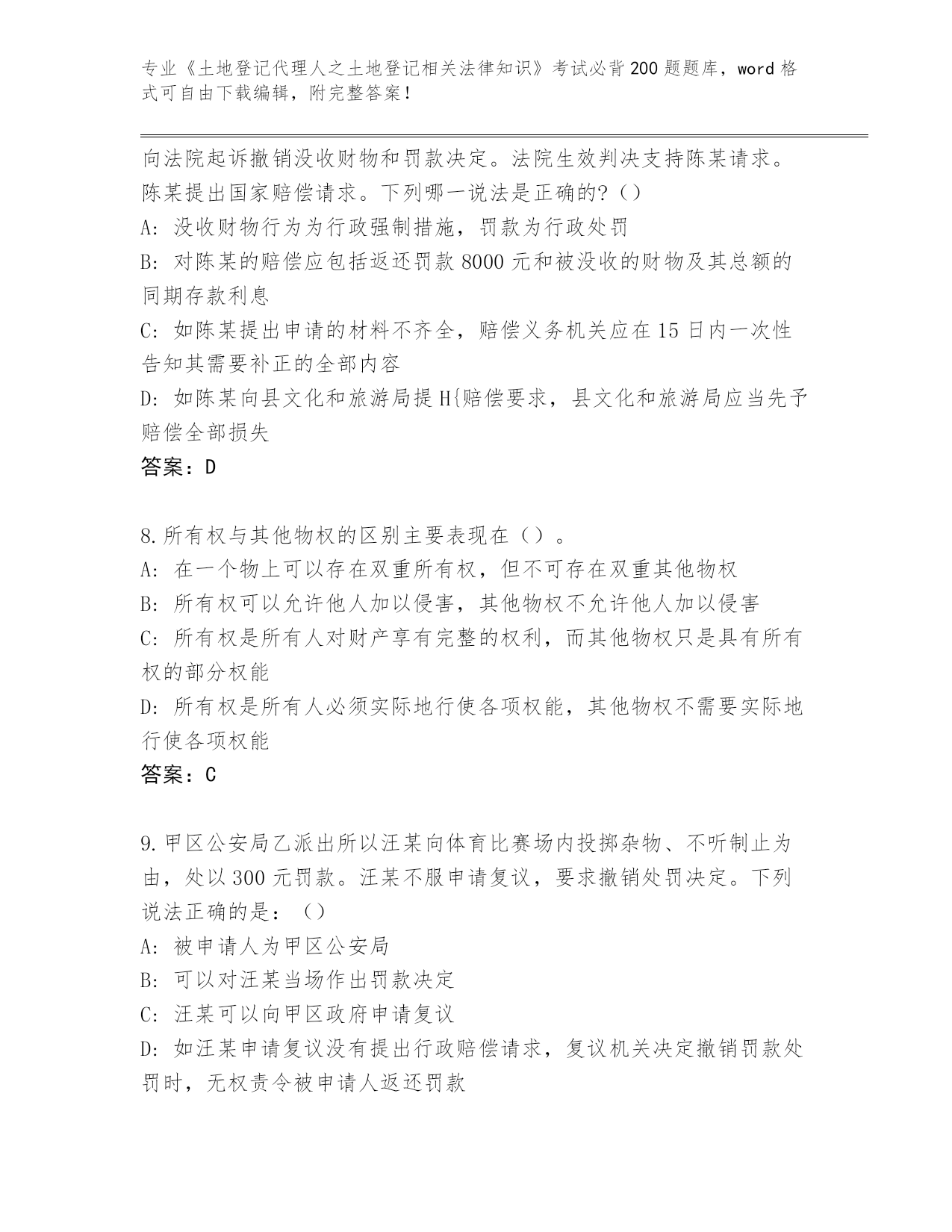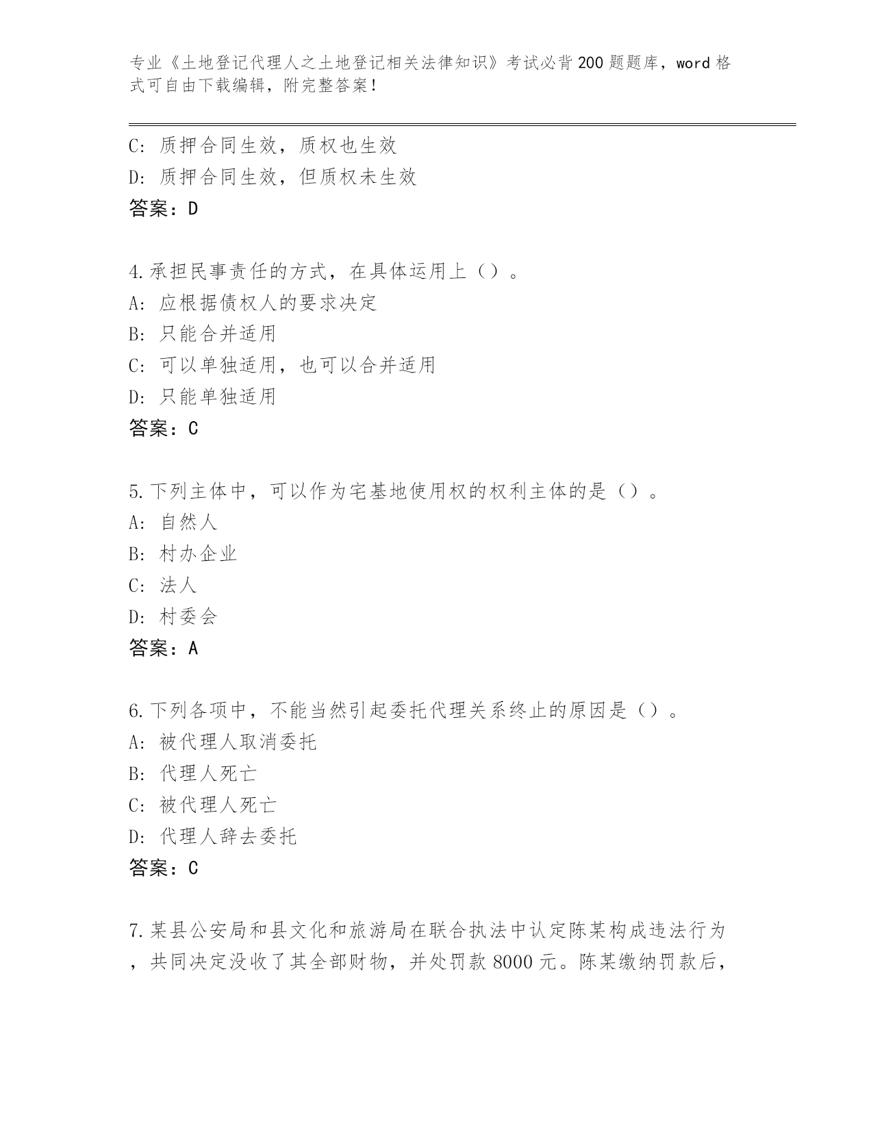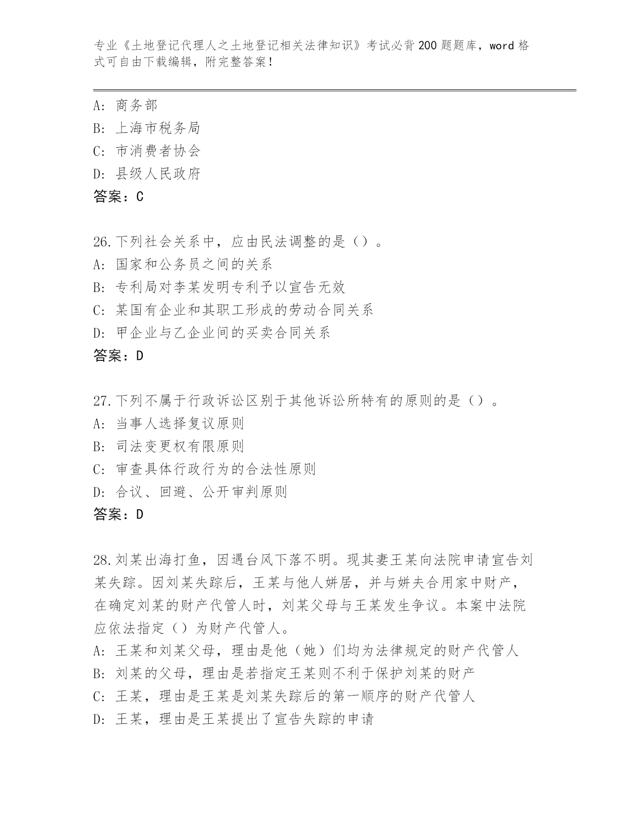 2024黑龙江省泰来县《土地登记代理人之土地登记相关法律知识》资格考试必刷200题真题(网校专用)