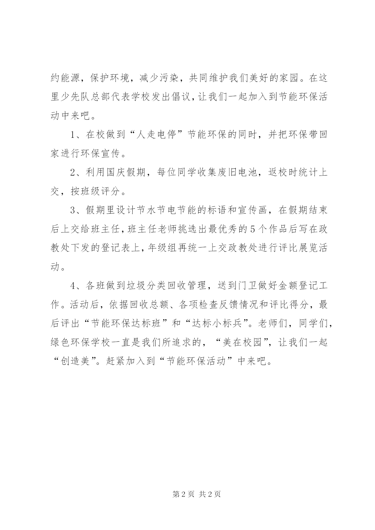 第PAGE\*Arabic\*MERGEFORMAT2页共NUMPAGES\*MERGEFORMAT2页美化校园节能环保倡议书早上好。清晨,我们开始了新的一天。教室里虽然人影无多,却早已灯管明亮,电扇呼呼作响。饮水机干烧了一整夜。电脑屏幕仍旧在教室前端闪烁光芒。操场上人声鼎沸时,空无一人的教室里依然灯光璀璨。午餐过后,剩下的大半盘的饭菜被理所当然的倒入垃圾桶内。渺无人烟的厕所内,水声滴答滴答作响。。。这一件件让人看了痛心的案例并不是凭空虚构的,它确实存在于我们一直提倡环保的校园中。社会的进步,生产的发展,为我们的生活带来了极大的方便与快乐,改善了人类的生活居住环境。但另一方面,我们也看到了更残酷的事实:地球上的固有能源却在一天天的减少,环境在一天天地遭受着污染,地球的生态在遭受着破坏,我们的身心健康也正在受到极大的威胁,我们干净美丽的地球村也日益变得污浊和混乱。就电力方面来讲,目前,我国60%的用电都来自于火力发电,然而火力发电却对生态环境构成了极大的破坏,火力发电严重污染了空气,加重了环境破坏。水力发电虽然洁净,却也对人类环境构成了威胁。水力发电需要筑坝拦截水源,其导致水灾的事例已时有发生,为此还要发动居民搬迁,既造成了人员的动荡不安,也增加了国家的经济负担,而且拦截水源,破坏了生物多样性,改变了河流的生态。人类只有一个地球,它是人类生命的根源,是我们共同的家园,作为地球村的成员,我们有责任也有义务,从生活中的一点一滴做起,节约能源,保护环境,减少污染,共同维护我们美好的家园。在这里少先队总部代表学校发出倡议,让我们一起加入到节能环保活动中来吧。1、在校做到“人走电停”节能环保的同时,并把环保带回家进行环保宣传。2、利用国庆假期,每位同学收集废旧电池,返校时统计上交,按班级评分。3、假期里设计节水节电节能的标语和宣传画,在假期结束后上交给班主任,班主任老师挑选出最优秀的5个作品后写在政教处下发的登记表上,年级组再统一上交政教处进行评比展览活动。4、各班做到垃圾分类回收管理,送到门卫做好金额登记工作。活动后,依据回收总额、各项检查反馈情况和评比得分,最后评出“节能环保达标班”和“达标小标兵”。老师们,同学们,绿色环保学校一直是我们所追求的,“美在校园”,让我们一起“创造美”。赶紧加入到“节能环保活动”中来吧。