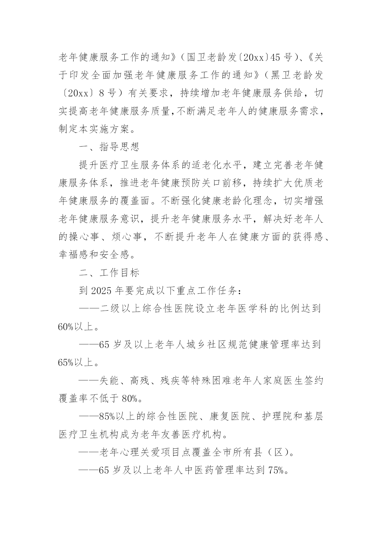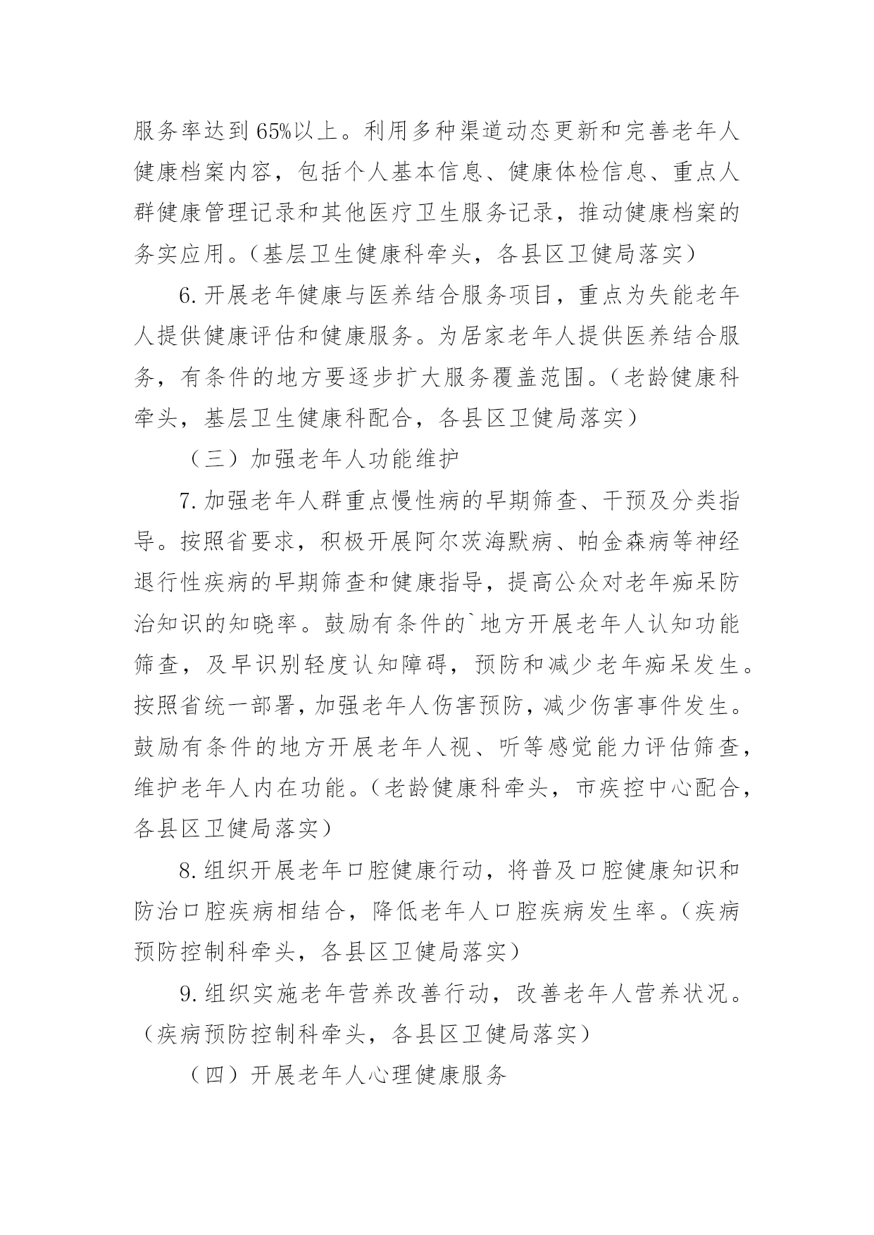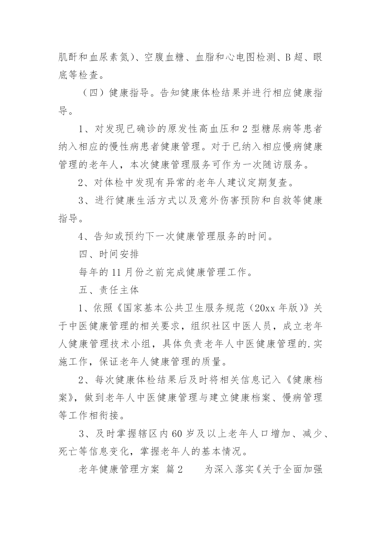 老年健康管理方案老年健康管理方案(精选22篇)为了确保事情或工作能无误进行,常常需要预先制定方案,方案是阐明行动的时间,地点,目的,预期效果,预算及方法等的书面计划。方案应该怎么制定呢?下面是小编精心整理的老年健康管理方案,欢迎阅读,希望大家能够喜欢。老年健康管理方案篇1为进一步做好我社区老年人中医健康管理工作,提高我社区老年人健康水平,现就我社区老年人中医健康管理工作制定如下方案。一、管理对象辖区内60岁及以上常住居民(以下简称老年人)。二、工作目标辖区内60岁以上老年人健康体检率不低于60%。三、管理内容对老年人每年进行1次健康管理,内容包括:(一)生活方式和健康状况评估:通过望、问、闻、切四诊进行辨证及老年人健康状态自评了解其基本健康状况、体育锻炼、饮食、吸烟、饮酒、慢性疾病常见症状、既往所患疾病、治疗及目前用药和生活自理能力等情况。(二)体格检查:过望、问、闻、切四诊进行粗测判断。(三)辅助检查:包括血常规、尿常规、肝功能(血清谷草转氨酶、血清谷丙转氨酶和总胆红素)、肾功能(血清肌酐和血尿素氮)、空腹血糖、血脂和心电图检测、B超、眼底等检查。(四)健康指导。告知健康体检结果并进行相应健康指导。1、对发现已确诊的原发性高血压和2型糖尿病等患者纳入相应的慢性病患者健康管理。对于已纳入相应慢病健康管理的老年人,本次健康管理服务可作为一次随访服务。2、对体检中发现有异常的老年人建议定期复查。3、进行健康生活方式以及意外伤害预防和自救等健康指导。4、告知或预约下一次健康管理服务的时间。四、时间安排每年的11月份之前完成健康管理工作。五、责任主体1、依照《国家基本公共卫生服务规范(20xx年版)》关于中医健康管理的相关要求,组织社区中医人员,成立老年人健康管理技术小组,具体负责老年人中医健康管理的.实施工作,保证老年人健康管理的质量。2、每次健康体检结果后及时将相关信息记入《健康档案》,做到老年人中医健康管理与建立健康档案、慢病管理等工作相衔接。3、及时掌握辖区内60岁及以上老年人口增加、减少、死亡等信息变化,掌握老年人的基本情况。老年健康管理方案篇2为深入落实《关于全面加强老年健康服务工作的通知》(国卫老龄发〔20xx〕45号)、《关于印发全面加强老年健康服务工作的通知》(黑卫老龄发〔20xx〕8号)有关要求,持续增加老年健康服务供给,切实提高老年健康服务质量,不断满足老年人的健康服务需求,制定本实施方案。一、指导思想提升医疗卫生服务体系的适老化水平,建立完善老年健康服务体系,推进老年健康预防关口前移,持续扩大优质老年健康服务的覆盖面。不断强化健康老龄化理念,切实增强老年健康服务意识,提升老年健康服务水平,解决好老年人的操心事、烦心事,不断提升老年人在健康方面的获得感、幸福感和安全感。二、工作目标到2025年要完成以下重点工作任务:——二级以上综合性医院设立老年医学科的比例达到60%以上。——65岁及以上老年人城乡社区规范健康管理率达到65%以上。——失能、高残、残疾等特殊困难老年人家庭医生签约覆盖率不低于80%。——85%以上的综合性医院、康复医院、护理院和基层医疗卫生机构成为老年友善医疗机构。——老年心理关爱项目点覆盖全市所有县(区)。——65岁及以上老年人中医药管理率达到75%。——三级中医医院设置康复科比例达到90%。三、工作任务(一)加强老年人健康教育1.在城乡社区加强老年健康知识宣传和教育,利用多种方式和媒体媒介,面向老年人及其照护者广泛传播营养膳食、运动健身、心理健康、伤害预防、疾病预防、合理用药、康复护理、生命教育、消防安全和中医养生保健等科普知识。(老龄健康科牵头,宣传科配合,各县区卫健局落实)2.组织实施老年人健康素养促进项目,有针对性地加强健康教育,提升老年人健康素养。(疾病预防控制科牵头,各县区卫健局落实)3.利用老年健康宣传周、敬老月、重阳节、世界阿尔茨海默病日等契机,积极宣传《老年健康核心信息》《预防老年跌倒核心信息》《失能预防核心信息》《阿尔茨海默病预防与干预核心信息》等老年健康科学知识和老年健康服务政策。(老龄健康科牵头,各县区卫健局落实)4.将老年健康教育融入临床诊疗工作,鼓励各县(区)将其纳入医疗机构绩效考核内容。(医政医管与保健科牵头,中医科、基层卫生健康科配合,各县区卫健局、各市级医院落实)(二)做实老年人基本公共卫生服务5.落实基本公共卫生服务老年人健康管理项目,提供生活方式和健康状况评估、体格检查、辅助检查和健康指导服务,到2025年,65岁及以上老年人城乡社区规范健康管理服务率达到65%以上。利用多种渠道动态更新和完善老年人健康档案内容,包括个人基本信息、健康体检信息、重点人群健康管理记录和其他医疗卫生服务记录,推动健康档案的务实应用。(基层卫生健康科牵头,各县区卫健局落实)6.