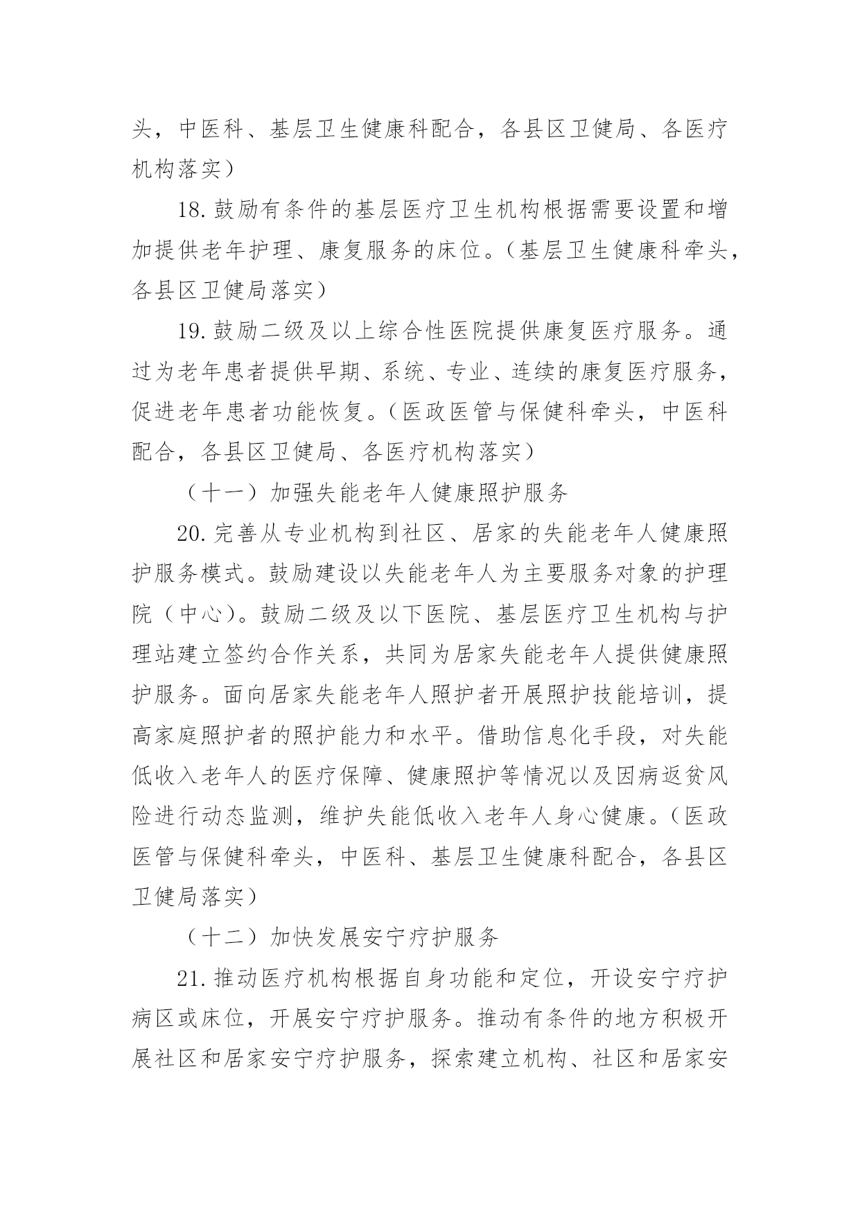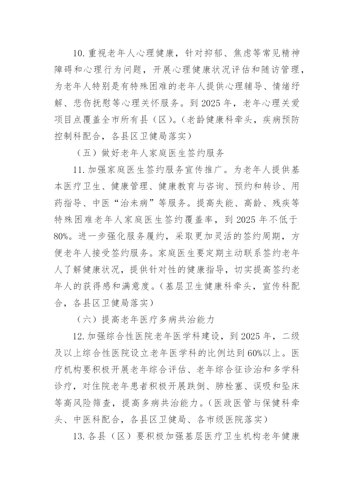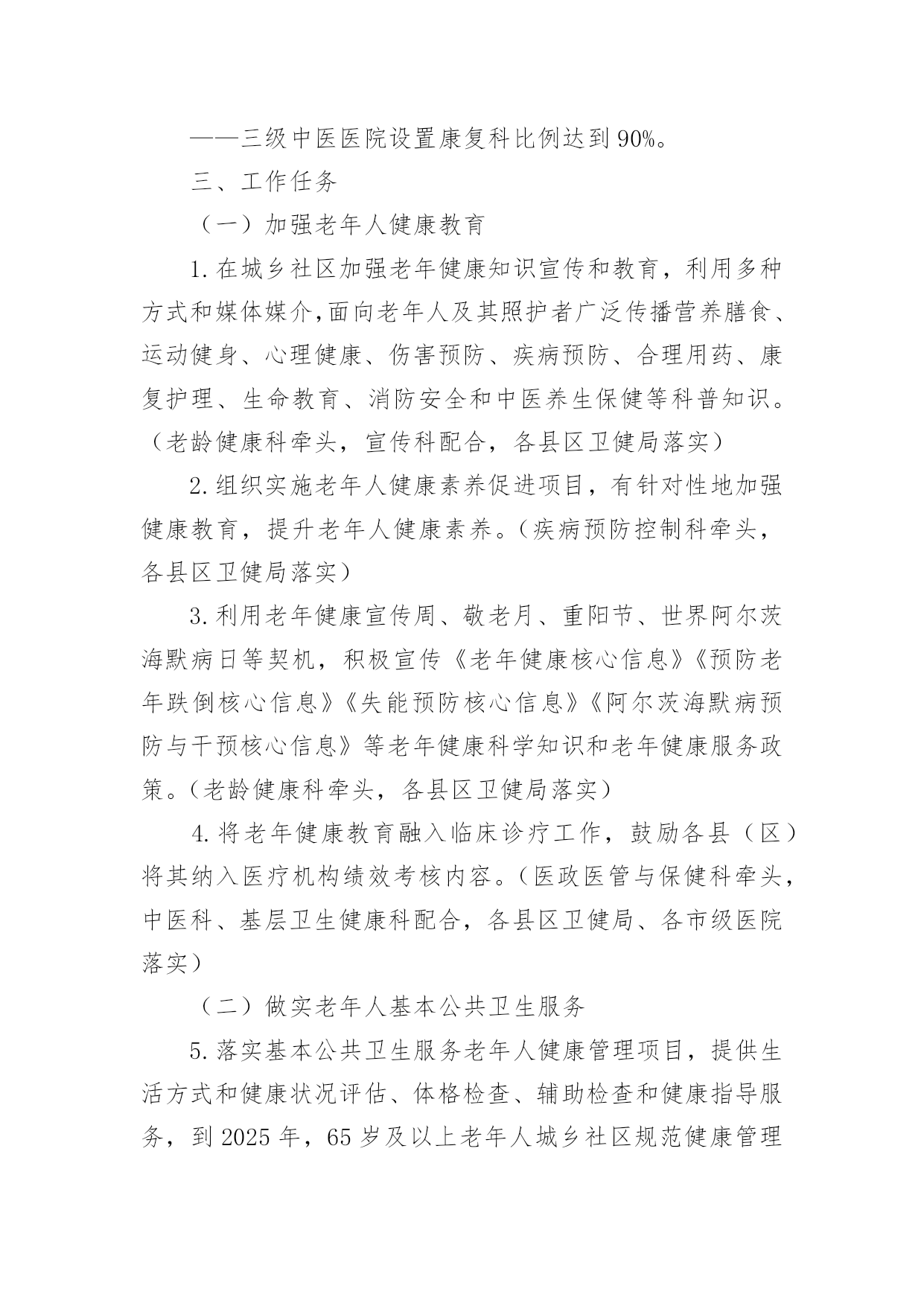 老年健康管理方案老年健康管理方案(精选22篇)为了确保事情或工作能无误进行,常常需要预先制定方案,方案是阐明行动的时间,地点,目的,预期效果,预算及方法等的书面计划。方案应该怎么制定呢?下面是小编精心整理的老年健康管理方案,欢迎阅读,希望大家能够喜欢。老年健康管理方案篇1为进一步做好我社区老年人中医健康管理工作,提高我社区老年人健康水平,现就我社区老年人中医健康管理工作制定如下方案。一、管理对象辖区内60岁及以上常住居民(以下简称老年人)。二、工作目标辖区内60岁以上老年人健康体检率不低于60%。三、管理内容对老年人每年进行1次健康管理,内容包括:(一)生活方式和健康状况评估:通过望、问、闻、切四诊进行辨证及老年人健康状态自评了解其基本健康状况、体育锻炼、饮食、吸烟、饮酒、慢性疾病常见症状、既往所患疾病、治疗及目前用药和生活自理能力等情况。(二)体格检查:过望、问、闻、切四诊进行粗测判断。(三)辅助检查:包括血常规、尿常规、肝功能(血清谷草转氨酶、血清谷丙转氨酶和总胆红素)、肾功能(血清肌酐和血尿素氮)、空腹血糖、血脂和心电图检测、B超、眼底等检查。(四)健康指导。告知健康体检结果并进行相应健康指导。1、对发现已确诊的原发性高血压和2型糖尿病等患者纳入相应的慢性病患者健康管理。对于已纳入相应慢病健康管理的老年人,本次健康管理服务可作为一次随访服务。2、对体检中发现有异常的老年人建议定期复查。3、进行健康生活方式以及意外伤害预防和自救等健康指导。4、告知或预约下一次健康管理服务的时间。四、时间安排每年的11月份之前完成健康管理工作。五、责任主体1、依照《国家基本公共卫生服务规范(20xx年版)》关于中医健康管理的相关要求,组织社区中医人员,成立老年人健康管理技术小组,具体负责老年人中医健康管理的.实施工作,保证老年人健康管理的质量。2、每次健康体检结果后及时将相关信息记入《健康档案》,做到老年人中医健康管理与建立健康档案、慢病管理等工作相衔接。3、及时掌握辖区内60岁及以上老年人口增加、减少、死亡等信息变化,掌握老年人的基本情况。老年健康管理方案篇2为深入落实《关于全面加强老年健康服务工作的通知》(国卫老龄发〔20xx〕45号)、《关于印发全面加强老年健康服务工作的通知》(黑卫老龄发〔20xx〕8号)有关要求,持续增加老年健康服务供给,切实提高老年健康服务质量,不断满足老年人的健康服务需求,制定本实施方案。一、指导思想提升医疗卫生服务体系的适老化水平,建立完善老年健康服务体系,推进老年健康预防关口前移,持续扩大优质老年健康服务的覆盖面。不断强化健康老龄化理念,切实增强老年健康服务意识,提升老年健康服务水平,解决好老年人的操心事、烦心事,不断提升老年人在健康方面的获得感、幸福感和安全感。二、工作目标到2025年要完成以下重点工作任务:——二级以上综合性医院设立老年医学科的比例达到60%以上。——65岁及以上老年人城乡社区规范健康管理率达到65%以上。——失能、高残、残疾等特殊困难老年人家庭医生签约覆盖率不低于80%。——85%以上的综合性医院、康复医院、护理院和基层医疗卫生机构成为老年友善医疗机构。——老年心理关爱项目点覆盖全市所有县(区)。——65岁及以上老年人中医药管理率达到75%。——三级中医医院设置康复科比例达到90%。三、工作任务(一)加强老年人健康教育1.在城乡社区加强老年健康知识宣传和教育,利用多种方式和媒体媒介,面向老年人及其照护者广泛传播营养膳食、运动健身、心理健康、伤害预防、疾病预防、合理用药、康复护理、生命教育、消防安全和中医养生保健等科普知识。(老龄健康科牵头,宣传科配合,各县区卫健局落实)2.组织实施老年人健康素养促进项目,有针对性地加强健康教育,提升老年人健康素养。(疾病预防控制科牵头,各县区卫健局落实)3.利用老年健康宣传周、敬老月、重阳节、世界阿尔茨海默病日等契机,积极宣传《老年健康核心信息》《预防老年跌倒核心信息》《失能预防核心信息》《阿尔茨海默病预防与干预核心信息》等老年健康科学知识和老年健康服务政策。(老龄健康科牵头,各县区卫健局落实)4.将老年健康教育融入临床诊疗工作,鼓励各县(区)将其纳入医疗机构绩效考核内容。(医政医管与保健科牵头,中医科、基层卫生健康科配合,各县区卫健局、各市级医院落实)(二)做实老年人基本公共卫生服务5.落实基本公共卫生服务老年人健康管理项目,提供生活方式和健康状况评估、体格检查、辅助检查和健康指导服务,到2025年,65岁及以上老年人城乡社区规范健康管理服务率达到65%以上。利用多种渠道动态更新和完善老年人健康档案内容,包括个人基本信息、健康体检信息、重点人群健康管理记录和其他医疗卫生服务记录,推动健康档案的务实应用。(基层卫生健康科牵头,各县区卫健局落实)6.