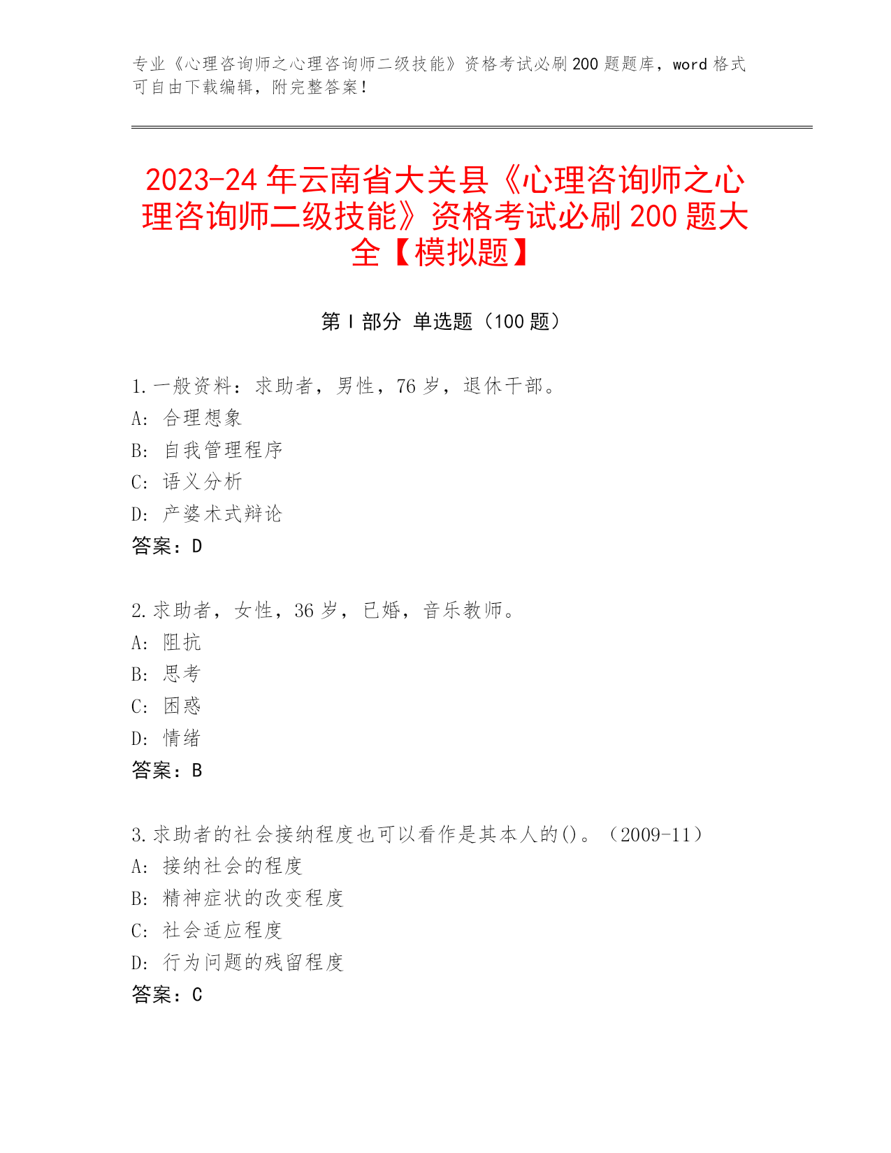 2023-24年云南省大关县《心理咨询师之心理咨询师二级技能》资格考试必刷200题大全【模拟题】