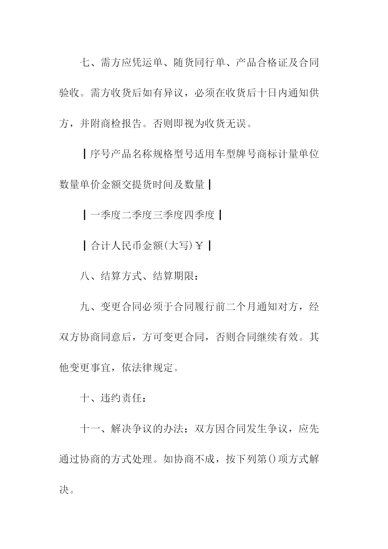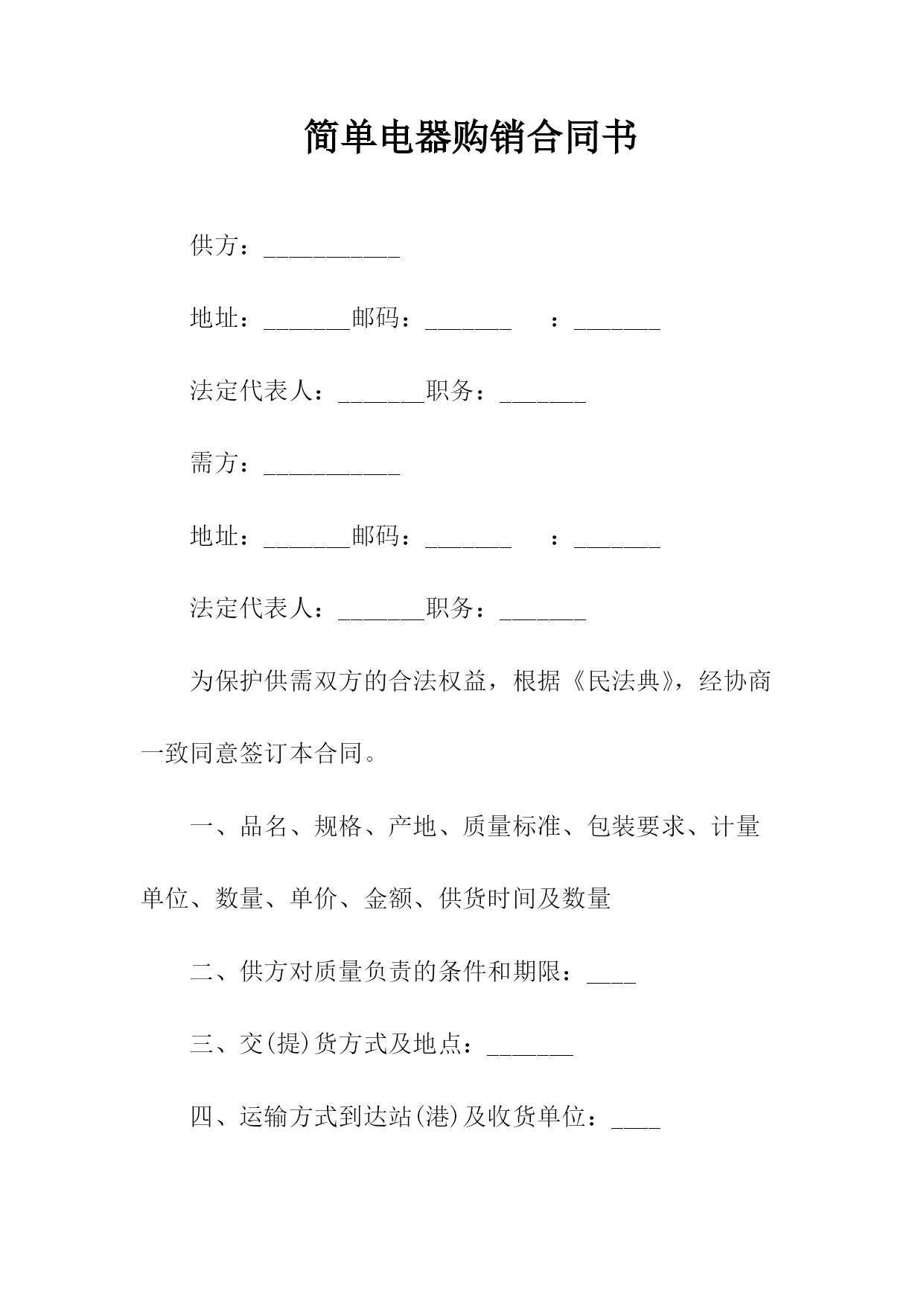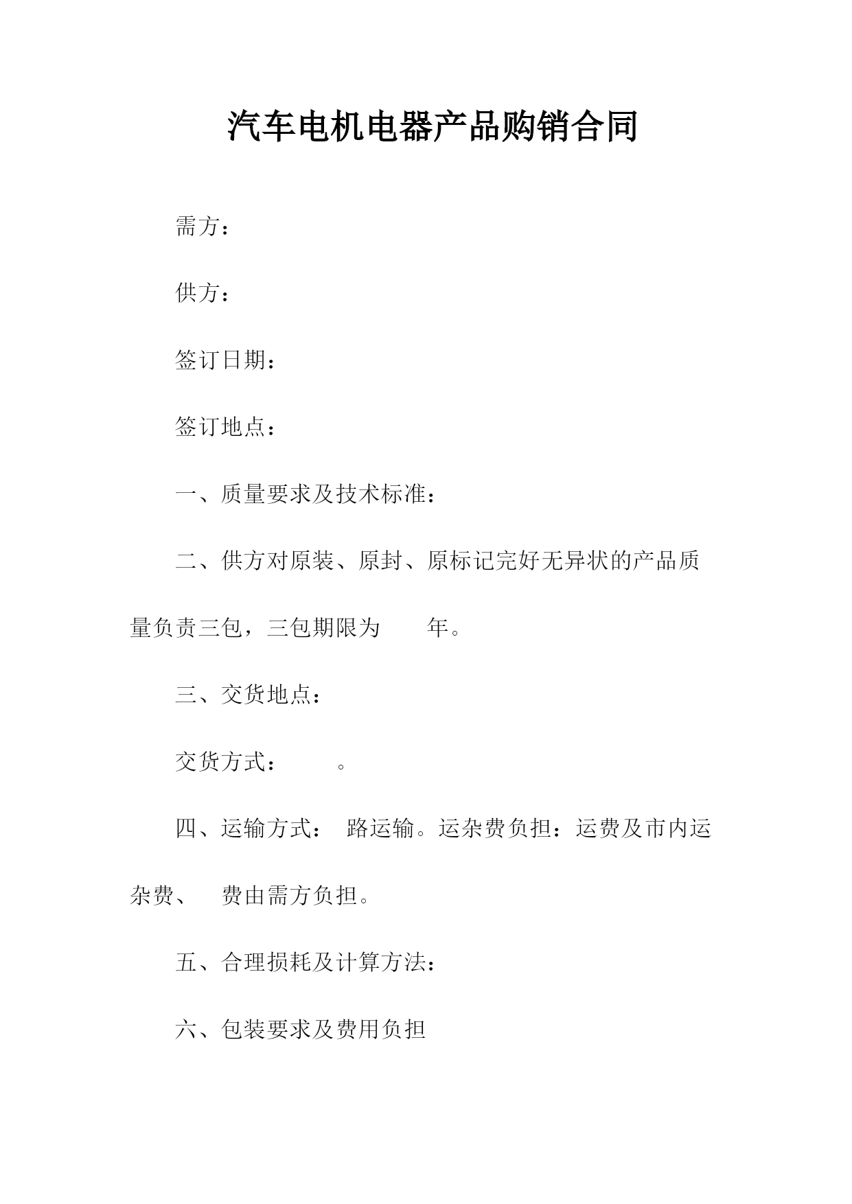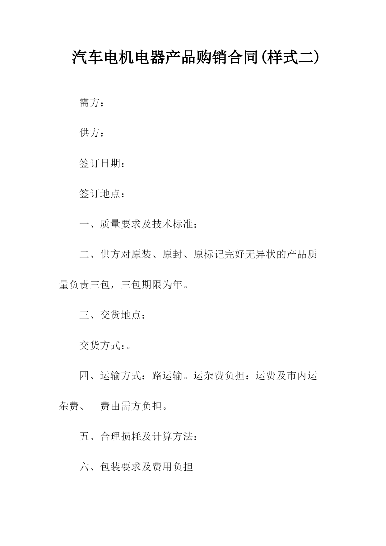 汽车电机电器产品购销合同书1.产品的规格、数量、价格序号产品名称规格型号适用车型牌号商标计量单位数量单价金额交提货时间及数量一季度二季度三季度四季度合计人民币金额(大写)_____¥___________年以前设计的产品按jb2261-77“汽车拖拉机用电气设备基本技术条件”执行;______年后设计的产品按zbt35001-87“汽车电器设备技术条件”执行。3.供方对原装、原封、原标记完好无异状的产品质量负责三包,三包期限为一年。4.交货地点、交货方式:_______________。5.运输方式、运杂费______路运输,运费及市内运杂费、费由需方负担。6.合理损耗及计算方法:_______________。纸箱按gb6544-86瓦楞纸板,gb6543-86瓦楞纸箱bz237-86标准,木箱按bz238-86。泡沫包装按bz239-86。包装费用由供方负担。包装物不回收。8.需方应凭运单、随货同行单、产品合格证及合同验收。需方收货后如有异议,必须在收货后十日内通知供方,并附商检报告。否则即视为收货无误。托收承付,验单付款或验货付款。10.变更或解除合同必须于合同履行前二个月通知对方,经双方协商同意后,方可变更或解除合同,否则合同继续有效。其他变更事宜,依法律规定。任何一方违反本合同规定,按《工矿产品购销合同条例》第三十五条、第三十六条的规定承担违约责任。双方因合同发生争议,应先通过协商的方式处理。如协商不成,任何一方都可依法提起诉讼或申请仲裁(选择一种方式)。13.其他约定事项:_______________。供方(盖章):______需方(盖章):______代表(签字):______代表(签字):____________年____月____日______年____月____日汽车电机电器产品购销合同需方:供方:签订日期:签订地点:一、质量要求及技术标准:二、供方对原装、原封、原标记完好无异状的产品质量负责三包,三包期限为年。三、交货地点:交货方式:。四、运输方式:路运输。运杂费负担:运费及市内运杂费、费由需方负担。五、合理损耗及计算方法:六、包装要求及费用负担七、需方应凭运单、随货同行单、产品合格证及合同验收。需方收货后如有异议,必须在收货后十日内通知供方,并附商检报告。否则即视为收货无误。八、结算方式、结算期限:九、变更合同必须于合同履行前二个月通知对方,经双方协商同意后,方可变更合同,否则合同继续有效。其他变更事宜,依法律规定。十、违约责任:十一、解决争议的办法:双方因合同发生争议,应先通过协商的方式处理。如协商不成,按下列第()项方式解决。1.向仲裁委员会申请仲裁;2.向人民法院起诉。十二、其他约定事项:需方(签章):供方(签章):法定代表人:法定代表人:代理人:代理人:地址:地址:邮政编码:邮政编码:电话:电话:开户:开户:账号:账号:汽车电机电器产品购销合同(样式二)需方:供方:签订日期:签订地点:一、质量要求及技术标准:二、供方对原装、原封、原标记完好无异状的产品质量负责三包,三包期限为年。三、交货地点:交货方式:。四、运输方式:路运输。运杂费负担:运费及市内运杂费、费由需方负担。五、合理损耗及计算方法:六、包装要求及费用负担七、需方应凭运单、随货同行单、产品合格证及合同验收。需方收货后如有异议,必须在收货后十日内通知供方,并附商检报告。否则即视为收货无误。┃序号产品名称规格型号适用车型牌号商标计量单位数量单价金额交提货时间及数量┃┃一季度二季度三季度四季度┃┃合计人民币金额(大写)¥┃八、结算方式、结算期限:九、变更合同必须于合同履行前二个月通知对方,经双方协商同意后,方可变更合同,否则合同继续有效。其他变更事宜,依法律规定。十、违约责任:十一、解决争议的办法:双方因合同发生争议,应先通过协商的方式处理。如协商不成,按下列第()项方式解决。1.向仲裁委员会申请仲裁;2.向人民法院起诉。十二、其他约定事项:需方(签章):供方(签章):法定代表人:法定代表人:代理人:代理人:地址:地址:邮政编码:邮政编码:::开户:开户:账号:账号:简单电器购销合同书供方:___________地址:_______邮码:_______:_______法定代表人:_______职务:_______需方:___________地址:_______邮码:_______:_______法定代表人:_______职务:_______为保护供需双方的合法权益,根据《民法典》,经协商一致同意签订本合同。一、品名、规格、产地、质量标准、包装要求、计量单位、数量、单价、金额、供货时间及数量二、供方对质量负责的条件和期限:____三、交(提)货方式及地点:_______四、运输方式到达站(港)及收货单位:____五、运