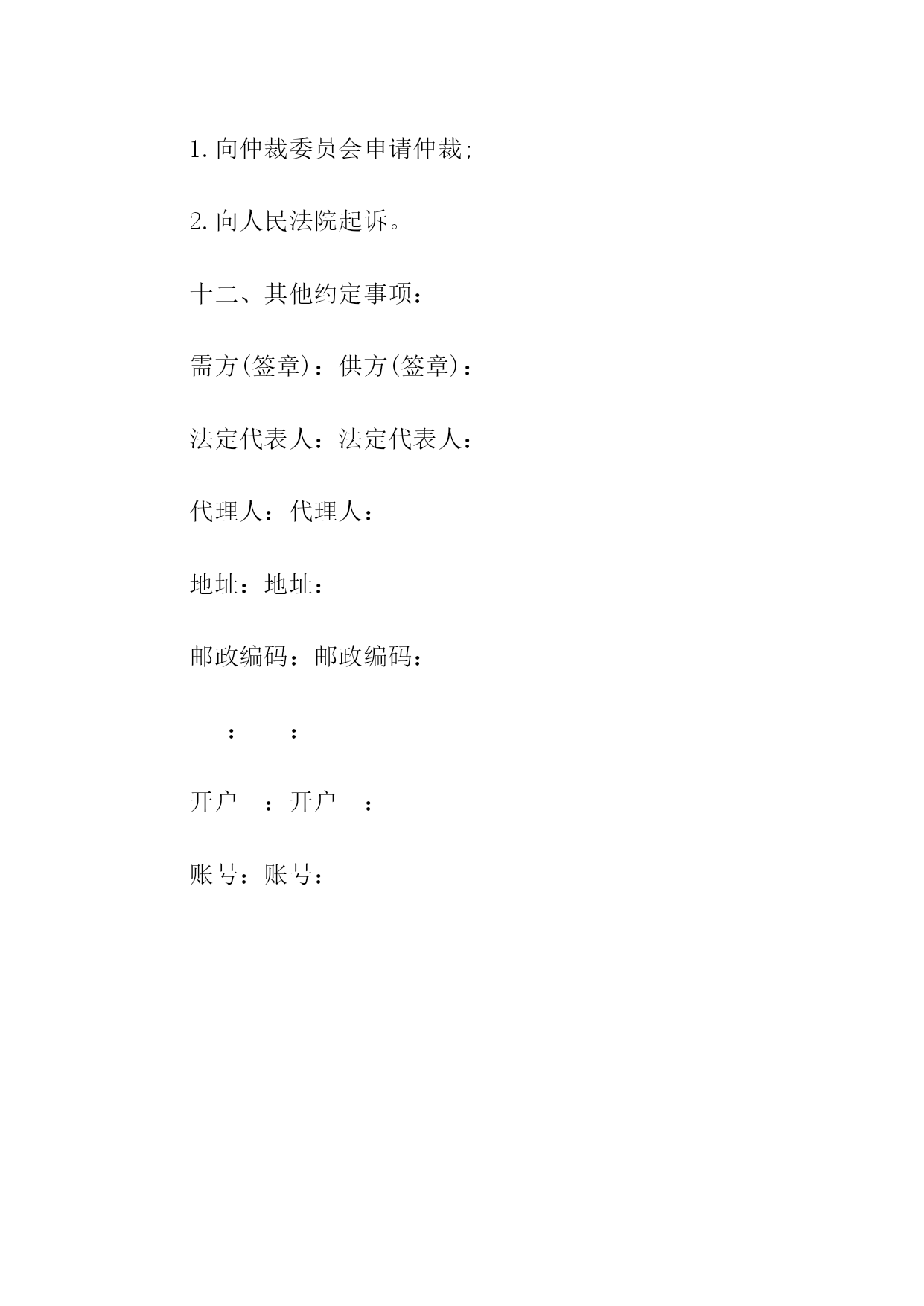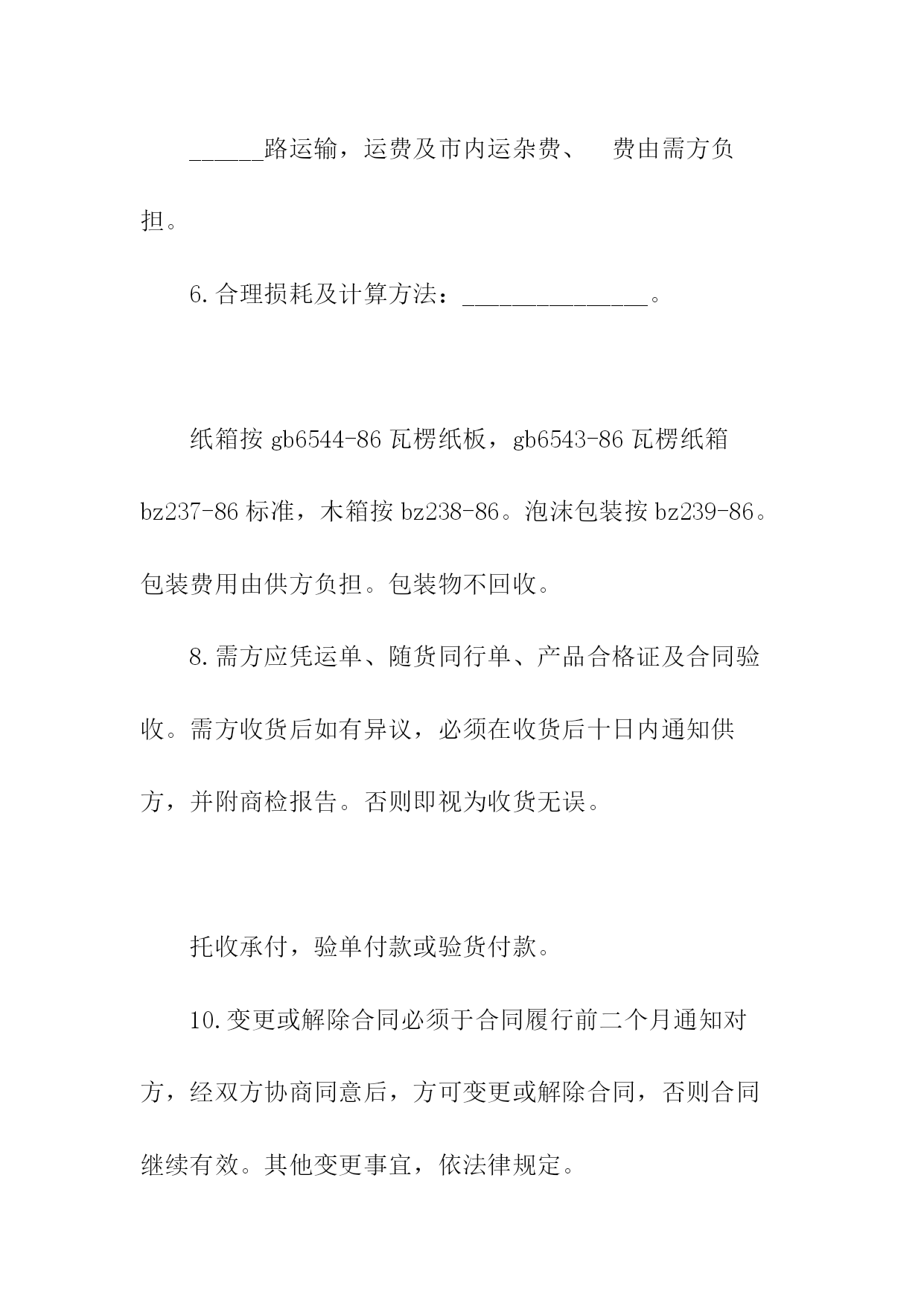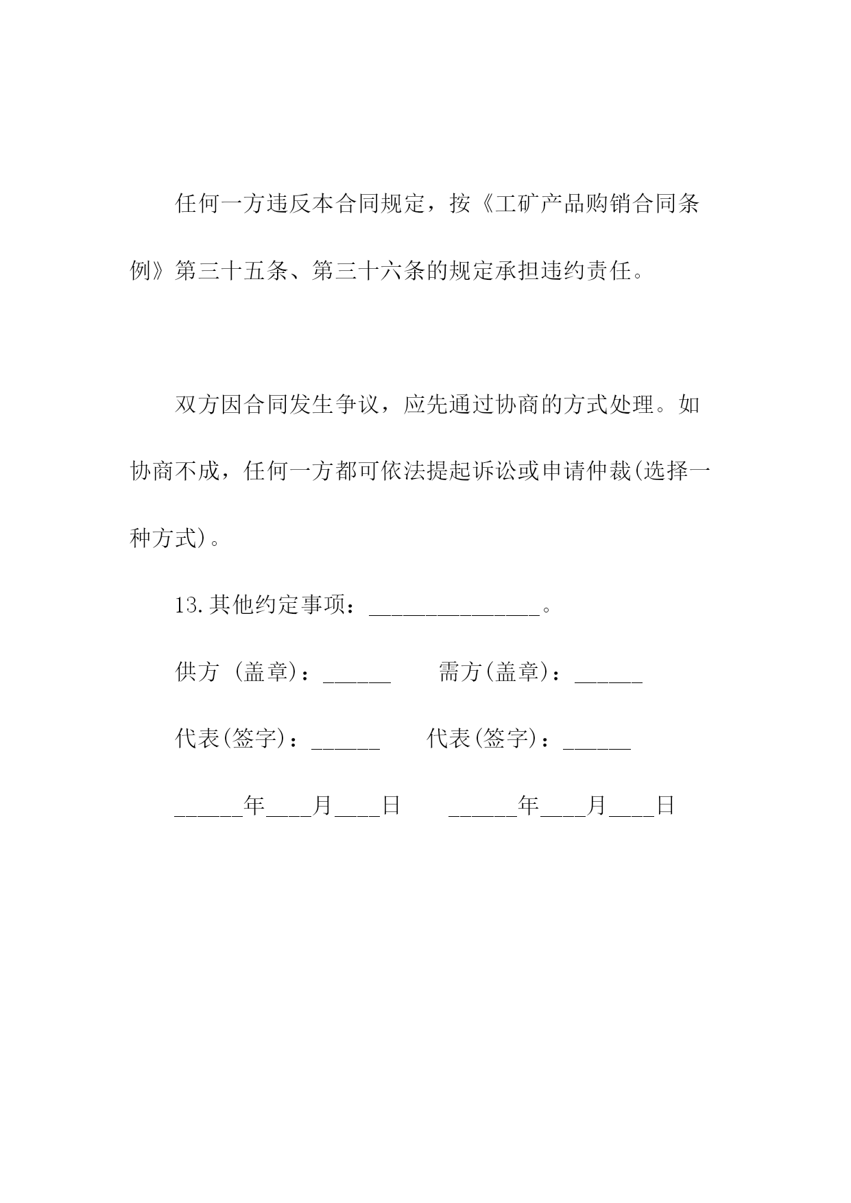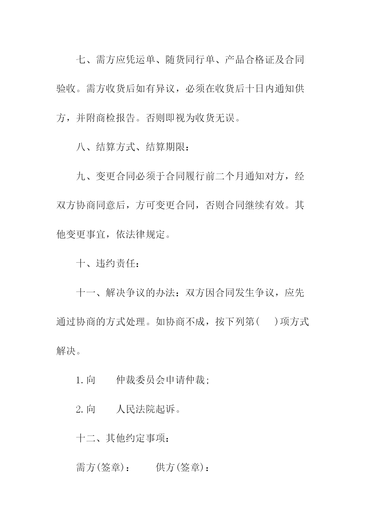 汽车电机电器产品购销合同书1.产品的规格、数量、价格序号产品名称规格型号适用车型牌号商标计量单位数量单价金额交提货时间及数量一季度二季度三季度四季度合计人民币金额(大写)_____¥___________年以前设计的产品按jb2261-77“汽车拖拉机用电气设备基本技术条件”执行;______年后设计的产品按zbt35001-87“汽车电器设备技术条件”执行。3.供方对原装、原封、原标记完好无异状的产品质量负责三包,三包期限为一年。4.交货地点、交货方式:_______________。5.运输方式、运杂费______路运输,运费及市内运杂费、费由需方负担。6.合理损耗及计算方法:_______________。纸箱按gb6544-86瓦楞纸板,gb6543-86瓦楞纸箱bz237-86标准,木箱按bz238-86。泡沫包装按bz239-86。包装费用由供方负担。包装物不回收。8.需方应凭运单、随货同行单、产品合格证及合同验收。需方收货后如有异议,必须在收货后十日内通知供方,并附商检报告。否则即视为收货无误。托收承付,验单付款或验货付款。10.变更或解除合同必须于合同履行前二个月通知对方,经双方协商同意后,方可变更或解除合同,否则合同继续有效。其他变更事宜,依法律规定。任何一方违反本合同规定,按《工矿产品购销合同条例》第三十五条、第三十六条的规定承担违约责任。双方因合同发生争议,应先通过协商的方式处理。如协商不成,任何一方都可依法提起诉讼或申请仲裁(选择一种方式)。13.其他约定事项:_______________。供方(盖章):______需方(盖章):______代表(签字):______代表(签字):____________年____月____日______年____月____日汽车电机电器产品购销合同需方:供方:签订日期:签订地点:一、质量要求及技术标准:二、供方对原装、原封、原标记完好无异状的产品质量负责三包,三包期限为年。三、交货地点:交货方式:。四、运输方式:路运输。运杂费负担:运费及市内运杂费、费由需方负担。五、合理损耗及计算方法:六、包装要求及费用负担七、需方应凭运单、随货同行单、产品合格证及合同验收。需方收货后如有异议,必须在收货后十日内通知供方,并附商检报告。否则即视为收货无误。八、结算方式、结算期限:九、变更合同必须于合同履行前二个月通知对方,经双方协商同意后,方可变更合同,否则合同继续有效。其他变更事宜,依法律规定。十、违约责任:十一、解决争议的办法:双方因合同发生争议,应先通过协商的方式处理。如协商不成,按下列第()项方式解决。1.向仲裁委员会申请仲裁;2.向人民法院起诉。十二、其他约定事项:需方(签章):供方(签章):法定代表人:法定代表人:代理人:代理人:地址:地址:邮政编码:邮政编码:电话:电话:开户:开户:账号:账号:汽车电机电器产品购销合同(样式二)需方:供方:签订日期:签订地点:一、质量要求及技术标准:二、供方对原装、原封、原标记完好无异状的产品质量负责三包,三包期限为年。三、交货地点:交货方式:。四、运输方式:路运输。运杂费负担:运费及市内运杂费、费由需方负担。五、合理损耗及计算方法:六、包装要求及费用负担七、需方应凭运单、随货同行单、产品合格证及合同验收。需方收货后如有异议,必须在收货后十日内通知供方,并附商检报告。否则即视为收货无误。┃序号产品名称规格型号适用车型牌号商标计量单位数量单价金额交提货时间及数量┃┃一季度二季度三季度四季度┃┃合计人民币金额(大写)¥┃八、结算方式、结算期限:九、变更合同必须于合同履行前二个月通知对方,经双方协商同意后,方可变更合同,否则合同继续有效。其他变更事宜,依法律规定。十、违约责任:十一、解决争议的办法:双方因合同发生争议,应先通过协商的方式处理。如协商不成,按下列第()项方式解决。1.向仲裁委员会申请仲裁;2.向人民法院起诉。十二、其他约定事项:需方(签章):供方(签章):法定代表人:法定代表人:代理人:代理人:地址:地址:邮政编码:邮政编码:::开户:开户:账号:账号:简单电器购销合同书供方:___________地址:_______邮码:_______:_______法定代表人:_______职务:_______需方:___________地址:_______邮码:_______:_______法定代表人:_______职务:_______为保护供需双方的合法权益,根据《民法典》,经协商一致同意签订本合同。一、品名、规格、产地、质量标准、包装要求、计量单位、数量、单价、金额、供货时间及数量二、供方对质量负责的条件和期限:____三、交(提)货方式及地点:_______四、运输方式到达站(港)及收货单位:____五、运