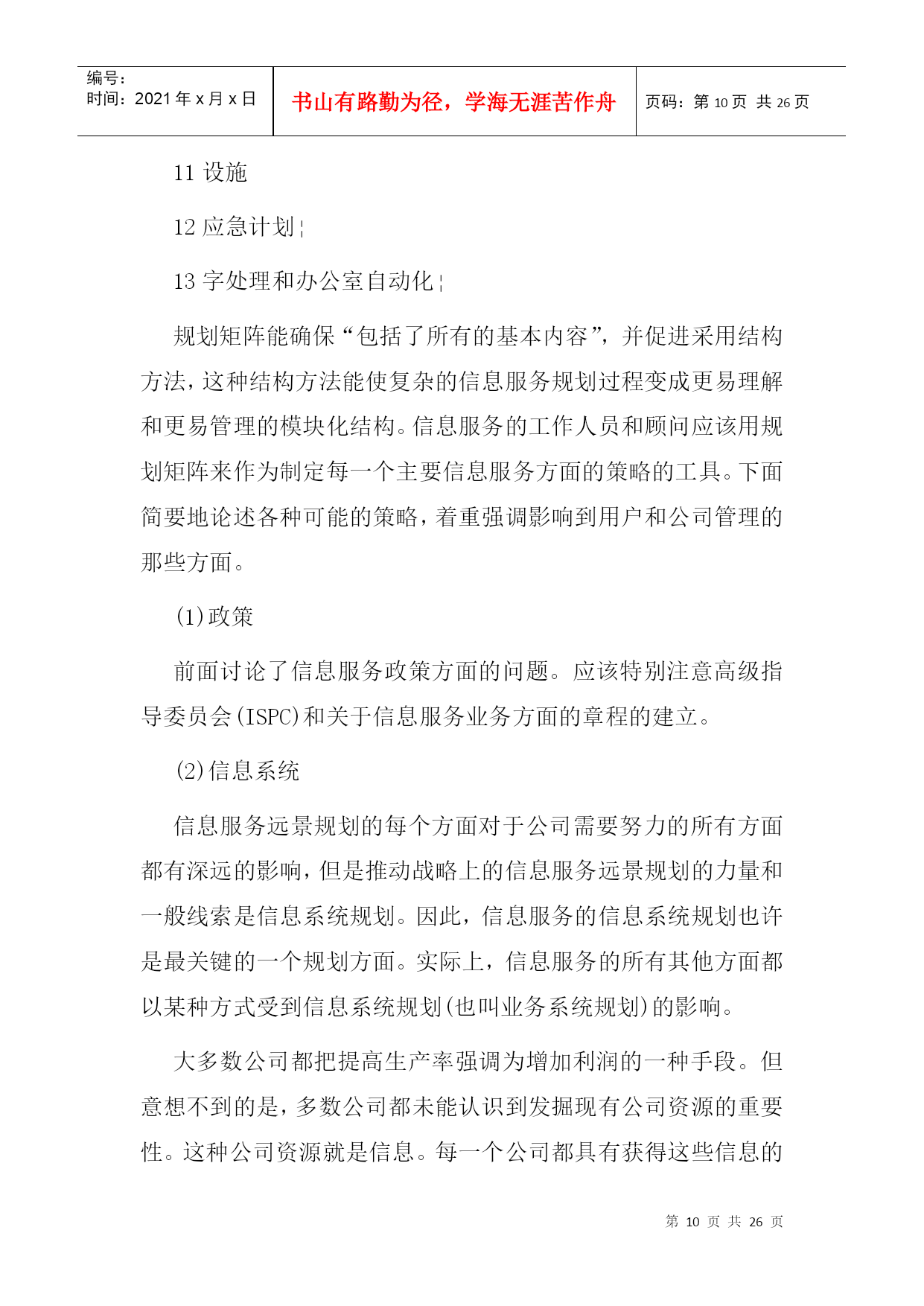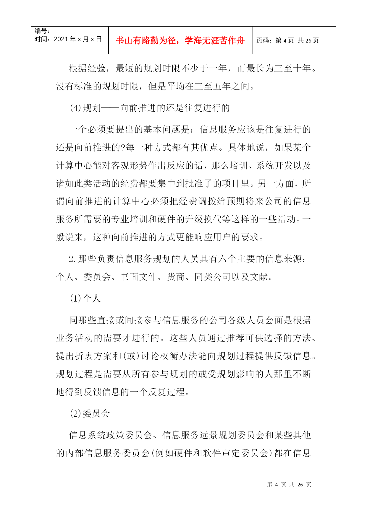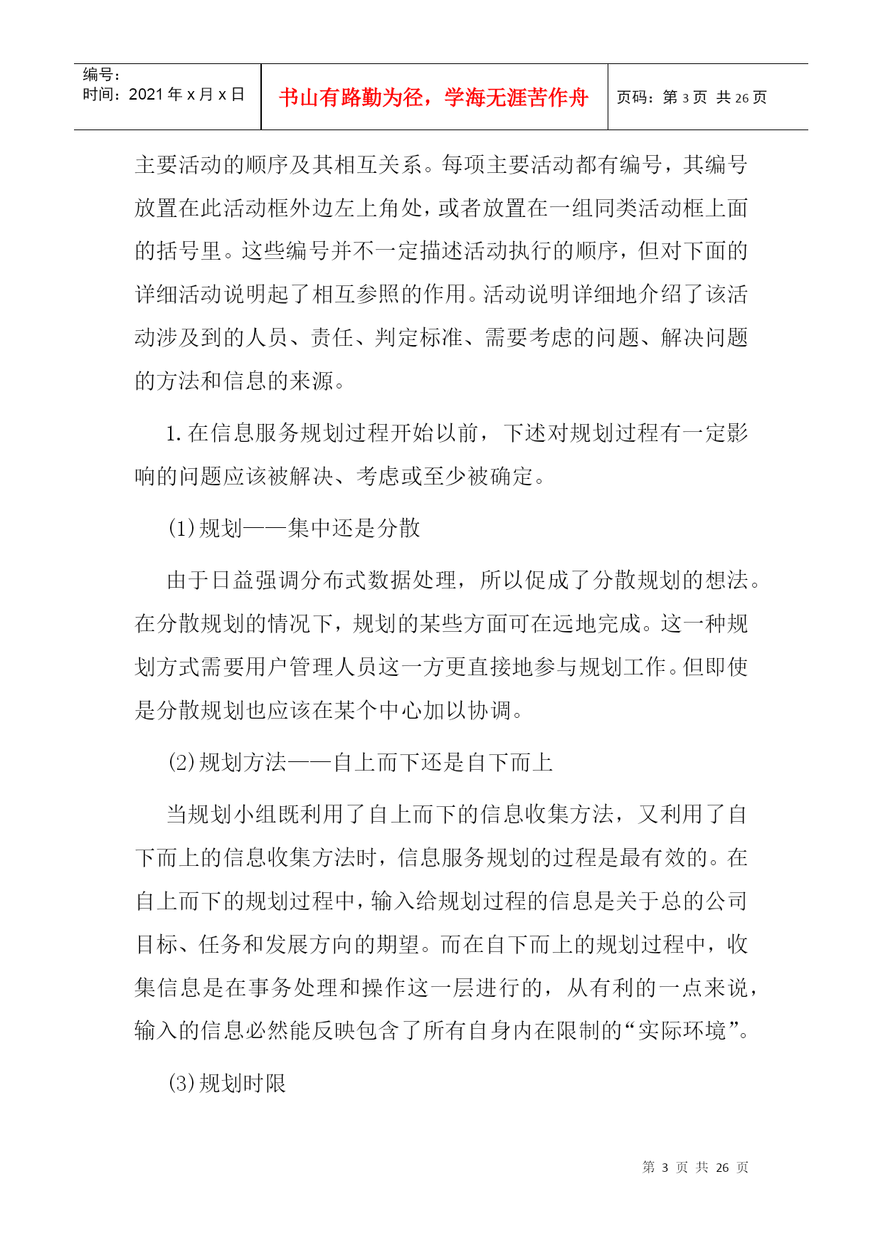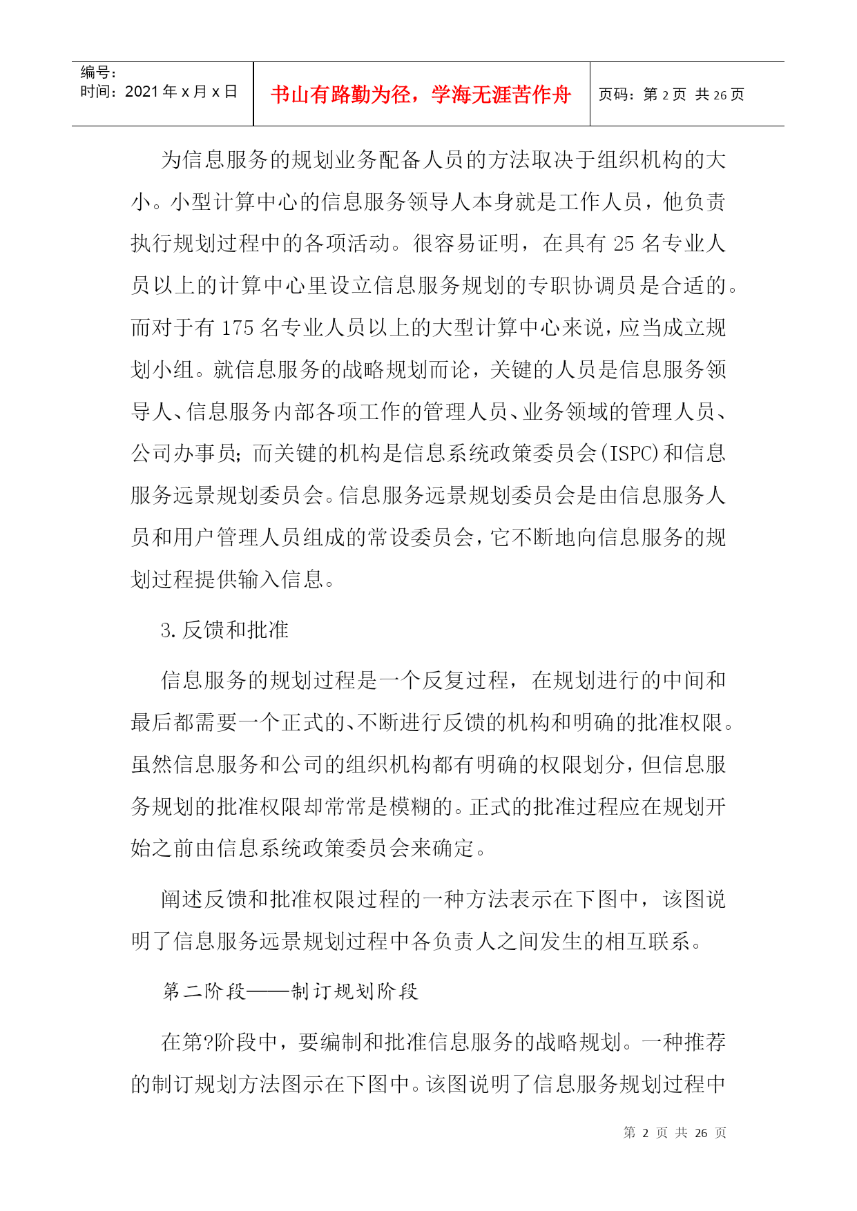 编号:时间:2021年x月x日书山有路勤为径,学海无涯苦作舟页码:第PAGE26页共NUMPAGES26页第PAGE\*MERGEFORMAT26页共NUMPAGES\*MERGEFORMAT26页二、信息服务规划阶段本章概述信息服务远景规划的一种方法,着重强调需要由用户管理人员参与规划过程的那些方面。信息服务远景规划的方法学按三个阶段来加以论述:第一阶段——准备阶段;第二阶段——制订规划阶段;第三阶段——执行和维护阶段。第一阶段——准备阶段在着手进行信息服务远景规划所包含的那些活动之前,必须做一定的准备工作。这些准备工作涉及到态度、方案、机构、训练和熟悉情况等方面。忽略了任一方面都会给信息服务远景规划的制订工作带来不必要的困难。1.认识和支持负责信息服务远景规划的人员一定要审定用户、信息服务人员和公司管理人员是否都了解并接受了这样的观点,即信息服务规划对于达到公司的目标来说是至关重要的。一项信息服务远景规划工程必须需要整个公司全体人员的大力支持。如果管理人员和行政首脑不完全了解信息服务规划的业务范围,那么,负责人(通常是信息系统政策委员会)就应该提供必要的信息,使他们增加对信息服务规划的了解。只有完全认识信息服务远景规划的价值,才能促使全面的合作。2.信息服务规划的筹备为信息服务的规划业务配备人员的方法取决于组织机构的大小。小型计算中心的信息服务领导人本身就是工作人员,他负责执行规划过程中的各项活动。很容易证明,在具有25名专业人员以上的计算中心里设立信息服务规划的专职协调员是合适的。而对于有175名专业人员以上的大型计算中心来说,应当成立规划小组。就信息服务的战略规划而论,关键的人员是信息服务领导人、信息服务内部各项工作的管理人员、业务领域的管理人员、公司办事员;而关键的机构是信息系统政策委员会(ISPC)和信息服务远景规划委员会。信息服务远景规划委员会是由信息服务人员和用户管理人员组成的常设委员会,它不断地向信息服务的规划过程提供输入信息。3.反馈和批准信息服务的规划过程是一个反复过程,在规划进行的中间和最后都需要一个正式的、不断进行反馈的机构和明确的批准权限。虽然信息服务和公司的组织机构都有明确的权限划分,但信息服务规划的批准权限却常常是模糊的。正式的批准过程应在规划开始之前由信息系统政策委员会来确定。阐述反馈和批准权限过程的一种方法表示在下图中,该图说明了信息服务远景规划过程中各负责人之间发生的相互联系。第二阶段——制订规划阶段在第?阶段中,要编制和批准信息服务的战略规划。一种推荐的制订规划方法图示在下图中。该图说明了信息服务规划过程中主要活动的顺序及其相互关系。每项主要活动都有编号,其编号放置在此活动框外边左上角处,或者放置在一组同类活动框上面的括号里。这些编号并不一定描述活动执行的顺序,但对下面的详细活动说明起了相互参照的作用。活动说明详细地介绍了该活动涉及到的人员、责任、判定标准、需要考虑的问题、解决问题的方法和信息的来源。1.在信息服务规划过程开始以前,下述对规划过程有一定影响的问题应该被解决、考虑或至少被确定。(1)规划——集中还是分散由于日益强调分布式数据处理,所以促成了分散规划的想法。在分散规划的情况下,规划的某些方面可在远地完成。这一种规划方式需要用户管理人员这一方更直接地参与规划工作。但即使是分散规划也应该在某个中心加以协调。(2)规划方法——自上而下还是自下而上当规划小组既利用了自上而下的信息收集方法,又利用了自下而上的信息收集方法时,信息服务规划的过程是最有效的。在自上而下的规划过程中,输入给规划过程的信息是关于总的公司目标、任务和发展方向的期望。而在自下而上的规划过程中,收集信息是在事务处理和操作这一层进行的,从有利的一点来说,输入的信息必然能反映包含了所有自身内在限制的“实际环境”。(3)规划时限根据经验,最短的规划时限不少于一年,而最长为三至十年。没有标准的规划时限,但是平均在三至五年之间。(4)规划——向前推进的还是往复进行的一个必须要提出的基本问题是:信息服务应该是往复进行的还是向前推进的?每一种方式都有其优点。具体地说,如果某个计算中心能对客观形势作出反应的话,那么培训、系统开发以及诸如此类活动的经费都要集中到批准了的项目里。另一方面,所谓向前推进的计算中心必须把经费调拨给预期将来公司的信息服务所需要的专业培训和硬件的升级换代等这样的一些活动。一般说来,这种向前推进的方式更能响应用户的要求。2.那些负责信息服务规划的人员具有六个主要的信息来源:个人、委员会、书面文件、货商、同类公司以及文献。(1)个人同那些直接或间接参与信息服务的公司各级人员会面是根据业务活动的需要才进行的。这些人员通过