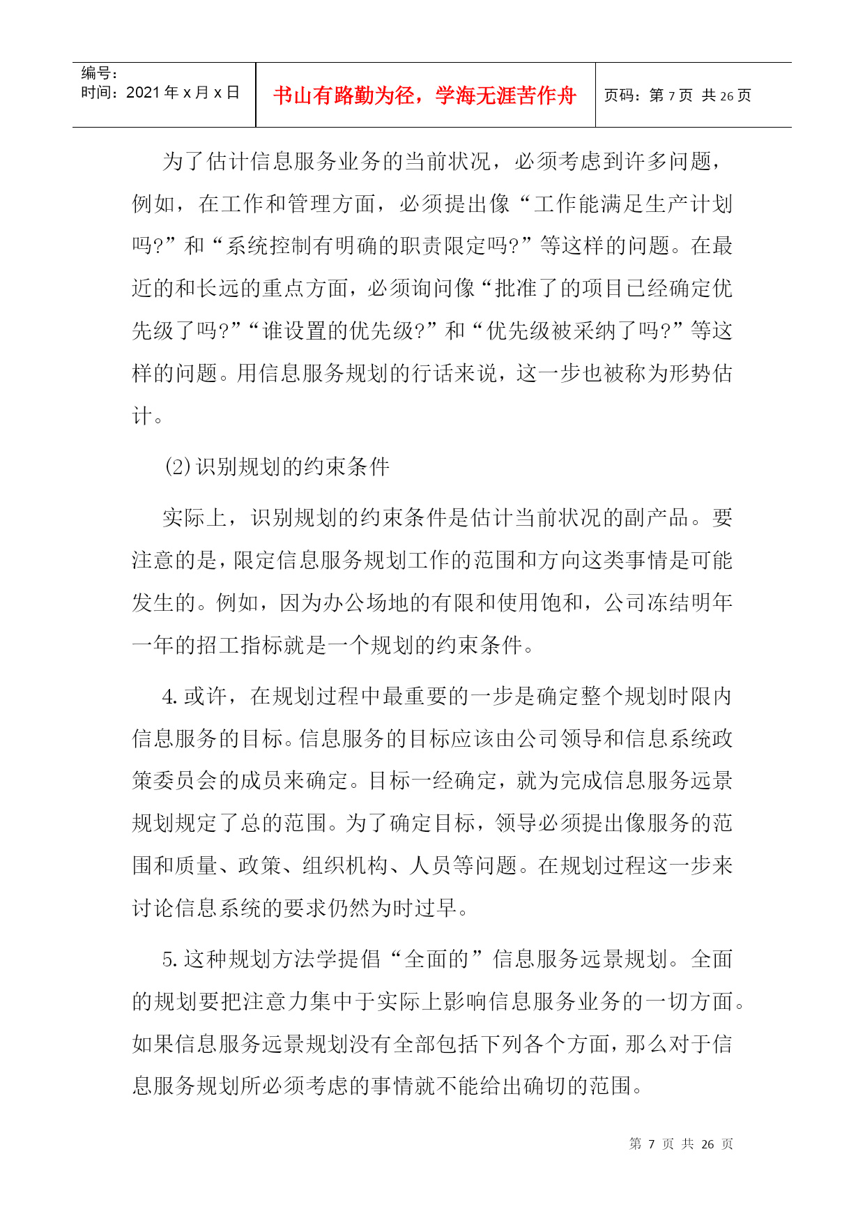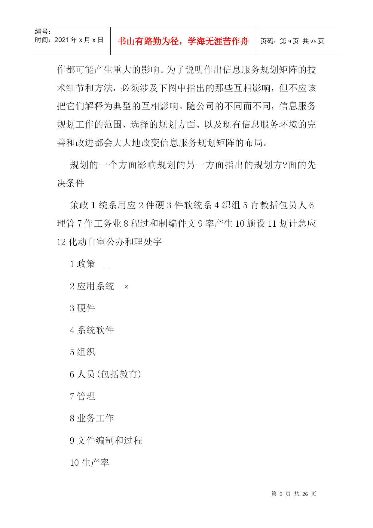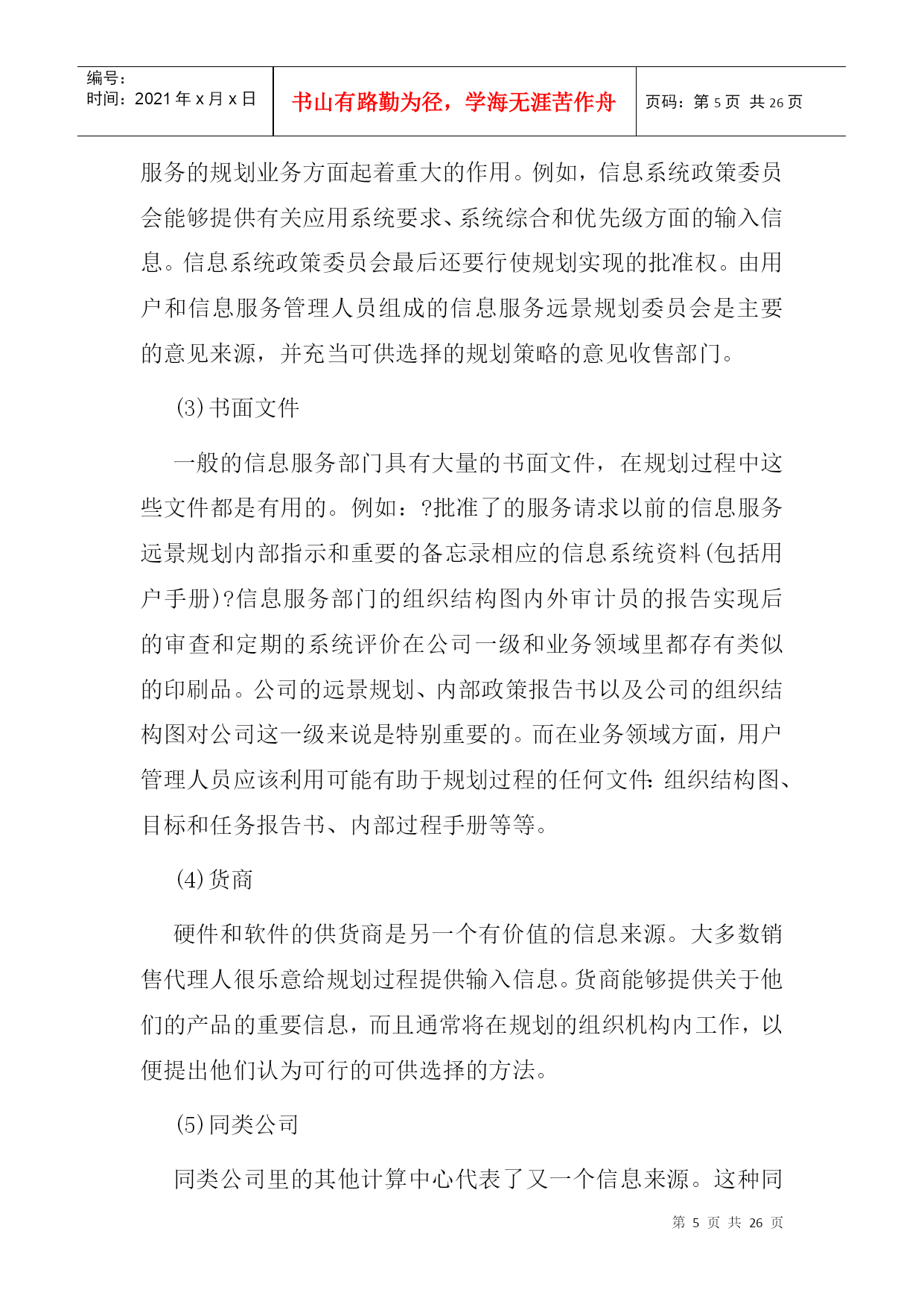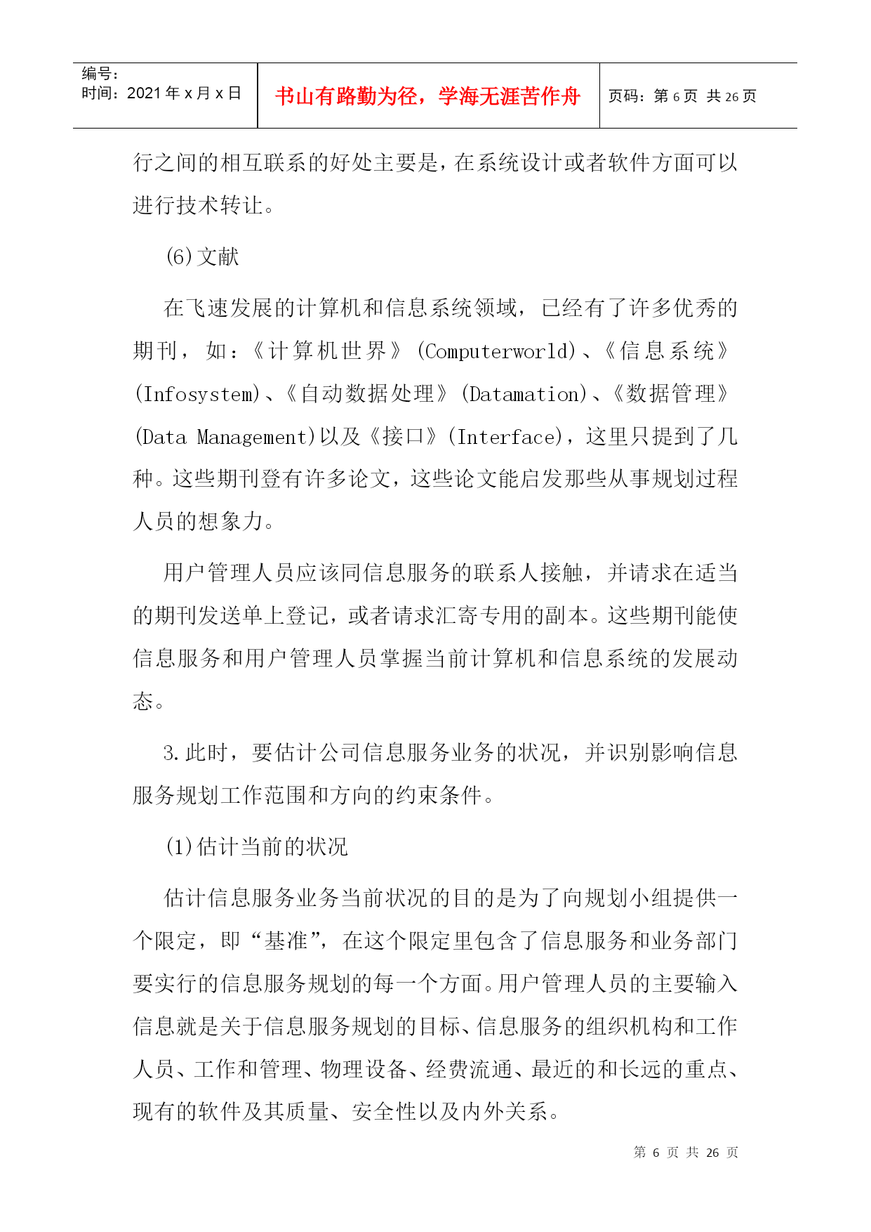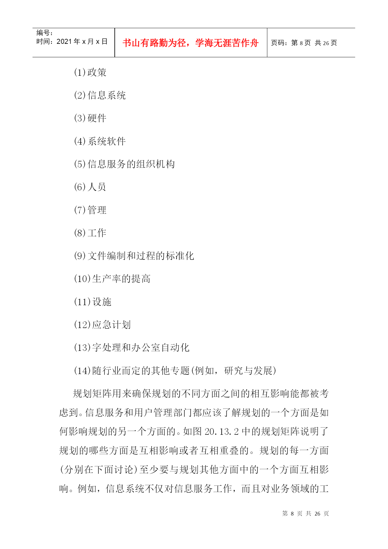 编号:时间:2021年x月x日书山有路勤为径,学海无涯苦作舟页码:第PAGE26页共NUMPAGES26页第PAGE\*MERGEFORMAT26页共NUMPAGES\*MERGEFORMAT26页二、信息服务规划阶段本章概述信息服务远景规划的一种方法,着重强调需要由用户管理人员参与规划过程的那些方面。信息服务远景规划的方法学按三个阶段来加以论述:第一阶段——准备阶段;第二阶段——制订规划阶段;第三阶段——执行和维护阶段。第一阶段——准备阶段在着手进行信息服务远景规划所包含的那些活动之前,必须做一定的准备工作。这些准备工作涉及到态度、方案、机构、训练和熟悉情况等方面。忽略了任一方面都会给信息服务远景规划的制订工作带来不必要的困难。1.认识和支持负责信息服务远景规划的人员一定要审定用户、信息服务人员和公司管理人员是否都了解并接受了这样的观点,即信息服务规划对于达到公司的目标来说是至关重要的。一项信息服务远景规划工程必须需要整个公司全体人员的大力支持。如果管理人员和行政首脑不完全了解信息服务规划的业务范围,那么,负责人(通常是信息系统政策委员会)就应该提供必要的信息,使他们增加对信息服务规划的了解。只有完全认识信息服务远景规划的价值,才能促使全面的合作。2.信息服务规划的筹备为信息服务的规划业务配备人员的方法取决于组织机构的大小。小型计算中心的信息服务领导人本身就是工作人员,他负责执行规划过程中的各项活动。很容易证明,在具有25名专业人员以上的计算中心里设立信息服务规划的专职协调员是合适的。而对于有175名专业人员以上的大型计算中心来说,应当成立规划小组。就信息服务的战略规划而论,关键的人员是信息服务领导人、信息服务内部各项工作的管理人员、业务领域的管理人员、公司办事员;而关键的机构是信息系统政策委员会(ISPC)和信息服务远景规划委员会。信息服务远景规划委员会是由信息服务人员和用户管理人员组成的常设委员会,它不断地向信息服务的规划过程提供输入信息。3.反馈和批准信息服务的规划过程是一个反复过程,在规划进行的中间和最后都需要一个正式的、不断进行反馈的机构和明确的批准权限。虽然信息服务和公司的组织机构都有明确的权限划分,但信息服务规划的批准权限却常常是模糊的。正式的批准过程应在规划开始之前由信息系统政策委员会来确定。阐述反馈和批准权限过程的一种方法表示在下图中,该图说明了信息服务远景规划过程中各负责人之间发生的相互联系。第二阶段——制订规划阶段在第?阶段中,要编制和批准信息服务的战略规划。一种推荐的制订规划方法图示在下图中。该图说明了信息服务规划过程中主要活动的顺序及其相互关系。每项主要活动都有编号,其编号放置在此活动框外边左上角处,或者放置在一组同类活动框上面的括号里。这些编号并不一定描述活动执行的顺序,但对下面的详细活动说明起了相互参照的作用。活动说明详细地介绍了该活动涉及到的人员、责任、判定标准、需要考虑的问题、解决问题的方法和信息的来源。1.在信息服务规划过程开始以前,下述对规划过程有一定影响的问题应该被解决、考虑或至少被确定。(1)规划——集中还是分散由于日益强调分布式数据处理,所以促成了分散规划的想法。在分散规划的情况下,规划的某些方面可在远地完成。这一种规划方式需要用户管理人员这一方更直接地参与规划工作。但即使是分散规划也应该在某个中心加以协调。(2)规划方法——自上而下还是自下而上当规划小组既利用了自上而下的信息收集方法,又利用了自下而上的信息收集方法时,信息服务规划的过程是最有效的。在自上而下的规划过程中,输入给规划过程的信息是关于总的公司目标、任务和发展方向的期望。而在自下而上的规划过程中,收集信息是在事务处理和操作这一层进行的,从有利的一点来说,输入的信息必然能反映包含了所有自身内在限制的“实际环境”。(3)规划时限根据经验,最短的规划时限不少于一年,而最长为三至十年。没有标准的规划时限,但是平均在三至五年之间。(4)规划——向前推进的还是往复进行的一个必须要提出的基本问题是:信息服务应该是往复进行的还是向前推进的?每一种方式都有其优点。具体地说,如果某个计算中心能对客观形势作出反应的话,那么培训、系统开发以及诸如此类活动的经费都要集中到批准了的项目里。另一方面,所谓向前推进的计算中心必须把经费调拨给预期将来公司的信息服务所需要的专业培训和硬件的升级换代等这样的一些活动。一般说来,这种向前推进的方式更能响应用户的要求。2.那些负责信息服务规划的人员具有六个主要的信息来源:个人、委员会、书面文件、货商、同类公司以及文献。(1)个人同那些直接或间接参与信息服务的公司各级人员会面是根据业务活动的需要才进行的。这些人员通过