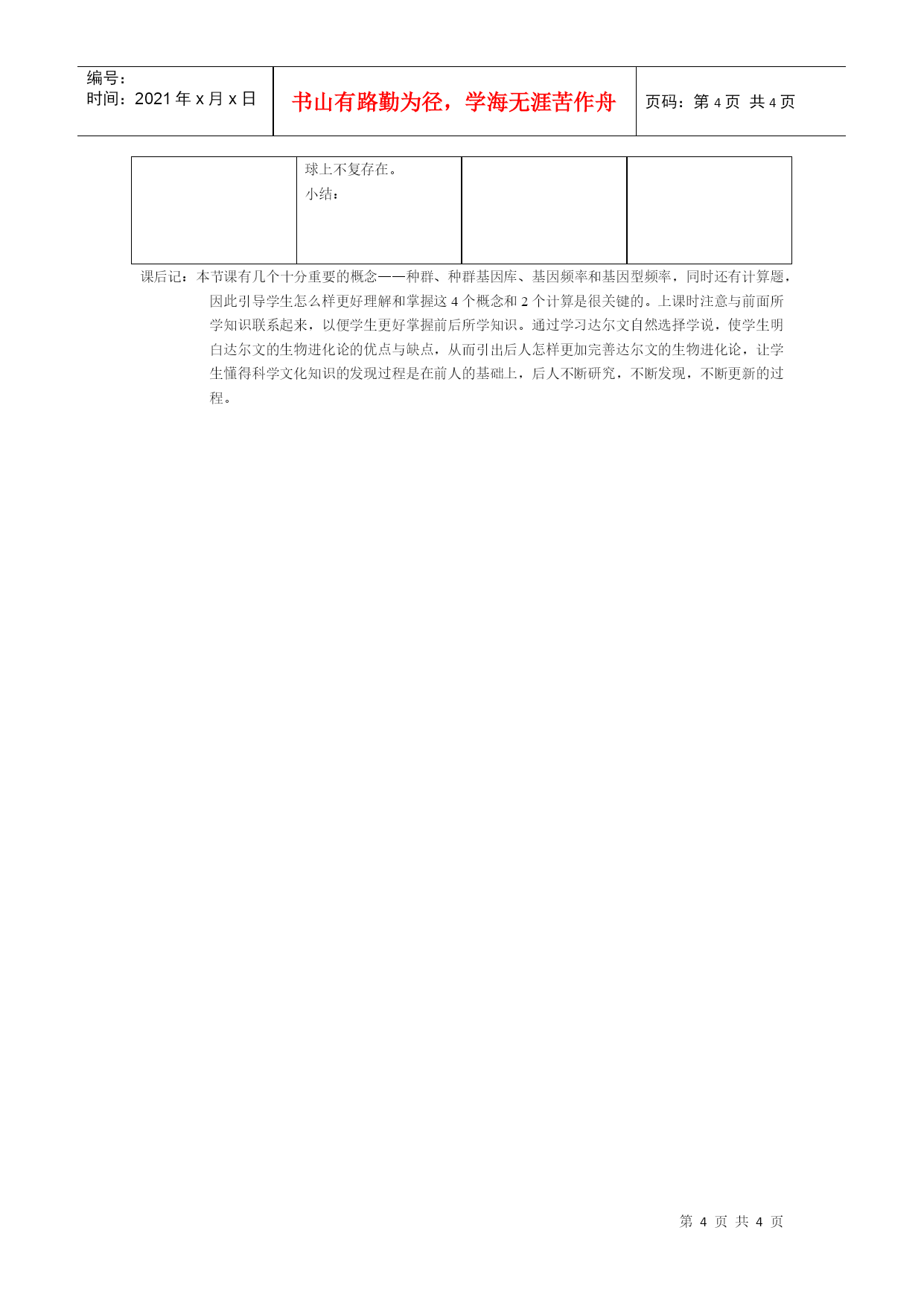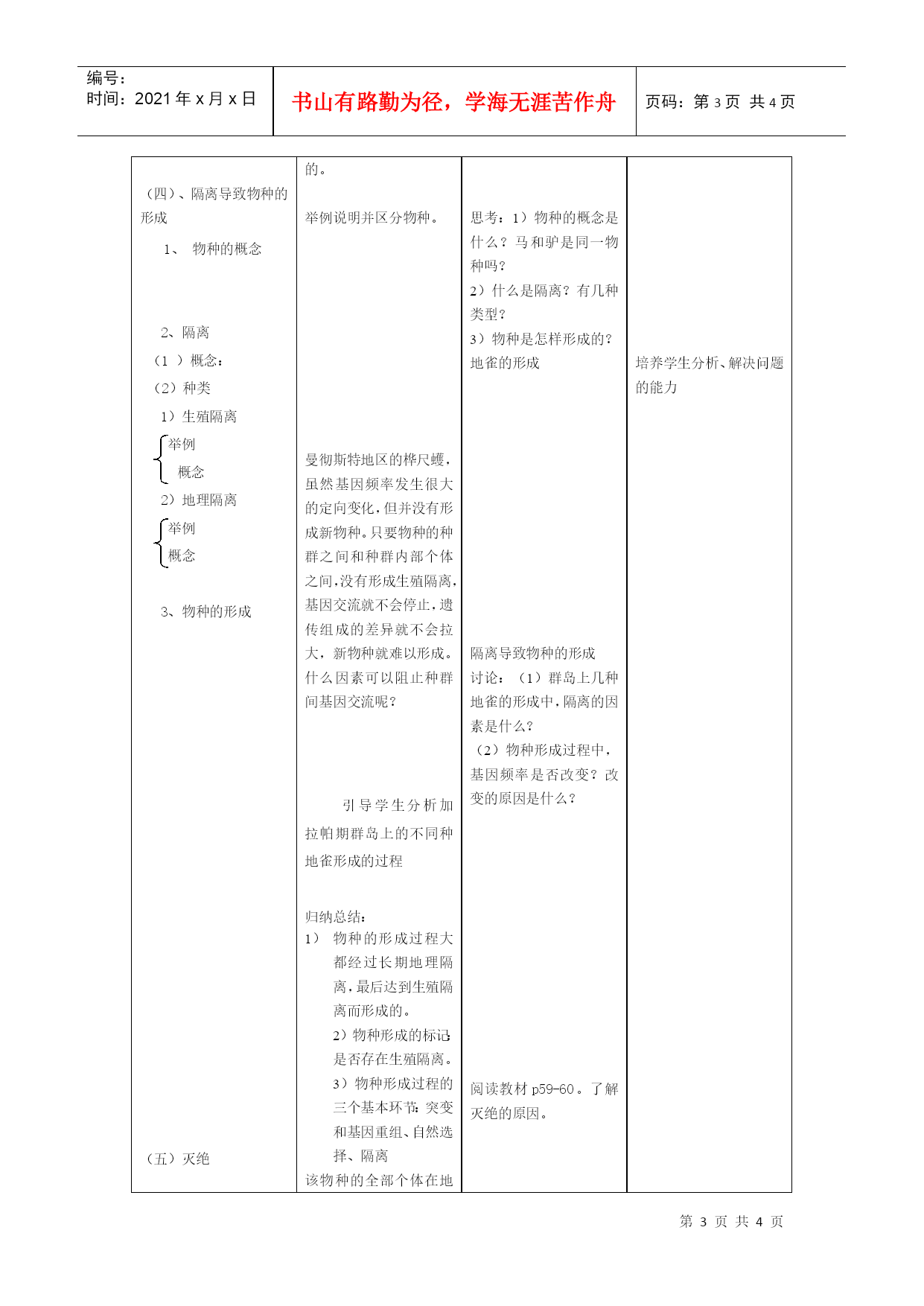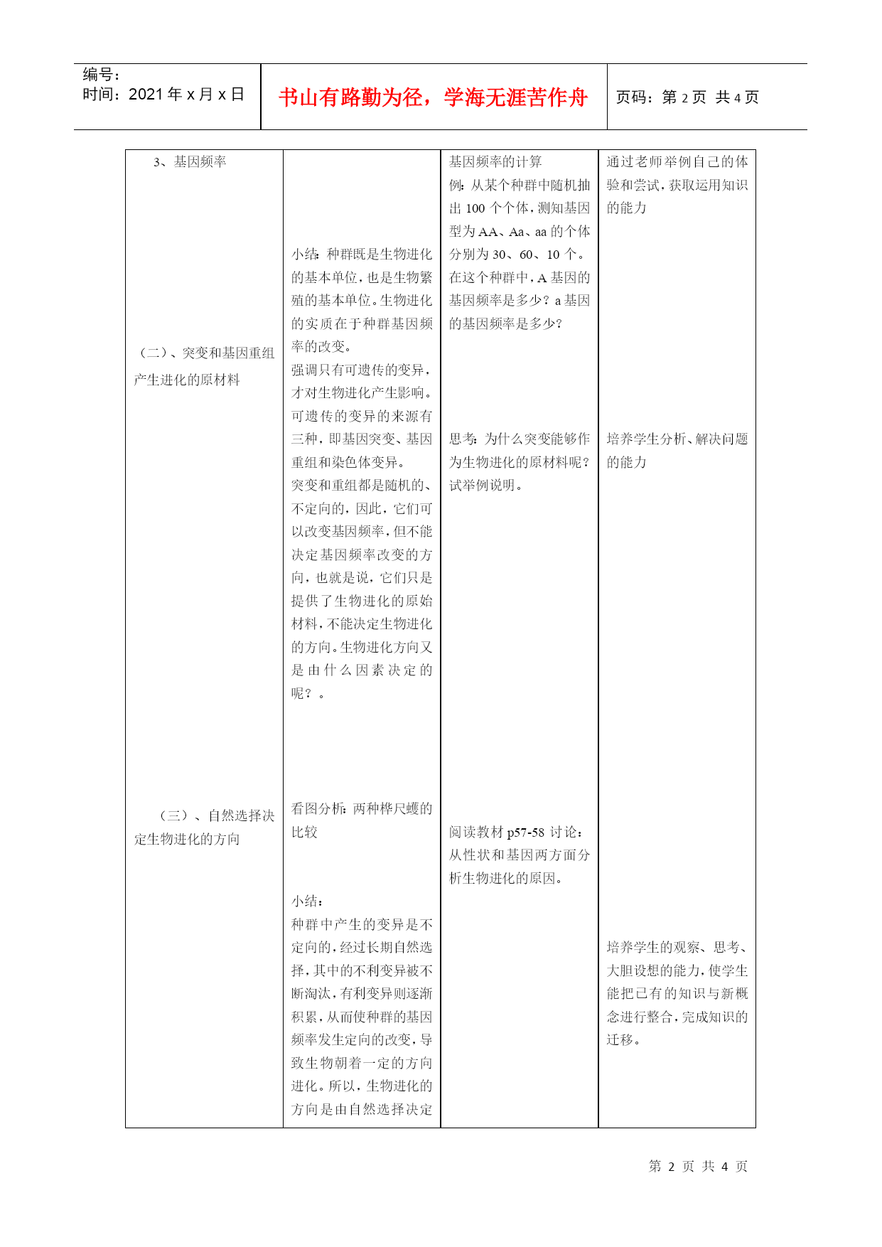 编号:时间:2021年x月x日书山有路勤为径,学海无涯苦作舟页码:第PAGE4页共NUMPAGES4页第PAGE\*MERGEFORMAT4页共NUMPAGES\*MERGEFORMAT4页现代生物进化理论侯伟教学目标知识与技能:1.解释种群、种群基因库、基因频率等概念以及基因频率的计算方法。2.突变和基因重组为生物进化提供原材料的原因。3.自然选择在生物进化中的作用4.隔离的概念和类型,以及隔离与物种形成的关系5.形成生物进化的观点,养成用科学的进化观点解释生物进化历程。过程与方法:启发、探讨、让学生总结以及师生共同总结并结合课件教学情感、态度与价值观:通过教学过程培养学生的思维能力、归纳总结能力。教学重点1.基因频率的概念2.自然选择在生物进化过程中的作用3.隔离的概念和类型,以及物种形成的方式教学难点:1.基因频率的概念和计算方法2.自然选择学说在生物进化过程中的作用教具准备:1.英国曼彻斯特地区18世纪中期到20世纪中期浅色型和黑色型桦尺蠖数量变化的CAI课件。2.加拉帕克斯岛地雀演化的CAI课件。教学过程:教学内容教师活动学生活动备注一、现代生物进化理论简介(一)种群是生物进化的基本单位1、种群的概念2、基因库3、基因频率(二)、突变和基因重组产生进化的原材料(三)、自然选择决定生物进化的方向(四)、隔离导致物种的形成物种的概念2、隔离(1)概念:(2)种类1)生殖隔离举例概念2)地理隔离举例概念3、物种的形成(五)灭绝引入复习达尔文的自然选择学说的主要内容,接着进一步阐述这个学说的重要意义和局限性,并且指出近些年来,生物学家将遗传学、生态学等研究成果引入到进化论的研究中,形成了以自然选择学说为基础的现代生物进化理论。思考:1、什么是种群?问:下列属于种群的是:①一个池塘的全部鲤鱼②一个池塘中的全部鱼③一片草地上的全部植物④一片草地上全部蒲公英2、什么是基因库?3、什么是基因频率?举例计算小结:种群既是生物进化的基本单位,也是生物繁殖的基本单位。生物进化的实质在于种群基因频率的改变。强调只有可遗传的变异,才对生物进化产生影响。可遗传的变异的来源有三种,即基因突变、基因重组和染色体变异。突变和重组都是随机的、不定向的,因此,它们可以改变基因频率,但不能决定基因频率改变的方向,也就是说,它们只是提供了生物进化的原始材料,不能决定生物进化的方向。生物进化方向又是由什么因素决定的呢?。看图分析:两种桦尺蠖的比较小结:种群中产生的变异是不定向的,经过长期自然选择,其中的不利变异被不断淘汰,有利变异则逐渐积累,从而使种群的基因频率发生定向的改变,导致生物朝着一定的方向进化。所以,生物进化的方向是由自然选择决定的。举例说明并区分物种。曼彻斯特地区的桦尺蠖,虽然基因频率发生很大的定向变化,但并没有形成新物种。只要物种的种群之间和种群内部个体之间,没有形成生殖隔离,基因交流就不会停止,遗传组成的差异就不会拉大,新物种就难以形成。什么因素可以阻止种群间基因交流呢?引导学生分析加拉帕期群岛上的不同种地雀形成的过程归纳总结:物种的形成过程大都经过长期地理隔离,最后达到生殖隔离而形成的。2)物种形成的标记:是否存在生殖隔离。3)物种形成过程的三个基本环节:突变和基因重组、自然选择、隔离该物种的全部个体在地球上不复存在。小结:阅读教材、思考、讨论、举例说明分析、归纳(1)与(4)属于种群。基因频率的计算例:从某个种群中随机抽出100个个体,测知基因型为AA、Aa、aa的个体分别为30、60、10个。在这个种群中,A基因的基因频率是多少?a基因的基因频率是多少?思考:为什么突变能够作为生物进化的原材料呢?试举例说明。阅读教材p57-58讨论:从性状和基因两方面分析生物进化的原因。思考:1)物种的概念是什么?马和驴是同一物种吗?2)什么是隔离?有几种类型?3)物种是怎样形成的?地雀的形成隔离导致物种的形成讨论:(1)群岛上几种地雀的形成中,隔离的因素是什么?(2)物种形成过程中,基因频率是否改变?改变的原因是什么?阅读教材p59-60。了解灭绝的原因。通过阅读培养学生获取信息,整理、加工信息的能力。通过老师举例自己