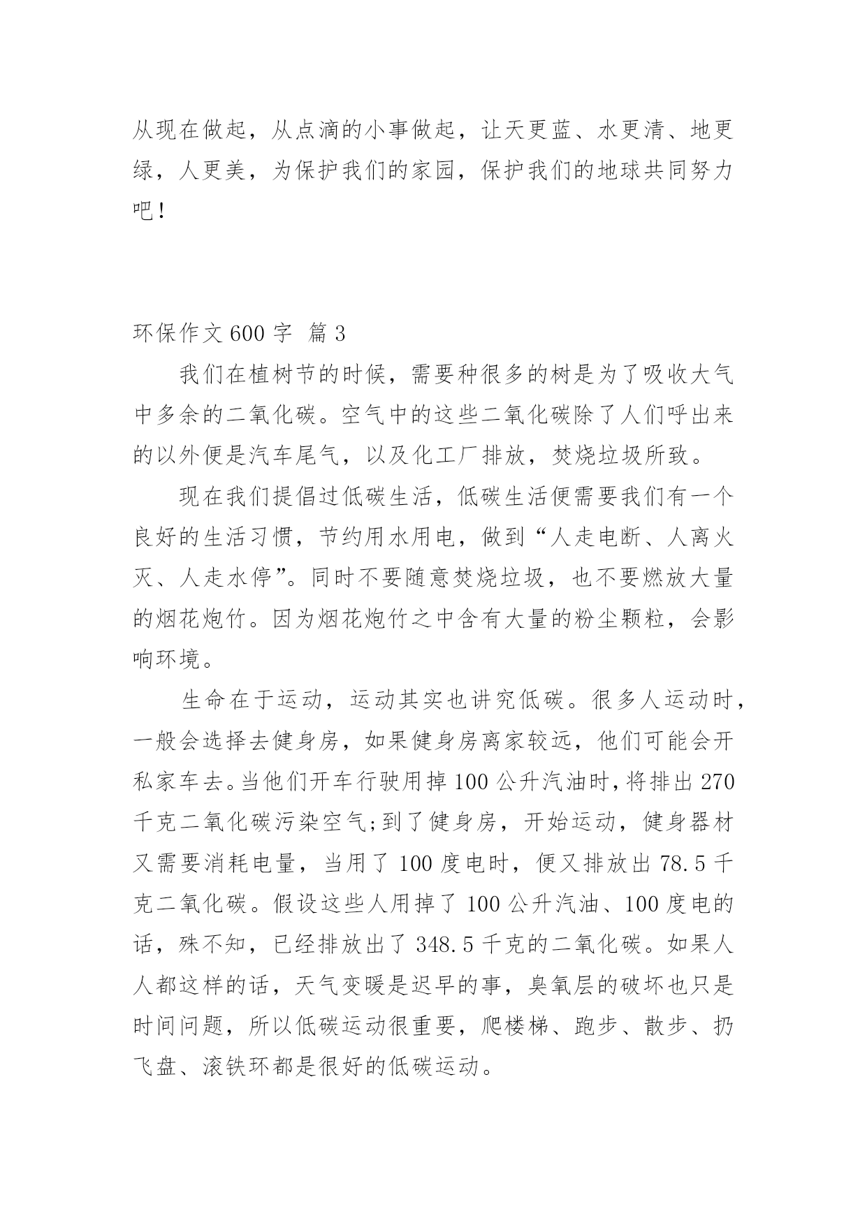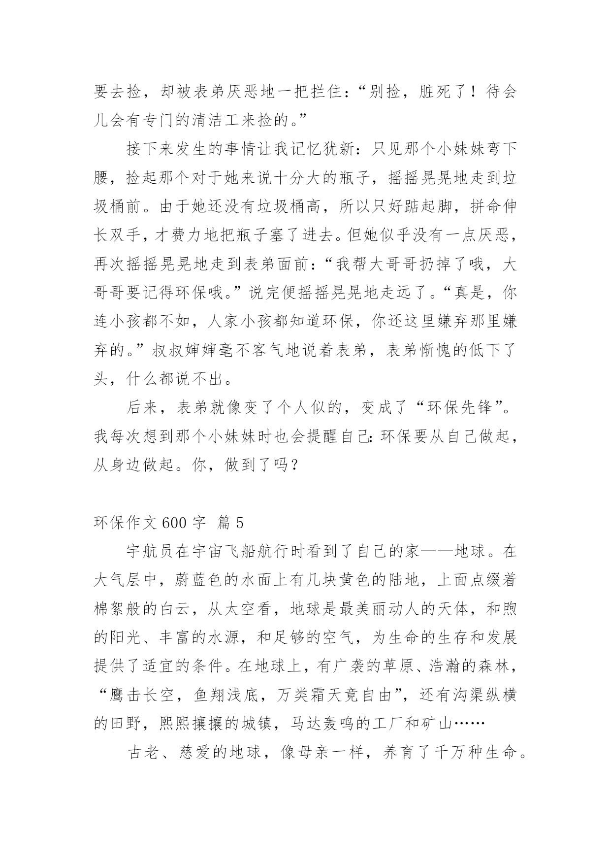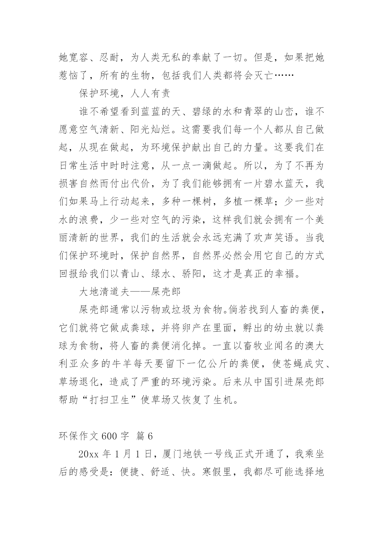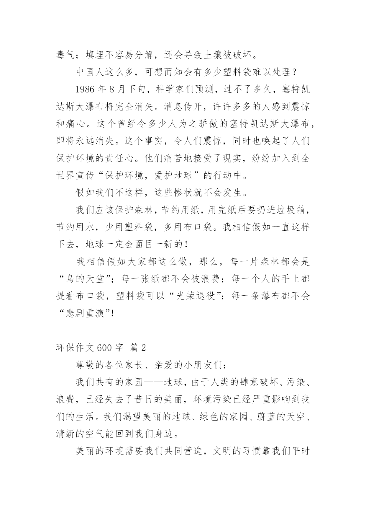环保作文600字精选环保作文600字合集10篇在日复一日的学习、工作或生活中,大家都尝试过写作文吧,作文是通过文字来表达一个主题意义的记叙方法。怎么写作文才能避免踩雷呢?以下是小编精心整理的环保作文600字10篇,欢迎阅读与收藏。环保作文600字篇1地球是人类的母亲,是我们赖以生存的家园。随着生活水平的提高,人类在享受的同时,却在不知不觉中破坏着它,我们的生存环境在不断恶化。森林是氧气的制造工厂,树木拥有绿色,地球才有脉搏。但是人类却一而再再而三的破坏树木,破坏森林。森林已经面目全非了。难道我们还要继续破坏树木,破坏森林吗?在生活里,纸是我们最长用的东西。但是,我们却如此的浪费它——学校里有个小女孩在画画,它才刚刚画就不小心画错了,于是就把还可以打草稿的“纸”变成了“废纸”,并扔进了垃圾箱。大街上有一对情侣在吃快餐,他们用完纸后随手就把垃圾扔在马路上……在超市里;在马路旁;在家里;在地球的大街小巷上……都有一样东西——那就是塑料袋。我们经常在商场购物时,人们手中提着大包小包的塑料袋。塑料袋焚烧会造成毒气;填埋不容易分解,还会导致土壤被破坏。中国人这么多,可想而知会有多少塑料袋难以处理?1986年8月下旬,科学家们预测,过不了多久,塞特凯达斯大瀑布将完全消失。消息传开,许许多多的人感到震惊和痛心。这个曾经令多少人为之骄傲的塞特凯达斯大瀑布,即将永远消失。这个事实,令人们震惊,同时也唤起了人们保护环境的责任心。他们痛苦地接受了现实,纷纷加入到全世界宣传“保护环境,爱护地球”的行动中。假如我们不这样,这些惨状就不会发生。我们应该保护森林,节约用纸,用完纸后要扔进垃圾箱,节约用水,少用塑料袋,多用布口袋。我相信假如一直这样下去,地球一定会面目一新的!我相信假如大家都这么做,那么,每一片森林都会是“鸟的天堂”;每一张纸都不会被浪费;每一个人的手上都提着布口袋,塑料袋可以“光荣退役”;每一条瀑布都不会“悲剧重演”!环保作文600字篇2尊敬的各位家长、亲爱的小朋友们:我们共有的家园——地球,由于人类的肆意破坏、污染、浪费,已经失去了昔日的美丽,环境污染已经严重影响到我们的生活。我们渴望美丽的地球、绿色的家园、蔚蓝的天空、清新的空气能回到我们身边。美丽的环境需要我们共同营造,文明的习惯靠我们平时一点一滴地养成。爱护地球、保护环境,从我做起。我们开展了:爱护花草树木、保护小动物、珍惜水资源、节约用电等丰富多彩的系列专题教育活动中。孩子们知道了各种环保标志、动植物知识,了解了动植物与人类生活的关系、废物回收的有关知识。在树木认养活动中,孩子们懂得了如何保护、爱惜树木。环保小卫士活动,让孩子们成为了环境的主人,增强了自豪感和任务意识。为了让地球更美,让家园更绿,我园向广大家长、小朋友们倡议:1、做一个文明的人,不随地吐痰,不乱扔废弃物,保护绿色环境。2、节约用纸、用水、用电,爱惜粮食、节约使用自然资源,杜绝浪费。3、爱护公物,爱护每一片绿地,做到不穿行、不践踏、不攀折花木。4、不制造影响他人的噪声,维护安宁环境。5、减少空气污染,节约能源,尽量使用公共交通工具、自行车或步行。6、认识“环境标志”,选购绿色产品,少用一次性制品,减少白色污染。7、亲近大自然,与我们的动植物朋友和谐相处。8、积极向家人、亲朋好友宣传环保知识,动员周围的人为环保出一份力。绿色环保家园需要全社会的共同努力。让我们携起手来,从现在做起,从点滴的小事做起,让天更蓝、水更清、地更绿,人更美,为保护我们的家园,保护我们的地球共同努力吧!环保作文600字篇3我们在植树节的时候,需要种很多的树是为了吸收大气中多余的二氧化碳。空气中的这些二氧化碳除了人们呼出来的以外便是汽车尾气,以及化工厂排放,焚烧垃圾所致。现在我们提倡过低碳生活,低碳生活便需要我们有一个良好的生活习惯,节约用水用电,做到“人走电断、人离火灭、人走水停”。同时不要随意焚烧垃圾,也不要燃放大量的烟花炮竹。因为烟花炮竹之中含有大量的粉尘颗粒,会影响环境。生命在于运动,运动其实也讲究低碳。很多人运动时,一般会选择去健身房,如果健身房离家较远,他们可能会开私家车去。当他们开车行驶用掉100公升汽油时,将排出270千克二氧化碳污染空气;到了健身房,开始运动,健身器材又需要消耗电量,当用了100度电时,便又排放出78.5千克二氧化碳。假设这些人用掉了100公升汽油、100度电的话,殊不知,已经排放出了348.5千克的二氧化碳。如果人人都这样的话,天气变暖是迟早的事,臭氧层的破坏也只是时间问题,所以低碳运动很重要,爬楼梯、跑步、散步、扔飞盘、滚铁环都是很好的低碳运动。最近,我迷上了爸爸小时候的宝贝:铁环儿。那天爸爸在外面给我买了一个,我开始还不太会起步,就算起好了步,也总控制不好方向,老是碰墙。爸爸后来告诉了我起步的方法和拐弯的窍