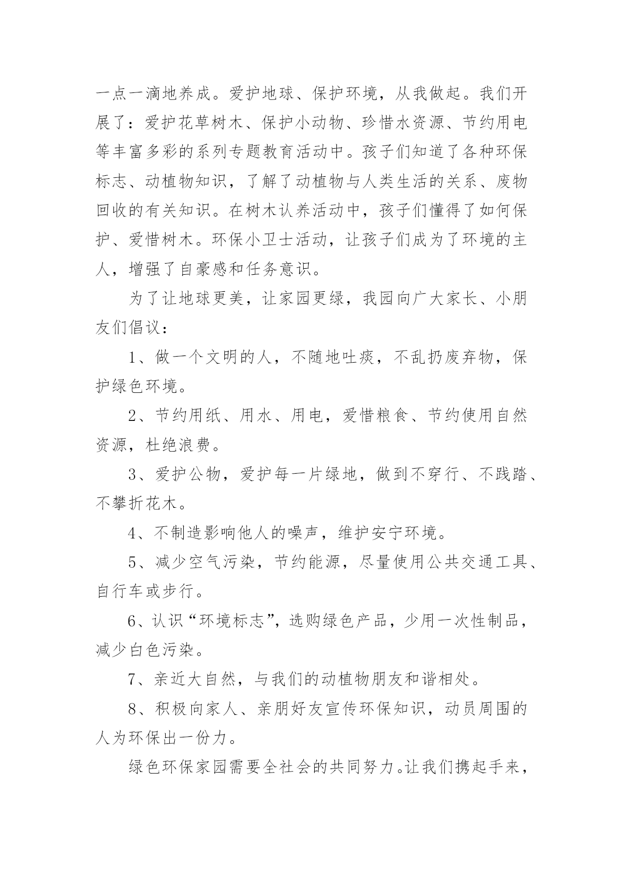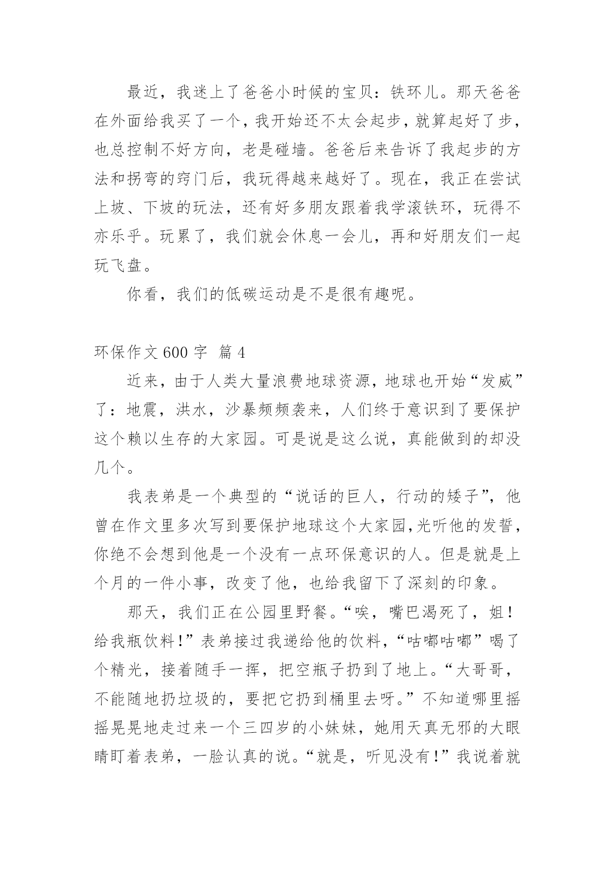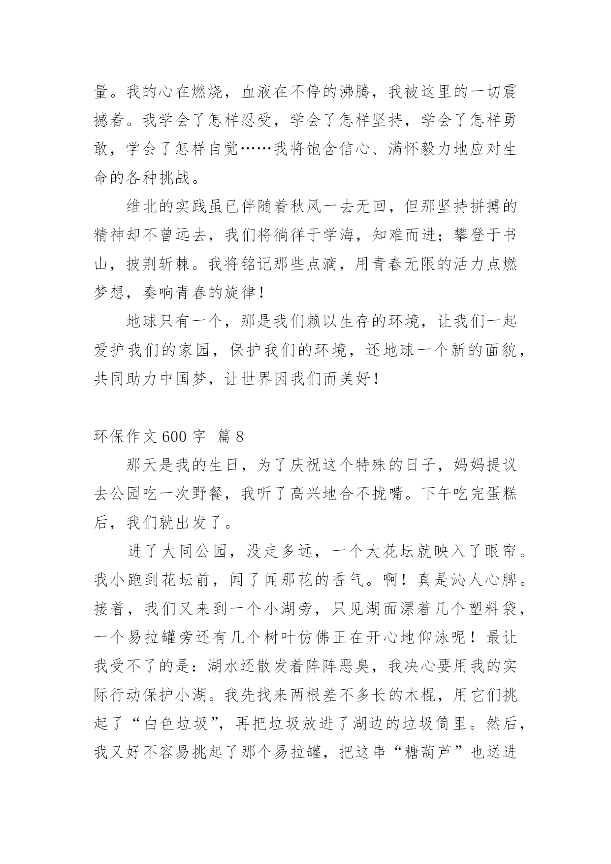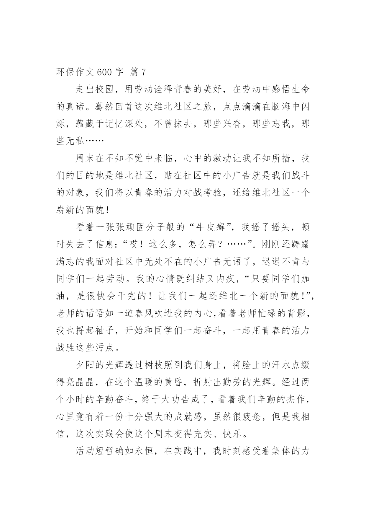 环保作文600字精选环保作文600字合集10篇在日复一日的学习、工作或生活中,大家都尝试过写作文吧,作文是通过文字来表达一个主题意义的记叙方法。怎么写作文才能避免踩雷呢?以下是小编精心整理的环保作文600字10篇,欢迎阅读与收藏。环保作文600字篇1地球是人类的母亲,是我们赖以生存的家园。随着生活水平的提高,人类在享受的同时,却在不知不觉中破坏着它,我们的生存环境在不断恶化。森林是氧气的制造工厂,树木拥有绿色,地球才有脉搏。但是人类却一而再再而三的破坏树木,破坏森林。森林已经面目全非了。难道我们还要继续破坏树木,破坏森林吗?在生活里,纸是我们最长用的东西。但是,我们却如此的浪费它——学校里有个小女孩在画画,它才刚刚画就不小心画错了,于是就把还可以打草稿的“纸”变成了“废纸”,并扔进了垃圾箱。大街上有一对情侣在吃快餐,他们用完纸后随手就把垃圾扔在马路上……在超市里;在马路旁;在家里;在地球的大街小巷上……都有一样东西——那就是塑料袋。我们经常在商场购物时,人们手中提着大包小包的塑料袋。塑料袋焚烧会造成毒气;填埋不容易分解,还会导致土壤被破坏。中国人这么多,可想而知会有多少塑料袋难以处理?1986年8月下旬,科学家们预测,过不了多久,塞特凯达斯大瀑布将完全消失。消息传开,许许多多的人感到震惊和痛心。这个曾经令多少人为之骄傲的塞特凯达斯大瀑布,即将永远消失。这个事实,令人们震惊,同时也唤起了人们保护环境的责任心。他们痛苦地接受了现实,纷纷加入到全世界宣传“保护环境,爱护地球”的行动中。假如我们不这样,这些惨状就不会发生。我们应该保护森林,节约用纸,用完纸后要扔进垃圾箱,节约用水,少用塑料袋,多用布口袋。我相信假如一直这样下去,地球一定会面目一新的!我相信假如大家都这么做,那么,每一片森林都会是“鸟的天堂”;每一张纸都不会被浪费;每一个人的手上都提着布口袋,塑料袋可以“光荣退役”;每一条瀑布都不会“悲剧重演”!环保作文600字篇2尊敬的各位家长、亲爱的小朋友们:我们共有的家园——地球,由于人类的肆意破坏、污染、浪费,已经失去了昔日的美丽,环境污染已经严重影响到我们的生活。我们渴望美丽的地球、绿色的家园、蔚蓝的天空、清新的空气能回到我们身边。美丽的环境需要我们共同营造,文明的习惯靠我们平时一点一滴地养成。爱护地球、保护环境,从我做起。我们开展了:爱护花草树木、保护小动物、珍惜水资源、节约用电等丰富多彩的系列专题教育活动中。孩子们知道了各种环保标志、动植物知识,了解了动植物与人类生活的关系、废物回收的有关知识。在树木认养活动中,孩子们懂得了如何保护、爱惜树木。环保小卫士活动,让孩子们成为了环境的主人,增强了自豪感和任务意识。为了让地球更美,让家园更绿,我园向广大家长、小朋友们倡议:1、做一个文明的人,不随地吐痰,不乱扔废弃物,保护绿色环境。2、节约用纸、用水、用电,爱惜粮食、节约使用自然资源,杜绝浪费。3、爱护公物,爱护每一片绿地,做到不穿行、不践踏、不攀折花木。4、不制造影响他人的噪声,维护安宁环境。5、减少空气污染,节约能源,尽量使用公共交通工具、自行车或步行。6、认识“环境标志”,选购绿色产品,少用一次性制品,减少白色污染。7、亲近大自然,与我们的动植物朋友和谐相处。8、积极向家人、亲朋好友宣传环保知识,动员周围的人为环保出一份力。绿色环保家园需要全社会的共同努力。让我们携起手来,从现在做起,从点滴的小事做起,让天更蓝、水更清、地更绿,人更美,为保护我们的家园,保护我们的地球共同努力吧!环保作文600字篇3我们在植树节的时候,需要种很多的树是为了吸收大气中多余的二氧化碳。空气中的这些二氧化碳除了人们呼出来的以外便是汽车尾气,以及化工厂排放,焚烧垃圾所致。现在我们提倡过低碳生活,低碳生活便需要我们有一个良好的生活习惯,节约用水用电,做到“人走电断、人离火灭、人走水停”。同时不要随意焚烧垃圾,也不要燃放大量的烟花炮竹。因为烟花炮竹之中含有大量的粉尘颗粒,会影响环境。生命在于运动,运动其实也讲究低碳。很多人运动时,一般会选择去健身房,如果健身房离家较远,他们可能会开私家车去。当他们开车行驶用掉100公升汽油时,将排出270千克二氧化碳污染空气;到了健身房,开始运动,健身器材又需要消耗电量,当用了100度电时,便又排放出78.5千克二氧化碳。假设这些人用掉了100公升汽油、100度电的话,殊不知,已经排放出了348.5千克的二氧化碳。如果人人都这样的话,天气变暖是迟早的事,臭氧层的破坏也只是时间问题,所以低碳运动很重要,爬楼梯、跑步、散步、扔飞盘、滚铁环都是很好的低碳运动。最近,我迷上了爸爸小时候的宝贝:铁环儿。那天爸爸在外面给我买了一个,我开始还不太会起步,就算起好了步,也总控制不好方向,老是碰墙。爸爸后来告诉了我起步的方法和拐弯的窍
