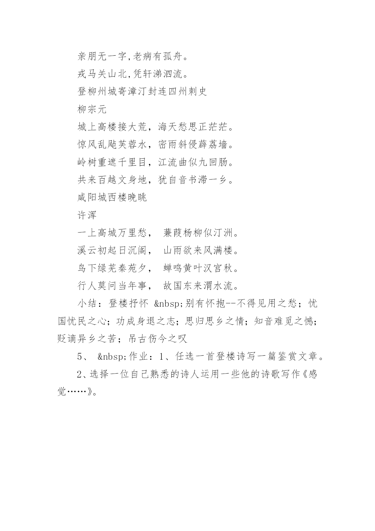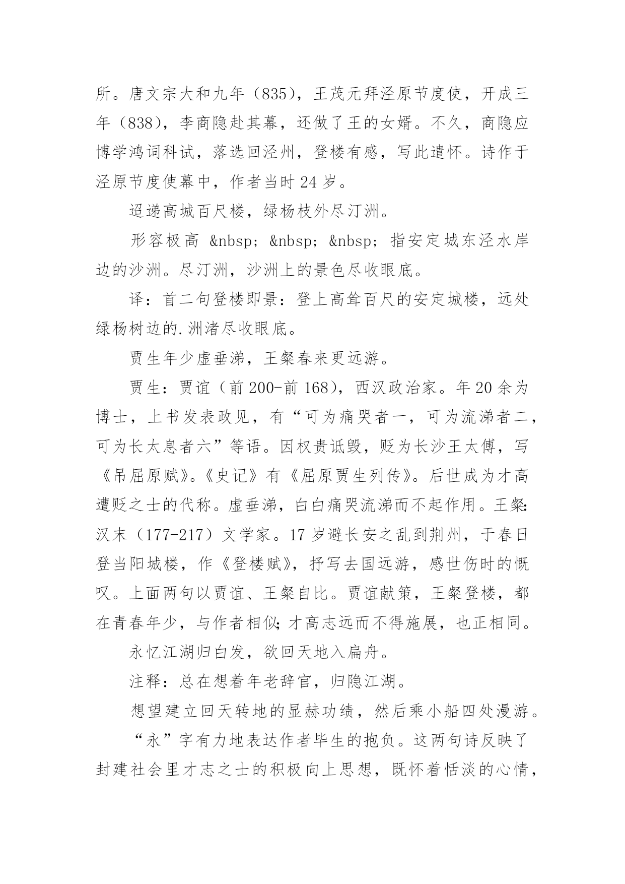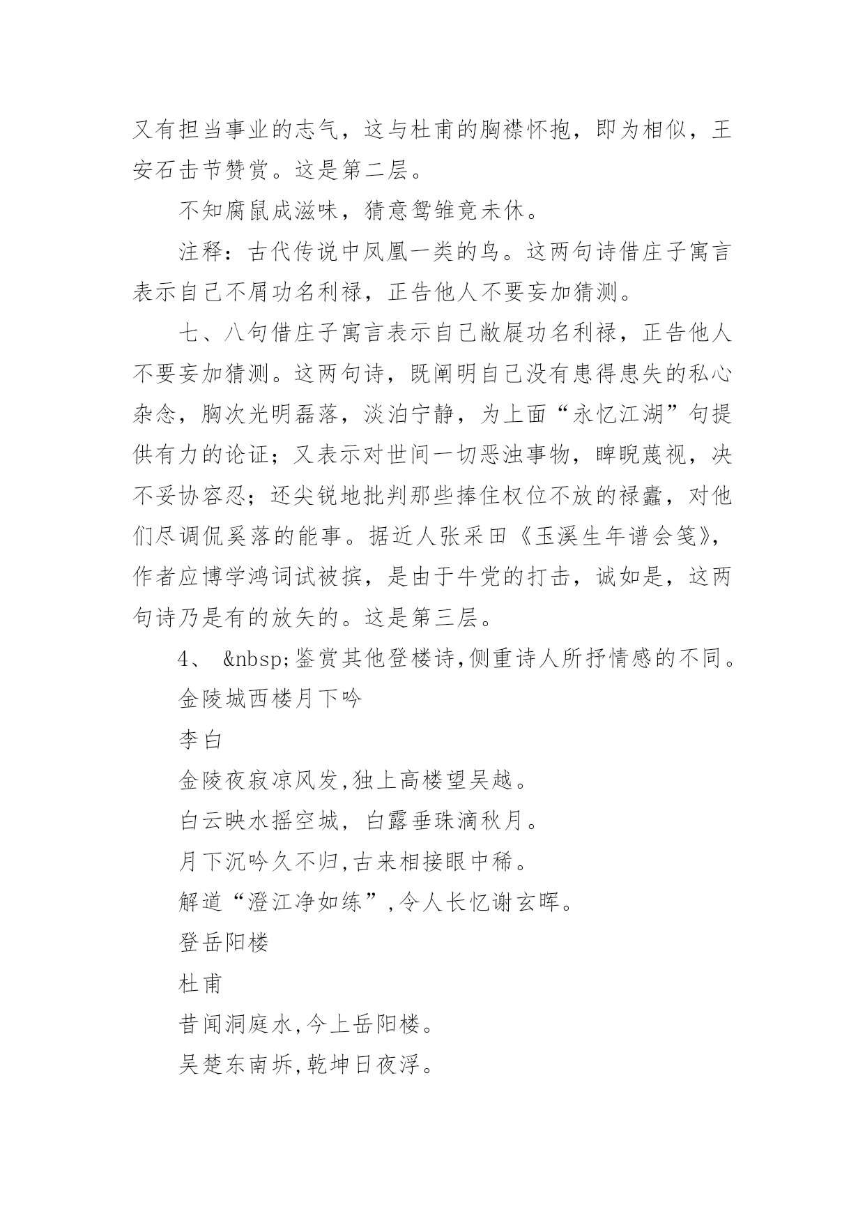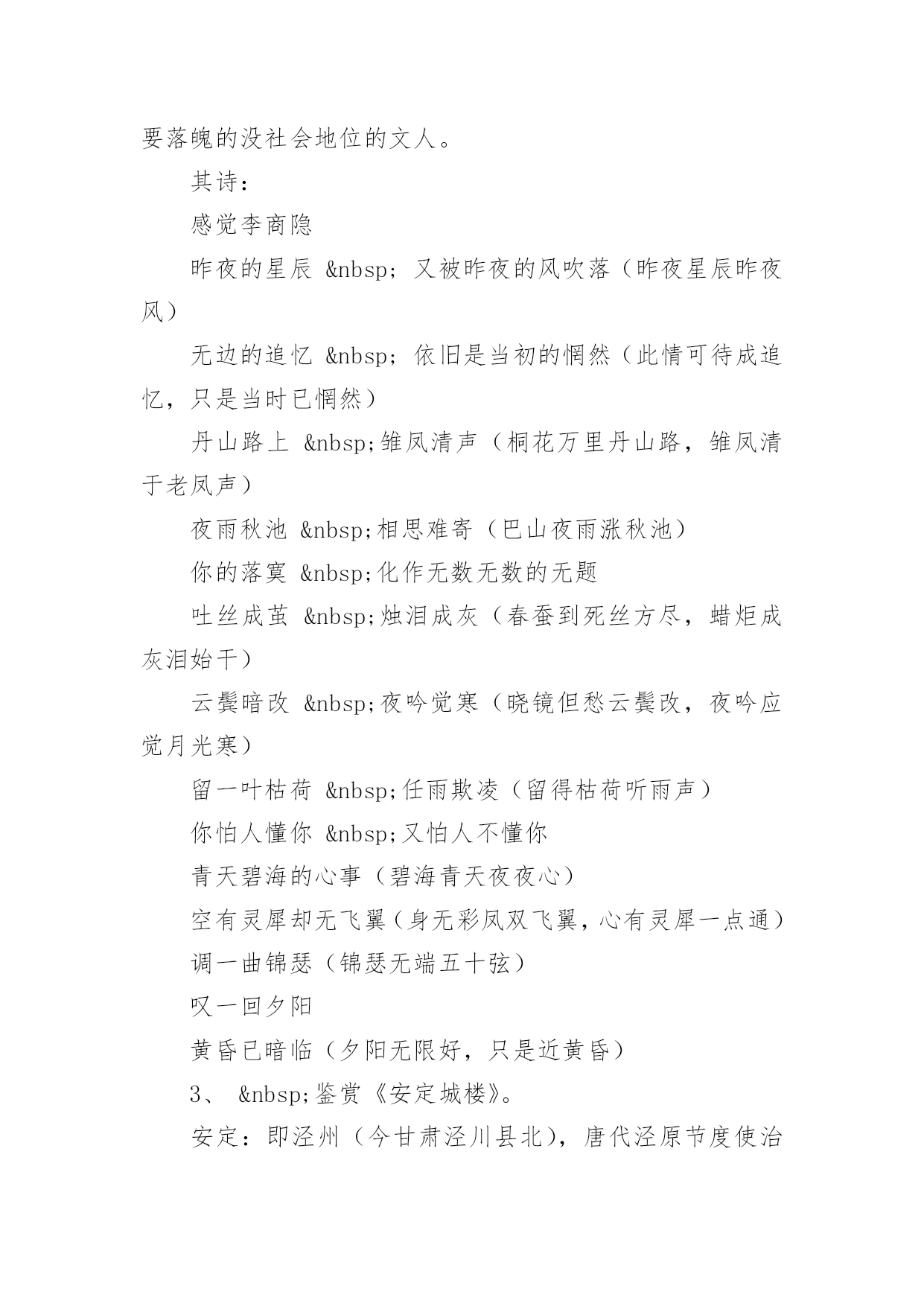 安定城楼教学设计安定城楼教学设计安定城楼是唐朝诗人李商隐的诗,各位,我们一起看看下面的安定城楼教学设计吧!安定城楼教学设计一、教学目标:1、引导学生运用一定鉴赏方法领悟诗人思想感情。2、增加学生相关积累。二、教学重点:勘破“情”关。以“知人论诗”、“诗中觅情”、“重敲尾联”、“破典而出”为抓手把握诗歌中的情感。三、教学过程:1、 导入:古代诗人常常登高抒怀,《安定城楼》同样如此。2、 丰富学生对李商隐其人其诗的了解。其人:字义山,号玉谿生,又号樊南子。与杜牧合称“小李杜”,在词采华艳这一点上,与温庭筠接近,后世又称“温李”。受牛党令狐楚赏识,入其幕府,次年入属李党的泾原节度使王茂元幕府,王爱其才,以女妻之。因此受牛党排挤,辗转于各藩镇幕府,终身不得志。李商隐诗歌的基本风格是情深词婉,能于华丽中时带沉郁,流美中不失厚重。首创无题诗。一个在自卑与自负中不断扭曲的文人、一个酷爱政治却屡屡遭政治戏弄的文人、一个苦苦挣扎稍不小心就要落魄的没社会地位的文人。其诗:感觉李商隐昨夜的星辰 又被昨夜的风吹落(昨夜星辰昨夜风)无边的追忆 依旧是当初的惘然(此情可待成追忆,只是当时已惘然)丹山路上 雏凤清声(桐花万里丹山路,雏凤清于老凤声)夜雨秋池 相思难寄(巴山夜雨涨秋池)你的落寞 化作无数无数的无题吐丝成茧 烛泪成灰(春蚕到死丝方尽,蜡炬成灰泪始干)云鬓暗改 夜吟觉寒(晓镜但愁云鬓改,夜吟应觉月光寒)留一叶枯荷 任雨欺凌(留得枯荷听雨声)你怕人懂你 又怕人不懂你青天碧海的心事(碧海青天夜夜心)空有灵犀却无飞翼(身无彩凤双飞翼,心有灵犀一点通)调一曲锦瑟(锦瑟无端五十弦)叹一回夕阳黄昏已暗临(夕阳无限好,只是近黄昏)3、 鉴赏《安定城楼》。安定:即泾州(今甘肃泾川县北),唐代泾原节度使治所。唐文宗大和九年(835),王茂元拜泾原节度使,开成三年(838),李商隐赴其幕,还做了王的女婿。不久,商隐应博学鸿词科试,落选回泾州,登楼有感,写此遣怀。诗作于泾原节度使幕中,作者当时24岁。迢递高城百尺楼,绿杨枝外尽汀洲。形容极高 指安定城东泾水岸边的沙洲。尽汀洲,沙洲上的景色尽收眼底。译:首二句登楼即景:登上高耸百尺的安定城楼,远处绿杨树边的.洲渚尽收眼底。贾生年少虚垂涕,王粲春来更远游。贾生:贾谊(前200-前168),西汉政治家。年20余为博士,上书发表政见,有“可为痛哭者一,可为流涕者二,可为长太息者六”等语。因权贵诋毁,贬为长沙王太傅,写《吊屈原赋》。《史记》有《屈原贾生列传》。后世成为才高遭贬之士的代称。虚垂涕,白白痛哭流涕而不起作用。王粲:汉末(177-217)文学家。17岁避长安之乱到荆州,于春日登当阳城楼,作《登楼赋》,抒写去国远游,感世伤时的慨叹。上面两句以贾谊、王粲自比。贾谊献策,王粲登楼,都在青春年少,与作者相似;才高志远而不得施展,也正相同。永忆江湖归白发,欲回天地入扁舟。注释:总在想着年老辞官,归隐江湖。想望建立回天转地的显赫功绩,然后乘小船四处漫游。“永”字有力地表达作者毕生的抱负。这两句诗反映了封建社会里才志之士的积极向上思想,既怀着恬淡的心情,又有担当事业的志气,这与杜甫的胸襟怀抱,即为相似,王安石击节赞赏。这是第二层。不知腐鼠成滋味,猜意鸳雏竟未休。注释:古代传说中凤凰一类的鸟。这两句诗借庄子寓言表示自己不屑功名利禄,正告他人不要妄加猜测。七、八句借庄子寓言表示自己敝屣功名利禄,正告他人不要妄加猜测。这两句诗,既阐明自己没有患得患失的私心杂念,胸次光明磊落,淡泊宁静,为上面“永忆江湖”句提供有力的论证;又表示对世间一切恶浊事物,睥睨蔑视,决不妥协容忍;还尖锐地批判那些捧住权位不放的禄蠹,对他们尽调侃奚落的能事。据近人张采田《玉溪生年谱会笺》,作者应博学鸿词试被摈,是由于牛党的打击,诚如是,这两句诗乃是有的放矢的。这是第三层。4、 鉴赏其他登楼诗,侧重诗人所抒情感的不同。金陵城西楼月下吟李白金陵夜寂凉风发,独上高楼望吴越。白云映水摇空城,白露垂珠滴秋月。月下沉吟久不归,古来相接眼中稀。解道“澄江净如练”,令人长忆谢玄晖。登岳阳楼杜甫昔闻洞庭水,今上岳阳楼。吴楚东南坼,乾坤日夜浮。亲朋无一字,老病有孤舟。戎马关山北,凭轩涕泗流。登柳州城寄漳汀封连四州刺史柳宗元城上高楼接大荒,海天愁思正茫茫。惊风乱飐芙蓉水,密雨斜侵薜荔墙。岭树重遮千里目,江流曲似九回肠。共来百越文身地,犹自音书滞一乡。咸阳城西楼晚眺许浑一上高城万里愁,蒹葭杨柳似汀洲。溪云初起日沉阁,山雨欲来风满楼。鸟下绿芜秦苑夕,蝉鸣黄叶汉宫秋。行人莫问当年事,故国东来渭水流。小结:登楼抒怀 别有怀抱