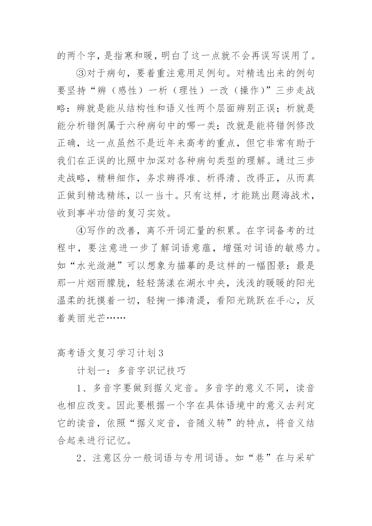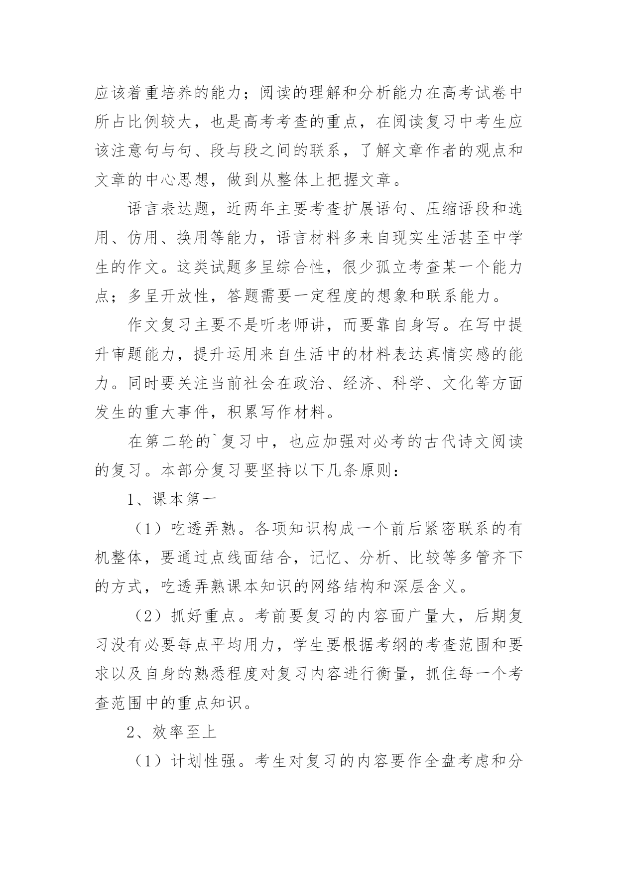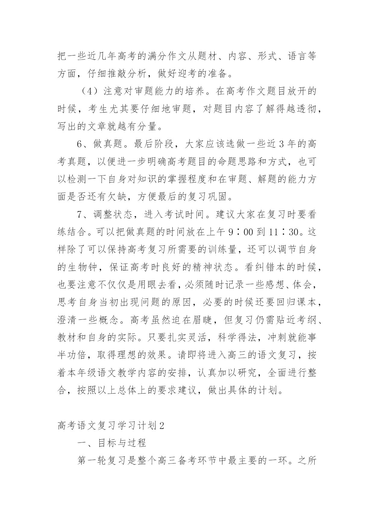 高考语文复习学习计划光阴的迅速,一眨眼就过去了,很快就要开展新的工作了,写好计划才不会让我们努力的时候迷失方向哦。可是到底什么样的计划才是适合自己的呢?下面是小编帮大家整理的高考语文复习学习计划,欢迎大家分享。高考语文复习学习计划1一、第一轮复习第一轮复习要全面阅读教材,查漏补缺,彻底扫除知识结构中理解上的障碍。在这一基础上,对语文基础知识进行梳理和归纳,建立完整的知识体系。同时配以课堂针对性训练和单元训练,提升应用能力。建立完整的语文知识系统,指的是整理、完善语文知识的各个系统。语文知识的大系统包括语音知识系统、文学知识系统、词及短语系统、单复句知识系统、修辞知识系统、标点知识系统、现代文体知识系统、古今文学常识系统、写作知识系统、文言知识系统等;语文知识的小知识系统即为每一个语文知识点的性质、分类、意义或用法。如“词”这个小系统,就包括词义、色彩轻重、范围、搭配、语体等。甚至还可分得更细,如词语的感情色彩。这一轮复习中,同学们需熟悉大系统和小系统,并在复习具体知识点时,有意的将所复习的知识点和其所属的知识系统联系起来。这样做有益于开展全面的、深入的复习。二、第二轮复习第二轮复习要明确重点、难点。深刻理解每一个知识结构及其知识点中的重点,突破难点,把握知识结构内部之间的联系。同时进行解题训练,提升应战能力。高考语文复习,要防止两种偏向:一是拼命做题目,自以为做得越多越好;二是不认真复习,自以为复习未必有用,指望“临场发挥”。这两种偏向都是侥幸心理的反映。正确的做法应该是有的放矢,认真复习,突出重点,讲究实效。近两年来,语言知识和文学常识题比例减小,测试的重点在阅读能力、语言表达和作文这三个方面。从考生个人语文知识掌握和语言能力的实际状况上看,除作文外,失分较多的是现代文阅读和语言表达。这一轮复习中,大家一定要注意对这几部分内容的复习。现代文阅读着重考查筛选和提取信息的能力,理解和分析能力,鉴赏和评价能力。这三方面试题的正确回答都以对文章的准确理解为前提。过去的考生答不好题,主要不是文章读不懂,试题不会答,而在于没有处理好读文章与答题的关系。因此复习时要特别注意找到依据不同类型文章的要素读懂读通文章的基本规律,进而形成运用文中语言材料组织答案的能力。阅读能力的培养应注重两个方面,一是信息筛选的能力,二是对阅读材料的理解和分析能力。考生平时所阅读材料的内容大多是新鲜的,能否在短时间内了解和掌握更多的信息与学习效率有很大关系,因此,快速有效地阅读是语文学习应该着重培养的能力;阅读的理解和分析能力在高考试卷中所占比例较大,也是高考考查的重点,在阅读复习中考生应该注意句与句、段与段之间的联系,了解文章作者的观点和文章的中心思想,做到从整体上把握文章。语言表达题,近两年主要考查扩展语句、压缩语段和选用、仿用、换用等能力,语言材料多来自现实生活甚至中学生的作文。这类试题多呈综合性,很少孤立考查某一个能力点;多呈开放性,答题需要一定程度的想象和联系能力。作文复习主要不是听老师讲,而要靠自身写。在写中提升审题能力,提升运用来自生活中的材料表达真情实感的能力。同时要关注当前社会在政治、经济、科学、文化等方面发生的重大事件,积累写作材料。在第二轮的`复习中,也应加强对必考的古代诗文阅读的复习。本部分复习要坚持以下几条原则:1、课本第一(1)吃透弄熟。各项知识构成一个前后紧密联系的有机整体,要通过点线面结合,记忆、分析、比较等多管齐下的方式,吃透弄熟课本知识的网络结构和深层含义。(2)抓好重点。考前要复习的内容面广量大,后期复习没有必要每点平均用力,学生要根据考纲的考查范围和要求以及自身的熟悉程度对复习内容进行衡量,抓住每一个考查范围中的重点知识。2、效率至上(1)计划性强。考生对复习的内容要作全盘考虑和分解,针对各知识点制订短期计划。(2)方法灵活。如利用零碎时间复习文言虚词,因分散则容易掌握。(3)精选试题。概括说,就是“选、读、译”。“选”的关键是精。选好后不凭借任何辅助读物自身去读它,有读不懂的地方要善于“推导”和“借助”,就是“词不离句,句不离篇,前后推敲,整体把握”。“译”的关键是准确。总之,学习文言文,目的是能够读懂浅显的文言文,了解文章的背景、写作意图、作者的观点倾向以及布局谋篇的特点等。三、第三轮复习经过第一、二轮复习以后,大家就进入了冲刺复习阶段,在这一阶段,大家应该想到自身在通过前一段学习有了一定基础,在这个基础上,因为时间有限,建议同学们采取这样的做法:1、研读考纲。《考试大纲》是高考命题的依据,也是大家复习备考的依据。大家解读考试大纲时,除要关注考试范围、新增内容外,更应该关注题型示例及样卷。它们不但让我们对高考试卷的长度、题型的大致比例有所了解,更能告诉我们本年高考题目的命题走向。2、回归课本。高考题目年年都有变化,