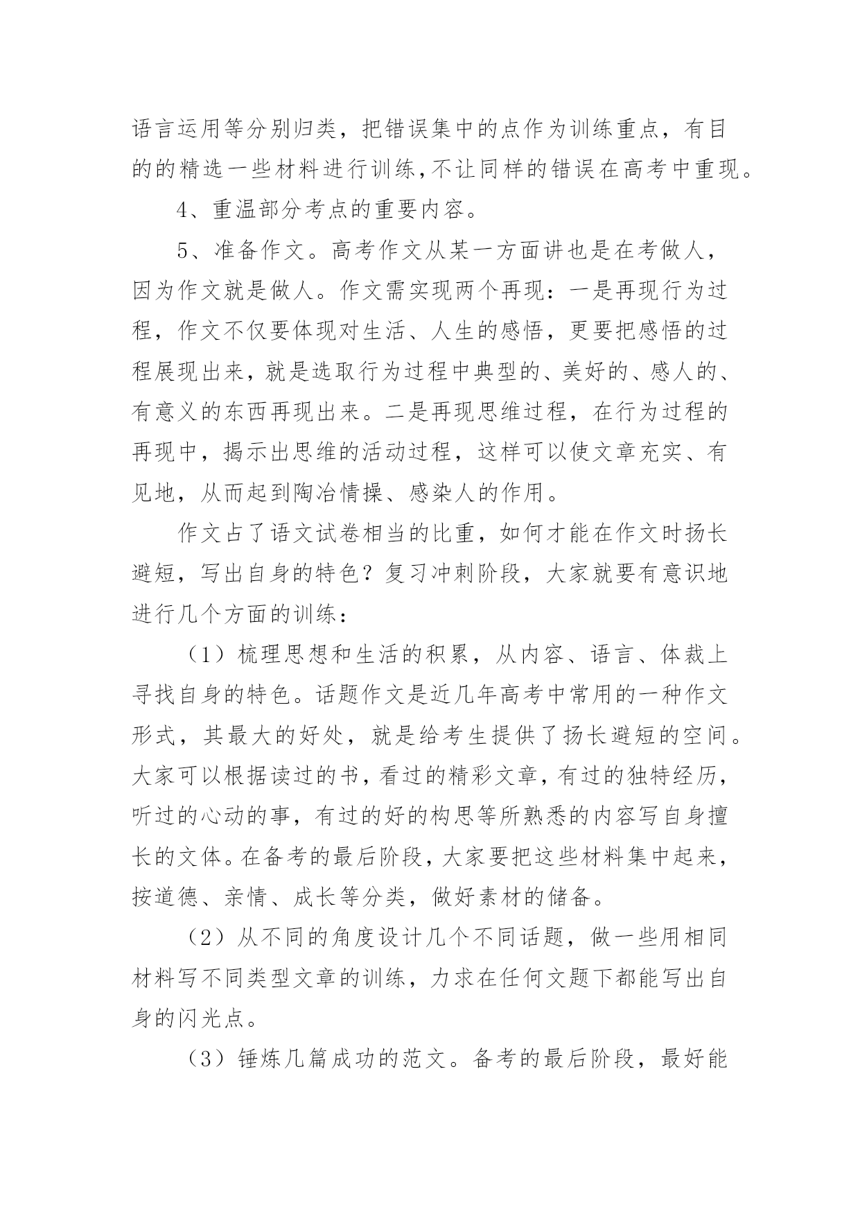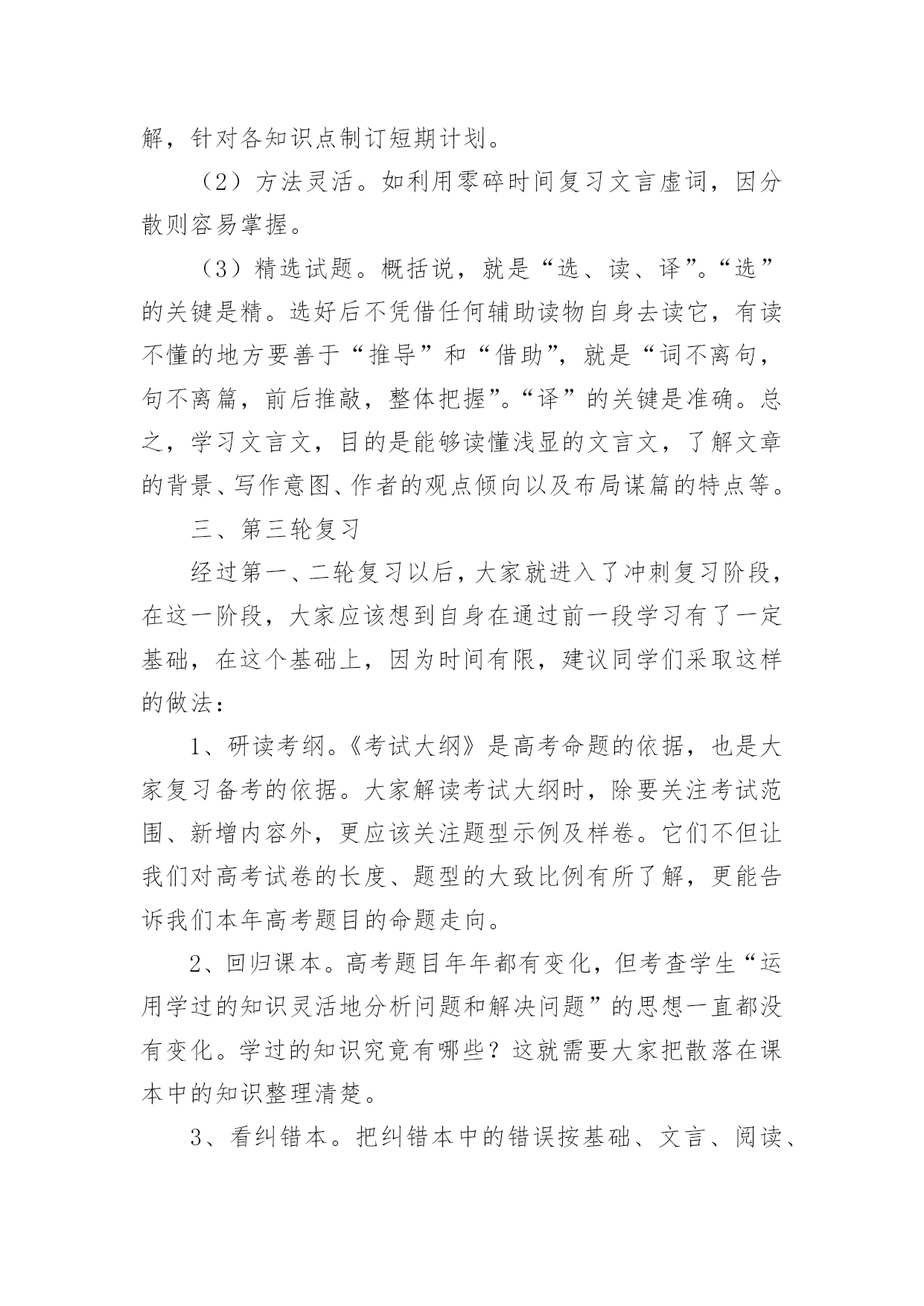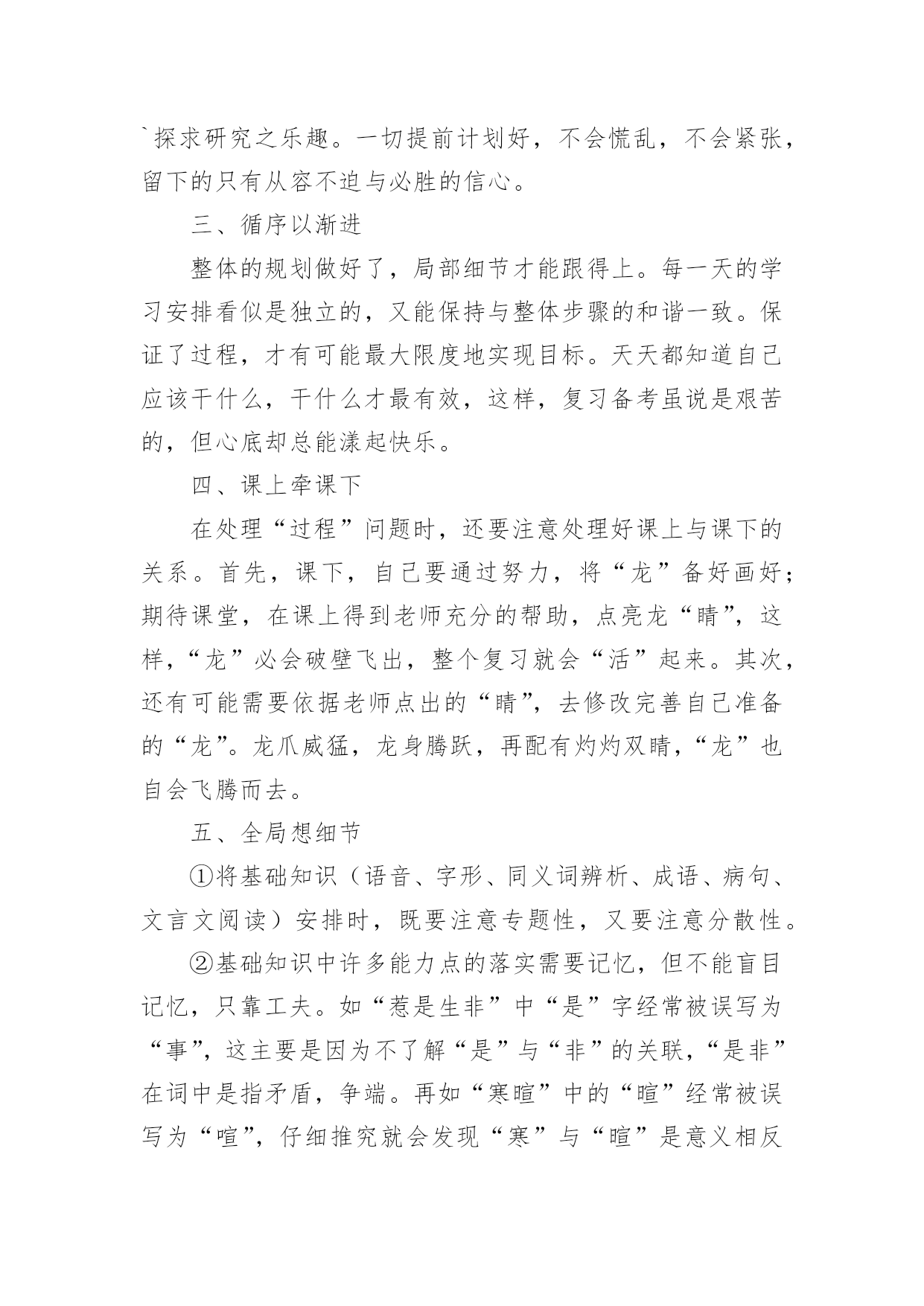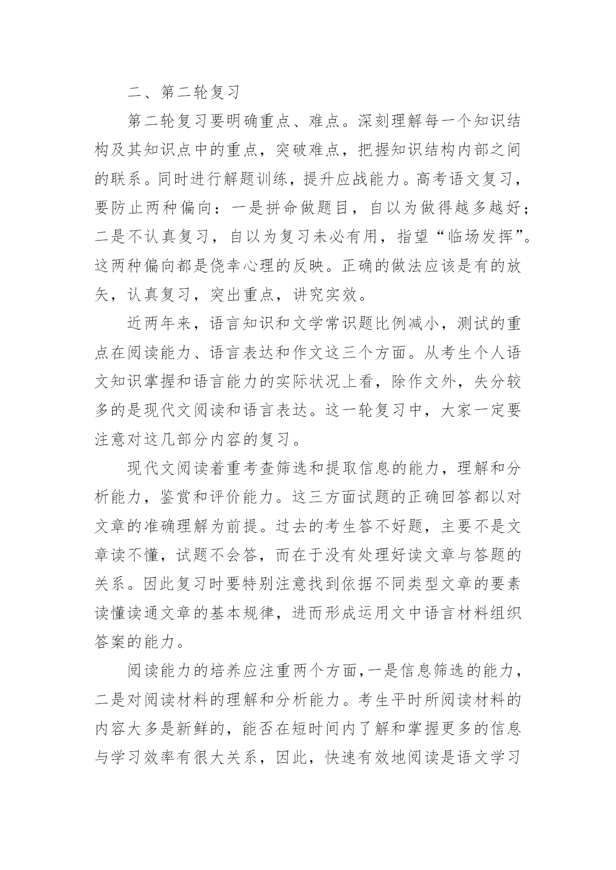 高考语文复习学习计划光阴的迅速,一眨眼就过去了,很快就要开展新的工作了,写好计划才不会让我们努力的时候迷失方向哦。可是到底什么样的计划才是适合自己的呢?下面是小编帮大家整理的高考语文复习学习计划,欢迎大家分享。高考语文复习学习计划1一、第一轮复习第一轮复习要全面阅读教材,查漏补缺,彻底扫除知识结构中理解上的障碍。在这一基础上,对语文基础知识进行梳理和归纳,建立完整的知识体系。同时配以课堂针对性训练和单元训练,提升应用能力。建立完整的语文知识系统,指的是整理、完善语文知识的各个系统。语文知识的大系统包括语音知识系统、文学知识系统、词及短语系统、单复句知识系统、修辞知识系统、标点知识系统、现代文体知识系统、古今文学常识系统、写作知识系统、文言知识系统等;语文知识的小知识系统即为每一个语文知识点的性质、分类、意义或用法。如“词”这个小系统,就包括词义、色彩轻重、范围、搭配、语体等。甚至还可分得更细,如词语的感情色彩。这一轮复习中,同学们需熟悉大系统和小系统,并在复习具体知识点时,有意的将所复习的知识点和其所属的知识系统联系起来。这样做有益于开展全面的、深入的复习。二、第二轮复习第二轮复习要明确重点、难点。深刻理解每一个知识结构及其知识点中的重点,突破难点,把握知识结构内部之间的联系。同时进行解题训练,提升应战能力。高考语文复习,要防止两种偏向:一是拼命做题目,自以为做得越多越好;二是不认真复习,自以为复习未必有用,指望“临场发挥”。这两种偏向都是侥幸心理的反映。正确的做法应该是有的放矢,认真复习,突出重点,讲究实效。近两年来,语言知识和文学常识题比例减小,测试的重点在阅读能力、语言表达和作文这三个方面。从考生个人语文知识掌握和语言能力的实际状况上看,除作文外,失分较多的是现代文阅读和语言表达。这一轮复习中,大家一定要注意对这几部分内容的复习。现代文阅读着重考查筛选和提取信息的能力,理解和分析能力,鉴赏和评价能力。这三方面试题的正确回答都以对文章的准确理解为前提。过去的考生答不好题,主要不是文章读不懂,试题不会答,而在于没有处理好读文章与答题的关系。因此复习时要特别注意找到依据不同类型文章的要素读懂读通文章的基本规律,进而形成运用文中语言材料组织答案的能力。阅读能力的培养应注重两个方面,一是信息筛选的能力,二是对阅读材料的理解和分析能力。考生平时所阅读材料的内容大多是新鲜的,能否在短时间内了解和掌握更多的信息与学习效率有很大关系,因此,快速有效地阅读是语文学习应该着重培养的能力;阅读的理解和分析能力在高考试卷中所占比例较大,也是高考考查的重点,在阅读复习中考生应该注意句与句、段与段之间的联系,了解文章作者的观点和文章的中心思想,做到从整体上把握文章。语言表达题,近两年主要考查扩展语句、压缩语段和选用、仿用、换用等能力,语言材料多来自现实生活甚至中学生的作文。这类试题多呈综合性,很少孤立考查某一个能力点;多呈开放性,答题需要一定程度的想象和联系能力。作文复习主要不是听老师讲,而要靠自身写。在写中提升审题能力,提升运用来自生活中的材料表达真情实感的能力。同时要关注当前社会在政治、经济、科学、文化等方面发生的重大事件,积累写作材料。在第二轮的`复习中,也应加强对必考的古代诗文阅读的复习。本部分复习要坚持以下几条原则:1、课本第一(1)吃透弄熟。各项知识构成一个前后紧密联系的有机整体,要通过点线面结合,记忆、分析、比较等多管齐下的方式,吃透弄熟课本知识的网络结构和深层含义。(2)抓好重点。考前要复习的内容面广量大,后期复习没有必要每点平均用力,学生要根据考纲的考查范围和要求以及自身的熟悉程度对复习内容进行衡量,抓住每一个考查范围中的重点知识。2、效率至上(1)计划性强。考生对复习的内容要作全盘考虑和分解,针对各知识点制订短期计划。(2)方法灵活。如利用零碎时间复习文言虚词,因分散则容易掌握。(3)精选试题。概括说,就是“选、读、译”。“选”的关键是精。选好后不凭借任何辅助读物自身去读它,有读不懂的地方要善于“推导”和“借助”,就是“词不离句,句不离篇,前后推敲,整体把握”。“译”的关键是准确。总之,学习文言文,目的是能够读懂浅显的文言文,了解文章的背景、写作意图、作者的观点倾向以及布局谋篇的特点等。三、第三轮复习经过第一、二轮复习以后,大家就进入了冲刺复习阶段,在这一阶段,大家应该想到自身在通过前一段学习有了一定基础,在这个基础上,因为时间有限,建议同学们采取这样的做法:1、研读考纲。《考试大纲》是高考命题的依据,也是大家复习备考的依据。大家解读考试大纲时,除要关注考试范围、新增内容外,更应该关注题型示例及样卷。它们不但让我们对高考试卷的长度、题型的大致比例有所了解,更能告诉我们本年高考题目的命题走向。2、回归课本。高考题目年年都有变化,