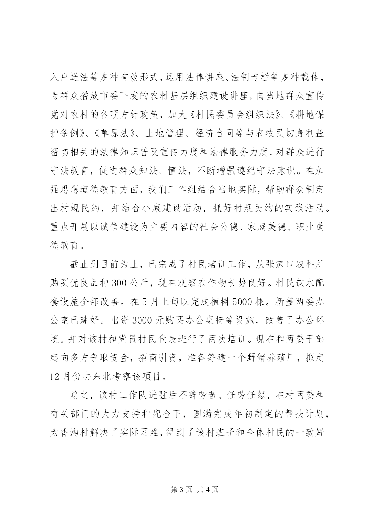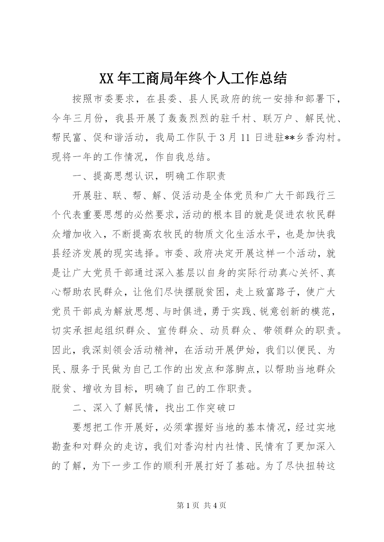 第PAGE\*Arabic\*MERGEFORMAT4页共NUMPAGES\*MERGEFORMAT4页XX年工商局年终个人工作总结按照市委要求,在县委、县人民政府的统一安排和部署下,今年三月份,我县开展了轰轰烈烈的驻千村、联万户、解民忧、帮民富、促和谐活动,我局工作队于3月11日进驻**乡香沟村。现将一年的工作情况,作自我总结。一、提高思想认识,明确工作职责开展驻、联、帮、解、促活动是全体党员和广大干部践行三个代表重要思想的必然要求,活动的根本目的就是促进农牧民群众增加收入,不断提高农牧民的物质文化生活水平,也是加快我县经济发展的现实选择。市委、政府决定开展这样一个活动,就是让广大党员干部通过深入基层以自身的实际行动真心关怀、真心帮助农民群众,让他们尽快摆脱贫困,走上致富路子,使广大党员干部成为解放思想、与时俱进,勇于实践、锐意创新的模范,切实承担起组织群众、宣传群众、动员群众、带领群众的职责。因此,我深刻领会活动精神,在活动开展伊始,我们以便民、为民、服务于民做为自己工作的出发点和落脚点,以帮助当地群众脱贫、增收为目标,明确了自己的工作职责。二、深入了解民情,找出工作突破口要想把工作开展好,必须掌握好当地的基本情况,经过实地勘查和对群众的走访,我们对香沟村内社情、民情有了更加深入的了解,为下一步工作的顺利开展打好了基础。为了尽快扭转这种局面,把驻、联、帮、解、促的目标真正实现好、把农民群众的切身利益维护好,我工作队同志结合实际、因地制宜,本着为当地群众出实招、办实事、广开增收渠道的原则与当地村委会协商,制定了切实可行的脱贫致富方案。三、认真安排落实、拓宽增收渠道帮扶计划确定后,我们工作队同志立即着手落实。通过调研走访和实地勘察,结合香沟村实际,制定了详细的实施步骤:一是聘请专业技术人员到该村进行养殖,种植业技术培训,使村民开阔眼界,增长知识,掌握技术,进优良品种,改善种植结构,进行科学种植和养殖。二是帮助两委改善办公条件,新建办公室5间,购置办公桌椅,完善各项制度。三是与林业部门和水利部门配合实施太行山水土保持工程和退耕还林项目。四是帮助该村跑资金和原材料,解决村民饮水配套设施。五是支持发展村民养鸡养猪专业户710户龙头户,从而带动村民加快致富步伐。六是对两委班子干部进行培训,提高干部思想素质,使干部带头致富,起表率作用,积极跑动项目,壮大集体经济,使该村后进支部在年底前转化。四、紧抓精神文明建设不放松要想彻底改变农村牧区贫困落后的面貌,实现农民致富达小康,关键是要转变农民的思想观念,提高农民的综合素质,这是根本问题,我们工作组加强对群众的法制教育。通过以案说法、入户送法等多种有效形式,运用法律讲座、法制专栏等多种载体,为群众播放市委下发的农村基层组织建设讲座,向当地群众宣传党对农村的各项方针政策,加大《村民委员会组织法》、《耕地保护条例》、《草原法》、土地管理、经济合同等与农牧民切身利益密切相关的法律知识普及宣传力度和法律服务力度,对群众进行守法教育,促进群众知法、懂法,不断增强遵纪守法意识。在加强思想道德教育方面,我们工作组结合当地实际,帮助群众制定出村规民约,并结合小康建设活动,抓好村规民约的实践活动。重点开展以诚信建设为主要内容的社会公德、家庭美德、职业道德教育。截止到目前为止,已完成了村民培训工作,从张家口农科所购买优良品种300公斤,现在观察农作物长势良好。村民饮水配套设施全部改善。在5月上旬以完成植树5000棵。新盖两委办公室已建好。出资3000元购买办公桌椅等设施,改善了办公环境。并对该村和党员村民代表进行了两次培训。现在和两委干部起向多方争取资金,招商引资,准备筹建一个野猪养殖厂,拟定12月份去东北考察该项目。总之,该村工作队进驻后不辞劳苦、任劳任怨,在村两委和有关部门的大力支持和配合下,圆满完成年初制定的帮扶计划,为香沟村解决了实际困难,得到了该村班子和全体村民的一致好评。
