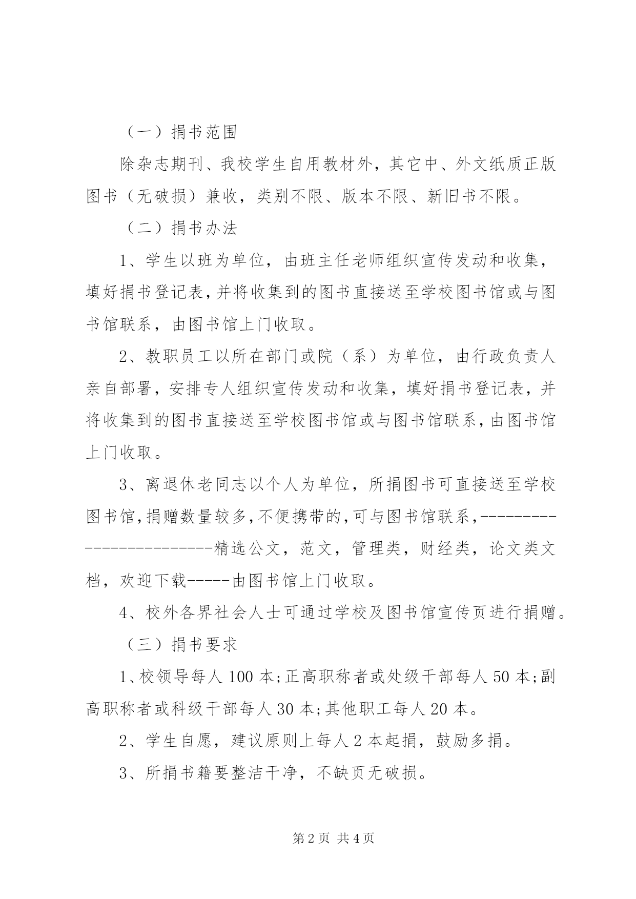 第PAGE\*Arabic\*MERGEFORMAT4页共NUMPAGES\*MERGEFORMAT4页学校”捐书活动方案------------------------精选公文,范文,管理类,财经类,论文类文档,欢迎下载-----“书籍传友谊,爱心献学校”捐书活动方案一、活动目的为了丰富我校图书馆馆藏,确保教育部本科教学工作合格评估顺利通过,倡议开展全校性捐书活动。通过师生捐赠图书资料,及时充实学校教学信息资源,以达到本科教学合格评估要求。二、活动意义书籍是人类进步的阶梯,是开启人类智慧的金钥匙。积极利用我校师生人脉资源,尽可能收集图书资料充实图书馆馆藏数量,对“迎评”工作意义重大,同时,对以后更好地服务教学、科研工作具有深远的意义。三、活动主题捐出几本书、献出一片情、我为学院发展做贡献。四、活动对象平顶山学院全体师生以及关心、支------------------------精选公文,范文,管理类,财经类,论文类文档,欢迎下载-----持我校发展的各界社会人士。五、活动内容及要求(一)捐书范围除杂志期刊、我校学生自用教材外,其它中、外文纸质正版图书(无破损)兼收,类别不限、版本不限、新旧书不限。(二)捐书办法1、学生以班为单位,由班主任老师组织宣传发动和收集,填好捐书登记表,并将收集到的图书直接送至学校图书馆或与图书馆联系,由图书馆上门收取。2、教职员工以所在部门或院(系)为单位,由行政负责人亲自部署,安排专人组织宣传发动和收集,填好捐书登记表,并将收集到的图书直接送至学校图书馆或与图书馆联系,由图书馆上门收取。3、离退休老同志以个人为单位,所捐图书可直接送至学校图书馆,捐赠数量较多,不便携带的,可与图书馆联系,------------------------精选公文,范文,管理类,财经类,论文类文档,欢迎下载-----由图书馆上门收取。4、校外各界社会人士可通过学校及图书馆宣传页进行捐赠。(三)捐书要求1、校领导每人100本;正高职称者或处级干部每人50本;副高职称者或科级干部每人30本;其他职工每人20本。2、学生自愿,建议原则上每人2本起捐,鼓励多捐。3、所捐书籍要整洁干净,不缺页无破损。(四)捐书活动时间即日起至2012年5月底。(五)鸣谢和鼓励措施1、对所有捐书5册以上(含5册)的捐赠者将在图书馆页上张榜公布;学生另外增加图书借阅权限,或奖励电子阅览室一定的上机时间点卡。2、学生捐书20册、教师捐书50册以上者,图书馆将开具目录清单,一份由捐书者保存,另一份由图书馆作为校史资料保存;报请学校进行通报表彰并------------------------精选公文,范文,管理类,财经类,论文类文档,欢迎下载-----颁发荣誉证书。3、对在这次活动中发动深入、组织得力、成绩显著的部门,评选出特等奖、优秀奖、组织奖各一名,张榜公布,报请学校进行通报表彰并颁发荣誉证书。4、此次捐书活动校外宣传工作由校办在有关新闻媒体上发布倡议书,对向我校捐赠图书的所有社会人士均张榜公布;个人捐书达五千册以上者,举行专门赠书仪式并发放铜质奖牌及荣誉证书。六、捐书办事机构捐书办公室设在学校图书馆,由副馆长葛雁泓负责。联系人。葛雁泓、石晓东。地点。平顶山学院图书馆负一楼西南侧采编室。