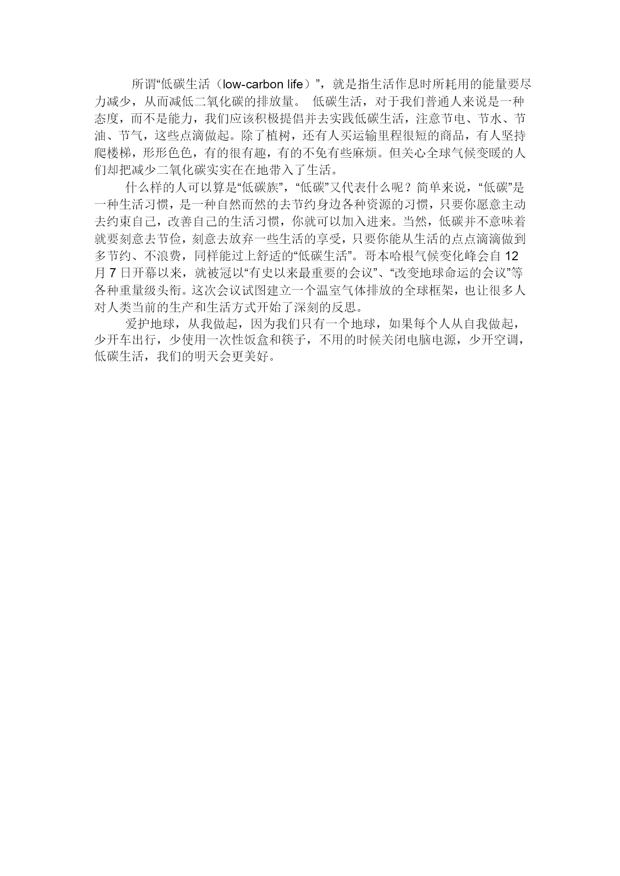 我眼里的“幸福广州低碳生活”——骨瘦如材幸福是什么,有人曾问过我。我说,幸福就是吃的进,睡的着,拉的出。话虽然粗俗,但是很贴合实际,你要问一千个人,肯定答案是不一样的,幸福多半是一种感觉,一种体会,下面是我眼里的幸福。有一个固定稳定的工作,大家彼此合作和尊重,不用时刻担心下岗,不用为下顿饭发愁,拥有这种状态是幸福。在广州有一所自己的房子,不必是高楼大厦,不必宽敞明亮,能住的下一家人,相敬如宾,安居乐业,这是我的幸福。我希望我的孩子,能和城里的孩子一样,快乐的学习,快乐的游玩,他们不受城里人的歧视,不用担心因为户口和文化的差异,并由此带来的升学就业等等若干问题,家人的幸福,就是我的幸福。我希望我们购买的食物,是安全的,不必为转基因食品而担忧,不必为假药假酒发愁,不必为吃猪肉是否注水而烦恼。我希望我们去银行办理业务不用太长的等待,不用看银行职员的脸色,无论资金的多少,一份一厘积攒着家庭的希望和未来。我希望身边能多些绿树环绕,希望沟渠里的水不发黑无异味,希望漆黑的夜晚,抬头能看见繁星闪烁,指引我们回家的路。这一切都需要一个健康的体魄,我更希望家人身体健康,所有的朋友们身体健康,天底下所有的人身体健康,因为,拥有健康,才能去追求自己的梦想和实现自己的梦想,才能实现自己的幸福。有一首诗,这样描述幸福:幸福,是静静地躺在床上和窗外的明月相注视,于是,两个星球之间变得朦胧柔和、难解难分的时候;幸福,是你像小驴子那样不停地奔波劳碌,回过头来,发现谷物满仓的时候;幸福,是你搀扶盲人过马路后,而看着盲人满脸谢意地对着电线杆子点头的时候;幸福,是你闻着妈妈新拆洗的被子散发出来的肥皂香味进入梦乡的时候;幸福,是你感到失去一切时猛然悟出自己是一个健康的而非疾病缠身的人的时候;幸福,是你被周围万物所感动,从而感谢上苍让你今生投胎成人的时候;幸福,是一种感觉,它可以如恒久的太阳伴你一生,它又如一只可爱的小鸟,容易一下将它掠去,关键,还在于你怎样把握。每个人,都有属于他的幸福,只是大小多少长短罢了,我们都在努力的追求自己的幸福。数数至今,来广州工作和生活已经将近八年,感受最深的是,广州是一个包容的城市,无论你来之哪里,无论你富裕还是贫穷,你总能找到一块你所熟悉的地方,并为着美好生活,慢慢奋斗。或许这个城市还有那么多的不完善,还需要很多改进,要相信,就像当初你来到这里,城市张开了双臂迎接你一样,你也要去迎接,广州明日的幸福。所谓“低碳生活(low-carbonlife)”,就是指生活作息时所耗用的能量要尽力减少,从而减低二氧化碳的排放量。低碳生活,对于我们普通人来说是一种态度,而不是能力,我们应该积极提倡并去实践低碳生活,注意节电、节水、节油、节气,这些点滴做起。除了植树,还有人买运输里程很短的商品,有人坚持爬楼梯,形形色色,有的很有趣,有的不免有些麻烦。但关心全球气候变暖的人们却把减少二氧化碳实实在在地带入了生活。什么样的人可以算是“低碳族”,“低碳”又代表什么呢?简单来说,“低碳”是一种生活习惯,是一种自然而然的去节约身边各种资源的习惯,只要你愿意主动去约束自己,改善自己的生活习惯,你就可以加入进来。当然,低碳并不意味着就要刻意去节俭,刻意去放弃一些生活的享受,只要你能从生活的点点滴滴做到多节约、不浪费,同样能过上舒适的“低碳生活”。哥本哈根气候变化峰会自12月7日开幕以来,就被冠以“有史以来最重要的会议”、“改变地球命运的会议”等各种重量级头衔。这次会议试图建立一个温室气体排放的全球框架,也让很多人对人类当前的生产和生活方式开始了深刻的反思。爱护地球,从我做起,因为我们只有一个地球,如果每个人从自我做起,少开车出行,少使用一次性饭盒和筷子,不用的时候关闭电脑电源,少开空调,低碳生活,我们的明天会更美好。