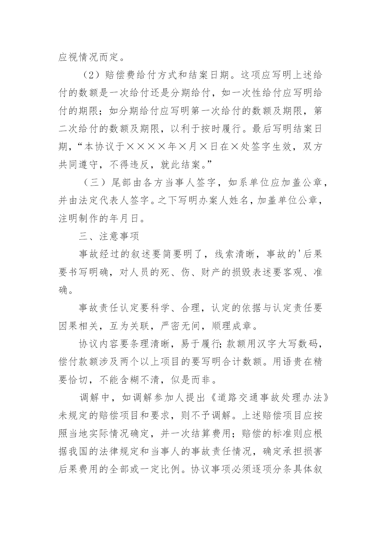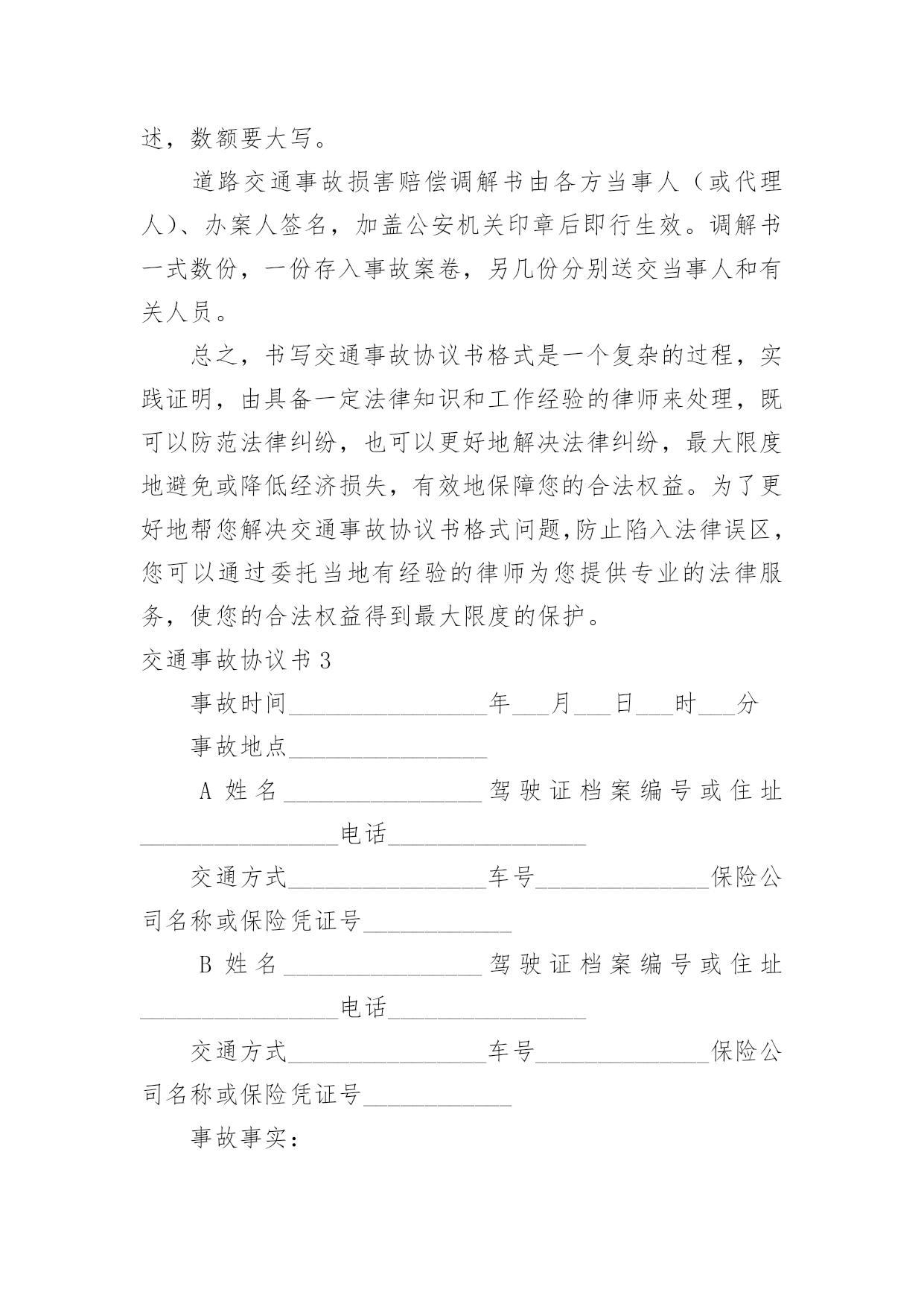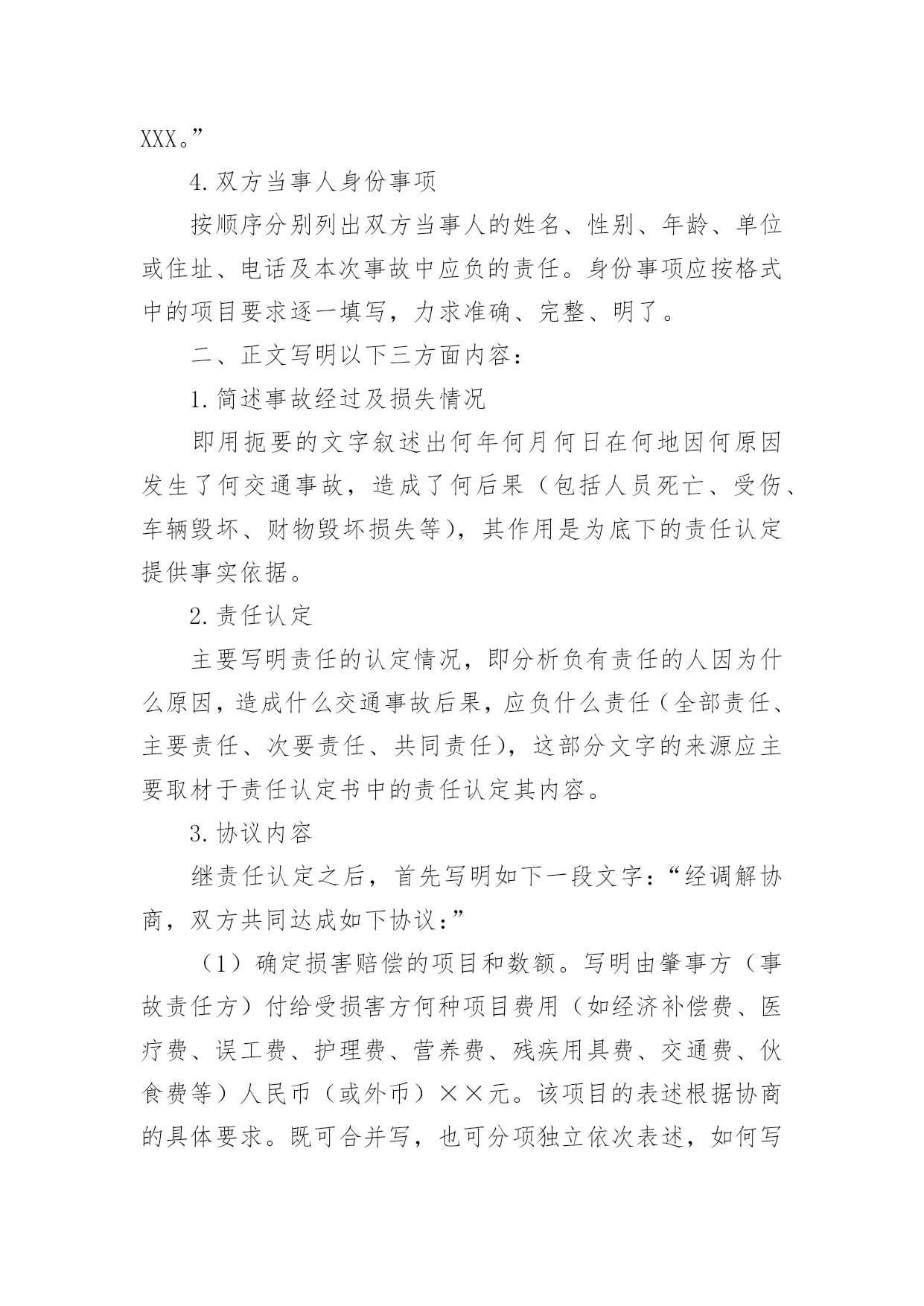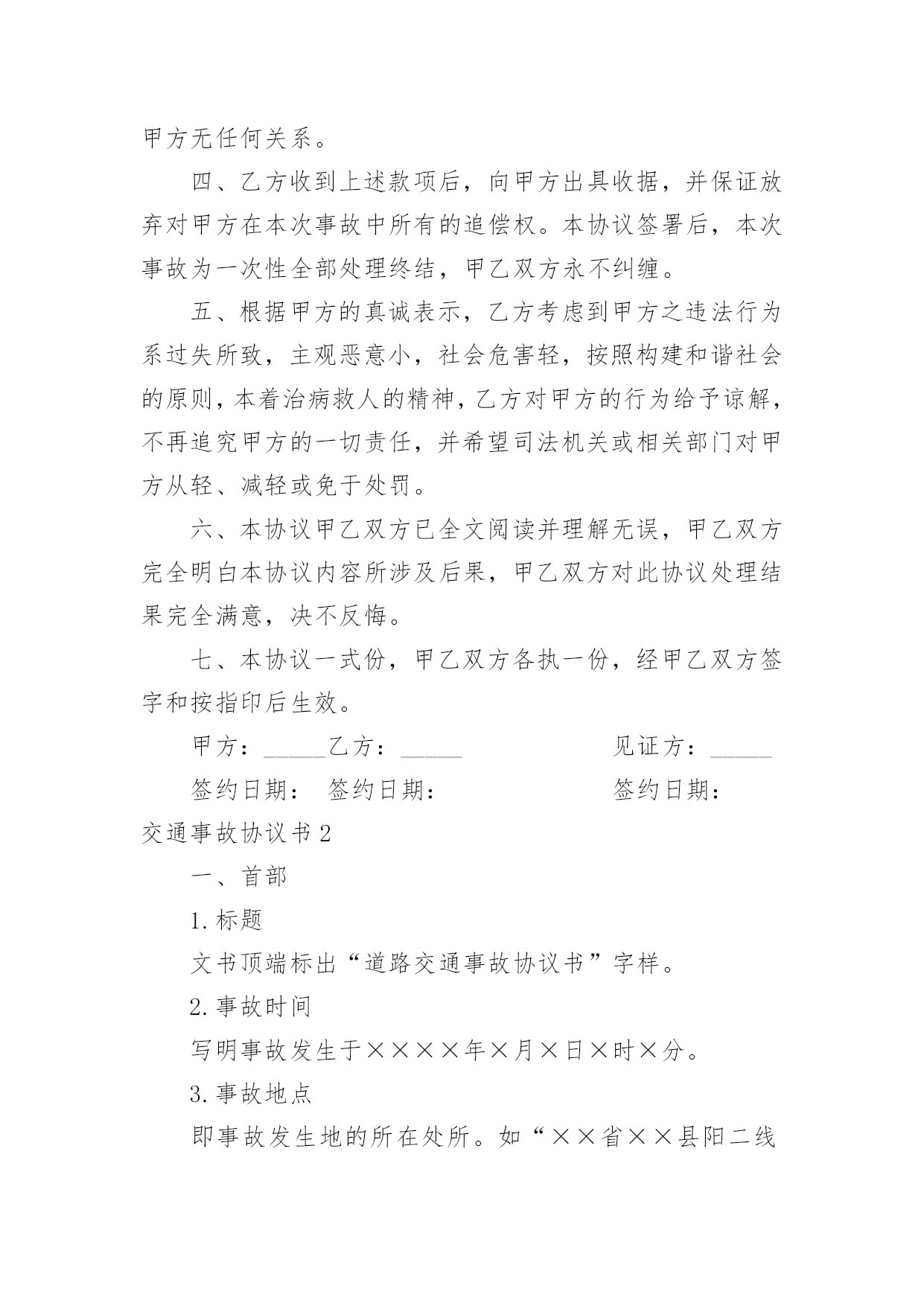 交通事故协议书交通事故协议书在不断进步的时代,协议书的使用频率呈上升趋势,签订协议书可以解决现实生活中的纠纷。那么相关的协议书到底怎么写呢?下面是小编精心整理的交通事故协议书,欢迎阅读,希望大家能够喜欢。交通事故协议书1甲方:_____(肇事者),委托代理人:_____乙方:_____(受害方),委托代理人:_____________年____月____日_____时左右,甲方驾驶_____号_____车,在_________________________处发生道路交通事故,导致_____不幸死亡。现甲方和死者的所有近亲属(乙方)经友好协商,本着平等、自愿、公平的原则,达成如下协议:一、甲方一次性赔偿乙方医疗费、抢救费、误工费、交通费、住宿费、丧葬费、被抚养人生活费、老人赡养费、死亡赔偿金、精神损害抚慰金等各项赔偿款共计人民币(大写)_____圆整(_____元整)二、死者_____的尸体由其家属自行安葬。三、上述款项支付给乙方所有近亲属后,由乙方所有近亲属内部自行分配、处理,其分配、处理的.方式、后果与甲方无任何关系。四、乙方收到上述款项后,向甲方出具收据,并保证放弃对甲方在本次事故中所有的追偿权。本协议签署后,本次事故为一次性全部处理终结,甲乙双方永不纠缠。五、根据甲方的真诚表示,乙方考虑到甲方之违法行为系过失所致,主观恶意小,社会危害轻,按照构建和谐社会的原则,本着治病救人的精神,乙方对甲方的行为给予谅解,不再追究甲方的一切责任,并希望司法机关或相关部门对甲方从轻、减轻或免于处罚。六、本协议甲乙双方已全文阅读并理解无误,甲乙双方完全明白本协议内容所涉及后果,甲乙双方对此协议处理结果完全满意,决不反悔。七、本协议一式份,甲乙双方各执一份,经甲乙双方签字和按指印后生效。甲方:_____乙方:_____见证方:_____签约日期:签约日期:签约日期:交通事故协议书2一、首部1.标题文书顶端标出“道路交通事故协议书”字样。2.事故时间写明事故发生于××××年×月×日×时×分。3.事故地点即事故发生地的所在处所。如“××省××县阳二线XXX。”4.双方当事人身份事项按顺序分别列出双方当事人的姓名、性别、年龄、单位或住址、电话及本次事故中应负的责任。身份事项应按格式中的项目要求逐一填写,力求准确、完整、明了。二、正文写明以下三方面内容:1.简述事故经过及损失情况即用扼要的文字叙述出何年何月何日在何地因何原因发生了何交通事故,造成了何后果(包括人员死亡、受伤、车辆毁坏、财物毁坏损失等),其作用是为底下的责任认定提供事实依据。2.责任认定主要写明责任的认定情况,即分析负有责任的人因为什么原因,造成什么交通事故后果,应负什么责任(全部责任、主要责任、次要责任、共同责任),这部分文字的来源应主要取材于责任认定书中的责任认定其内容。3.协议内容继责任认定之后,首先写明如下一段文字:“经调解协商,双方共同达成如下协议:”(1)确定损害赔偿的项目和数额。写明由肇事方(事故责任方)付给受损害方何种项目费用(如经济补偿费、医疗费、误工费、护理费、营养费、残疾用具费、交通费、伙食费等)人民币(或外币)××元。该项目的表述根据协商的具体要求。既可合并写,也可分项独立依次表述,如何写应视情况而定。(2)赔偿费给付方式和结案日期。这项应写明上述给付的数额是一次给付还是分期给付,如一次性给付应写明给付的期限;如分期给付应写明第一次给付的数额及期限,第二次给付的数额及期限,以利于按时履行。最后写明结案日期,“本协议于××××年×月×日在×处签字生效,双方共同遵守,不得违反,就此结案。”(三)尾部由各方当事人签字,如系单位应加盖公章,并由法定代表人签字。之下写明办案人姓名,加盖单位公章,注明制作的年月日。三、注意事项事故经过的叙述要简要明了,线索清晰,事故的'后果要书写明确,对人员的死、伤、财产的损毁表述要客观、准确。事故责任认定要科学、合理,认定的依据与认定责任要因果相关,互为关联,严密无间,顺理成章。协议内容要条理清晰,易于履行;款额用汉字大写数码,偿付款额涉及两个以上项目的要写明合计数额。用语贵在精要恰切,不能含糊不清,似是而非。调解中,如调解参加人提出《道路交通事故处理办法》未规定的赔偿项目和要求,则不予调解。上述赔偿项目应按照当地实际情况确定,并一次结算费用;赔偿的标准则应根据我国的法律规定和当事人的事故责任情况,确定承担损害后果费用的全部或一定比例。协议事项必须逐项分条具体叙述,数额要大写。道路交通事故损害赔偿调解书由各方当事人(或代理人)、办案人签名,加盖公安机关印章后即行生效。调解书一式数份,一份存入事故案卷,另几份分别送交当事人和有关人员。总之,书写交通事故协议书格式是一个复杂的过程,实践证明,由具备一定法律知识和工作经验的律师来处理,既可