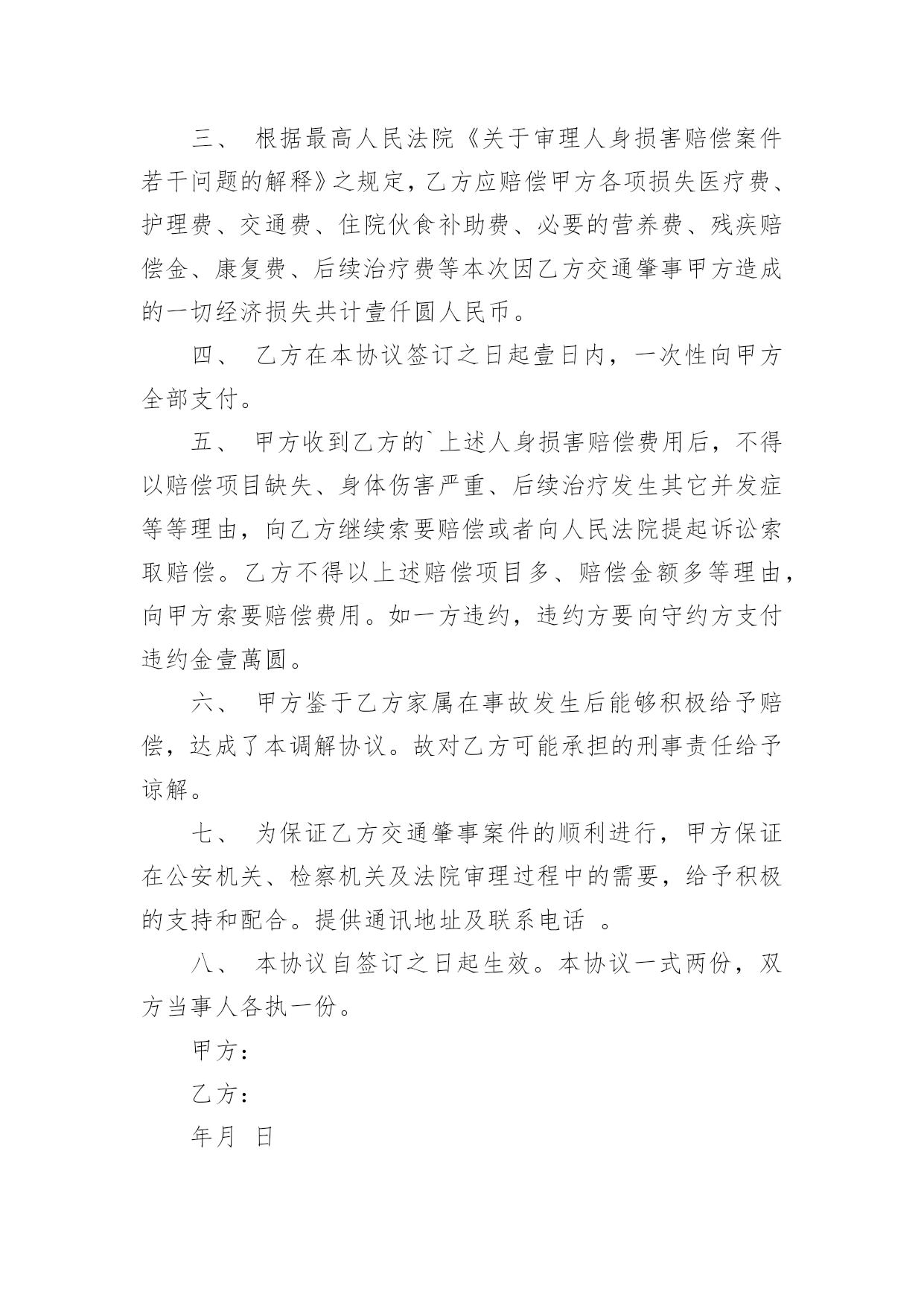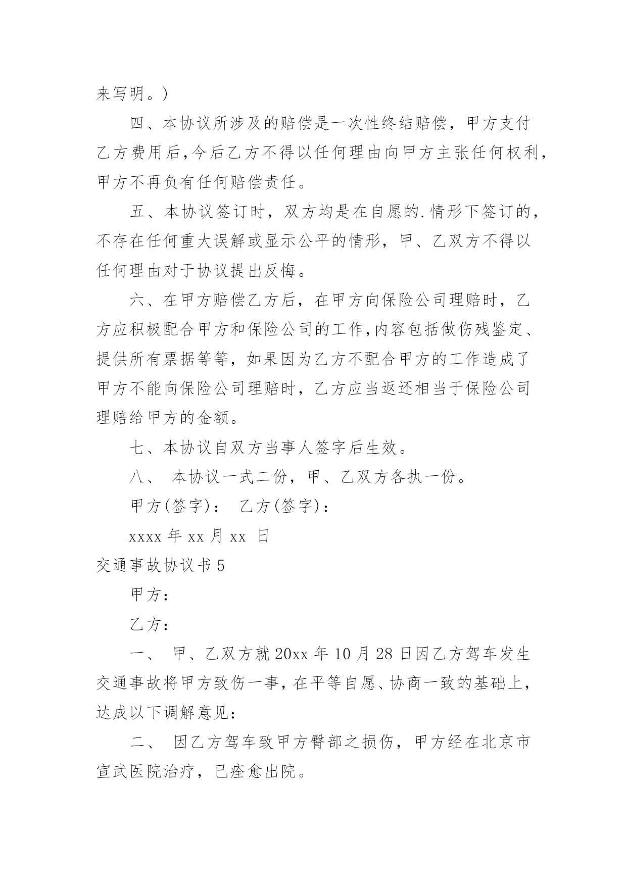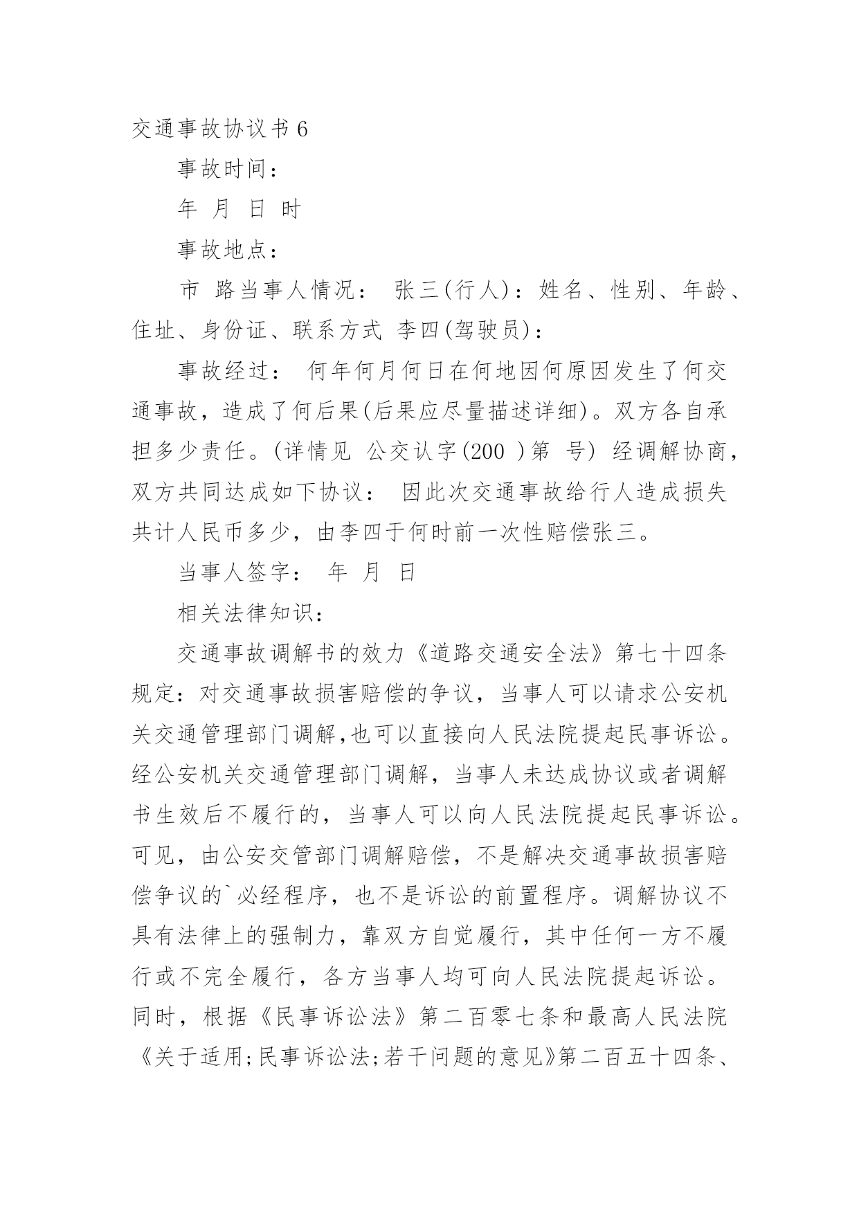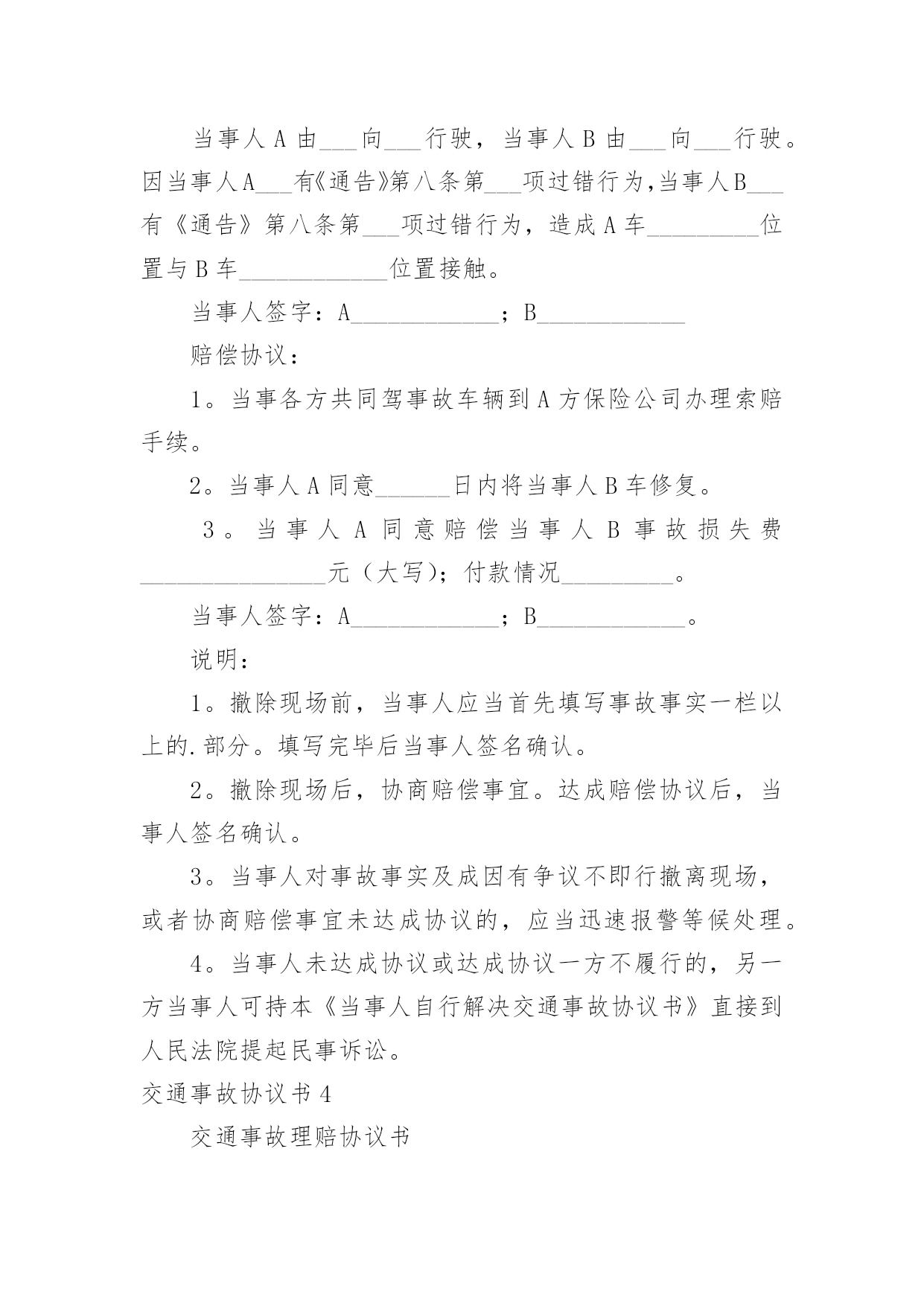 交通事故协议书交通事故协议书在不断进步的时代,协议书的使用频率呈上升趋势,签订协议书可以解决现实生活中的纠纷。那么相关的协议书到底怎么写呢?下面是小编精心整理的交通事故协议书,欢迎阅读,希望大家能够喜欢。交通事故协议书1甲方:_____(肇事者),委托代理人:_____乙方:_____(受害方),委托代理人:_____________年____月____日_____时左右,甲方驾驶_____号_____车,在_________________________处发生道路交通事故,导致_____不幸死亡。现甲方和死者的所有近亲属(乙方)经友好协商,本着平等、自愿、公平的原则,达成如下协议:一、甲方一次性赔偿乙方医疗费、抢救费、误工费、交通费、住宿费、丧葬费、被抚养人生活费、老人赡养费、死亡赔偿金、精神损害抚慰金等各项赔偿款共计人民币(大写)_____圆整(_____元整)二、死者_____的尸体由其家属自行安葬。三、上述款项支付给乙方所有近亲属后,由乙方所有近亲属内部自行分配、处理,其分配、处理的.方式、后果与甲方无任何关系。四、乙方收到上述款项后,向甲方出具收据,并保证放弃对甲方在本次事故中所有的追偿权。本协议签署后,本次事故为一次性全部处理终结,甲乙双方永不纠缠。五、根据甲方的真诚表示,乙方考虑到甲方之违法行为系过失所致,主观恶意小,社会危害轻,按照构建和谐社会的原则,本着治病救人的精神,乙方对甲方的行为给予谅解,不再追究甲方的一切责任,并希望司法机关或相关部门对甲方从轻、减轻或免于处罚。六、本协议甲乙双方已全文阅读并理解无误,甲乙双方完全明白本协议内容所涉及后果,甲乙双方对此协议处理结果完全满意,决不反悔。七、本协议一式份,甲乙双方各执一份,经甲乙双方签字和按指印后生效。甲方:_____乙方:_____见证方:_____签约日期:签约日期:签约日期:交通事故协议书2一、首部1.标题文书顶端标出“道路交通事故协议书”字样。2.事故时间写明事故发生于××××年×月×日×时×分。3.事故地点即事故发生地的所在处所。如“××省××县阳二线XXX。”4.双方当事人身份事项按顺序分别列出双方当事人的姓名、性别、年龄、单位或住址、电话及本次事故中应负的责任。身份事项应按格式中的项目要求逐一填写,力求准确、完整、明了。二、正文写明以下三方面内容:1.简述事故经过及损失情况即用扼要的文字叙述出何年何月何日在何地因何原因发生了何交通事故,造成了何后果(包括人员死亡、受伤、车辆毁坏、财物毁坏损失等),其作用是为底下的责任认定提供事实依据。2.责任认定主要写明责任的认定情况,即分析负有责任的人因为什么原因,造成什么交通事故后果,应负什么责任(全部责任、主要责任、次要责任、共同责任),这部分文字的来源应主要取材于责任认定书中的责任认定其内容。3.协议内容继责任认定之后,首先写明如下一段文字:“经调解协商,双方共同达成如下协议:”(1)确定损害赔偿的项目和数额。写明由肇事方(事故责任方)付给受损害方何种项目费用(如经济补偿费、医疗费、误工费、护理费、营养费、残疾用具费、交通费、伙食费等)人民币(或外币)××元。该项目的表述根据协商的具体要求。既可合并写,也可分项独立依次表述,如何写应视情况而定。(2)赔偿费给付方式和结案日期。这项应写明上述给付的数额是一次给付还是分期给付,如一次性给付应写明给付的期限;如分期给付应写明第一次给付的数额及期限,第二次给付的数额及期限,以利于按时履行。最后写明结案日期,“本协议于××××年×月×日在×处签字生效,双方共同遵守,不得违反,就此结案。”(三)尾部由各方当事人签字,如系单位应加盖公章,并由法定代表人签字。之下写明办案人姓名,加盖单位公章,注明制作的年月日。三、注意事项事故经过的叙述要简要明了,线索清晰,事故的'后果要书写明确,对人员的死、伤、财产的损毁表述要客观、准确。事故责任认定要科学、合理,认定的依据与认定责任要因果相关,互为关联,严密无间,顺理成章。协议内容要条理清晰,易于履行;款额用汉字大写数码,偿付款额涉及两个以上项目的要写明合计数额。用语贵在精要恰切,不能含糊不清,似是而非。调解中,如调解参加人提出《道路交通事故处理办法》未规定的赔偿项目和要求,则不予调解。上述赔偿项目应按照当地实际情况确定,并一次结算费用;赔偿的标准则应根据我国的法律规定和当事人的事故责任情况,确定承担损害后果费用的全部或一定比例。协议事项必须逐项分条具体叙述,数额要大写。道路交通事故损害赔偿调解书由各方当事人(或代理人)、办案人签名,加盖公安机关印章后即行生效。调解书一式数份,一份存入事故案卷,另几份分别送交当事人和有关人员。总之,书写交通事故协议书格式是一个复杂的过程,实践证明,由具备一定法律知识和工作经验的律师来处理,既可