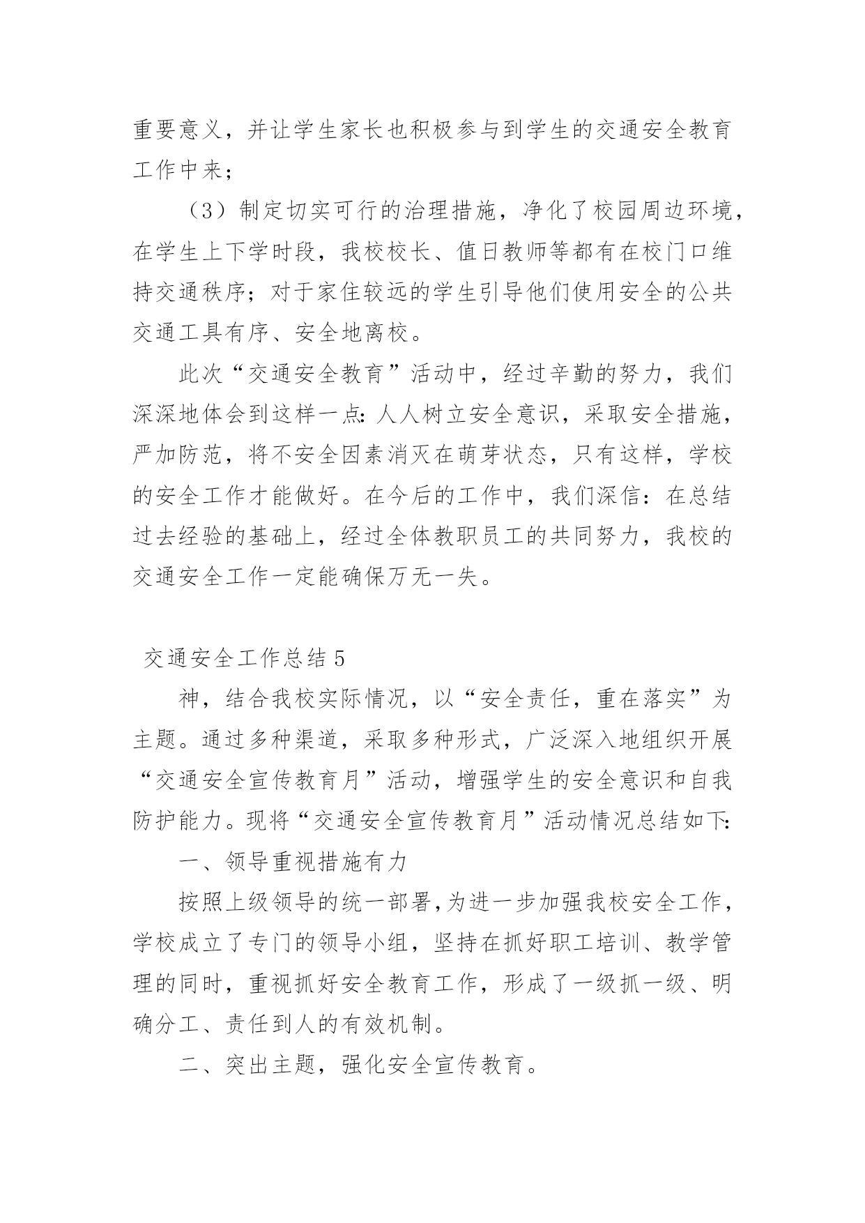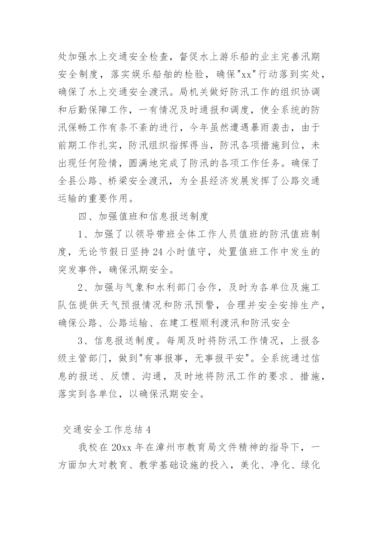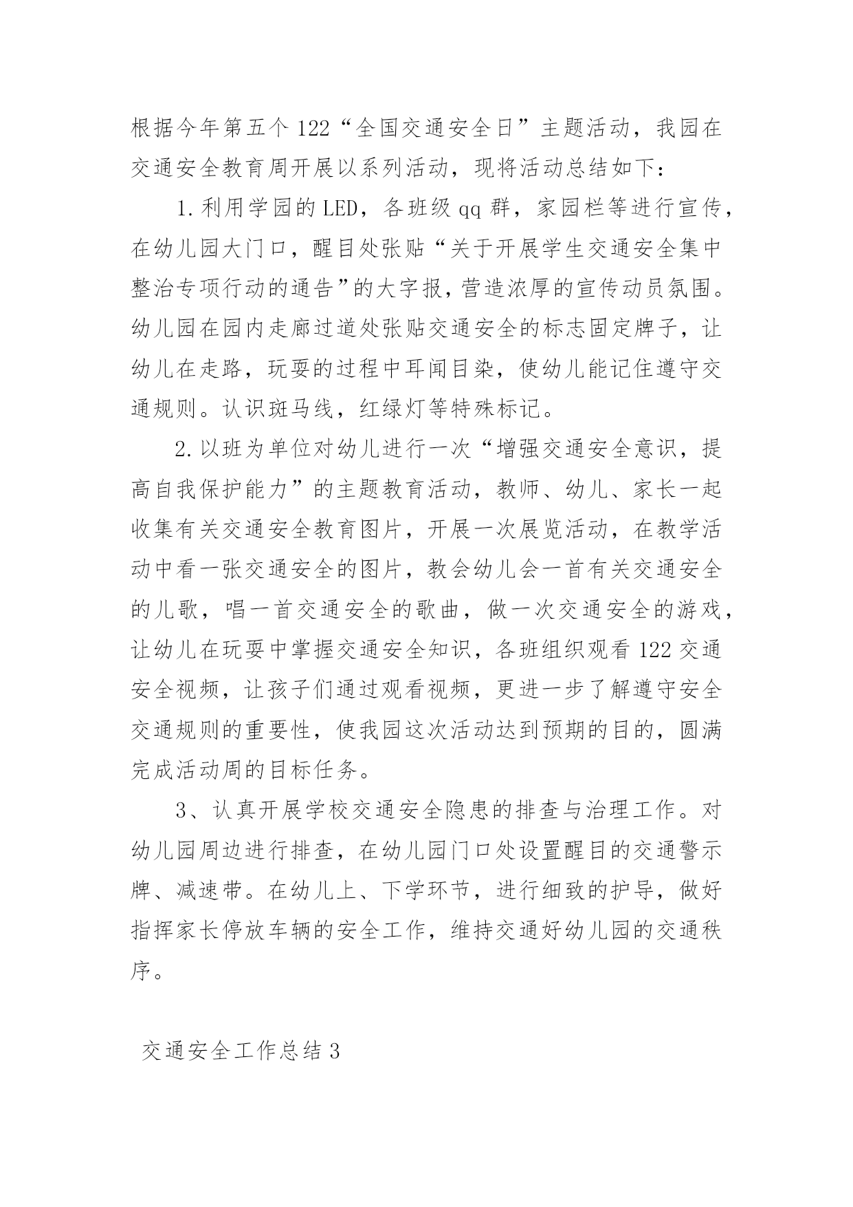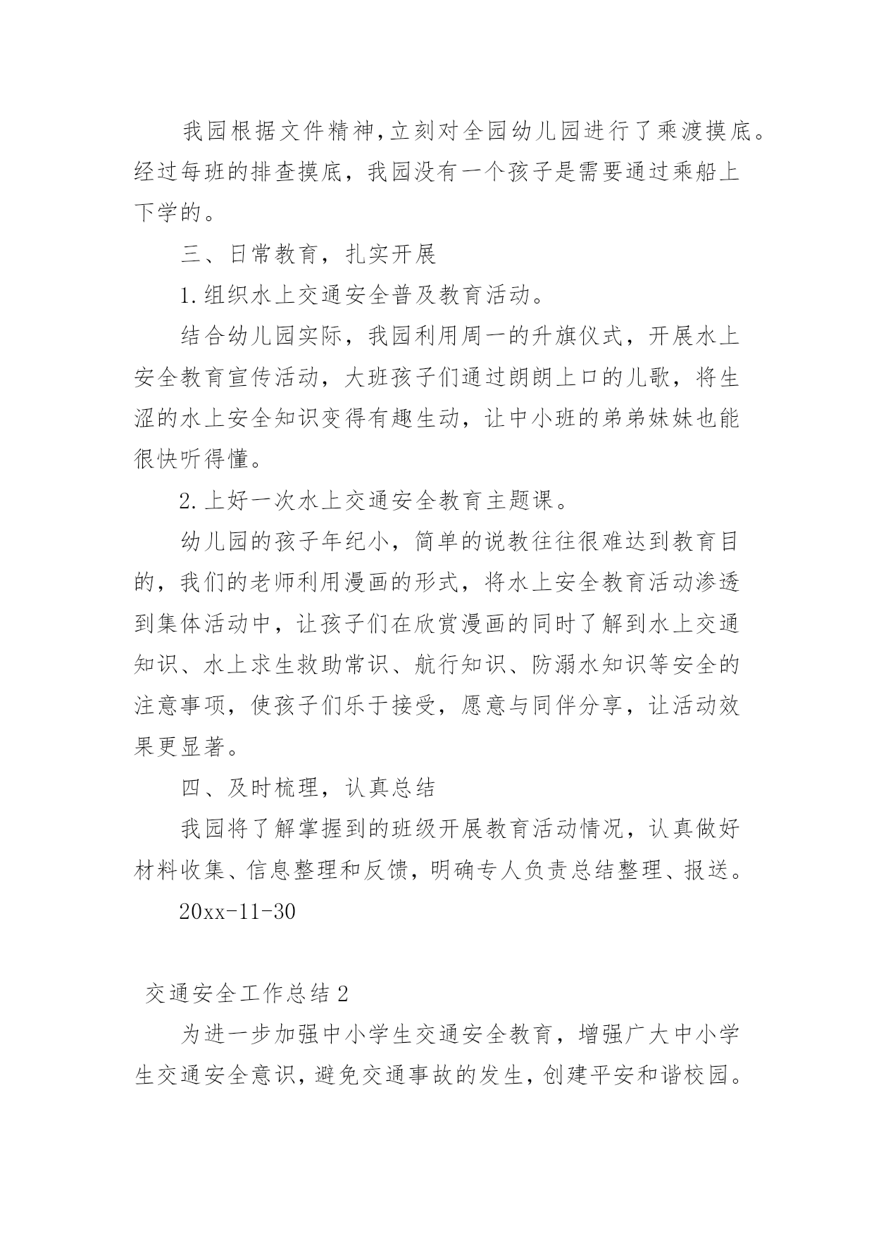 交通安全工作总结总结是事后对某一阶段的学习、工作或其完成情况加以回顾和分析的一种书面材料,它可以帮助我们有寻找学习和工作中的规律,不妨让我们认真地完成总结吧。总结你想好怎么写了吗?下面是小编收集整理的交通安全工作总结,供大家参考借鉴,希望可以帮助到有需要的朋友。交通安全工作总结1我单位根据上级部门转发的《关于转发中华人民共和国海事局、教育厅组织开展水上交通安全知识进校园活动实施方案的通知》精神,结合本单位实际及幼儿年龄特点,及时组织开展了系列水上交通安全教育活动,现将活动情况总结如下:一、领导重视,分工明确幼儿园在接到上级文件后,立刻召开安全领导小组会议,安全领导小组成员即为水上交通安全活动领导小组成员。组长:园长书记副组长:副园长组员:工会主席、保教主任、班段长职责:组长负责全面统筹安排;副组长负责管理、指导具体水上安全教育;保教主任负责工作的材料收集及总结;班段长负责水上安全工作的教育内容的安排、检查、落实。二、对照文件,排查摸底我园根据文件精神,立刻对全园幼儿园进行了乘渡摸底。经过每班的排查摸底,我园没有一个孩子是需要通过乘船上下学的。三、日常教育,扎实开展1.组织水上交通安全普及教育活动。结合幼儿园实际,我园利用周一的升旗仪式,开展水上安全教育宣传活动,大班孩子们通过朗朗上口的儿歌,将生涩的水上安全知识变得有趣生动,让中小班的弟弟妹妹也能很快听得懂。2.上好一次水上交通安全教育主题课。幼儿园的孩子年纪小,简单的说教往往很难达到教育目的,我们的老师利用漫画的形式,将水上安全教育活动渗透到集体活动中,让孩子们在欣赏漫画的同时了解到水上交通知识、水上求生救助常识、航行知识、防溺水知识等安全的注意事项,使孩子们乐于接受,愿意与同伴分享,让活动效果更显著。四、及时梳理,认真总结我园将了解掌握到的班级开展教育活动情况,认真做好材料收集、信息整理和反馈,明确专人负责总结整理、报送。20xx-11-30交通安全工作总结2为进一步加强中小学生交通安全教育,增强广大中小学生交通安全意识,避免交通事故的发生,创建平安和谐校园。根据今年第五个122“全国交通安全日”主题活动,我园在交通安全教育周开展以系列活动,现将活动总结如下:1.利用学园的LED,各班级qq群,家园栏等进行宣传,在幼儿园大门口,醒目处张贴“关于开展学生交通安全集中整治专项行动的通告”的大字报,营造浓厚的宣传动员氛围。幼儿园在园内走廊过道处张贴交通安全的标志固定牌子,让幼儿在走路,玩耍的过程中耳闻目染,使幼儿能记住遵守交通规则。认识斑马线,红绿灯等特殊标记。2.以班为单位对幼儿进行一次“增强交通安全意识,提高自我保护能力”的主题教育活动,教师、幼儿、家长一起收集有关交通安全教育图片,开展一次展览活动,在教学活动中看一张交通安全的图片,教会幼儿会一首有关交通安全的儿歌,唱一首交通安全的歌曲,做一次交通安全的游戏,让幼儿在玩耍中掌握交通安全知识,各班组织观看122交通安全视频,让孩子们通过观看视频,更进一步了解遵守安全交通规则的重要性,使我园这次活动达到预期的目的,圆满完成活动周的目标任务。3、认真开展学校交通安全隐患的排查与治理工作。对幼儿园周边进行排查,在幼儿园门口处设置醒目的交通警示牌、减速带。在幼儿上、下学环节,进行细致的护导,做好指挥家长停放车辆的安全工作,维持交通好幼儿园的交通秩序。交通安全工作总结3今年x月进入汛期以来,我局坚持以"防大汛、保畅通、保安全"为工作目标,把防洪抢险与隐患整治结合起来,做到思想早发动、工作早布置、措施早制定、人员及机具物质早落实。通过全体干部职工的共同努力,确保了全年汛期交通防汛抢险工作的全面完成,现将20xx年汛期工作的开展情况总结如下:一、提高认识加强领导为了确保公路交通运输安全渡汛,为最大限度的预防和减少洪涝灾害造成的损失,为县域经济的发展创造良好的道路交通环境,局里成立了由局长xx为组长、分管领导为副组长、各单位主要负责人为成员的防汛抢险工作领导小组,对防汛抢险工作进行统一调度和指挥,制定和下发了《xxxxxx》以及《防汛抢险工作预案》,明确了各单位各部门的职责任务,落实了值班制度和人员,为安全渡汛提供了坚强的组织保障。二、狠抓落实确保防汛准备工作落到实处在汛期来临之前,局防汛抢险工作领导小组组织召开了全局全体干部职工参加的防汛工作动员会,对防汛工作进行了安排布置,明确了各单位的职责任务,组建了防汛抢险应急队伍,明确了应急队员的纪律,要求全天侯通讯畅通,做到能够随时应急;落实防汛抢险机具器材,公管所装载机x台、挖掘机x台、压路机x台、双排座货车x辆、自卸车x辆、桥梁临时抢险工字钢x米、河沙及豆石x立方米、铁铲x余把、锄头x余把、示警锥80余个,安全警示牌x余块;运管所客车x辆、货车x辆、警戒联络车x辆;路政所编织袋x条、铁铲x