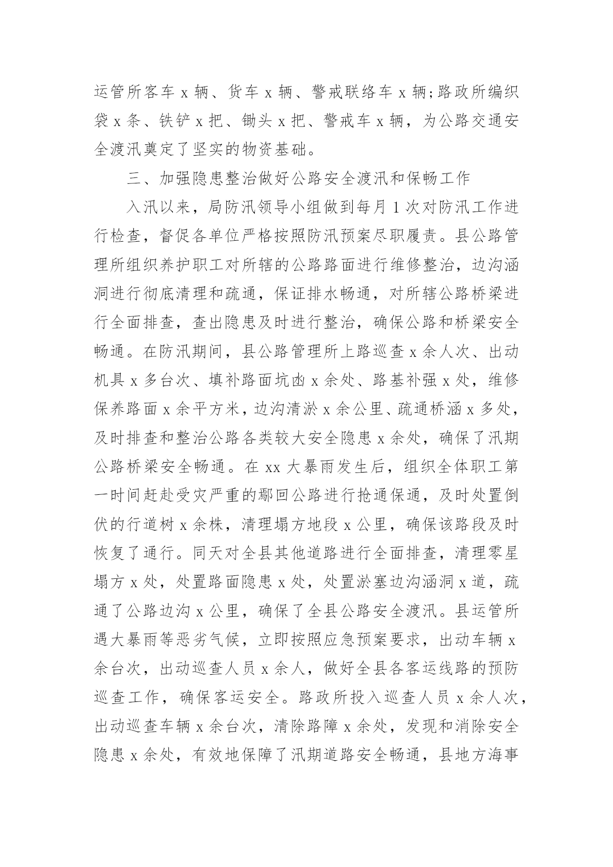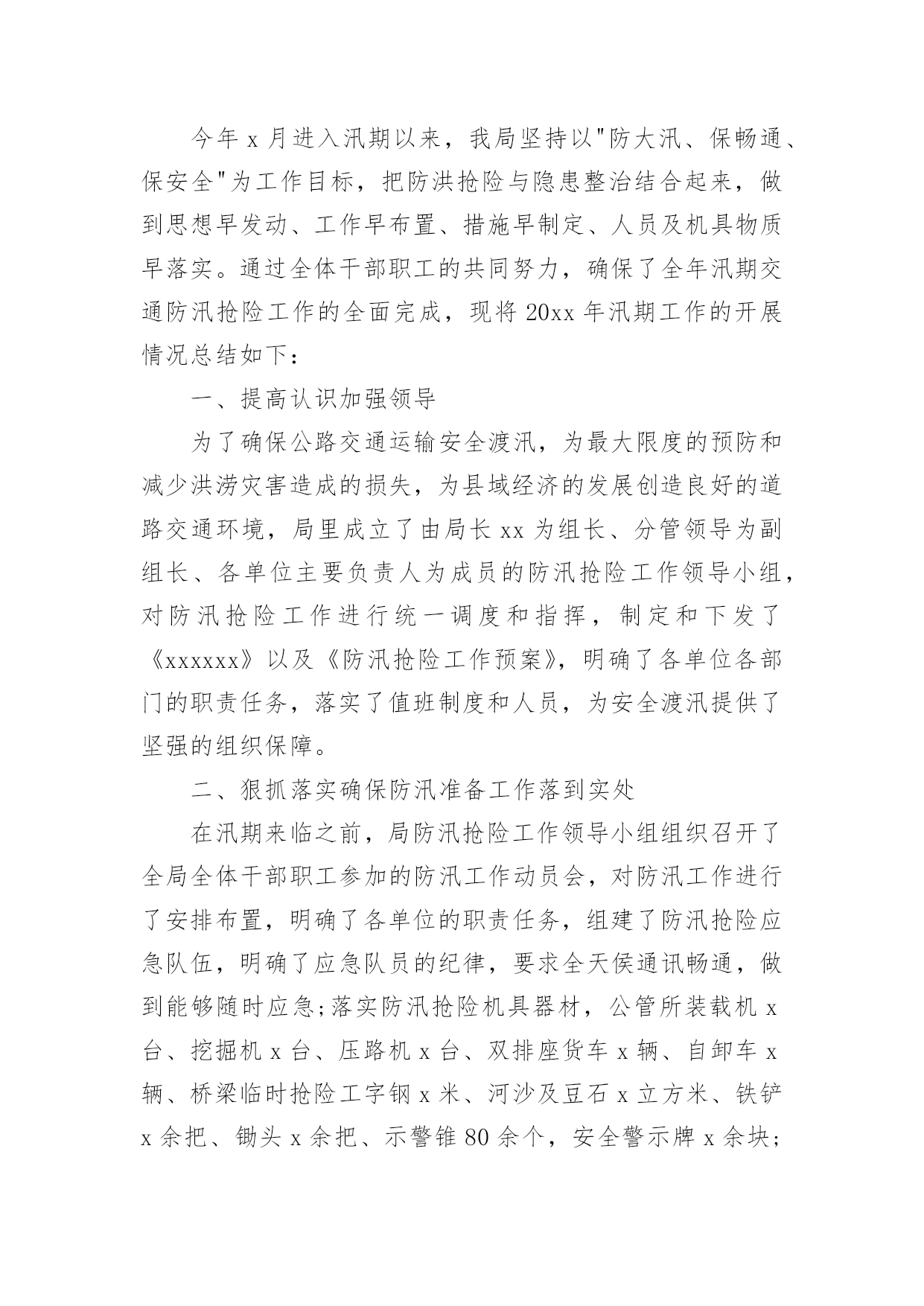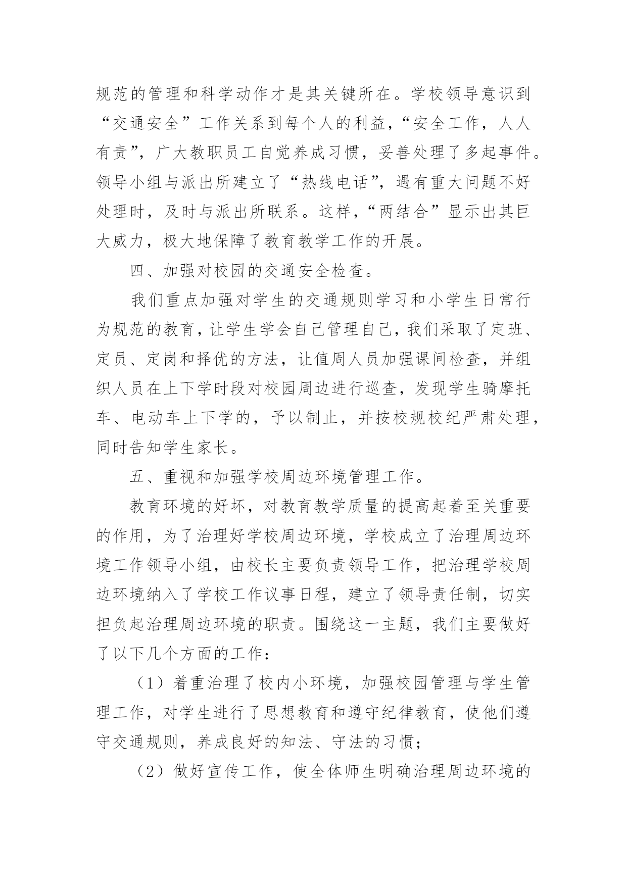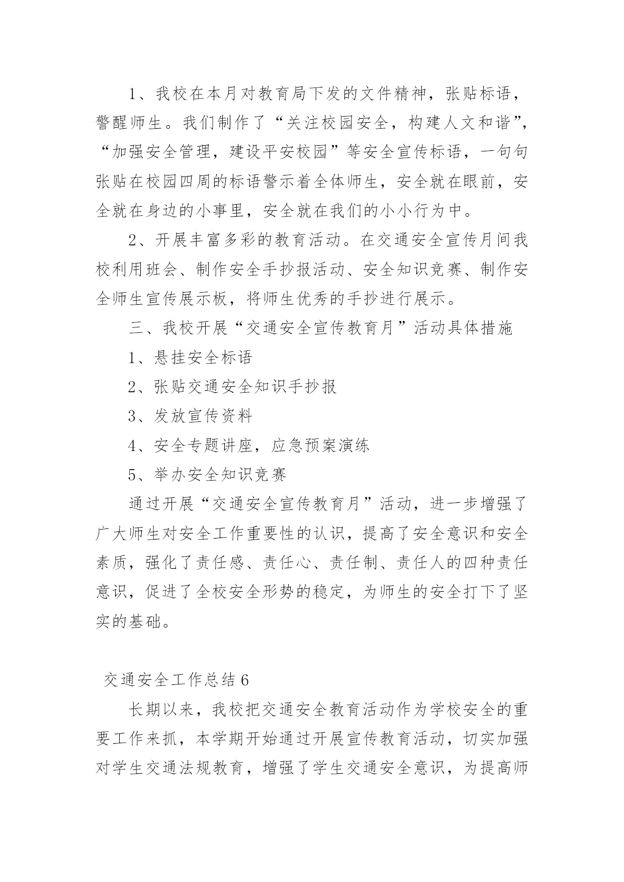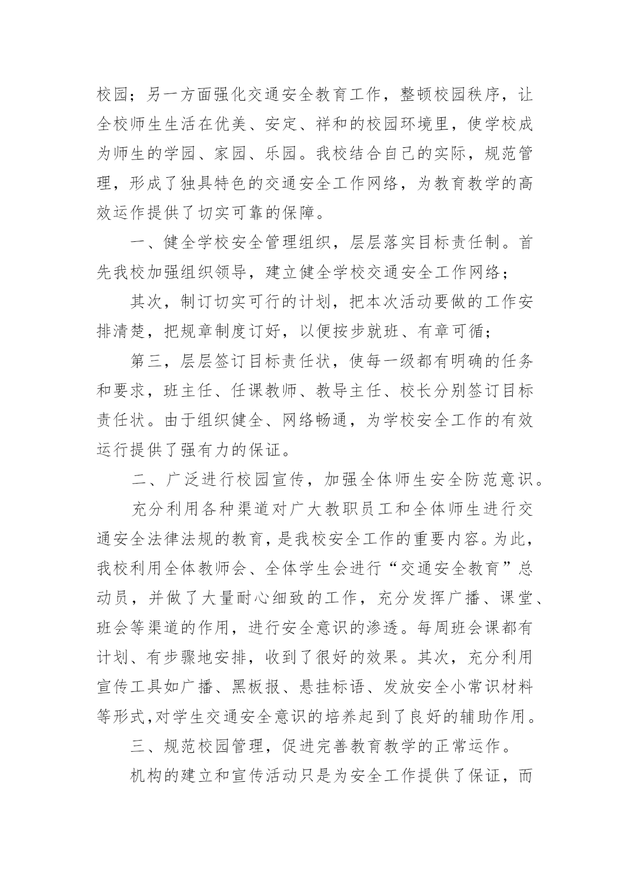 交通安全工作总结总结是事后对某一阶段的学习、工作或其完成情况加以回顾和分析的一种书面材料,它可以帮助我们有寻找学习和工作中的规律,不妨让我们认真地完成总结吧。总结你想好怎么写了吗?下面是小编收集整理的交通安全工作总结,供大家参考借鉴,希望可以帮助到有需要的朋友。交通安全工作总结1我单位根据上级部门转发的《关于转发中华人民共和国海事局、教育厅组织开展水上交通安全知识进校园活动实施方案的通知》精神,结合本单位实际及幼儿年龄特点,及时组织开展了系列水上交通安全教育活动,现将活动情况总结如下:一、领导重视,分工明确幼儿园在接到上级文件后,立刻召开安全领导小组会议,安全领导小组成员即为水上交通安全活动领导小组成员。组长:园长书记副组长:副园长组员:工会主席、保教主任、班段长职责:组长负责全面统筹安排;副组长负责管理、指导具体水上安全教育;保教主任负责工作的材料收集及总结;班段长负责水上安全工作的教育内容的安排、检查、落实。二、对照文件,排查摸底我园根据文件精神,立刻对全园幼儿园进行了乘渡摸底。经过每班的排查摸底,我园没有一个孩子是需要通过乘船上下学的。三、日常教育,扎实开展1.组织水上交通安全普及教育活动。结合幼儿园实际,我园利用周一的升旗仪式,开展水上安全教育宣传活动,大班孩子们通过朗朗上口的儿歌,将生涩的水上安全知识变得有趣生动,让中小班的弟弟妹妹也能很快听得懂。2.上好一次水上交通安全教育主题课。幼儿园的孩子年纪小,简单的说教往往很难达到教育目的,我们的老师利用漫画的形式,将水上安全教育活动渗透到集体活动中,让孩子们在欣赏漫画的同时了解到水上交通知识、水上求生救助常识、航行知识、防溺水知识等安全的注意事项,使孩子们乐于接受,愿意与同伴分享,让活动效果更显著。四、及时梳理,认真总结我园将了解掌握到的班级开展教育活动情况,认真做好材料收集、信息整理和反馈,明确专人负责总结整理、报送。20xx-11-30交通安全工作总结2为进一步加强中小学生交通安全教育,增强广大中小学生交通安全意识,避免交通事故的发生,创建平安和谐校园。根据今年第五个122“全国交通安全日”主题活动,我园在交通安全教育周开展以系列活动,现将活动总结如下:1.利用学园的LED,各班级qq群,家园栏等进行宣传,在幼儿园大门口,醒目处张贴“关于开展学生交通安全集中整治专项行动的通告”的大字报,营造浓厚的宣传动员氛围。幼儿园在园内走廊过道处张贴交通安全的标志固定牌子,让幼儿在走路,玩耍的过程中耳闻目染,使幼儿能记住遵守交通规则。认识斑马线,红绿灯等特殊标记。2.以班为单位对幼儿进行一次“增强交通安全意识,提高自我保护能力”的主题教育活动,教师、幼儿、家长一起收集有关交通安全教育图片,开展一次展览活动,在教学活动中看一张交通安全的图片,教会幼儿会一首有关交通安全的儿歌,唱一首交通安全的歌曲,做一次交通安全的游戏,让幼儿在玩耍中掌握交通安全知识,各班组织观看122交通安全视频,让孩子们通过观看视频,更进一步了解遵守安全交通规则的重要性,使我园这次活动达到预期的目的,圆满完成活动周的目标任务。3、认真开展学校交通安全隐患的排查与治理工作。对幼儿园周边进行排查,在幼儿园门口处设置醒目的交通警示牌、减速带。在幼儿上、下学环节,进行细致的护导,做好指挥家长停放车辆的安全工作,维持交通好幼儿园的交通秩序。交通安全工作总结3今年x月进入汛期以来,我局坚持以"防大汛、保畅通、保安全"为工作目标,把防洪抢险与隐患整治结合起来,做到思想早发动、工作早布置、措施早制定、人员及机具物质早落实。通过全体干部职工的共同努力,确保了全年汛期交通防汛抢险工作的全面完成,现将20xx年汛期工作的开展情况总结如下:一、提高认识加强领导为了确保公路交通运输安全渡汛,为最大限度的预防和减少洪涝灾害造成的损失,为县域经济的发展创造良好的道路交通环境,局里成立了由局长xx为组长、分管领导为副组长、各单位主要负责人为成员的防汛抢险工作领导小组,对防汛抢险工作进行统一调度和指挥,制定和下发了《xxxxxx》以及《防汛抢险工作预案》,明确了各单位各部门的职责任务,落实了值班制度和人员,为安全渡汛提供了坚强的组织保障。二、狠抓落实确保防汛准备工作落到实处在汛期来临之前,局防汛抢险工作领导小组组织召开了全局全体干部职工参加的防汛工作动员会,对防汛工作进行了安排布置,明确了各单位的职责任务,组建了防汛抢险应急队伍,明确了应急队员的纪律,要求全天侯通讯畅通,做到能够随时应急;落实防汛抢险机具器材,公管所装载机x台、挖掘机x台、压路机x台、双排座货车x辆、自卸车x辆、桥梁临时抢险工字钢x米、河沙及豆石x立方米、铁铲x余把、锄头x余把、示警锥80余个,安全警示牌x余块;运管所客车x辆、货车x辆、警戒联络车x辆;路政所编织袋x条、铁铲x