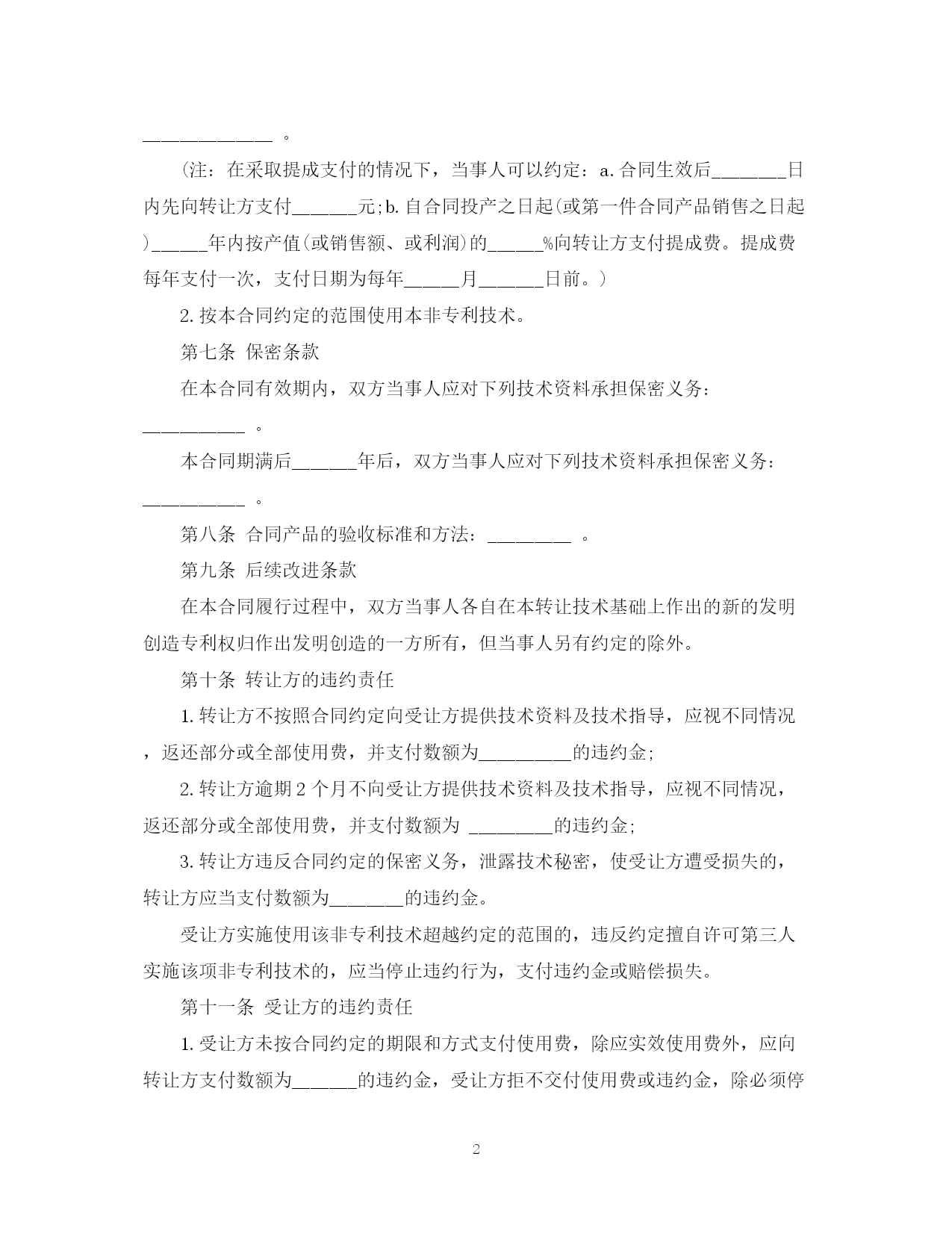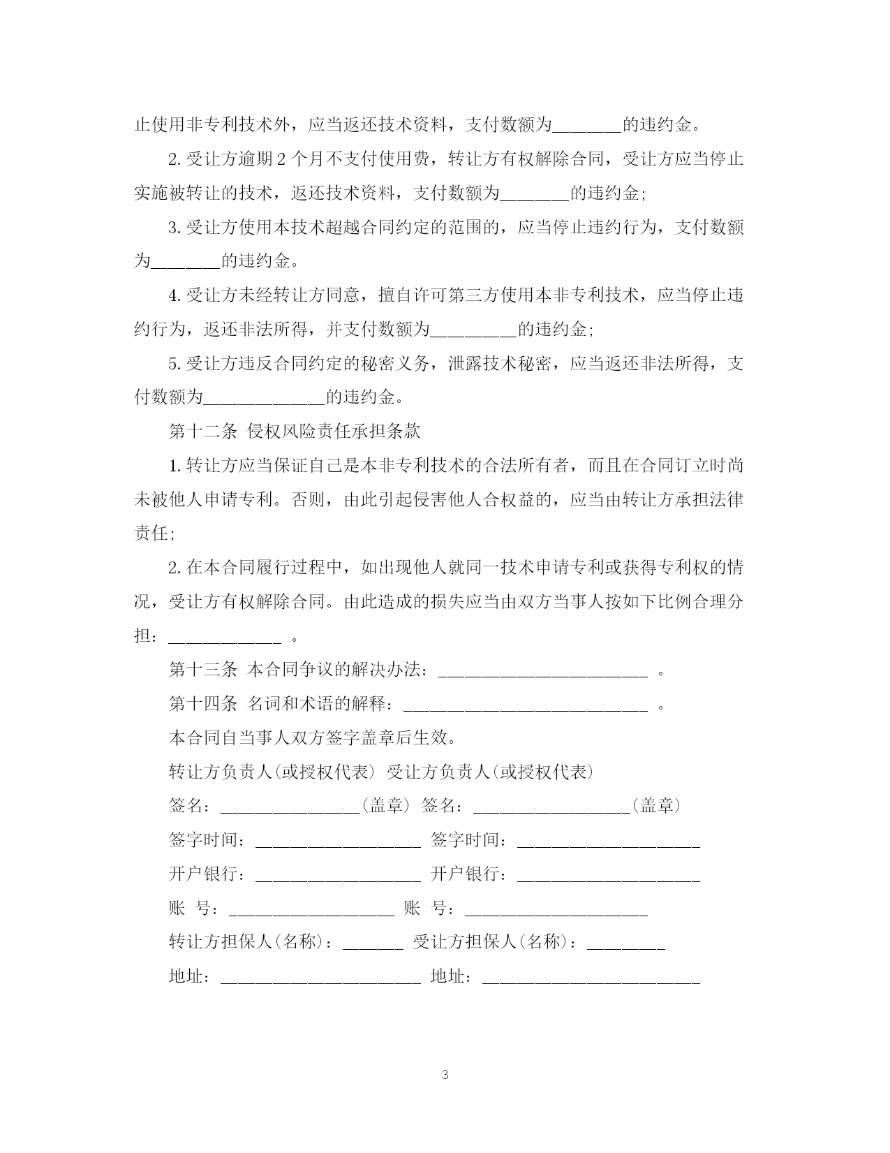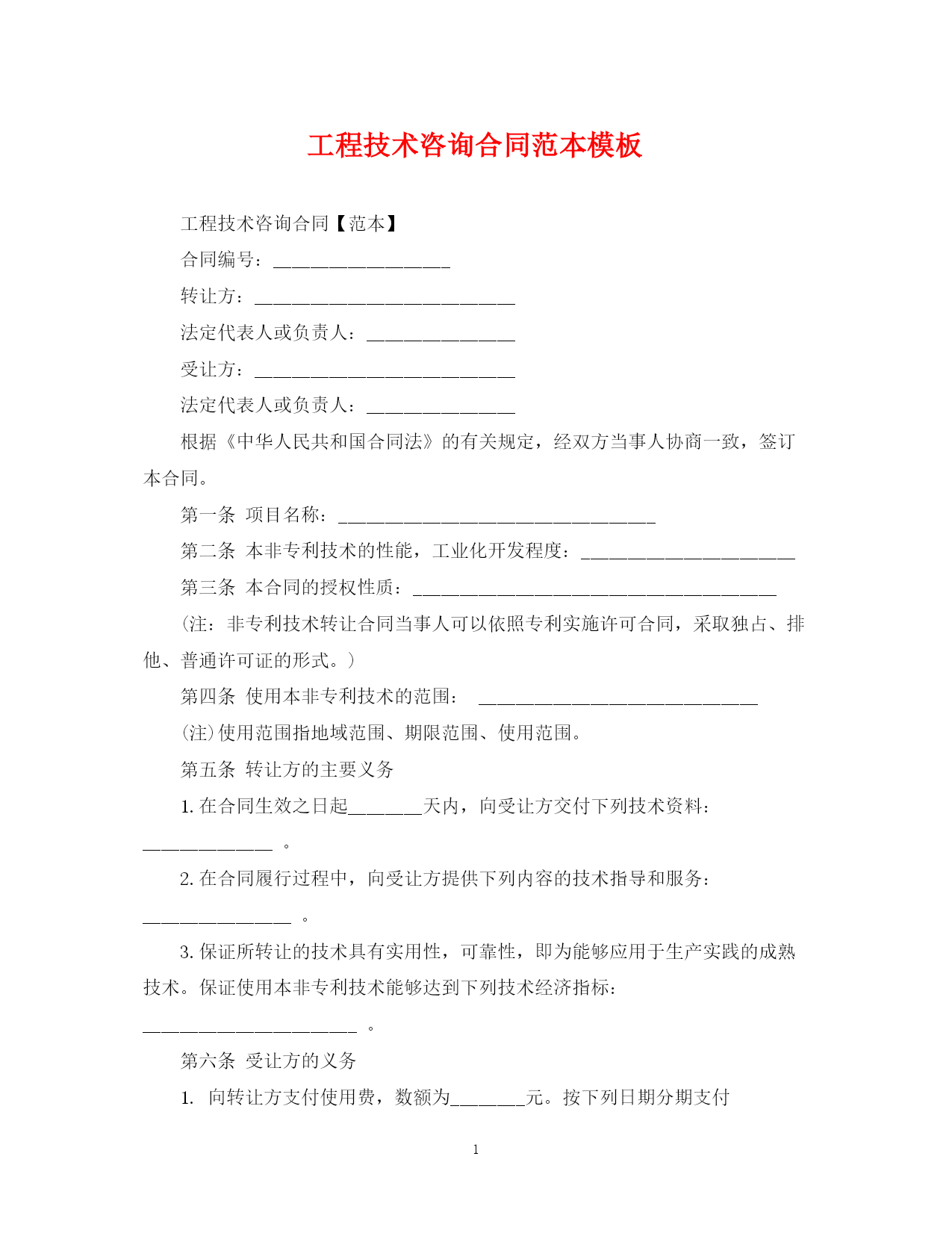 此资料由网络收集而来,如有侵权请告知上传者立即删除。资料共分享,我们负责传递知识。PAGEPAGE3工程技术咨询合同范本模板工程技术咨询合同【范本】合同编号:___________________转让方:____________________________法定代表人或负责人:________________受让方:____________________________法定代表人或负责人:________________根据《中华人民共和国合同法》的有关规定,经双方当事人协商一致,签订本合同。第一条项目名称:__________________________________第二条本非专利技术的性能,工业化开发程度:_______________________第三条本合同的授权性质:_______________________________________(注:非专利技术转让合同当事人可以依照专利实施许可合同,采取独占、排他、普通许可证的形式。)第四条使用本非专利技术的范围:______________________________(注)使用范围指地域范围、期限范围、使用范围。第五条转让方的主要义务1.在合同生效之日起________天内,向受让方交付下列技术资料:______________。2.在合同履行过程中,向受让方提供下列内容的技术指导和服务:________________。3.保证所转让的技术具有实用性,可靠性,即为能够应用于生产实践的成熟技术。保证使用本非专利技术能够达到下列技术经济指标:_______________________。第六条受让方的义务1.向转让方支付使用费,数额为________元。按下列日期分期支付______________。(注:在采取提成支付的情况下,当事人可以约定:a.合同生效后________日内先向转让方支付_______元;b.自合同投产之日起(或第一件合同产品销售之日起)______年内按产值(或销售额、或利润)的______%向转让方支付提成费。提成费每年支付一次,支付日期为每年______月_______日前。)2.按本合同约定的范围使用本非专利技术。第七条保密条款在本合同有效期内,双方当事人应对下列技术资料承担保密义务:___________。本合同期满后_______年后,双方当事人应对下列技术资料承担保密义务:___________。第八条合同产品的验收标准和方法:_________。第九条后续改进条款在本合同履行过程中,双方当事人各自在本转让技术基础上作出的新的发明创造专利权归作出发明创造的一方所有,但当事人另有约定的除外。第十条转让方的违约责任1.转让方不按照合同约定向受让方提供技术资料及技术指导,应视不同情况,返还部分或全部使用费,并支付数额为__________的违约金;2.转让方逾期2个月不向受让方提供技术资料及技术指导,应视不同情况,返还部分或全部使用费,并支付数额为_________的违约金;3.转让方违反合同约定的保密义务,泄露技术秘密,使受让方遭受损失的,转让方应当支付数额为________的违约金。受让方实施使用该非专利技术超越约定的范围的,违反约定擅自许可第三人实施该项非专利技术的,应当停止违约行为,支付违约金或赔偿损失。第十一条受让方的违约责任1.受让方未按合同约定的期限和方式支付使用费,除应实效使用费外,应向转让方支付数额为_______的违约金,受让方拒不交付使用费或违约金,除必须停止使用非专利技术外,应当返还技术资料,支付数额为________的违约金。2.受让方逾期2个月不支付使用费,转让方有权解除合同,受让方应当停止实施被转让的技术,返还技术资料,支付数额为________的违约金;3.受让方使用本技术超越合同约定的范围的,应当停止违约行为,支付数额为________的违约金。4.受让方未经转让方同意,擅自许可第三方使用本非专利技术,应当停止违约行为,返还非法所得,并支付数额为__________的违约金;5.受让方违反合同约定的秘密义务,泄露技术秘密,应当返还非法所得,支付数额为______________的违约金。第十二条侵权风险责任承担条款1.转让方应当保证自己是本非专利技术的合法所有者,而且在合同订立时尚未被他人申请专利。否则,由此引起侵害他人合权益的,应当由转让方承担法律责任;2.在本合同履行过程中,如出现他人就同一技术申请专利或获得专利权的情况,受让方有权解除合同。由此造成的损失应当由双方当事人按如下比例合理分担:_____________。第十三条本合同争议的解决办法:_______________