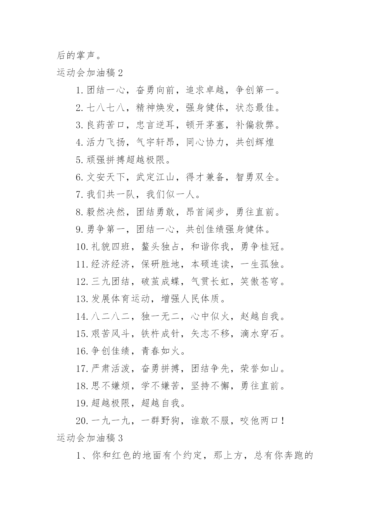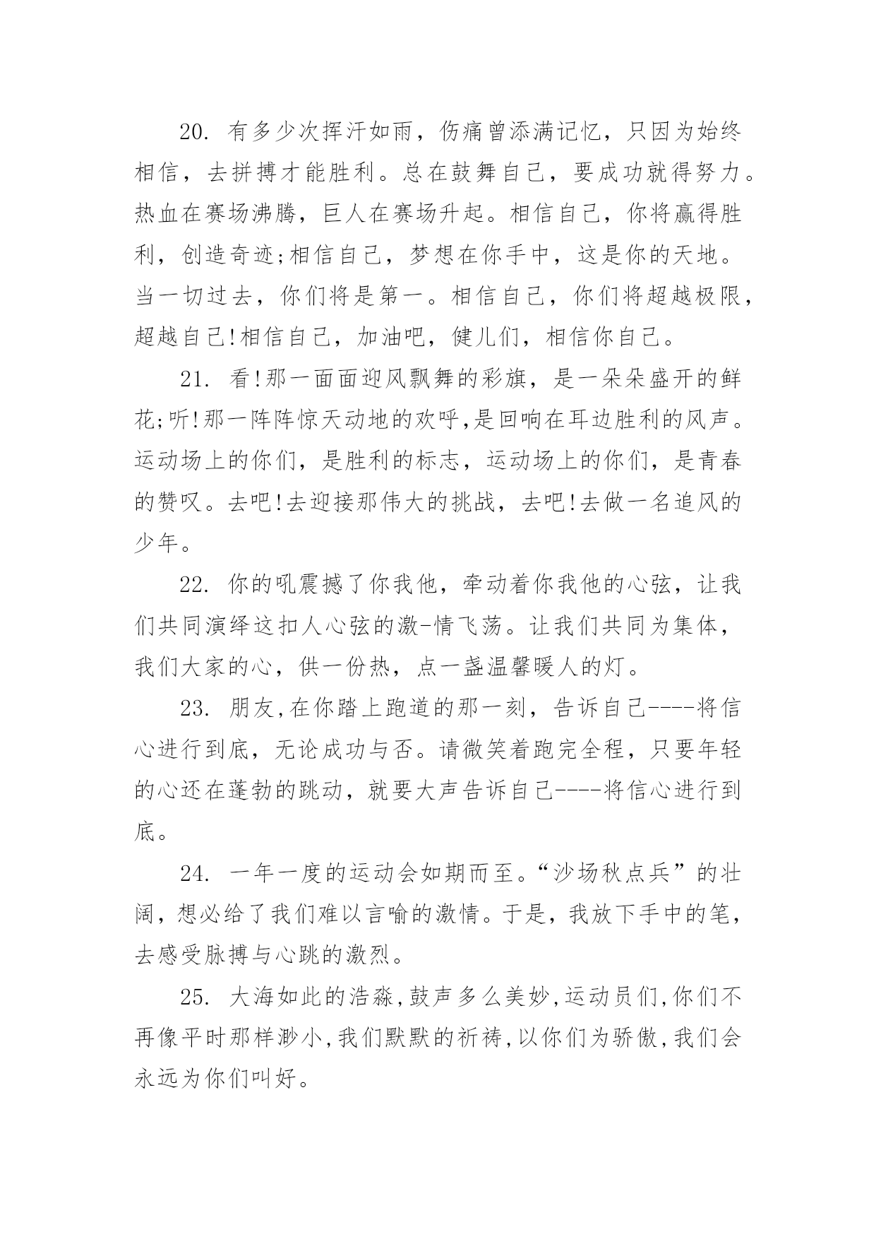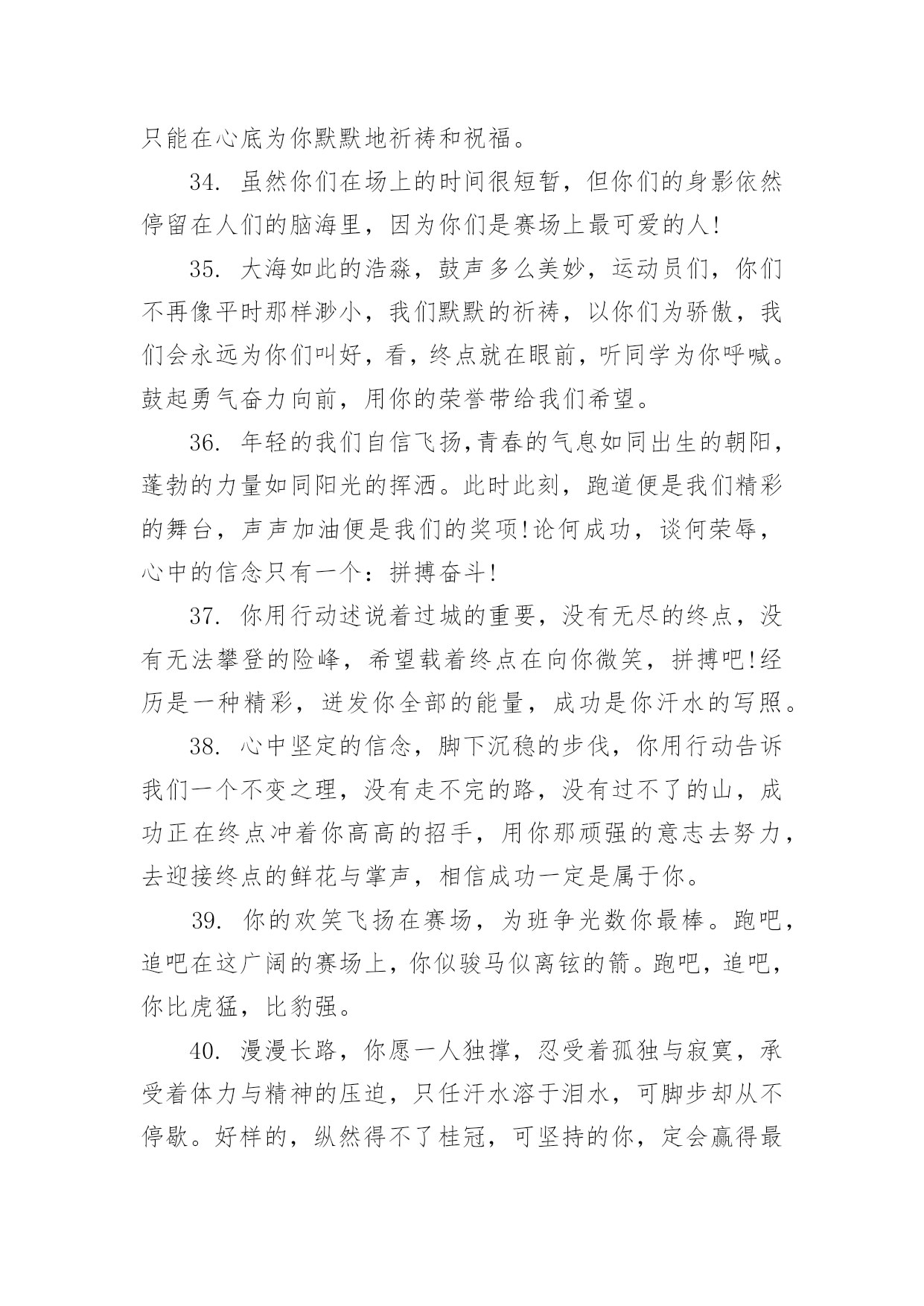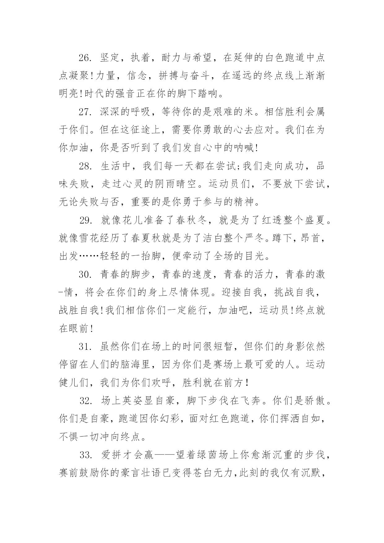 运动会加油稿运动会加油稿在快速变化和不断变革的今天,能够利用到加油稿的场合越来越多,借助加油稿可以给对方传达鼓励。相信很多朋友都对写加油稿感到非常苦恼吧,以下是小编整理的运动会加油稿,仅供参考,欢迎大家阅读。运动会加油稿11.青春的脚步,青春的速度,青春的活力,青春的激情,将会在你们的身上尽情体现。迎接自我,挑战自我,战胜自我!我们相信你们一定能行,加油吧,运动员!终点就在眼前!2.温暖的阳光洒在赛场上,男子乙组标枪的比赛即将开始。赛场上,一道道优美的弧线将轻盈地划过天空。健儿们用手中的标枪向距离的权限发起一轮又一轮的挑战。标枪在空中轻盈的姿态,是健儿们强健的力量和熟练的技巧的结合。谁能在这场激烈的竞争中获胜?让我们拭目以待,让我们为他们呐喊、助威吧!只有将力量与技巧合二为一的人,才能获得胜利的桂冠!3.年轻的我们自信飞扬,青春的气息如同出生的朝阳,蓬勃的力量如同阳光的挥洒。此时此刻,跑道便是我们精彩的舞台,声声加油便是我们最高的奖项!论何成功,谈何荣辱,心中的信念只有一个:拼搏!萧瑟的秋风,挡不住你们破竹的锐气。4.不长不短的距离,需要的是全身心全程投入,自始至终你们都在拼全力此时此刻,你们处在最风光的一刻,无论第几坚持胜利的信心,只要跑下来,你们就是英雄。5.广阔的绿茵场,是为你们搭建的舞台。张扬吧,年轻的心,我们将为你永远喝彩!泰戈尔在诗中说,天空没有翅膀的影子,但我已飞过;艾青对朋友说,也许有人到达不了彼岸,但我们共同拥有大海。也许你们没有显赫的成绩,但运动场上留下了你们的足迹。也许你们没有奖品,但我们心中留下了你们拼搏的身影。所有的努力都是为了迎接这一刹那,所有的拼搏都是为了这一声令下。6.就像花儿准备了春、秋、冬,就是为了红透整个盛夏。就像雪花经历了春、夏、秋就是为了洁白整个严冬。蹲下,昂首,出发……轻轻的一抬脚,便牵动了全场的目光潇洒的迫挥挥手,便满足了那一份无言的等待。迎着朝阳,你们踏歌而去,背着希望,我们等待你们的归来。7.百米迸发的.是无穷的力量,温暖的是我们的家,演绎的是团结友爱。也许你心理忐忑不安,我们的心里早已热血沸腾。8.昔日,长长的跑道上,留下了你深深的足迹,抹不去你渗出的汗水,拉不动你沉重的双脚,你为分院,不在乎自己的疲倦,不在乎汗水和泪水,因为你心里有一种坚定的信念,诺大的竞技场期待着你矫健的身影,瑟瑟的秋风为你送来爽朗的气息。9.也许流星并不少见,但它燃烧的刹那,留给人间最美丽的回忆!也许笑脸并不少见,但胜利的喜悦,总会留给世界精彩的一瞬!是的,那些曾经美妙的东西只有短短的一瞬间,但那却把最辉煌的一刻留给了人间。胜利,是每个人所追求的,胜利的喜悦,是胜利与重新开始的转折,胜利是新的开始!10.踏上跑道,是一种选择。离开起点,是一种勇气。驰骋赛场,是一种胜利。11.人生的路,有坦途,也有坎坷;做过的岁月,有欢笑,也有苦涩,泪水告诉我一个跌倒的故事,汗水使我多了一份沉重,几多成熟。12.理想毕竟不同于现实,失败是生活的一部分,谁也无法选择,无法拒绝。人生要自己去拼搏,去奋斗,在风雨中百折不挠勇往前进,在集资的每个驿站上都留下一段不悔的回忆。流泪不是失落,徘徊不是迷惑,成功属于那些战胜失败,坚持不懈勇于追求梦想的人。加油吧,运动健儿们!13.踏着春天的气息,迈着轻盈的脚步,我们迎来了心仪已久的运动会。这里就是展示自我的舞台。我们向往高山的坚忍不拔,我们渴望大海的博大精深,还有,我们更痴迷于你们的速度激情。来吧,尽情释放你的活力。你的每一次冲刺,都叩动着我们的心弦;你的每一次跨越,都吸引着我们的视线;你的每一次起跳,都绷紧我们的神经。我们为你呐喊,我们为你自豪,我们为你疯狂。14.泰戈尔在诗中说,天空没有翅膀的影子,但我已飞过;艾青对朋友说,也许有人到达不了彼岸,但我们共同拥有大海。也许你们没有显赫的成绩,但运动场上留下了你们的足迹。也许你们没有奖品,但我们心中留下了你们拼搏的身影。所有的努力都是为了迎接这一刹那,所有的拼搏都是为了这一声令下。15.虽然你们在场上的时间很短暂,但你们的身影依然停留在人们的脑海里,因为你们是赛场上最可爱的人,不为掌声的注释,不为刻意的征服,不为失败的痛苦,只有辛勤的汗水化作成功的脚步。16.手握铅球,心有成竹虽有几分沉重,几分辛苦正现人之本色,豪情万丈一声嚎去,只见铅球已飞出呀,太棒了,我为你欢呼!我为你骄傲!17.心中坚定的信念,脚下沉稳的步伐,你用行动告诉我们一个不变之理,没有走不完的路,没有过不了的山,成功正在终点冲着你高高的招手,用你那顽强的意志去努力,去迎接终点的鲜花与掌声,相信成功一定是属于你。18.坚定,执着,耐力与希望,在延伸的白色跑道中点点凝聚!力量,信念,拼搏与奋斗,在遥远的终点线上渐渐明亮!时代的强音正在你的脚下踏响。19.你和红色的地面有个