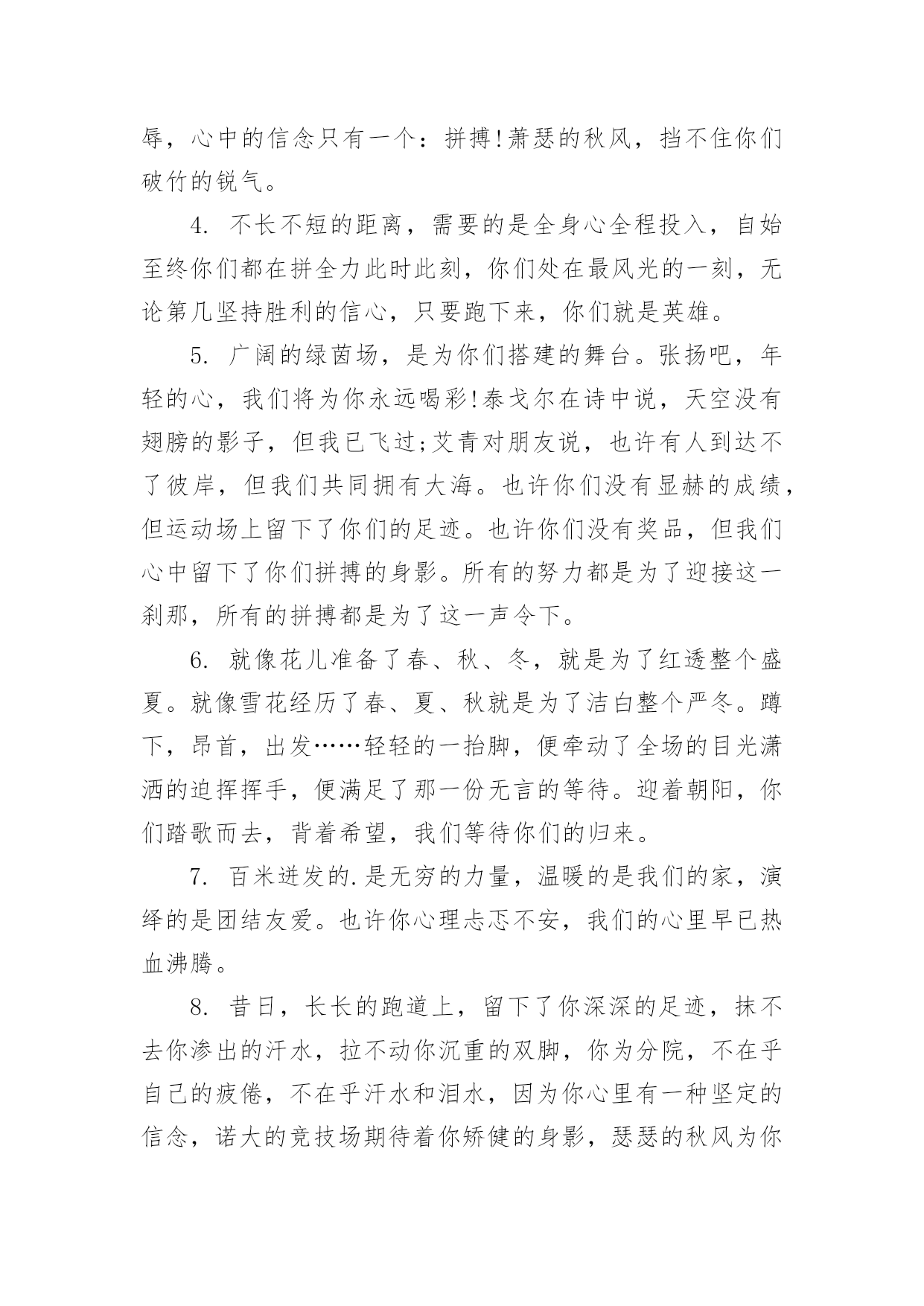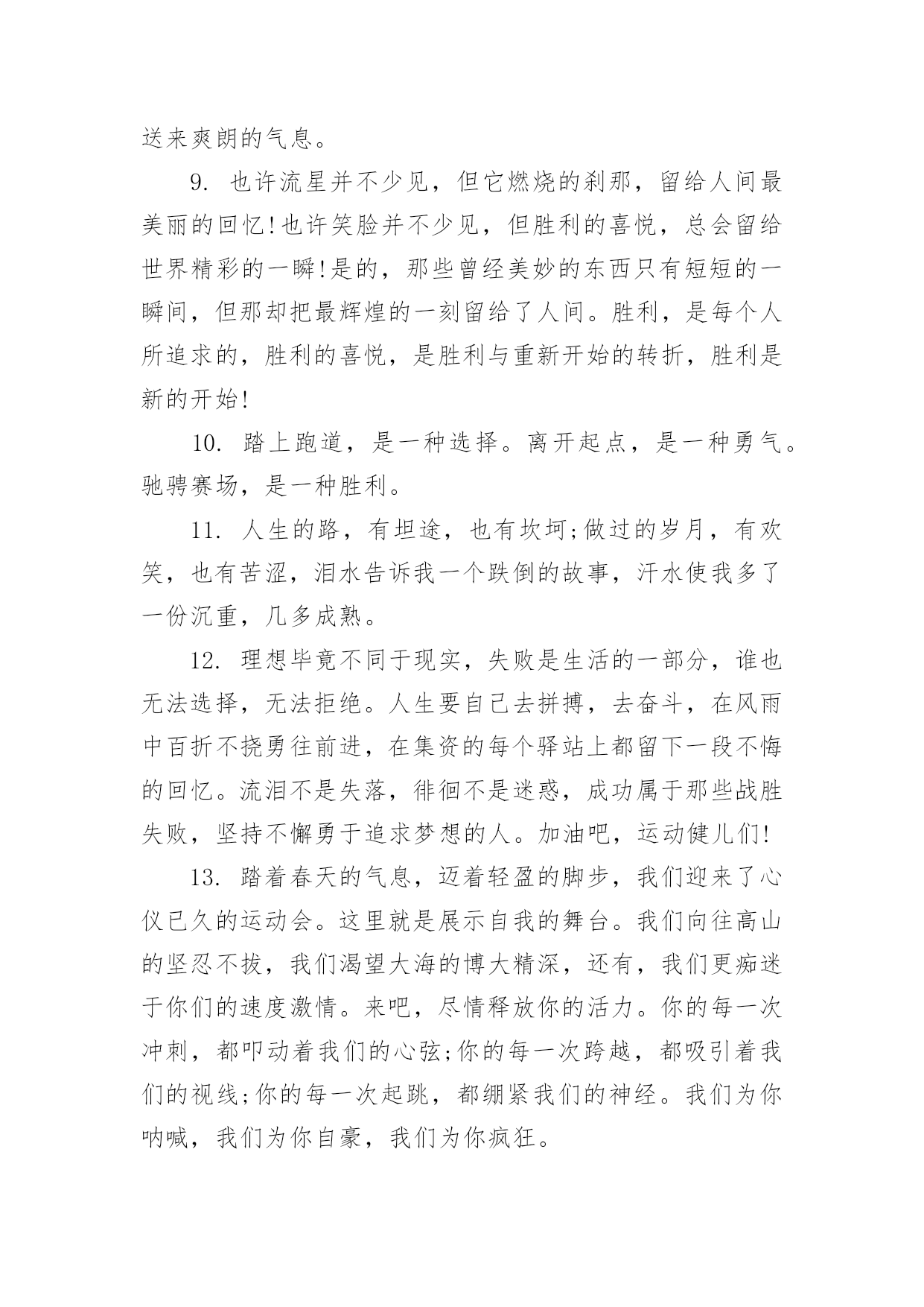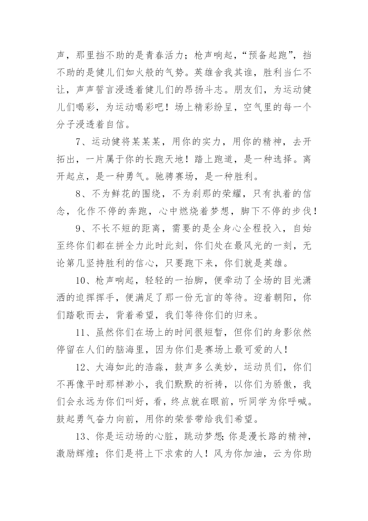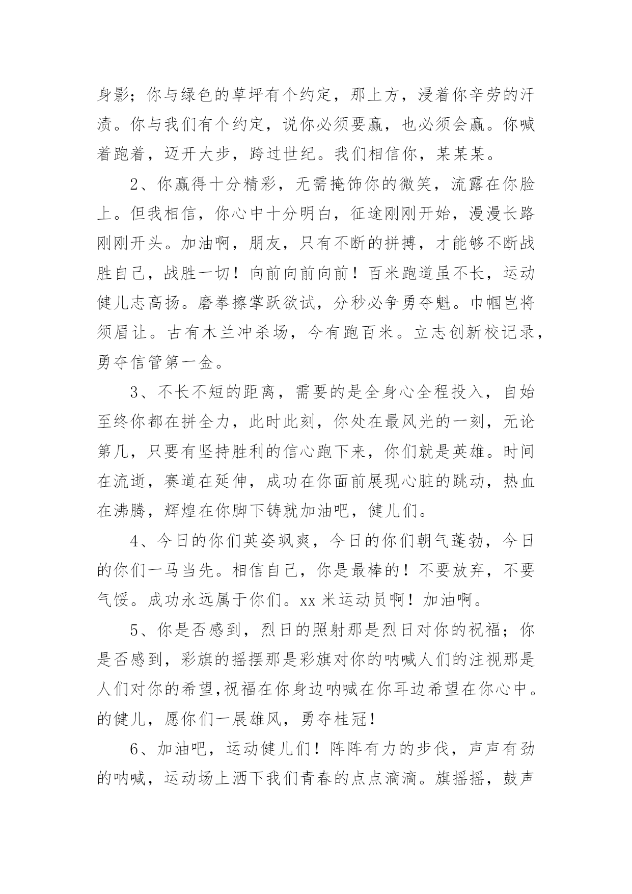 运动会加油稿运动会加油稿在快速变化和不断变革的今天,能够利用到加油稿的场合越来越多,借助加油稿可以给对方传达鼓励。相信很多朋友都对写加油稿感到非常苦恼吧,以下是小编整理的运动会加油稿,仅供参考,欢迎大家阅读。运动会加油稿11.青春的脚步,青春的速度,青春的活力,青春的激情,将会在你们的身上尽情体现。迎接自我,挑战自我,战胜自我!我们相信你们一定能行,加油吧,运动员!终点就在眼前!2.温暖的阳光洒在赛场上,男子乙组标枪的比赛即将开始。赛场上,一道道优美的弧线将轻盈地划过天空。健儿们用手中的标枪向距离的权限发起一轮又一轮的挑战。标枪在空中轻盈的姿态,是健儿们强健的力量和熟练的技巧的结合。谁能在这场激烈的竞争中获胜?让我们拭目以待,让我们为他们呐喊、助威吧!只有将力量与技巧合二为一的人,才能获得胜利的桂冠!3.年轻的我们自信飞扬,青春的气息如同出生的朝阳,蓬勃的力量如同阳光的挥洒。此时此刻,跑道便是我们精彩的舞台,声声加油便是我们最高的奖项!论何成功,谈何荣辱,心中的信念只有一个:拼搏!萧瑟的秋风,挡不住你们破竹的锐气。4.不长不短的距离,需要的是全身心全程投入,自始至终你们都在拼全力此时此刻,你们处在最风光的一刻,无论第几坚持胜利的信心,只要跑下来,你们就是英雄。5.广阔的绿茵场,是为你们搭建的舞台。张扬吧,年轻的心,我们将为你永远喝彩!泰戈尔在诗中说,天空没有翅膀的影子,但我已飞过;艾青对朋友说,也许有人到达不了彼岸,但我们共同拥有大海。也许你们没有显赫的成绩,但运动场上留下了你们的足迹。也许你们没有奖品,但我们心中留下了你们拼搏的身影。所有的努力都是为了迎接这一刹那,所有的拼搏都是为了这一声令下。6.就像花儿准备了春、秋、冬,就是为了红透整个盛夏。就像雪花经历了春、夏、秋就是为了洁白整个严冬。蹲下,昂首,出发……轻轻的一抬脚,便牵动了全场的目光潇洒的迫挥挥手,便满足了那一份无言的等待。迎着朝阳,你们踏歌而去,背着希望,我们等待你们的归来。7.百米迸发的.是无穷的力量,温暖的是我们的家,演绎的是团结友爱。也许你心理忐忑不安,我们的心里早已热血沸腾。8.昔日,长长的跑道上,留下了你深深的足迹,抹不去你渗出的汗水,拉不动你沉重的双脚,你为分院,不在乎自己的疲倦,不在乎汗水和泪水,因为你心里有一种坚定的信念,诺大的竞技场期待着你矫健的身影,瑟瑟的秋风为你送来爽朗的气息。9.也许流星并不少见,但它燃烧的刹那,留给人间最美丽的回忆!也许笑脸并不少见,但胜利的喜悦,总会留给世界精彩的一瞬!是的,那些曾经美妙的东西只有短短的一瞬间,但那却把最辉煌的一刻留给了人间。胜利,是每个人所追求的,胜利的喜悦,是胜利与重新开始的转折,胜利是新的开始!10.踏上跑道,是一种选择。离开起点,是一种勇气。驰骋赛场,是一种胜利。11.人生的路,有坦途,也有坎坷;做过的岁月,有欢笑,也有苦涩,泪水告诉我一个跌倒的故事,汗水使我多了一份沉重,几多成熟。12.理想毕竟不同于现实,失败是生活的一部分,谁也无法选择,无法拒绝。人生要自己去拼搏,去奋斗,在风雨中百折不挠勇往前进,在集资的每个驿站上都留下一段不悔的回忆。流泪不是失落,徘徊不是迷惑,成功属于那些战胜失败,坚持不懈勇于追求梦想的人。加油吧,运动健儿们!13.踏着春天的气息,迈着轻盈的脚步,我们迎来了心仪已久的运动会。这里就是展示自我的舞台。我们向往高山的坚忍不拔,我们渴望大海的博大精深,还有,我们更痴迷于你们的速度激情。来吧,尽情释放你的活力。你的每一次冲刺,都叩动着我们的心弦;你的每一次跨越,都吸引着我们的视线;你的每一次起跳,都绷紧我们的神经。我们为你呐喊,我们为你自豪,我们为你疯狂。14.泰戈尔在诗中说,天空没有翅膀的影子,但我已飞过;艾青对朋友说,也许有人到达不了彼岸,但我们共同拥有大海。也许你们没有显赫的成绩,但运动场上留下了你们的足迹。也许你们没有奖品,但我们心中留下了你们拼搏的身影。所有的努力都是为了迎接这一刹那,所有的拼搏都是为了这一声令下。15.虽然你们在场上的时间很短暂,但你们的身影依然停留在人们的脑海里,因为你们是赛场上最可爱的人,不为掌声的注释,不为刻意的征服,不为失败的痛苦,只有辛勤的汗水化作成功的脚步。16.手握铅球,心有成竹虽有几分沉重,几分辛苦正现人之本色,豪情万丈一声嚎去,只见铅球已飞出呀,太棒了,我为你欢呼!我为你骄傲!17.心中坚定的信念,脚下沉稳的步伐,你用行动告诉我们一个不变之理,没有走不完的路,没有过不了的山,成功正在终点冲着你高高的招手,用你那顽强的意志去努力,去迎接终点的鲜花与掌声,相信成功一定是属于你。18.坚定,执着,耐力与希望,在延伸的白色跑道中点点凝聚!力量,信念,拼搏与奋斗,在遥远的终点线上渐渐明亮!时代的强音正在你的脚下踏响。19.你和红色的地面有个
