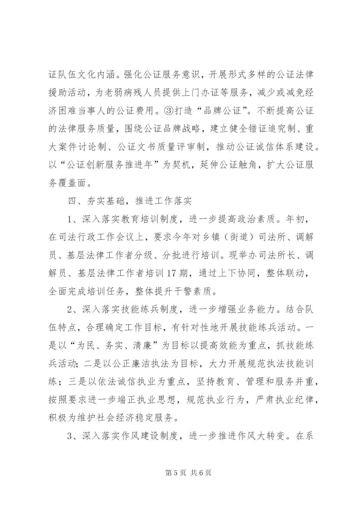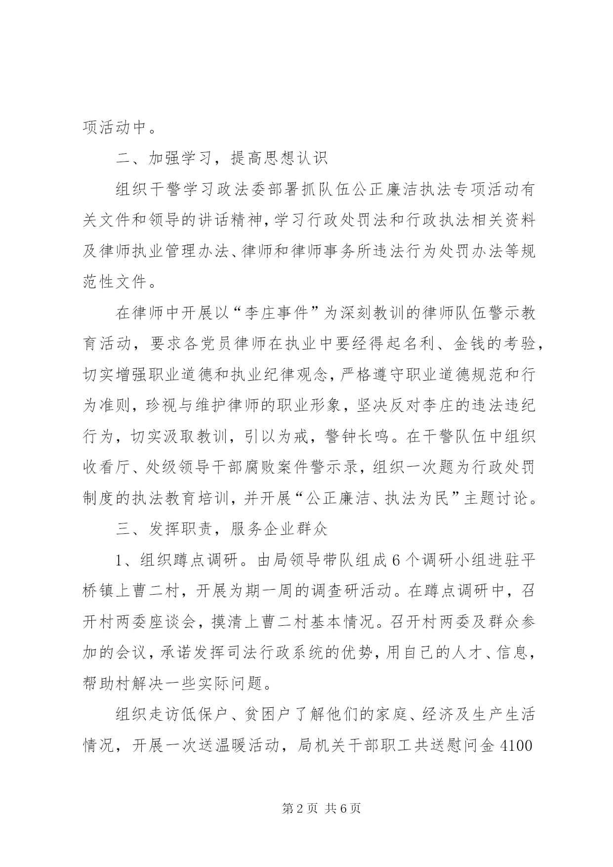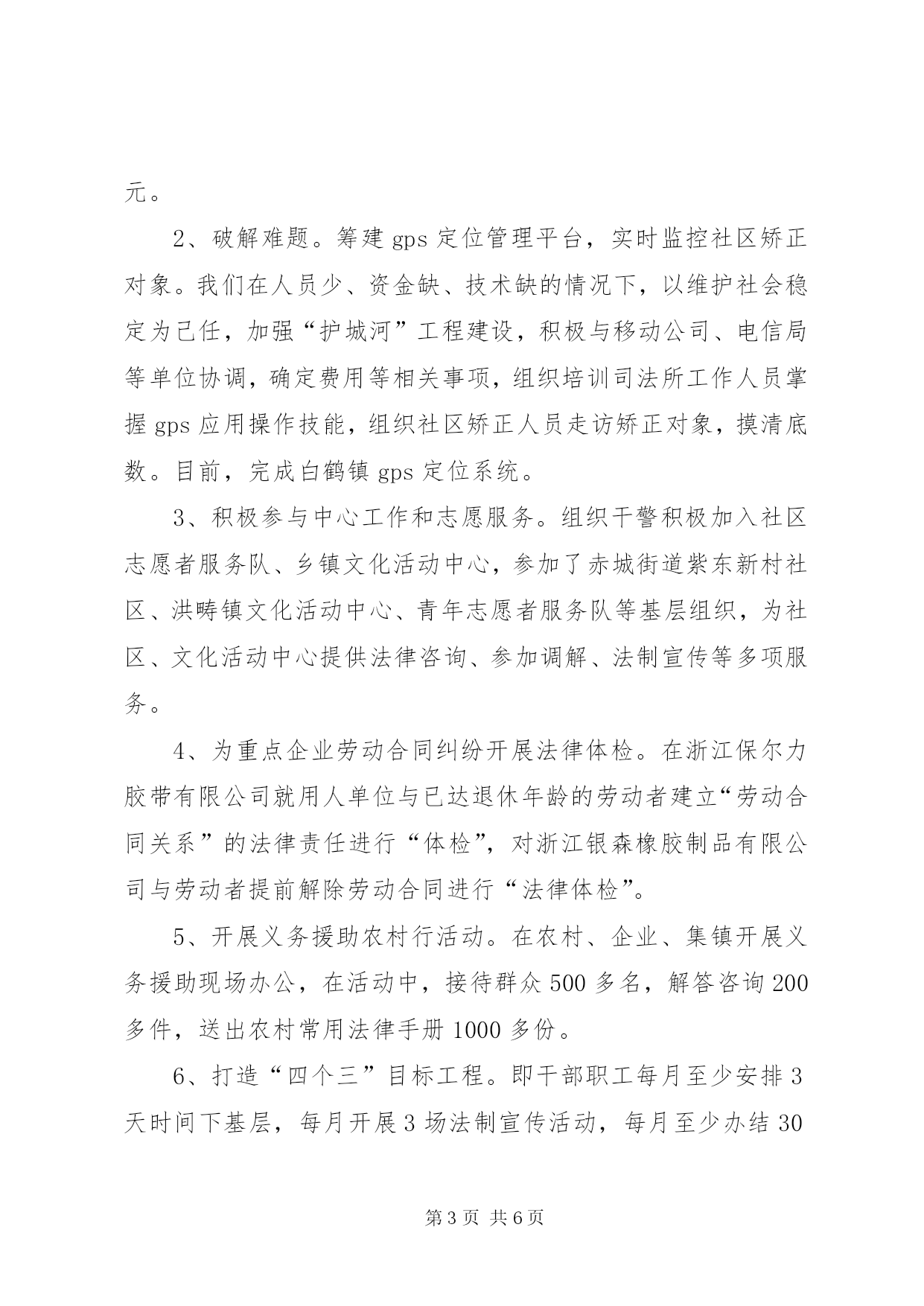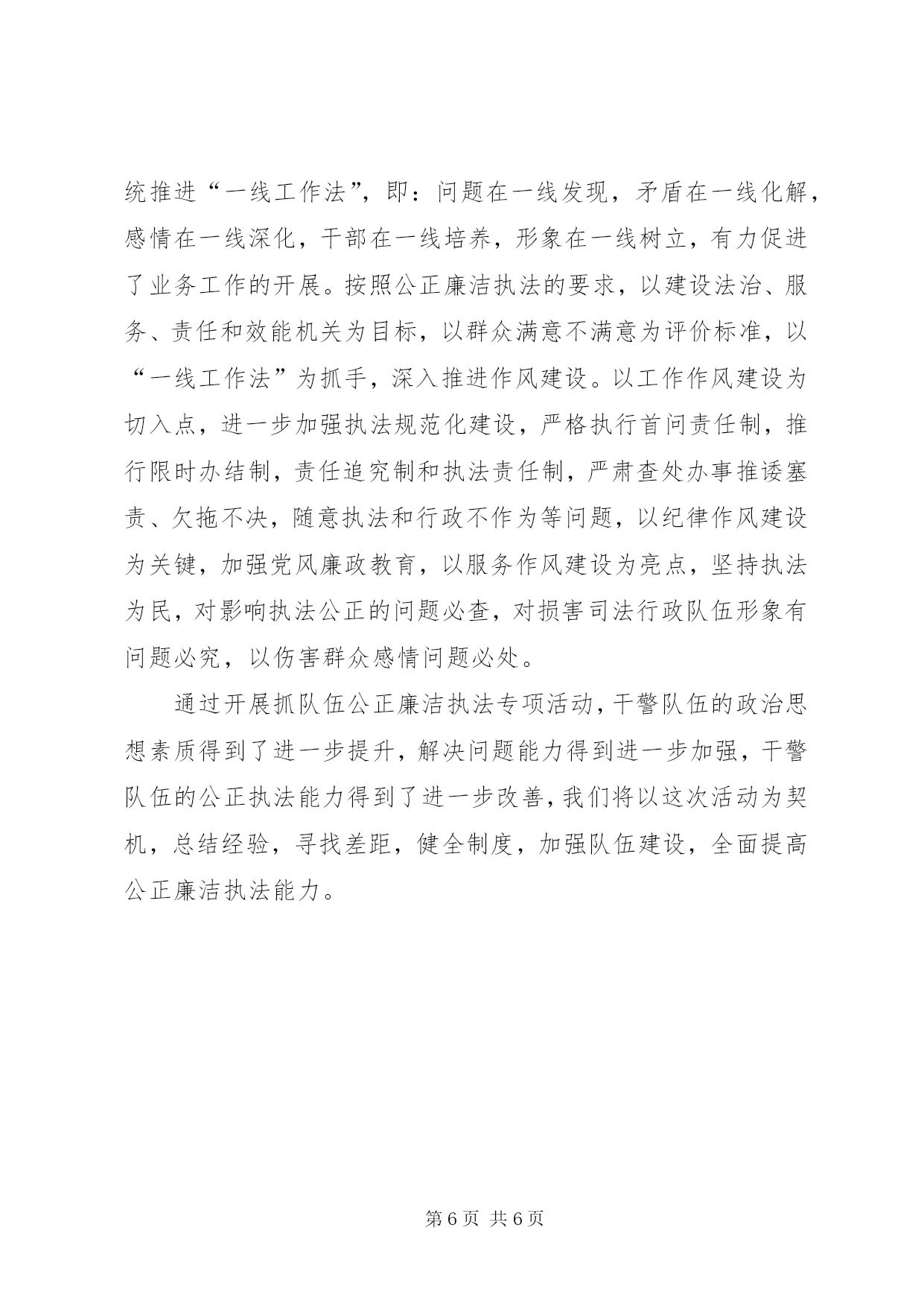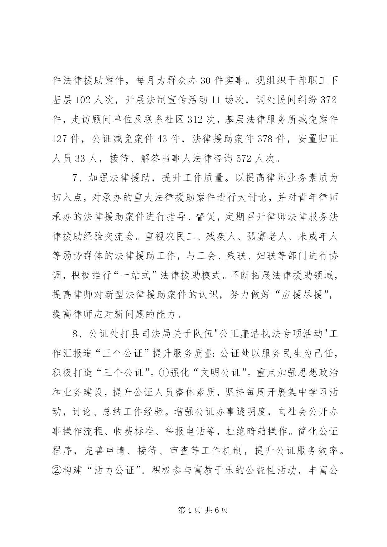 第PAGE\*Arabic\*MERGEFORMAT6页共NUMPAGES\*MERGEFORMAT6页司法局廉洁执法述职报告县司法局根据县委政法委的统一部署,在开展抓队伍公正廉洁执法专项活动中,紧密联系司法行政工作实际,深入贯彻落实科学发展观,突出“公正廉洁、执法为民”主线,整改群众反映强烈的突出问题,解决队伍执法中存在的薄弱环节,消除队伍廉政建设中存在的消极因素,使干警队伍的整体素质得到提高,使干警队伍公众形象得到改善,使司法行政执法公信力得到提升,使执法规范建设得到加强。现将开展抓队伍公正廉洁执法专项活动工作汇报如下:一、高度重视,认真动员部署1、建立领导机构。局党组高度重视开展抓队伍公正廉洁执法专项活动,采取切实有效措施,精心组织实施,成立了以局长为组长,班子成员为副组长,各科室负责人、律师事务所主任为成员的活动领导小组。领导小组下设办公室,负责具体工作,抓好队伍公正廉洁执法专项活动。2、宣传发动。在县政法委全会部署抓队伍建设公正廉洁执法专项活动工作后,局党组迅速召开会议,学习有关文件、传达领导的讲话精神,研究制订开展活动实施方案。7月23日召开动员会,部署开展抓队伍公正廉洁执法专项活动工作,把干部职工的思想统一到局党组抓队伍公正廉洁执法的决心上来,要求干部职工以积极的姿态、认真的态度、饱满的热情,自觉投身到专项活动中。二、加强学习,提高思想认识组织干警学习政法委部署抓队伍公正廉洁执法专项活动有关文件和领导的讲话精神,学习行政处罚法和行政执法相关资料及律师执业管理办法、律师和律师事务所违法行为处罚办法等规范性文件。在律师中开展以“李庄事件”为深刻教训的律师队伍警示教育活动,要求各党员律师在执业中要经得起名利、金钱的考验,切实增强职业道德和执业纪律观念,严格遵守职业道德规范和行为准则,珍视与维护律师的职业形象,坚决反对李庄的违法违纪行为,切实汲取教训,引以为戒,警钟长鸣。在干警队伍中组织收看厅、处级领导干部腐败案件警示录,组织一次题为行政处罚制度的执法教育培训,并开展“公正廉洁、执法为民”主题讨论。三、发挥职责,服务企业群众1、组织蹲点调研。由局领导带队组成6个调研小组进驻平桥镇上曹二村,开展为期一周的调查研活动。在蹲点调研中,召开村两委座谈会,摸清上曹二村基本情况。召开村两委及群众参加的会议,承诺发挥司法行政系统的优势,用自己的人才、信息,帮助村解决一些实际问题。组织走访低保户、贫困户了解他们的家庭、经济及生产生活情况,开展一次送温暖活动,局机关干部职工共送慰问金4100元。2、破解难题。筹建gps定位管理平台,实时监控社区矫正对象。我们在人员少、资金缺、技术缺的情况下,以维护社会稳定为己任,加强“护城河”工程建设,积极与移动公司、电信局等单位协调,确定费用等相关事项,组织培训司法所工作人员掌握gps应用操作技能,组织社区矫正人员走访矫正对象,摸清底数。目前,完成白鹤镇gps定位系统。3、积极参与中心工作和志愿服务。组织干警积极加入社区志愿者服务队、乡镇文化活动中心,参加了赤城街道紫东新村社区、洪畴镇文化活动中心、青年志愿者服务队等基层组织,为社区、文化活动中心提供法律咨询、参加调解、法制宣传等多项服务。4、为重点企业劳动合同纠纷开展法律体检。在浙江保尔力胶带有限公司就用人单位与已达退休年龄的劳动者建立“劳动合同关系”的法律责任进行“体检”,对浙江银森橡胶制品有限公司与劳动者提前解除劳动合同进行“法律体检”。5、开展义务援助农村行活动。在农村、企业、集镇开展义务援助现场办公,在活动中,接待群众500多名,解答咨询200多件,送出农村常用法律手册1000多份。6、打造“四个三”目标工程。即干部职工每月至少安排3天时间下基层,每月开展3场法制宣传活动,每月至少办结30件法律援助案件,每月为群众办30件实事。现组织干部职工下基层102人次,开展法制宣传活动11场次,调处民间纠纷372件,走访顾问单位及联系社区312次,基层法律服务所减免案件127件,公证减免案件43件,法律援助案件378件,安置归正人员33人,接待、解答当事人法律咨询572人次。7、加强法律援助,提升工作质量。以提高律师业务素质为切入点,对承办的重大法律援助案件进行大讨论,并对青年律师承办的法律援助案件进行指导、督促,定期召开律师法律服务法律援助经验交流会。重视农民工、残疾人、孤寡老人、未成年人等弱势群体的法律援助工作,与工会、残联、妇联等部门进行协调,积极推行“一站式”法律援助模式。不断拓展法律援助领域,提高律师对新型法律援助案件的认识,努力做好“应援尽援”,提高律师应对新问题的能力。8、公证处打县司法局关于队伍"公正廉洁执法专项活动"工作汇报造“三个公证”提升服务质量:公证处以服务民生为己任,积极打造“三个公证”。①强化“文明公