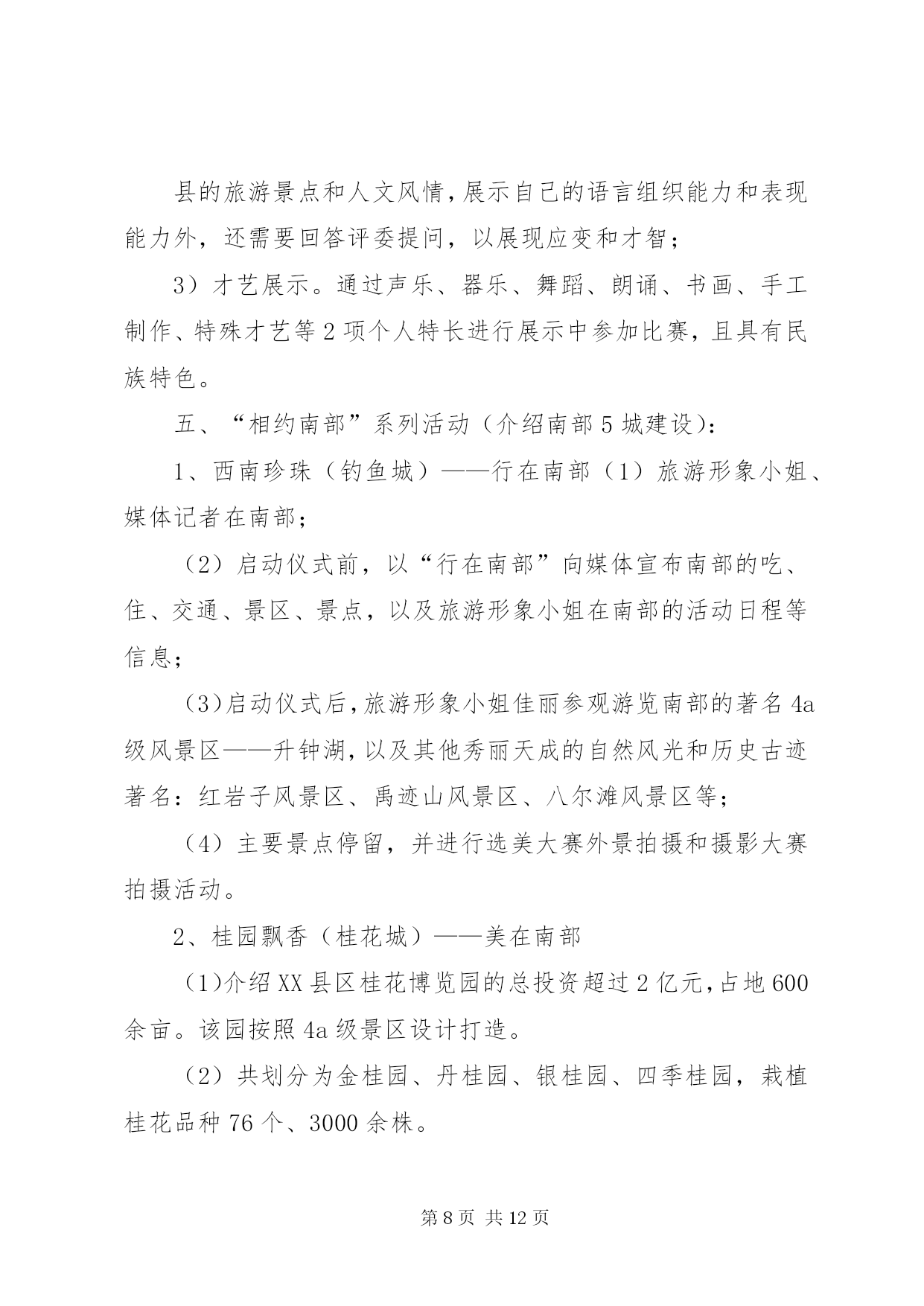 第PAGE\*Arabic\*MERGEFORMAT12页共NUMPAGES\*MERGEFORMAT12页旅游形象大使方案2011·XX县区首届旅游形象大使选拔赛推动南部“5城”建设展4a景区风采创国际旅游品牌策划方案◆活动主题:2011·XX县区首届旅游形象大使选拔赛◆比赛理念:美丽、健康、智慧、才学、善良、博爱◆比赛口号:魅力南部闪耀中国走向世界观人文山水悦南部秀色释放(张扬)青春炫出(秀出)自我◆旅游城市口号:秀色钟升湖西南一珍珠◆旅游大使选拔赛logo设计。倾向于“鱼美人”的简单外轮廓,上身为女性,代表旅游大使选拔赛的女性象征;下身为鱼尾,代表XX县区最为著名的4a级风景区升钟湖与全国钓鱼文化。◆大赛宗旨:以科学发展观为指导,认真贯彻落实《国务院关于加快发展旅游业的意见》(国发〔2009〕41号)精神,通过举办“2011·XX县区首届旅游形象大使选拔赛”,充分展示南部的旅游资源、地域文化、人文风情、城市风貌,全力打造XX县区“5城”建设,进一步扩大南部在国内外的影响,提升南部经济区的凝聚力,加快南部旅游产业转型升级,拉动南部旅游产业飞速发展,吸引外来投资是本次活动的宗旨。同时,也给更多的优秀企业搭建投资平台、拓展发展高地,共谋发展。◆地方人文背景:川北重镇——南部中国唯一以方位词命名的县——南部千年XX县区XX县区,位于四川盆地北部,嘉陵江中游,幅员面积2235平方公里,总人口130万,是全国造林绿化模XX县区、全国农业标准化蚕桑示XX县区、全国无规定动物疫病区、是XX省第一批扩权强县试点县、XX省生态示XX县区。县城依山傍水,风光秀丽,面积25平方公里,常住人口25万,是XX省省级文明卫生县城。是建设中的中国西部“板材城”、中国西部“饮品城”、中国西部“机电城”、中国西部“桂花城”、中国西部“钓鱼城”。1986年,被XX省人民政府批准为省级风景名胜区,被世界旅游组织确定为中国西部最大的人造水资源;1998年,升钟水库被命名为省级风景名胜区;2004年,胡锦涛总书记视察南部;2009年,成功举办2009·首届中国升钟湖钓鱼大奖赛;2010年4月26日,XX县区升钟湖成为全国首个钓鱼竞赛训练基地;2010年6月11日,XX县区被体育总局命名为全国钓鱼城市;2010年9月16日,第二届中国升钟湖钓鱼旅游文化节及中国西部首届桂花节在XX县区盛大开幕。2010年9月29日,省旅游局通过XX县区升钟湖创建国家4a级旅游景区省级评定。◆大赛背景:自XX县区先后成功举办“2009首届中国升钟湖钓鱼大奖赛”、“2010第二届中国升钟湖钓鱼文化节暨首届桂花节”,以及在2010年9月成功通过升钟湖创建国家4a级旅游景区省级评定后,XX县区得到了政府领导和社会各界的肯定和赞誉,受到了国内外媒体的强烈关注(4a级风景名胜区、全国钓鱼城市、钓鱼竞赛训练基地)。为了加强XX县区的旅游城市进程,让世界美丽的眼睛看中国,让四川之美走向世界,让南部的魅力踏出国门。借助旅游形象小姐选拔的平台,将赛事超强的媒体宣传和人气影响巧妙的结合将南部这个山美、水美、人美、气候美的超具科技含量和原生态风情的都市,以一种独特的方式迎来中国乃至世界的关注目光,使大赛成为XX县区主要的旅游文化盛事。赛事将以欢迎酒会、比赛启动仪式、XX县区5城建设展示(板材城、饮品城、机电城、桂花城、钓鱼城)、景点外景拍摄、决赛暨颁奖晚会将南部作为川北明珠、全省第一文明卫生县城、驰名中外的风景名城、XX省历史文化名城做出完美的诠释,从而表现美景南部,和谐南部。对宣传南部和南部旅游业起到了积极作用,对于树立南部旅游形象、提升南部旅游品牌、弘扬民族文化、促进旅游发展具有重要意义。◆量身订做本次“2011·XX县区首届旅游形象大使选拔赛”在完全针对南部其独有的天然风景、怡人气候和独特的历史文化等特色设立赛事环节,还向外展示一个和谐美丽诗一般画一样魅力无穷、独特神秘的南部。在执行层面所涉及的包括传播平台、赛事创意以及城市旅游、招商引资等方面,我们为南部量身定作了此次活动。◆大赛规划:一、赛事启动时间:2011年4月二、大赛运作步骤:1、策划方案提出讨论;2、确定主办、承办、冠名、赞助单位;3、召开新闻发布会;4、媒体、户外和网络造势(2个月);5、接收报名参赛人员,并安排参赛人员的住行;6、进行分步骤选拔活动。a、初期海选——b、初赛复赛——c、总决赛——d、短信及网络支持——e、经过专家评委评判——f、综合社会支持度——g、选出冠军、亚军、季军、十佳以及若干单项奖。7、全程进行视频录像,在网络电视上进行录播。8、后续开展“相约南部”系列活动,由旅游形象大使介绍南部“5城”旅游风光。9、民意测验10、总结策划效果,评估经济效益三、参赛资格:1、凡具有XX县区籍贯、身心健康