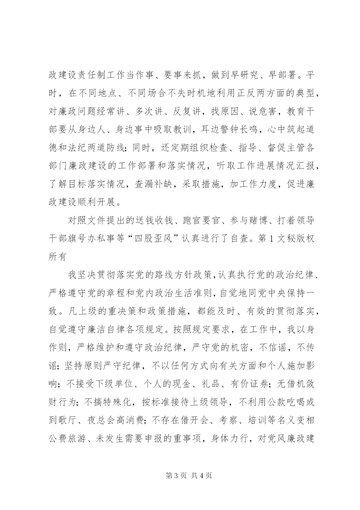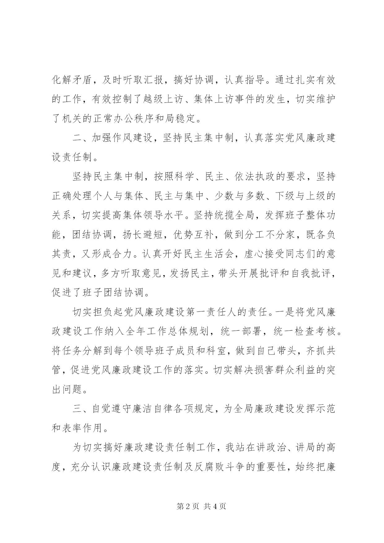 第PAGE\*Arabic\*MERGEFORMAT4页共NUMPAGES\*MERGEFORMAT4页工商局长述廉报告今年以来,在市局XX县区委县政府的正确领导下,我坚持以邓小平理论和“三个代表”重要思想为指导,坚持以科学发展观统领工作全局,认真学习贯彻十六届6中全会精神,遵照领导干部廉洁自律各项规定要求,坚持从严治党的方针,坚持反对腐败,紧紧依靠广党员干部和人民群众,推进责任制分解、落实,努力做好廉洁自律工作,现总结如下:一、着眼防范,立足自身教育,提高“防腐”免疫力。第1文秘版权所有注重把廉政建设理论学习同政治理论学习有机结合起来,浓厚学习氛围,搞活学习形式,扩学习范围,增强学习效果。开展理论学习,坚定理想信念,开展条规教育,早打“预防针”,提高“免疫力”。今年以来,在全局组织开展了保持共产党员先属==站-原创文章,还是到,更多原创进性教育、机关效能建设等活动并开展学习讨论,通过经常性、多种形式的党性、党风、党纪和廉政教育,使我树立了正确的权利观、地位观、利益观,进一步认识到了廉政建设的重要性,廉洁自律的必要性和违法违纪的危害性,增强了在新形势下拒腐防变的能力,积极做“三个代表”的忠实实践者,并对一些党员干部的不廉洁行为及时敲响了警钟。同时,积极做好信访工作,认真对待群众来信、来访,及时妥善处理群众反映的问题,做到了热情接待,耐心疏导,宣传政策,化解矛盾,及时听取汇报,搞好协调,认真指导。通过扎实有效的工作,有效控制了越级上访、集体上访事件的发生,切实维护了机关的正常办公秩序和局稳定。二、加强作风建设,坚持民主集中制,认真落实党风廉政建设责任制。坚持民主集中制,按照科学、民主、依法执政的要求,坚持正确处理个人与集体、民主与集中、少数与多数、下级与上级的关系,切实提高集体领导水平。坚持统揽全局,发挥班子整体功能,团结协调,扬长避短,优势互补,做到分工不分家,既各负其责,又形成合力。认真开好民主生活会,虚心接受同志们的意见和建议,多方听取意见,发扬民主,带头开展批评和自我批评,促进了班子团结协调。切实担负起党风廉政建设第一责任人的责任。一是将党风廉政建设工作纳入全年工作总体规划,统一部署,统一检查考核。将任务分解到每个领导班子成员和科室,做到自己带头,齐抓共管,促进党风廉政建设工作的落实。切实解决损害群众利益的突出问题。三、自觉遵守廉洁自律各项规定,为全局廉政建设发挥示范和表率作用。为切实搞好廉政建设责任制工作,我站在讲政治、讲局的高度,充分认识廉政建设责任制及反腐败斗争的重要性,始终把廉政建设责任制工作当作事、要事来抓,做到早研究、早部署。平时,在不同地点、不同场合不失时机地利用正反两方面的典型,对廉政问题经常讲、多次讲、反复讲,找原因、说危害,教育干部要从身边人、身边事中吸取教训,耳边警钟长鸣,心中筑起道德和法纪两道防线;同时,还定期组织检查、指导、督促主管各部门廉政建设的工作部署和落实情况,听取工作进展情况汇报,了解目标落实情况,查漏补缺,采取措施,加工作力度,促进廉政建设顺利开展。对照文件提出的送钱收钱、跑官要官、参与赌博、打着领导干部旗号办私事等“四股歪风”认真进行了自查。第1文秘版权所有我坚决贯彻落实党的路线方针政策,认真执行党的政治纪律、严格遵守党的章程和党内政治生活准则,自觉地同党中央保持一致。凡上级的重决策和政策措施,都能及时、有效的贯彻落实,自觉遵守廉洁自律各项规定。按照规定要求,在工作中,我以身作则,严格维护和遵守政治纪律,严守党的机密,不信谣,不传谣;坚持原则严守纪律,不以任何方式向有关方面和个人施加影响;不接受下级单位、个人的现金、礼品、有价证券;无借机敛财行为;不搞特殊化,按标准接待上级领导,不利用公款吃喝或到歌厅、夜总会高消费;不存在借开会、考察、培训等名义变相公费旅游、未发生需要申报的重事项,身体力行,对党风廉政建设责任制工作的落实起到了很好的促进作用。总之,2006年我按照党风廉政建设责任制工作部署,能够做到高度重视,精心组织,积极推进,狠抓落实,使党风廉政建设工作得以顺利推进。我本人也自觉遵守廉洁自律各项规定,坚决贯彻落实党的路线方针政策,认真执行党的政治纪律、严格遵守党的章程和党内政治生活准则,始终同党中央保持一致。工商局长述廉报告