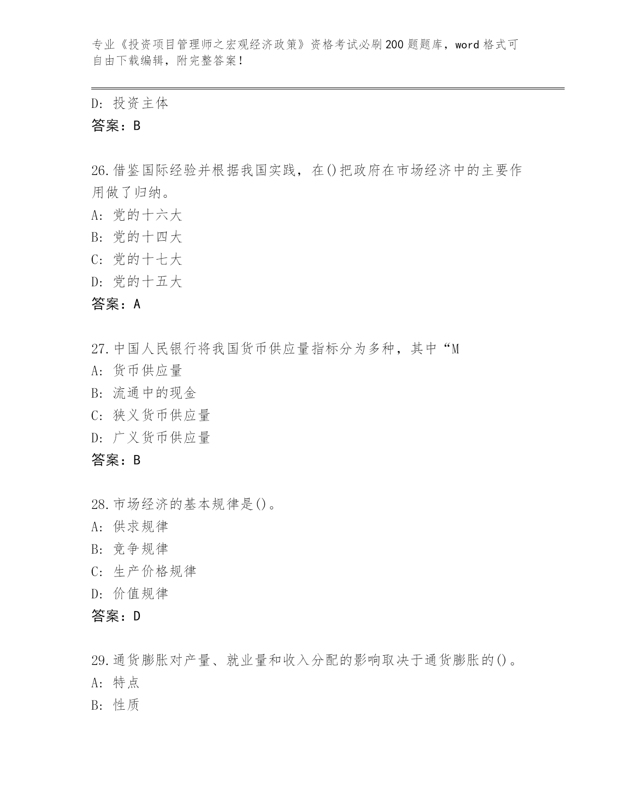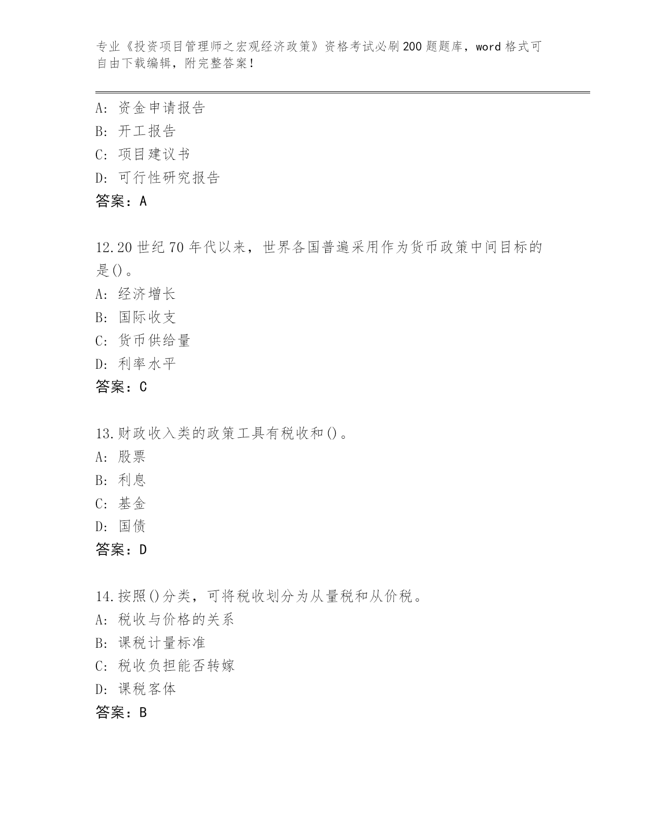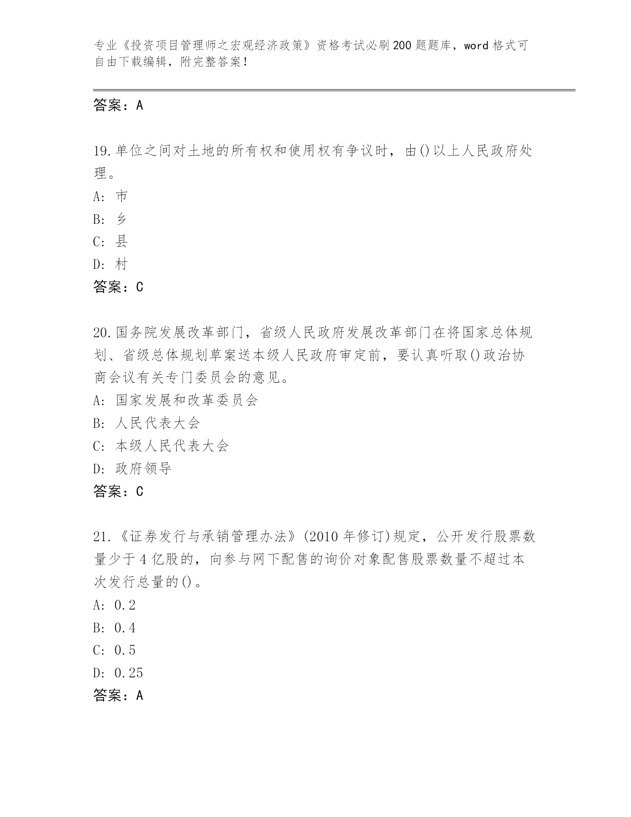 安徽省临泉县2024《投资项目管理师之宏观经济政策》资格考试必刷200题真题题库含答案下载