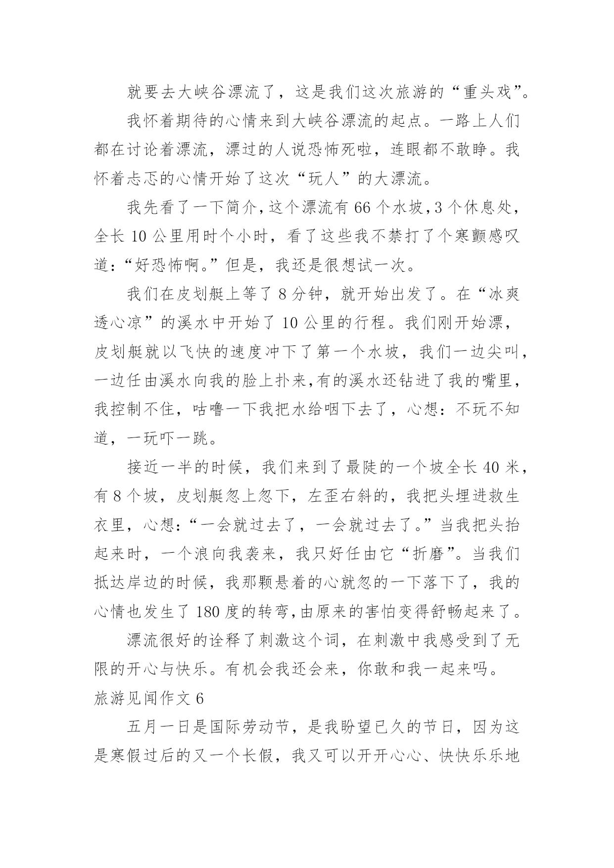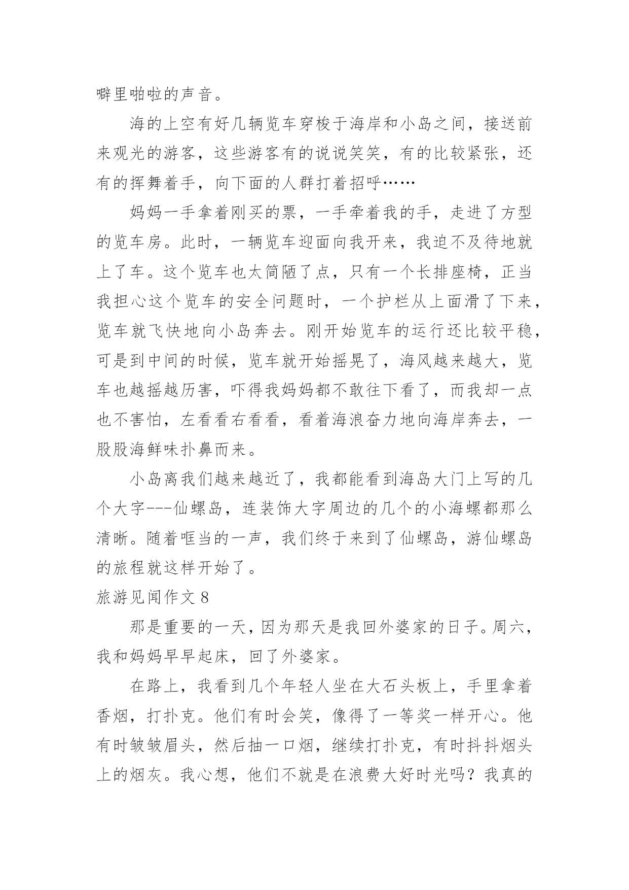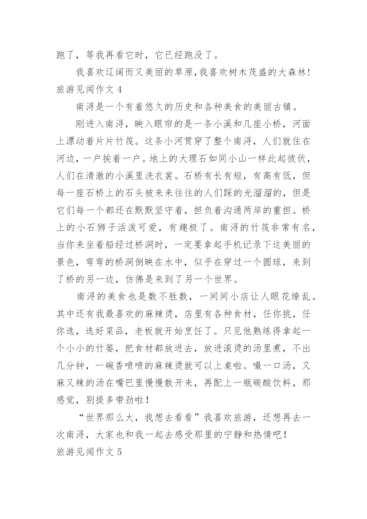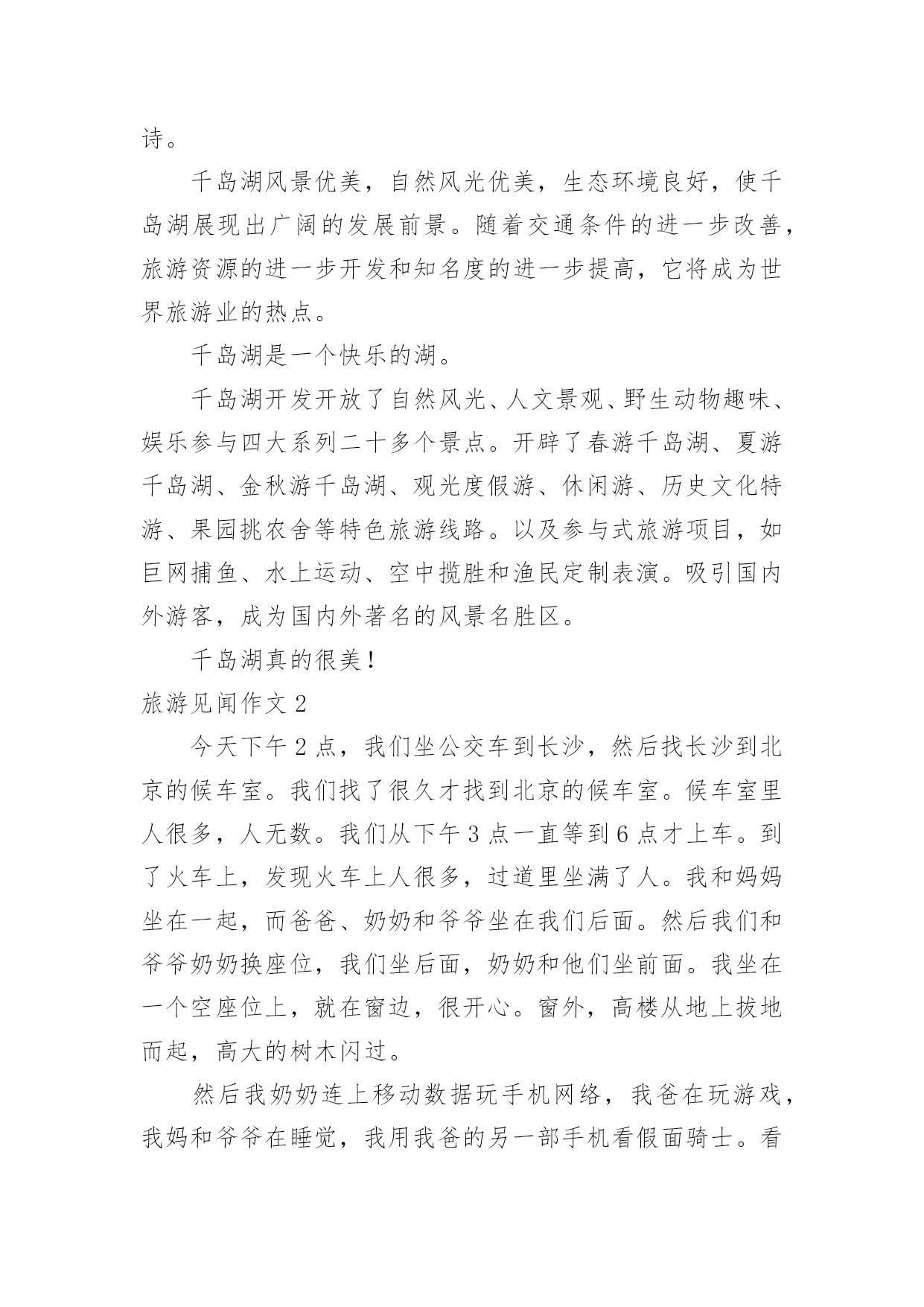 旅游见闻作文旅游见闻作文无论是在学校还是在社会中,大家或多或少都会接触过作文吧,作文可分为小学作文、中学作文、大学作文(论文)。作文的注意事项有许多,你确定会写吗?下面是小编精心整理的旅游见闻作文,欢迎阅读,希望大家能够喜欢。旅游见闻作文1暑假的时候,我和爸妈一起来到千岛湖快乐的旅行。看千岛湖,可以尽收眼底。千岛湖是一个年轻的湖。它是1959年新安江水电站修建时筑坝蓄水形成的人工湖。千岛湖是一个纯湖。千岛湖国家森林公园森林面积448平方公里,森林覆盖率81%,绿色观赏率接近100%。茂密的森林净化了千岛湖一流的大气环境,空气十分清新。广阔的千岛湖,宽573平方公里,大小178亿立方米,水平水深34米,透明度7米。为国家一级水体,可满足饮用水。湖中的1078个岛屿姿态各异,造型优美。春游湖上,一个开满山花的小岛,是一个天真无邪的村姑。夏天游湖,人们想在这碧波中乘波游泳;秋山红叶,让你想起‘霜叶红于二月’的诗句;雪满湖光山色,崖松。也是王维画的一首诗。千岛湖风景优美,自然风光优美,生态环境良好,使千岛湖展现出广阔的发展前景。随着交通条件的进一步改善,旅游资源的进一步开发和知名度的进一步提高,它将成为世界旅游业的热点。千岛湖是一个快乐的湖。千岛湖开发开放了自然风光、人文景观、野生动物趣味、娱乐参与四大系列二十多个景点。开辟了春游千岛湖、夏游千岛湖、金秋游千岛湖、观光度假游、休闲游、历史文化特游、果园挑农舍等特色旅游线路。以及参与式旅游项目,如巨网捕鱼、水上运动、空中揽胜和渔民定制表演。吸引国内外游客,成为国内外著名的风景名胜区。千岛湖真的很美!旅游见闻作文2今天下午2点,我们坐公交车到长沙,然后找长沙到北京的候车室。我们找了很久才找到北京的候车室。候车室里人很多,人无数。我们从下午3点一直等到6点才上车。到了火车上,发现火车上人很多,过道里坐满了人。我和妈妈坐在一起,而爸爸、奶奶和爷爷坐在我们后面。然后我们和爷爷奶奶换座位,我们坐后面,奶奶和他们坐前面。我坐在一个空座位上,就在窗边,很开心。窗外,高楼从地上拔地而起,高大的树木闪过。然后我奶奶连上移动数据玩手机网络,我爸在玩游戏,我妈和爷爷在睡觉,我用我爸的另一部手机看假面骑士。看完就睡着了,醒来就去了北京。北京火车站人山人海,车辆很多。那些假导游到处都是。她假装猩猩说:“叔叔,阿姨,坐我们的车。这辆车不收费,我们在店里住宿有折扣。带你去长城的孩子不需要钱。”就这样,我们上了她的车,一到酒店就换了。我们知道我们被骗了。在未来的日子里,爸爸会小心工作。我想对读者说:“去北京一定要请个正规的导游,住正规的酒店,不要像我们一样上当受骗!旅游见闻作文37月23日,我和表哥一起去了呼伦贝尔大草原。今天北京很炎热,但听说草原那边很凉,所以妈妈就准备了很多衣服,我在家里热得直出汗!我问妈妈什么时候的飞机,妈妈说:“是晚上的。”到了晚上我们来到机场,广播说飞机晚点,我们非常失望。可过了一会给我们换了飞机,我们就很快到了草原明珠海拉尔,入住酒店。第二天,我们去了世界反法西斯海拉尔纪念馆。然后我们就进入了草原,入住了蒙古包,下午下起了大雨,从窗户向外看,只有茫茫的草原和低低的天空。雨过后,地上有很多很多的小青蛙,天空中又出现了彩虹。然后我们又坐了快艇去看了湿地。第三天我们去了森林。我去了红豆坡和猎人路,我在猎人路知道了大兴安岭松子小,小兴安岭松子大。在红豆坡一开始看见了一只小鼠,妈妈说:“这不像松鼠。”我又开始走,又看见了一只,然后有一只松鼠跑到我手上拿了一个松果就跑了,等我再看它时,它已经跑没了。我喜欢辽阔而又美丽的草原,我喜欢树木茂盛的大森林!旅游见闻作文4南浔是一个有着悠久的历史和各种美食的美丽古镇。刚进入南浔,映入眼帘的是一条小溪和几座小桥,河面上漂动着片片竹筏。这条小河贯穿了整个南浔,人们就住在河边,一户挨着一户。地上的大理石如同小山一样此起彼伏,人们在清澈的小溪里洗衣裳。石桥有长有短,有高有低,但每一座石桥上的石头被来来往往的人们踩的光溜溜的,但是它们每一个都还在默默坚守着,担负着沟通两岸的重担。桥上的小石狮子活泼可爱,有趣极了。南浔的竹筏非常有名,当你来坐着船经过桥洞时,一定要拿起手机记录下这美丽的景色,弯弯的桥洞倒映在水中,似乎在穿过一个圆球,来到了桥的另一边,仿佛是来到了另一个世界。南浔的美食也是数不胜数,一间间小店让人眼花缭乱。其中还有我最喜欢的麻辣烫,店里有各种食材,任你挑,任你选,选好菜品,老板就开始烹饪了。只见他熟练得拿起一个小小的竹篓,把食材都放进去,放进滚烫的汤里煮,不出几分钟,一碗香喷喷的麻辣烫就可以上桌啦。嘬一口汤,又麻又辣的汤在嘴巴里慢慢散开来,再配上一瓶碳酸饮料,那感觉,别提多带劲啦!“世界那么大,我想去看看”我喜欢旅游,还想再去一次南浔,大家也和我一起去感受那