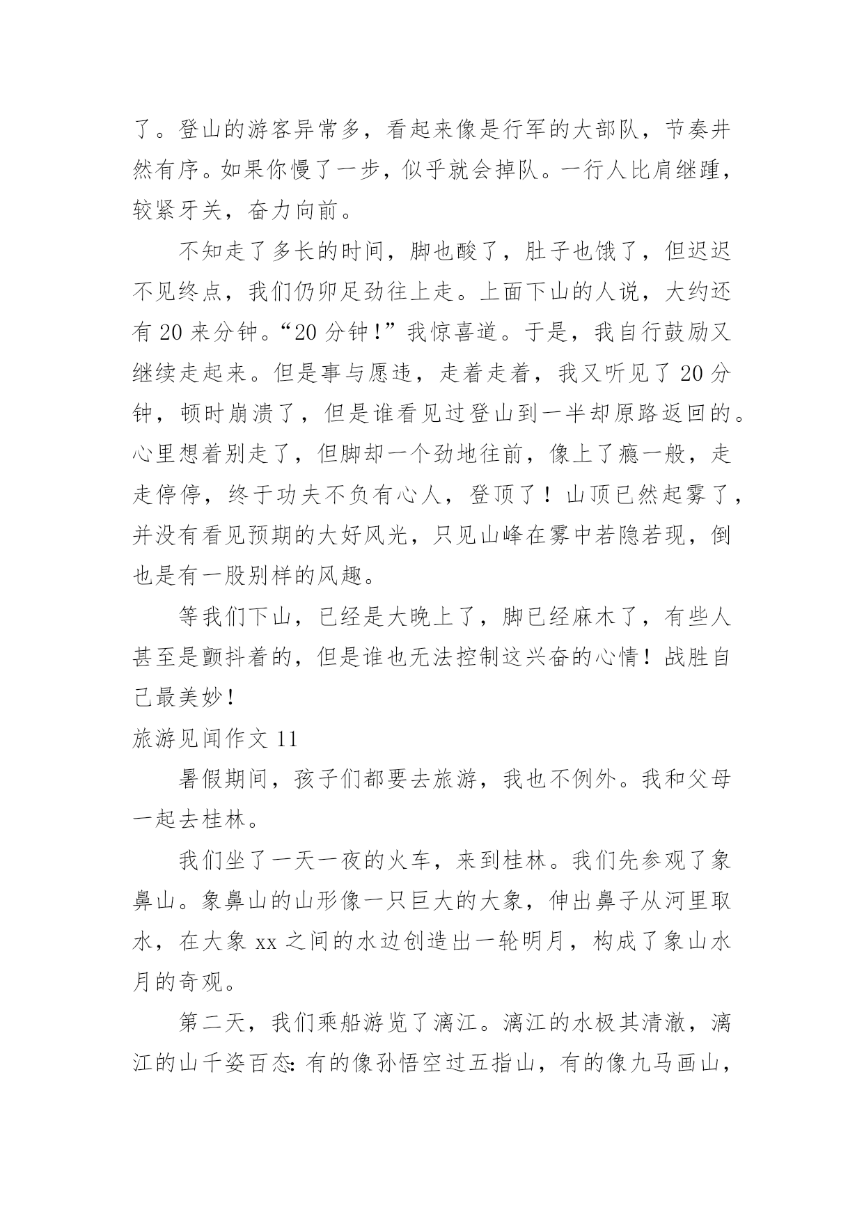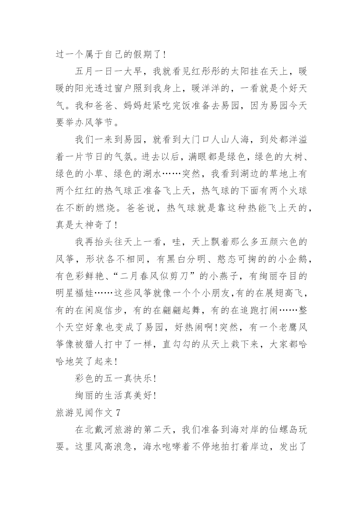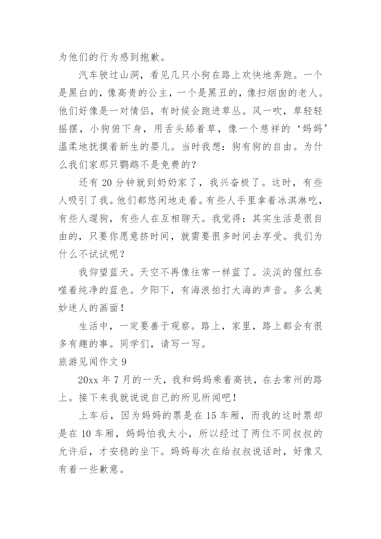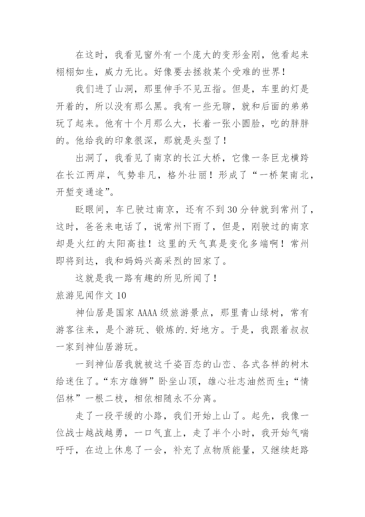 旅游见闻作文旅游见闻作文无论是在学校还是在社会中,大家或多或少都会接触过作文吧,作文可分为小学作文、中学作文、大学作文(论文)。作文的注意事项有许多,你确定会写吗?下面是小编精心整理的旅游见闻作文,欢迎阅读,希望大家能够喜欢。旅游见闻作文1暑假的时候,我和爸妈一起来到千岛湖快乐的旅行。看千岛湖,可以尽收眼底。千岛湖是一个年轻的湖。它是1959年新安江水电站修建时筑坝蓄水形成的人工湖。千岛湖是一个纯湖。千岛湖国家森林公园森林面积448平方公里,森林覆盖率81%,绿色观赏率接近100%。茂密的森林净化了千岛湖一流的大气环境,空气十分清新。广阔的千岛湖,宽573平方公里,大小178亿立方米,水平水深34米,透明度7米。为国家一级水体,可满足饮用水。湖中的1078个岛屿姿态各异,造型优美。春游湖上,一个开满山花的小岛,是一个天真无邪的村姑。夏天游湖,人们想在这碧波中乘波游泳;秋山红叶,让你想起‘霜叶红于二月’的诗句;雪满湖光山色,崖松。也是王维画的一首诗。千岛湖风景优美,自然风光优美,生态环境良好,使千岛湖展现出广阔的发展前景。随着交通条件的进一步改善,旅游资源的进一步开发和知名度的进一步提高,它将成为世界旅游业的热点。千岛湖是一个快乐的湖。千岛湖开发开放了自然风光、人文景观、野生动物趣味、娱乐参与四大系列二十多个景点。开辟了春游千岛湖、夏游千岛湖、金秋游千岛湖、观光度假游、休闲游、历史文化特游、果园挑农舍等特色旅游线路。以及参与式旅游项目,如巨网捕鱼、水上运动、空中揽胜和渔民定制表演。吸引国内外游客,成为国内外著名的风景名胜区。千岛湖真的很美!旅游见闻作文2今天下午2点,我们坐公交车到长沙,然后找长沙到北京的候车室。我们找了很久才找到北京的候车室。候车室里人很多,人无数。我们从下午3点一直等到6点才上车。到了火车上,发现火车上人很多,过道里坐满了人。我和妈妈坐在一起,而爸爸、奶奶和爷爷坐在我们后面。然后我们和爷爷奶奶换座位,我们坐后面,奶奶和他们坐前面。我坐在一个空座位上,就在窗边,很开心。窗外,高楼从地上拔地而起,高大的树木闪过。然后我奶奶连上移动数据玩手机网络,我爸在玩游戏,我妈和爷爷在睡觉,我用我爸的另一部手机看假面骑士。看完就睡着了,醒来就去了北京。北京火车站人山人海,车辆很多。那些假导游到处都是。她假装猩猩说:“叔叔,阿姨,坐我们的车。这辆车不收费,我们在店里住宿有折扣。带你去长城的孩子不需要钱。”就这样,我们上了她的车,一到酒店就换了。我们知道我们被骗了。在未来的日子里,爸爸会小心工作。我想对读者说:“去北京一定要请个正规的导游,住正规的酒店,不要像我们一样上当受骗!旅游见闻作文37月23日,我和表哥一起去了呼伦贝尔大草原。今天北京很炎热,但听说草原那边很凉,所以妈妈就准备了很多衣服,我在家里热得直出汗!我问妈妈什么时候的飞机,妈妈说:“是晚上的。”到了晚上我们来到机场,广播说飞机晚点,我们非常失望。可过了一会给我们换了飞机,我们就很快到了草原明珠海拉尔,入住酒店。第二天,我们去了世界反法西斯海拉尔纪念馆。然后我们就进入了草原,入住了蒙古包,下午下起了大雨,从窗户向外看,只有茫茫的草原和低低的天空。雨过后,地上有很多很多的小青蛙,天空中又出现了彩虹。然后我们又坐了快艇去看了湿地。第三天我们去了森林。我去了红豆坡和猎人路,我在猎人路知道了大兴安岭松子小,小兴安岭松子大。在红豆坡一开始看见了一只小鼠,妈妈说:“这不像松鼠。”我又开始走,又看见了一只,然后有一只松鼠跑到我手上拿了一个松果就跑了,等我再看它时,它已经跑没了。我喜欢辽阔而又美丽的草原,我喜欢树木茂盛的大森林!旅游见闻作文4南浔是一个有着悠久的历史和各种美食的美丽古镇。刚进入南浔,映入眼帘的是一条小溪和几座小桥,河面上漂动着片片竹筏。这条小河贯穿了整个南浔,人们就住在河边,一户挨着一户。地上的大理石如同小山一样此起彼伏,人们在清澈的小溪里洗衣裳。石桥有长有短,有高有低,但每一座石桥上的石头被来来往往的人们踩的光溜溜的,但是它们每一个都还在默默坚守着,担负着沟通两岸的重担。桥上的小石狮子活泼可爱,有趣极了。南浔的竹筏非常有名,当你来坐着船经过桥洞时,一定要拿起手机记录下这美丽的景色,弯弯的桥洞倒映在水中,似乎在穿过一个圆球,来到了桥的另一边,仿佛是来到了另一个世界。南浔的美食也是数不胜数,一间间小店让人眼花缭乱。其中还有我最喜欢的麻辣烫,店里有各种食材,任你挑,任你选,选好菜品,老板就开始烹饪了。只见他熟练得拿起一个小小的竹篓,把食材都放进去,放进滚烫的汤里煮,不出几分钟,一碗香喷喷的麻辣烫就可以上桌啦。嘬一口汤,又麻又辣的汤在嘴巴里慢慢散开来,再配上一瓶碳酸饮料,那感觉,别提多带劲啦!“世界那么大,我想去看看”我喜欢旅游,还想再去一次南浔,大家也和我一起去感受那